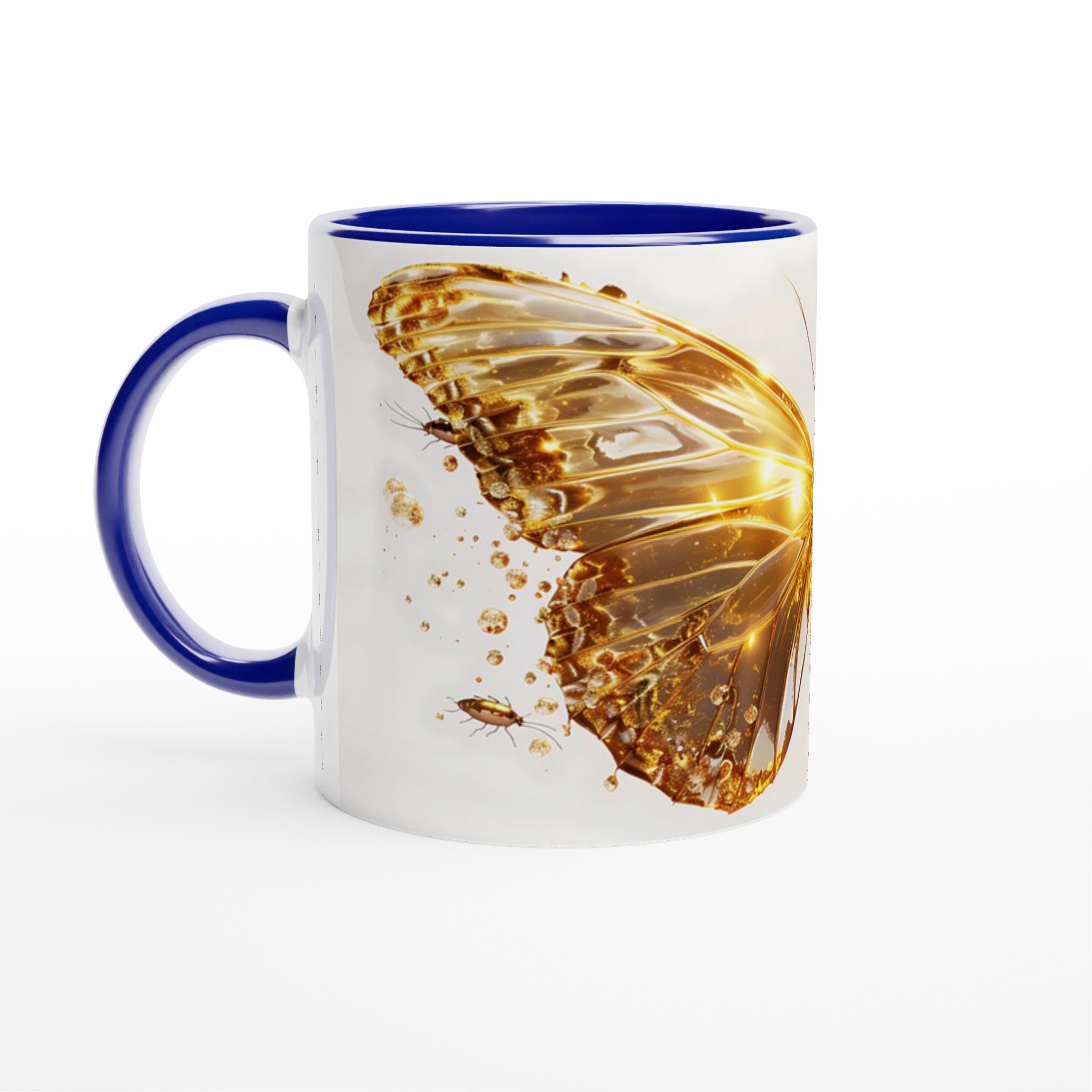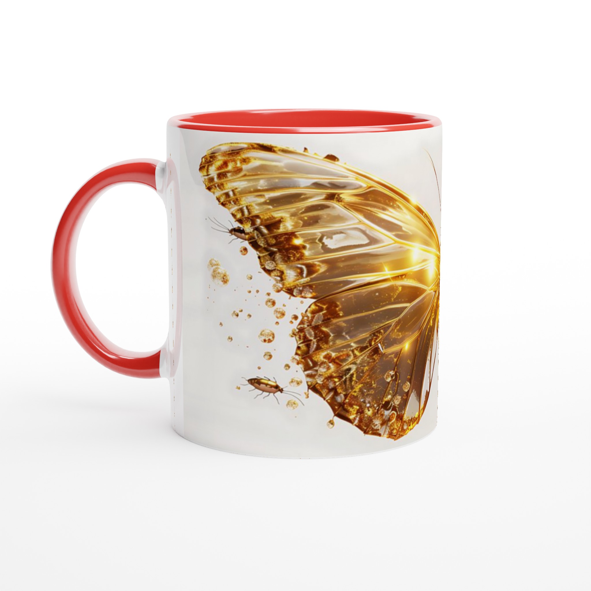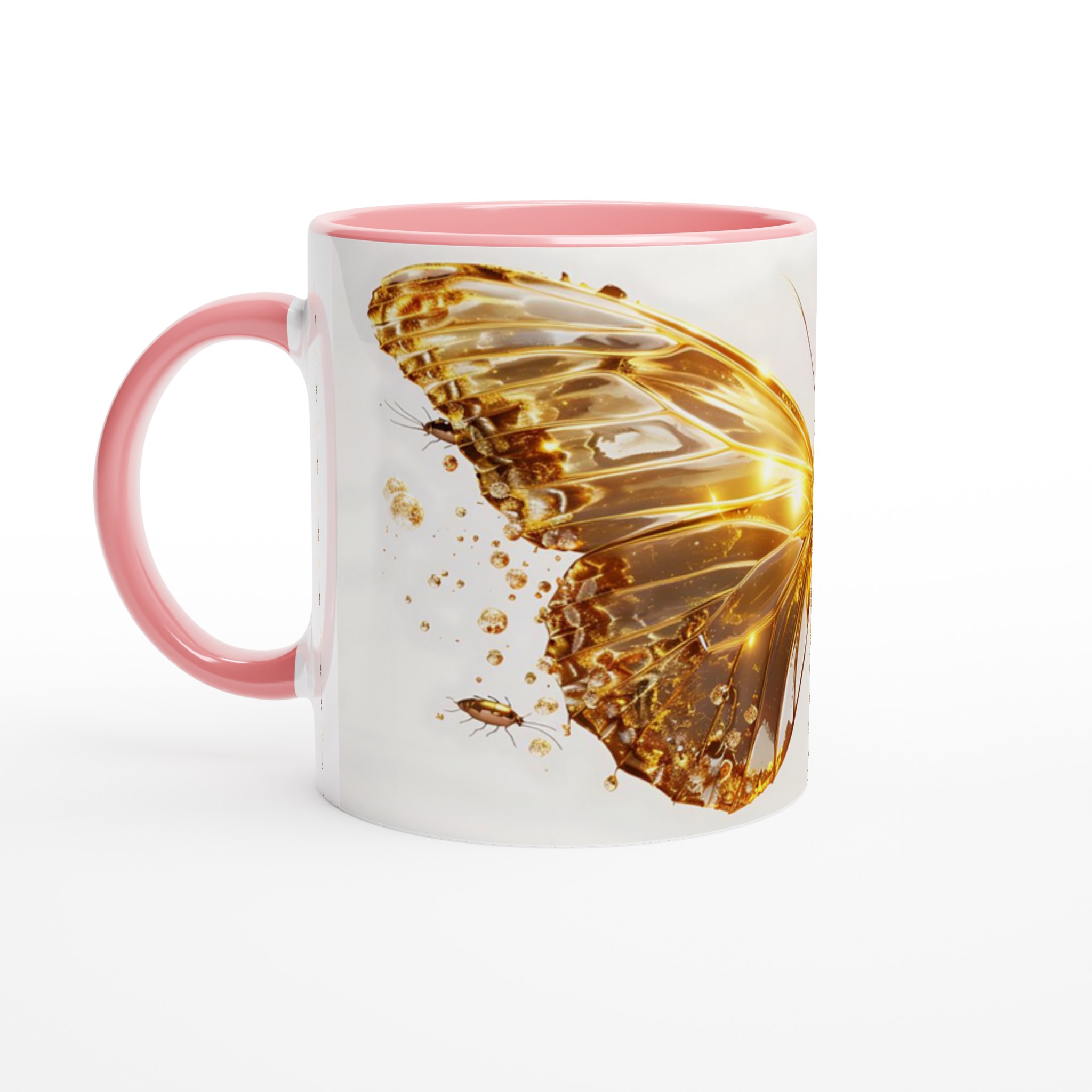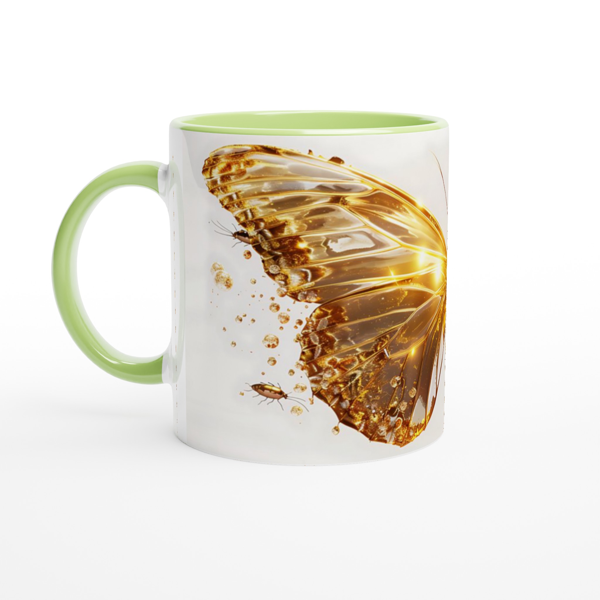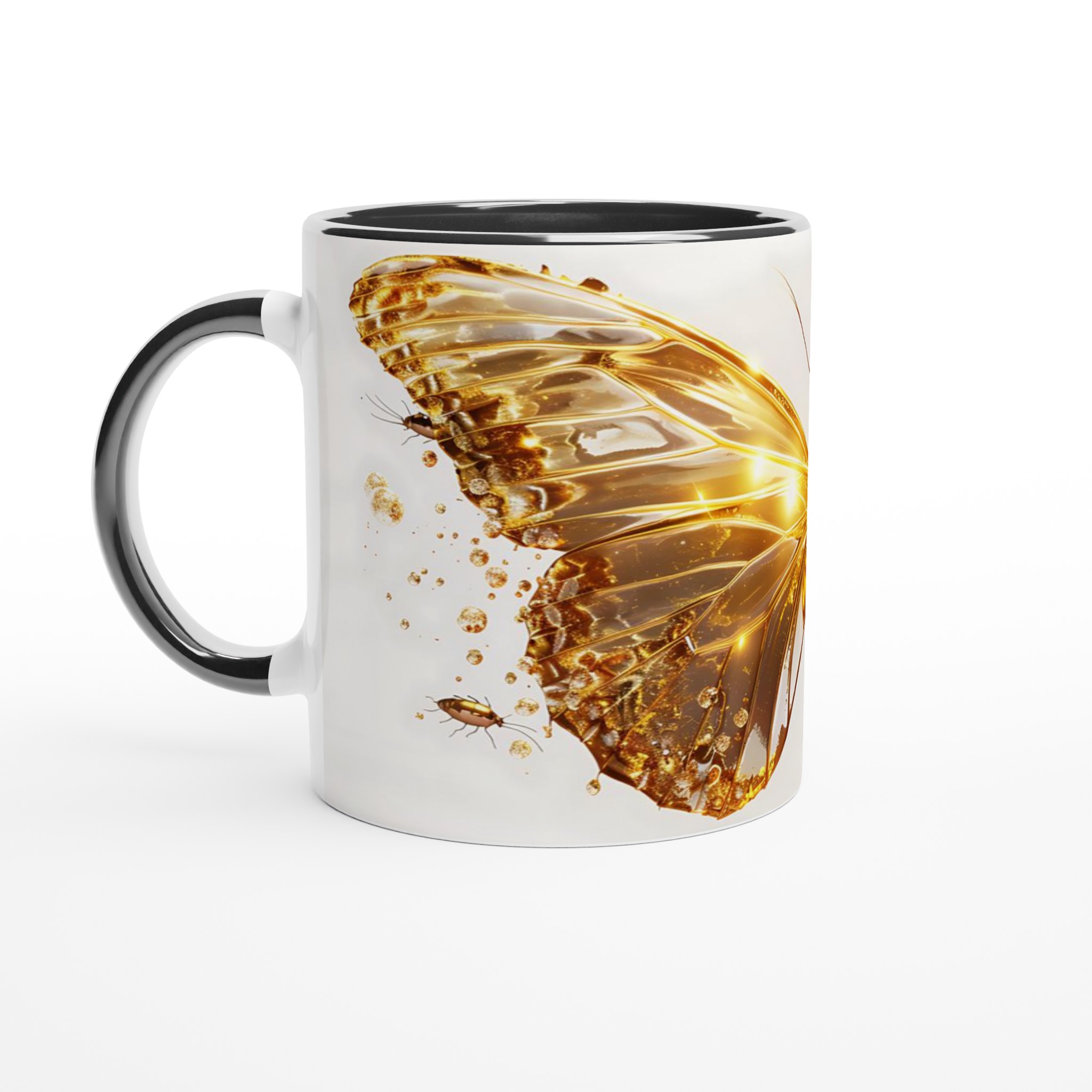Lyft din fikastund med denna strålande keramiska mugg, som fångar den eteriska skönheten hos en gyllene fjäril. Varje detalj, från vingarnas skimrande yta till de gnistrande dropparna, framhävs med en exceptionell lyster som gör varje kopp till en liten lyx. Denna mugg är mer än bara en behållare för din favoritdryck; den är ett konstverk som utstrålar elegans och blir en omedelbar blickfångare, perfekt för dig som uppskattar det lilla extra i vardagen.