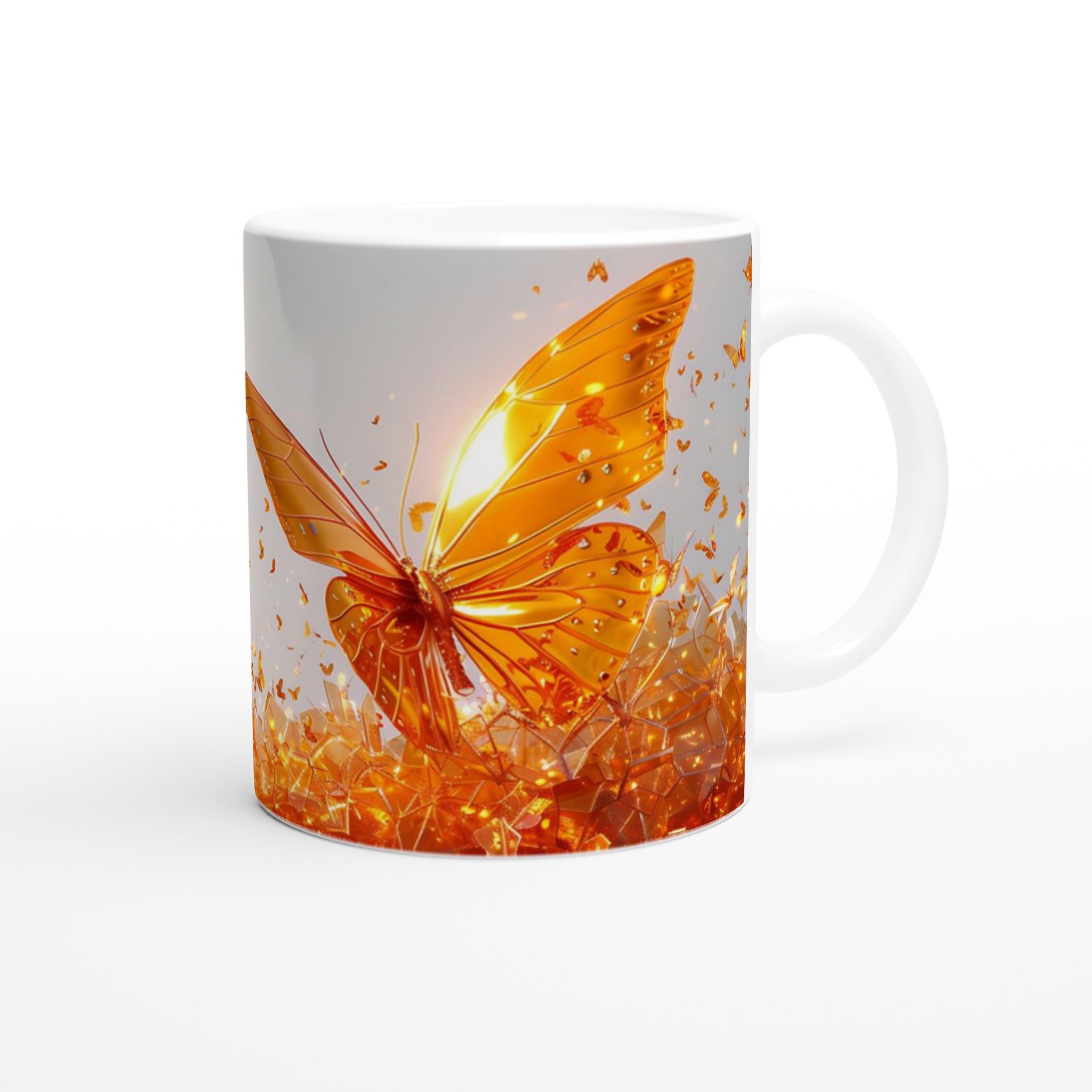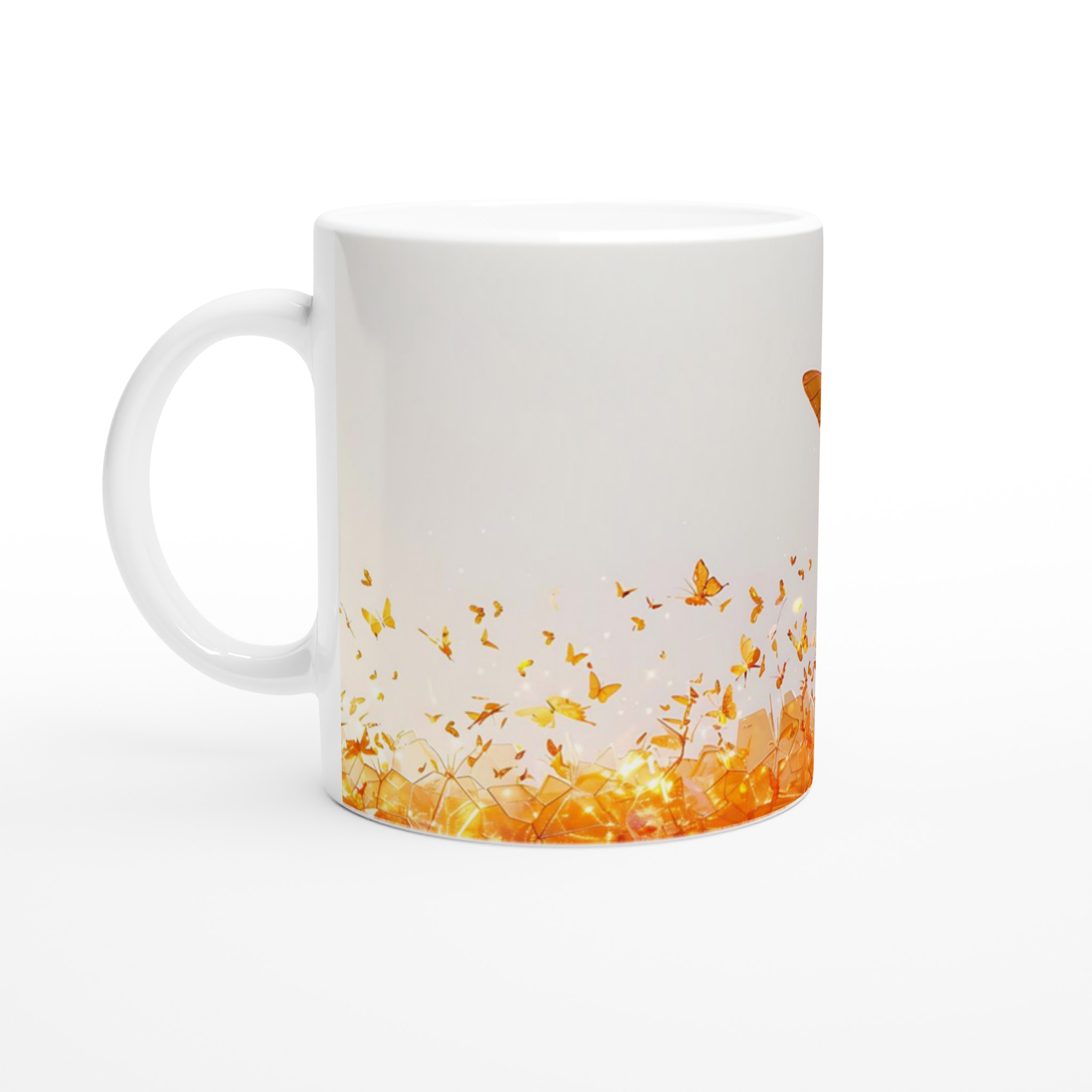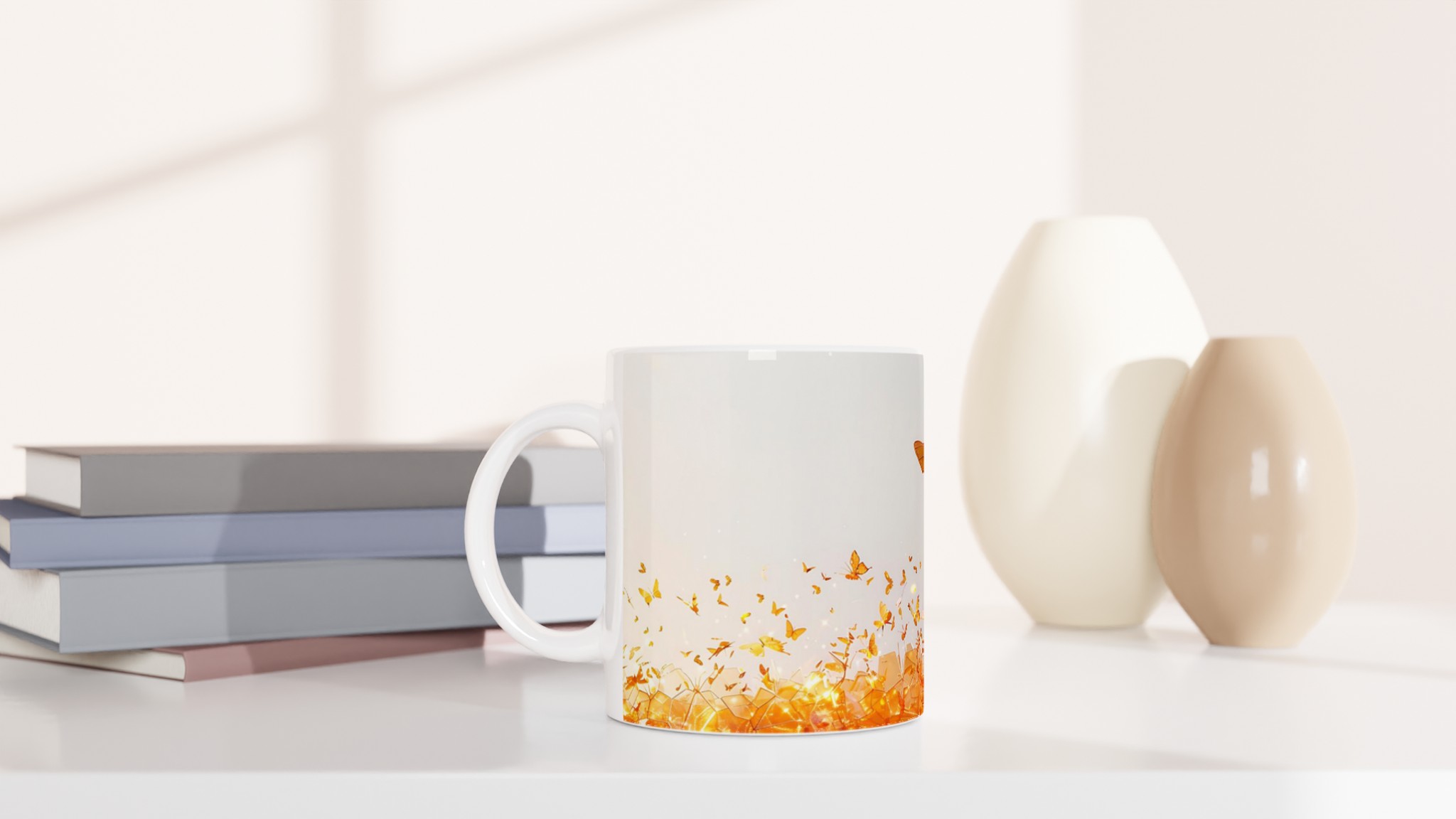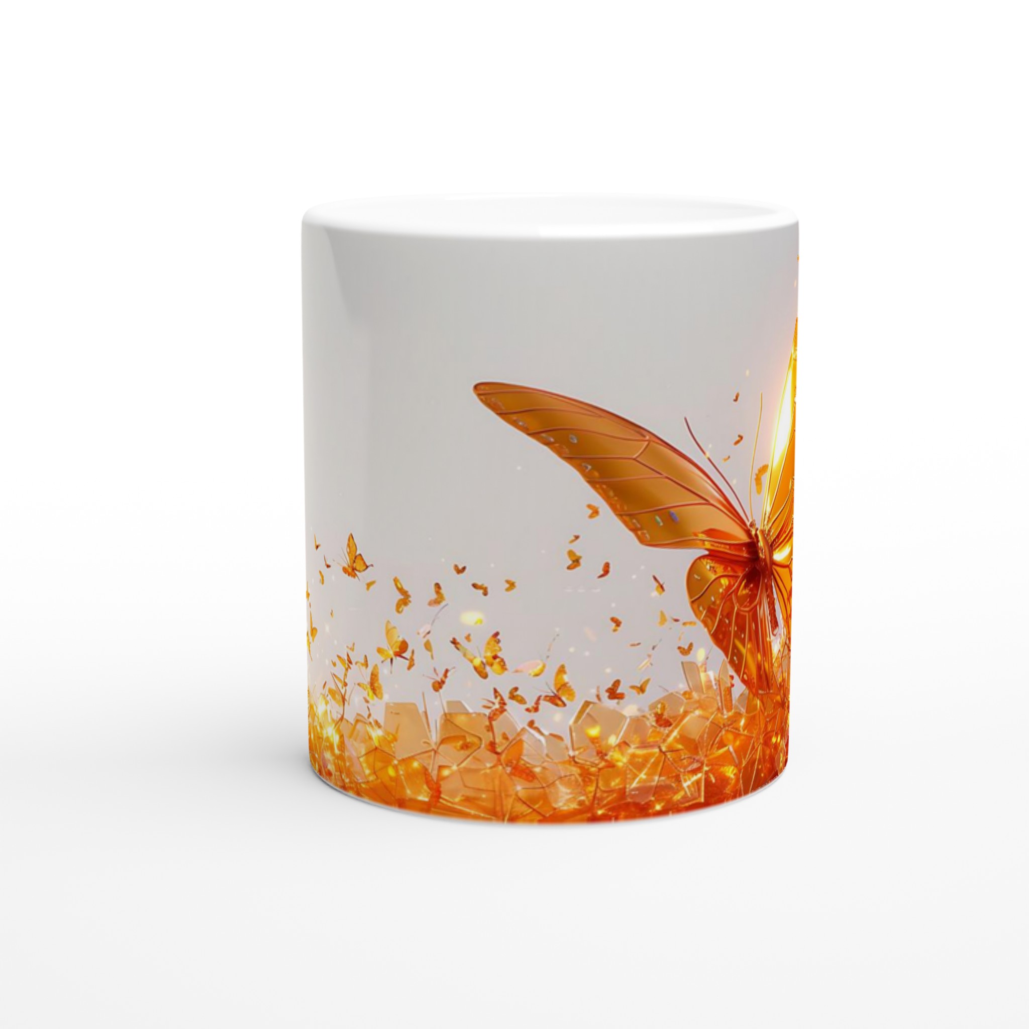 Låt din morgonkaffe eller kvällste fyllas med magi med denna strålande keramiska mugg, prydd med ett förtrollande mönster av gyllene fjärilar som svävar bland glittrande fragment. Denna mugg är designad för att fånga ljuset och sprida en känsla av glädje och lätthet, vilket gör varje dryck till en upplevelse. Den här stilrena keramiska muggen blir snabbt en vardagsfavorit. Perfekt för morgonkaffet, kvällens varma choklad eller när du bara vill njuta av en kopp te. Den blanka ytan gör att trycken framhävs med klara och levande färger, som håller sig fina även efter många turer i mikron och diskmaskinen.