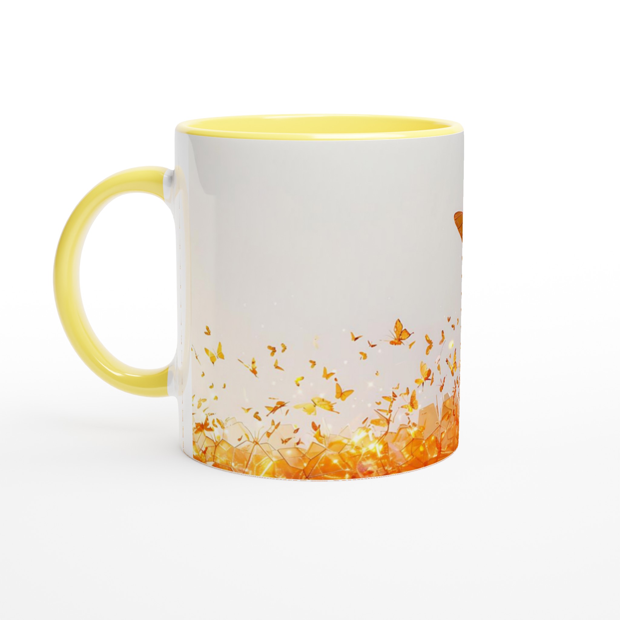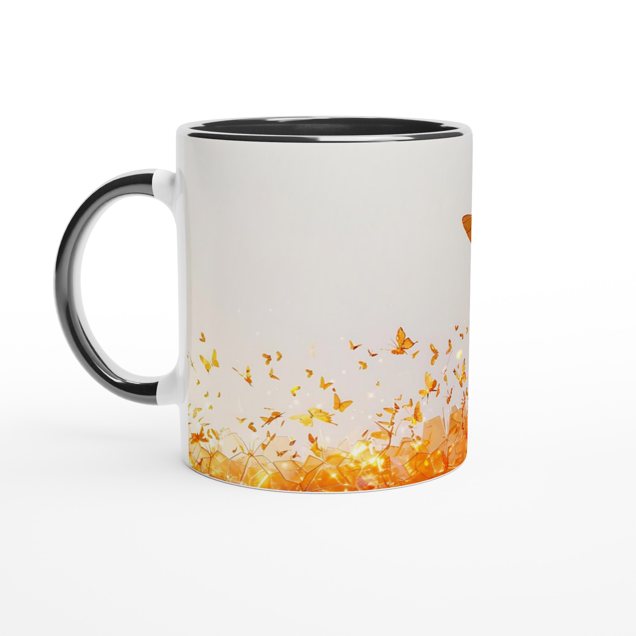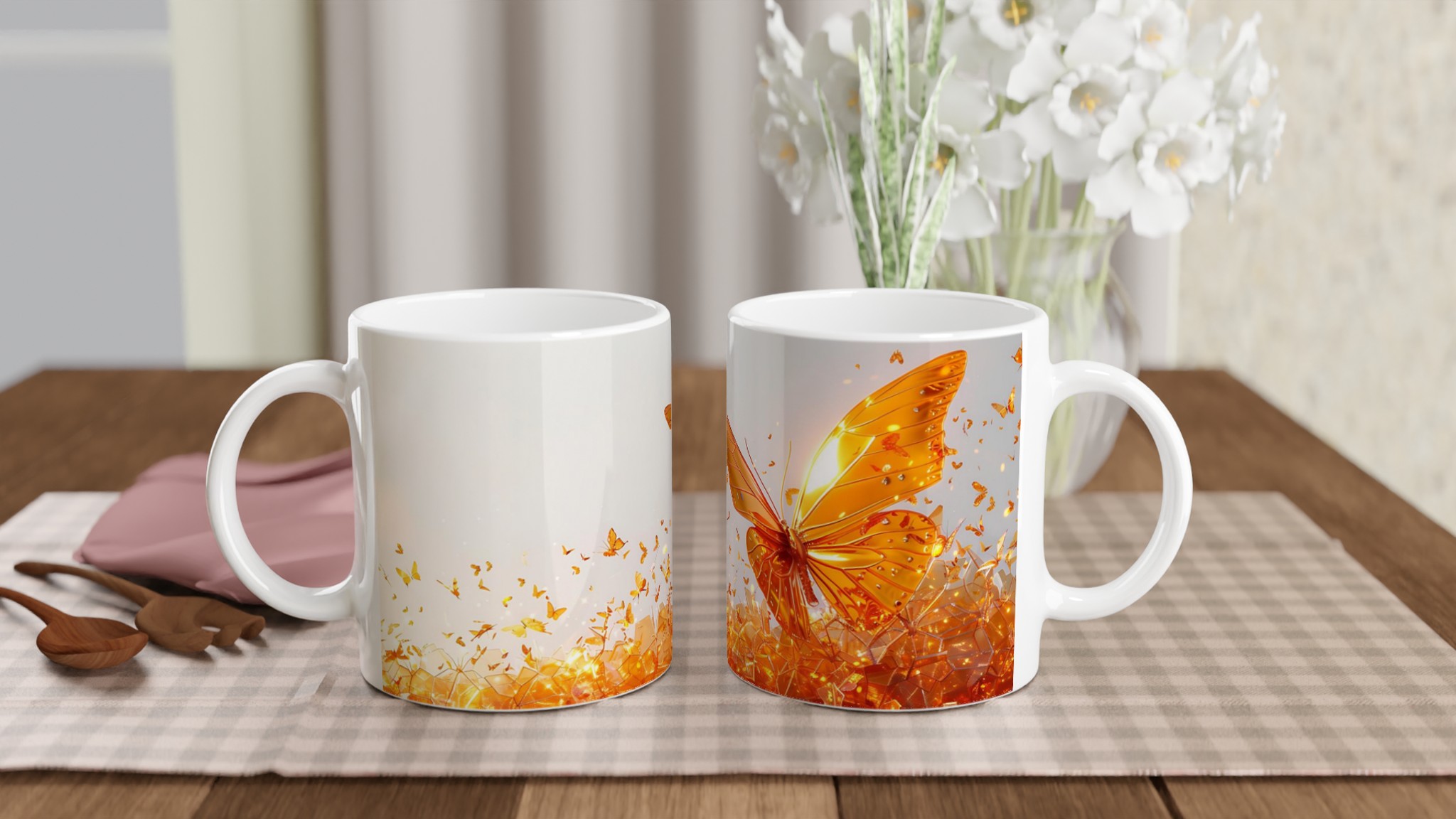 Låt din morgonkaffe eller kvällste fyllas med magi med denna strålande keramiska mugg, prydd med ett förtrollande mönster av gyllene fjärilar som svävar bland glittrande fragment. Denna mugg är designad för att fånga ljuset och sprida en känsla av glädje och lätthet, vilket gör varje dryck till en upplevelse. Den här stilrena keramiska muggen blir snabbt en vardagsfavorit. Perfekt för morgonkaffet, kvällens varma choklad eller när du bara vill njuta av en kopp te. Den blanka ytan gör att trycken framhävs med klara och levande färger, som håller sig fina även efter många turer i mikron och diskmaskinen.