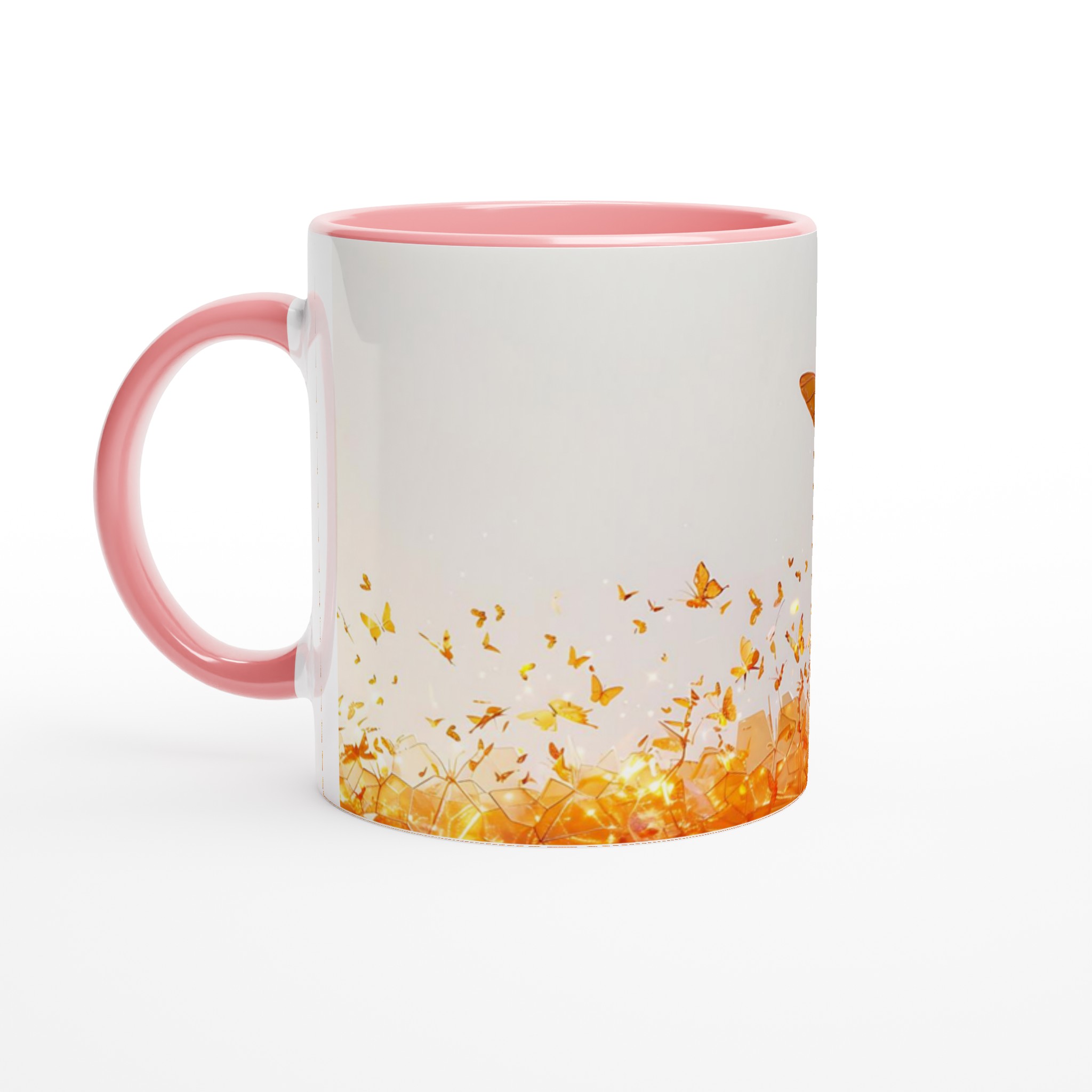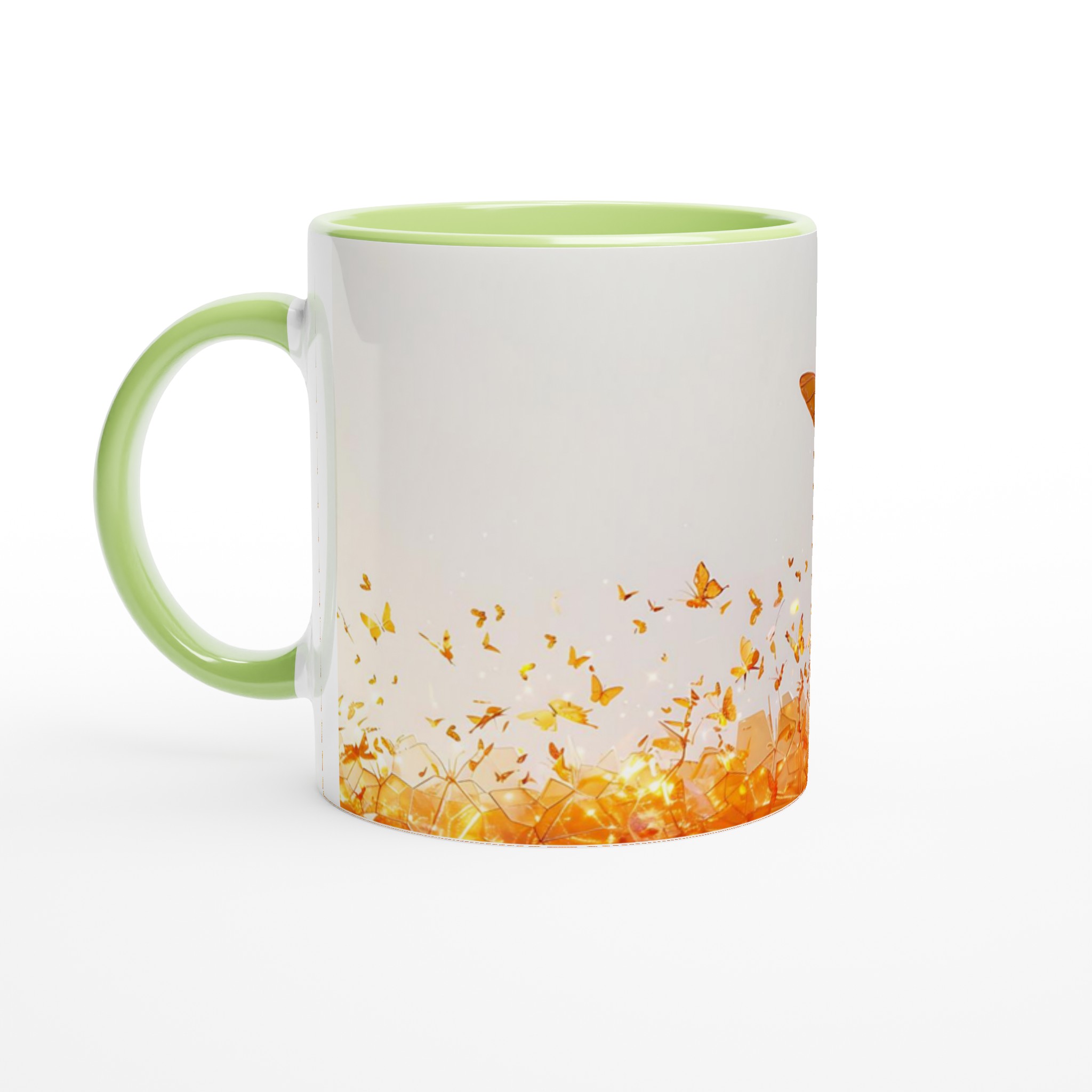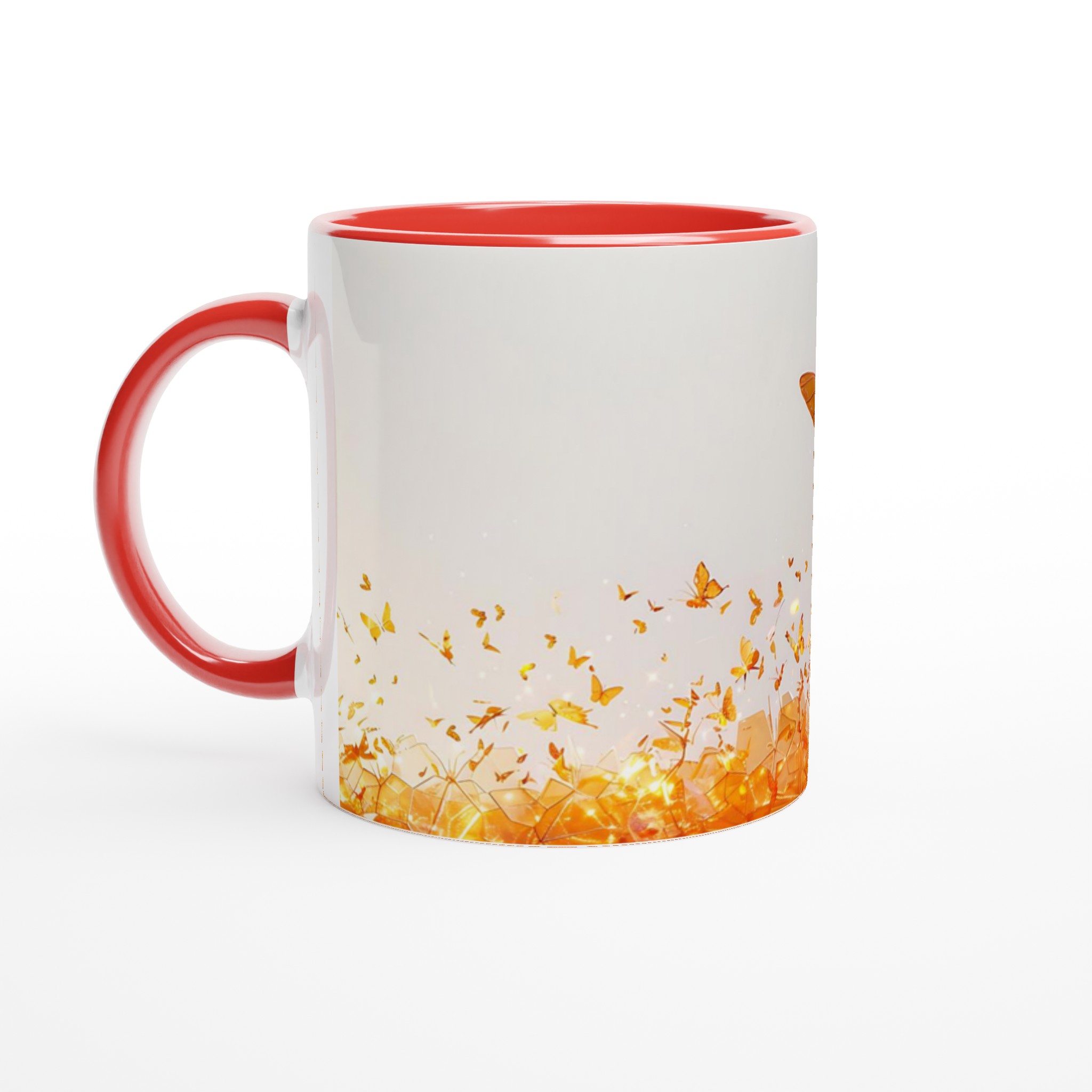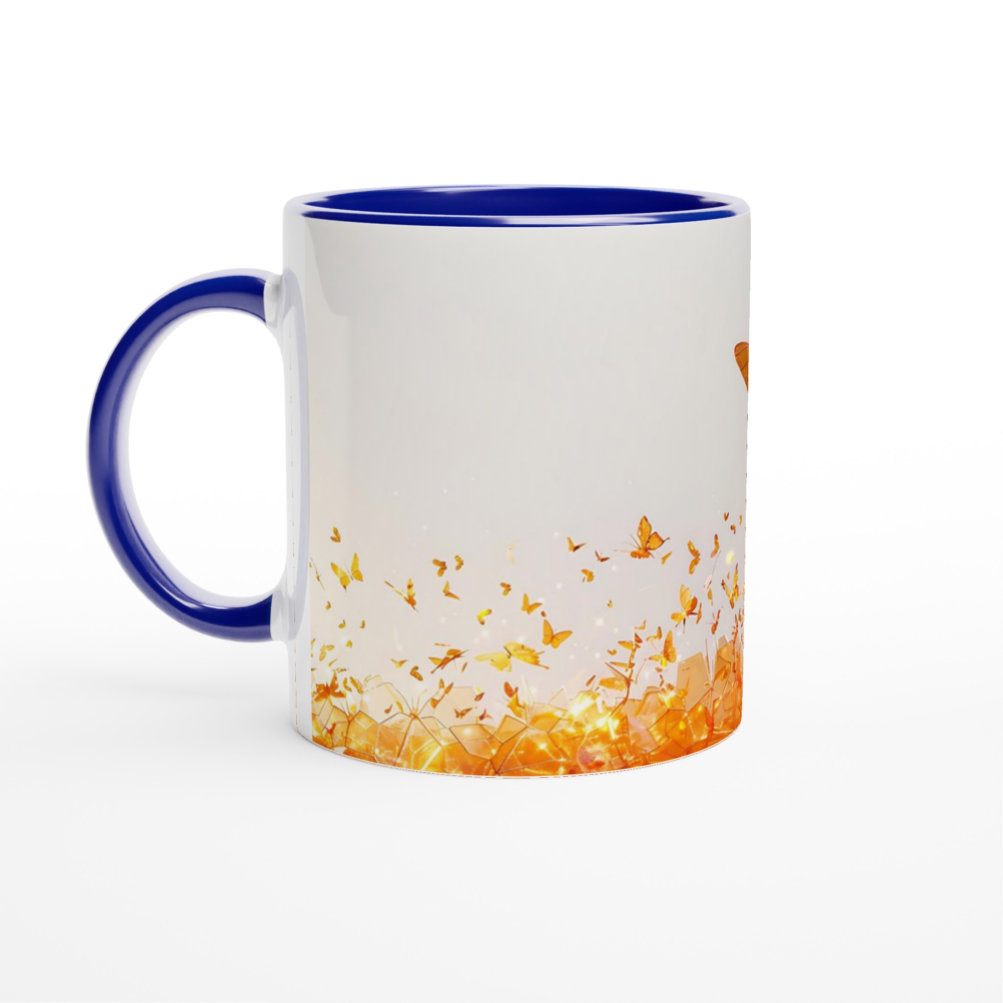 Låt din morgonkaffe eller kvällste fyllas med magi med denna strålande keramiska mugg, prydd med ett förtrollande mönster av gyllene fjärilar som svävar bland glittrande fragment. Denna mugg är designad för att fånga ljuset och sprida en känsla av glädje och lätthet, vilket gör varje dryck till en upplevelse. Den här stilrena keramiska muggen blir snabbt en vardagsfavorit. Perfekt för morgonkaffet, kvällens varma choklad eller när du bara vill njuta av en kopp te. Den blanka ytan gör att trycken framhävs med klara och levande färger, som håller sig fina även efter många turer i mikron och diskmaskinen.
