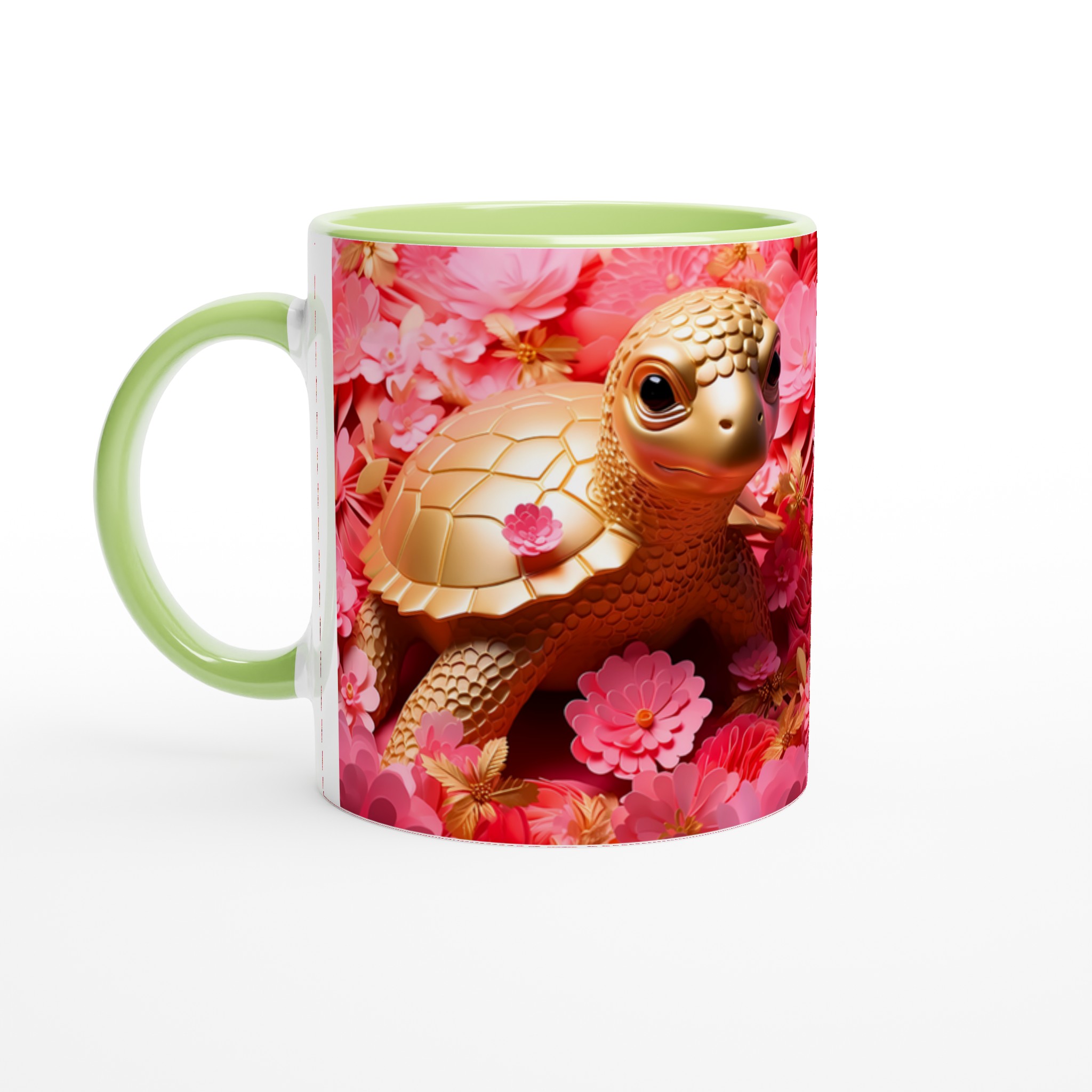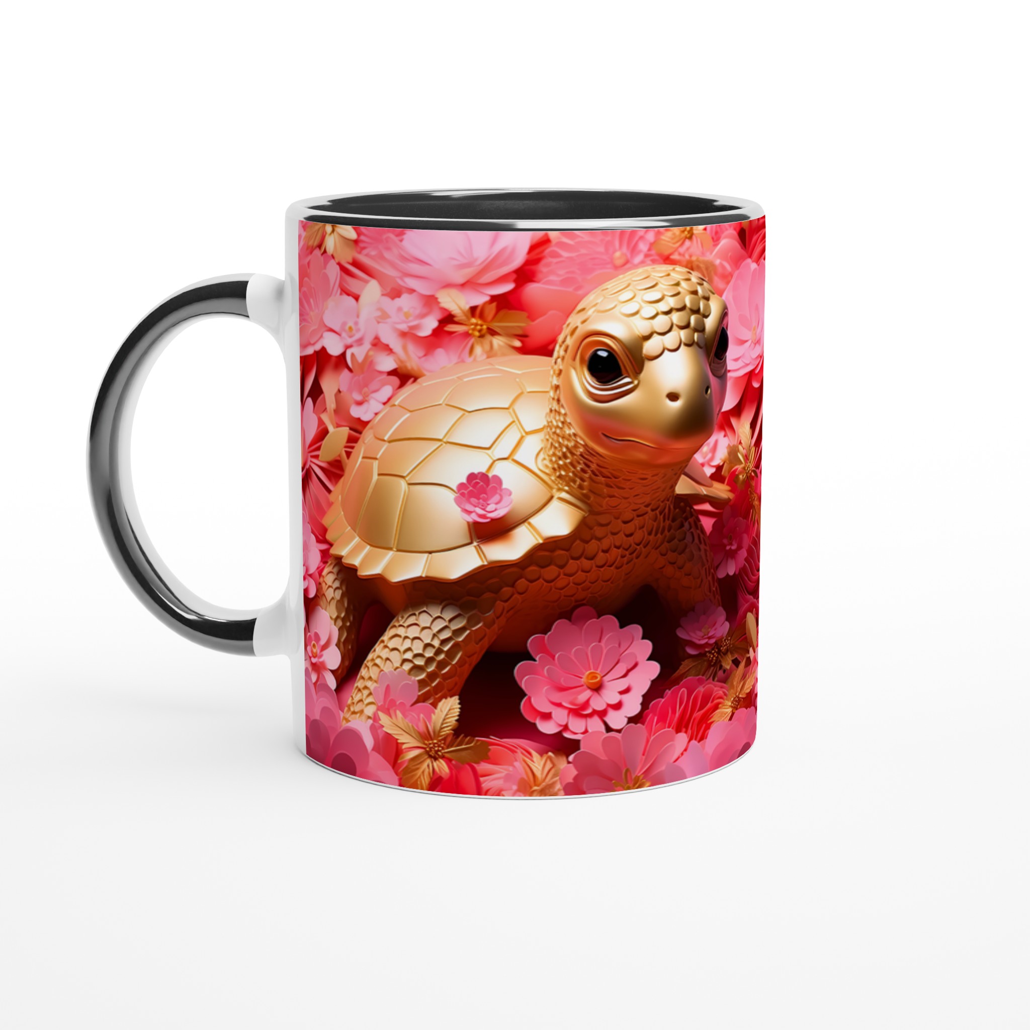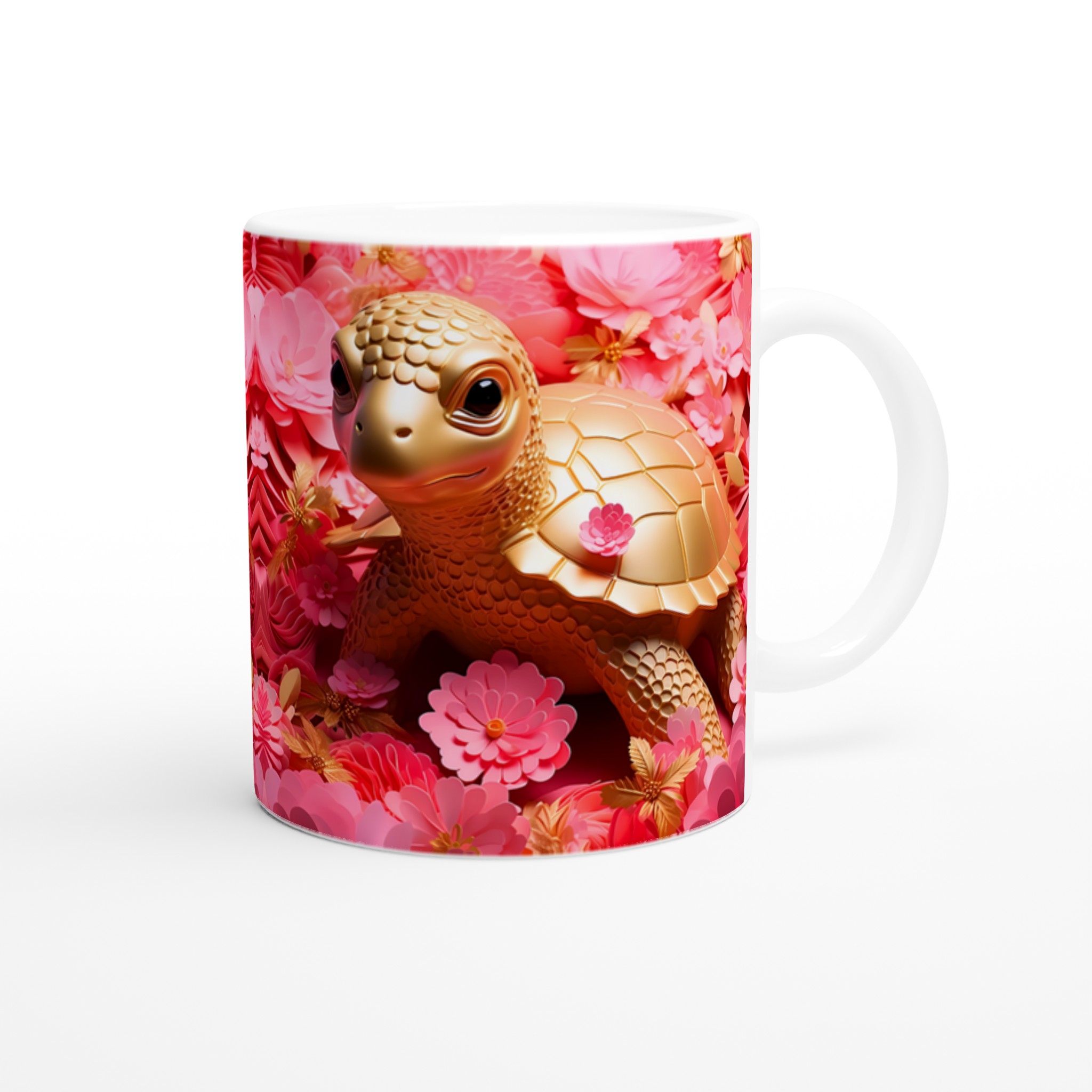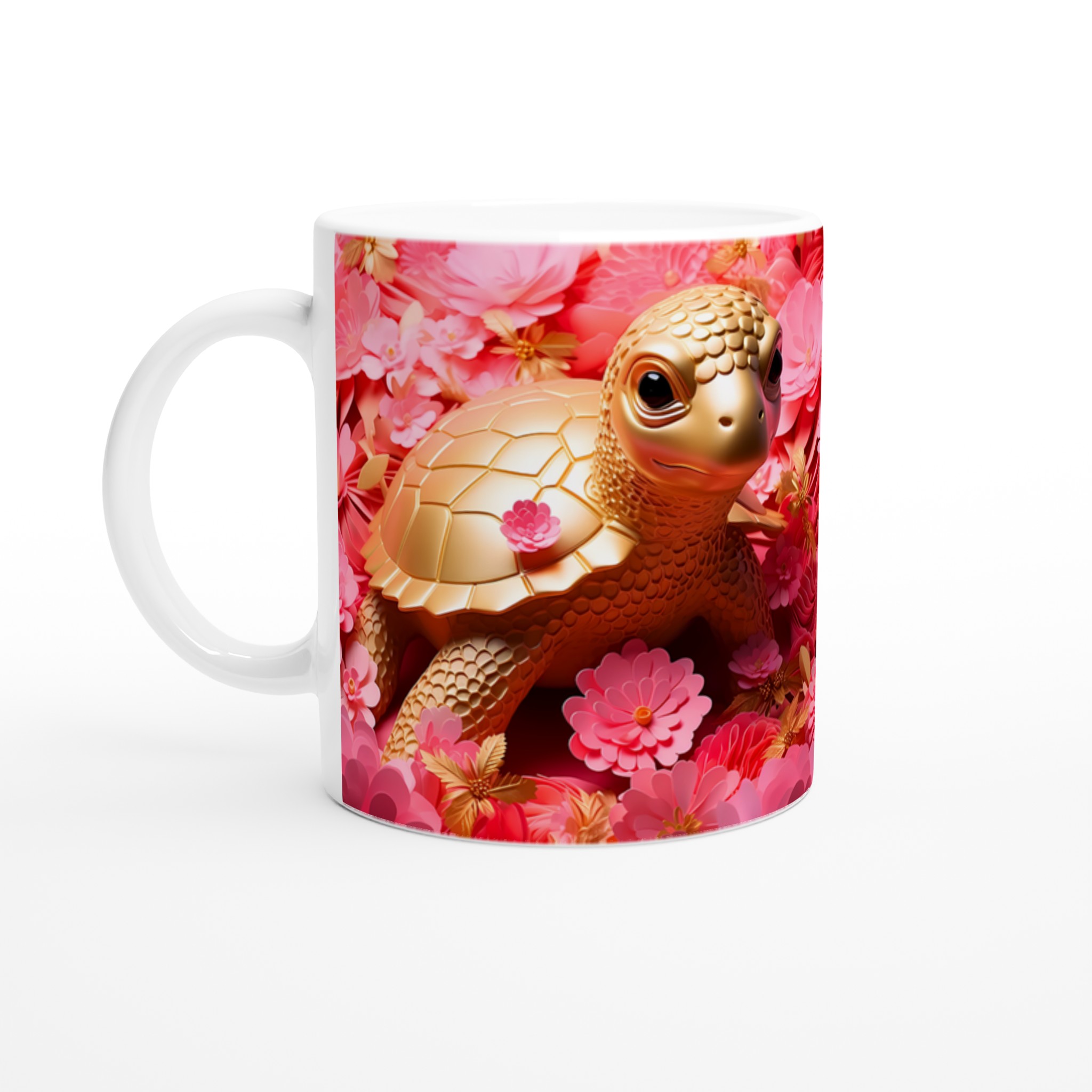 Låt varje fikastund bli en glädjefylld upplevelse med vår charmiga Gyllene Sköldpadda Keramikmugg. Inspirerad av bilden som utstrålar lekfull elegans med sina gyllene toner mot en bakgrund av frodiga rosa blommor, förvandlas denna mugg snabbt till en vardagsfavorit. Den är perfekt för morgonkaffet, kvällens varma choklad eller när du bara vill njuta av en kopp te. Den blanka ytan gör att trycken framhävs med klara och levande färger, som håller sig fina även efter många turer i mikron och diskmaskinen.
