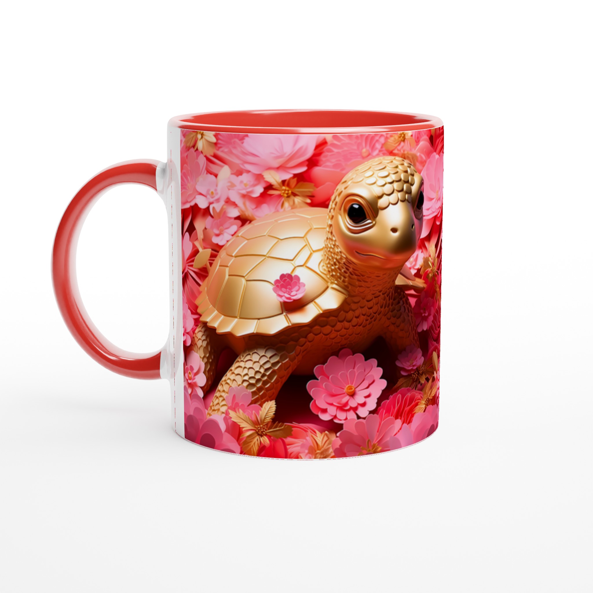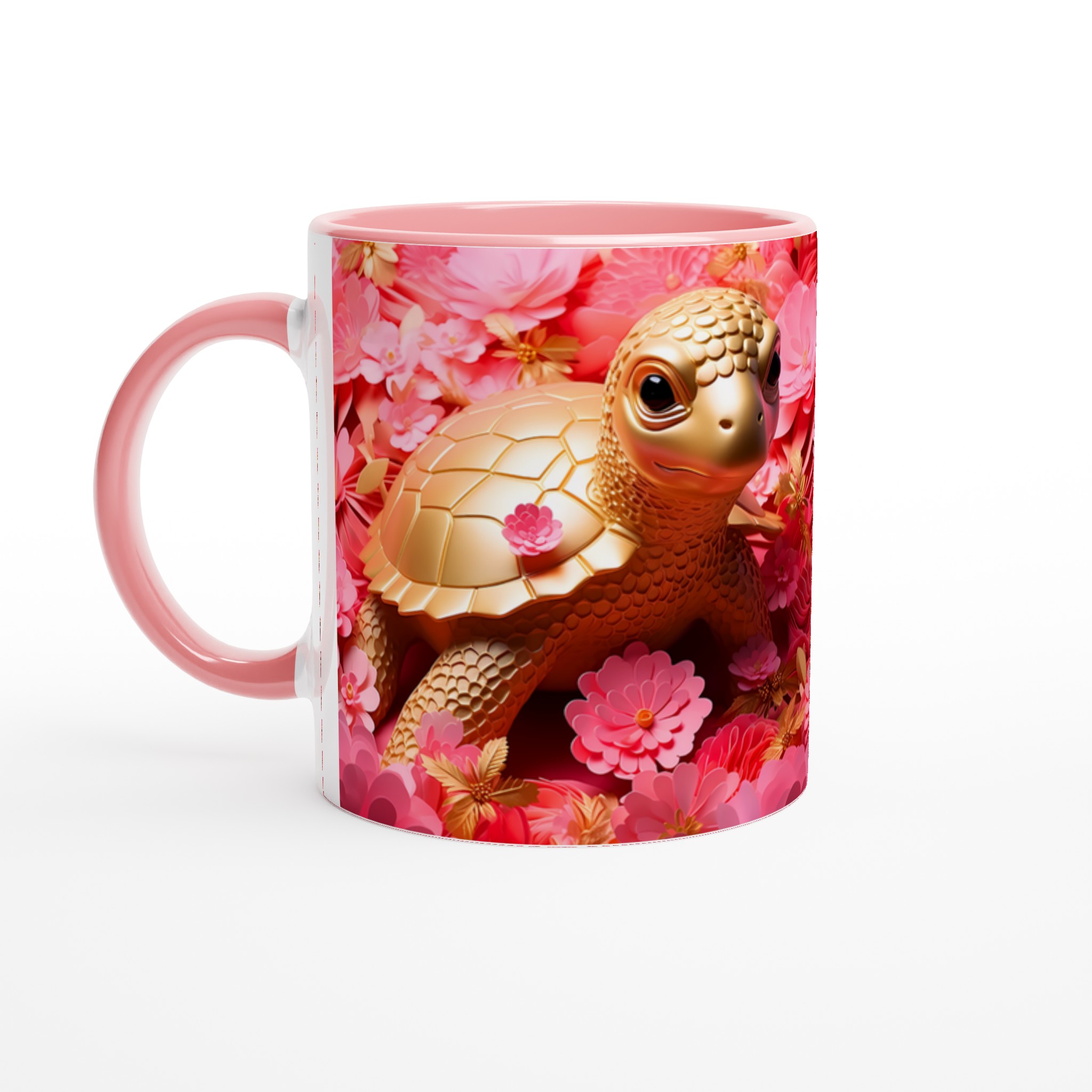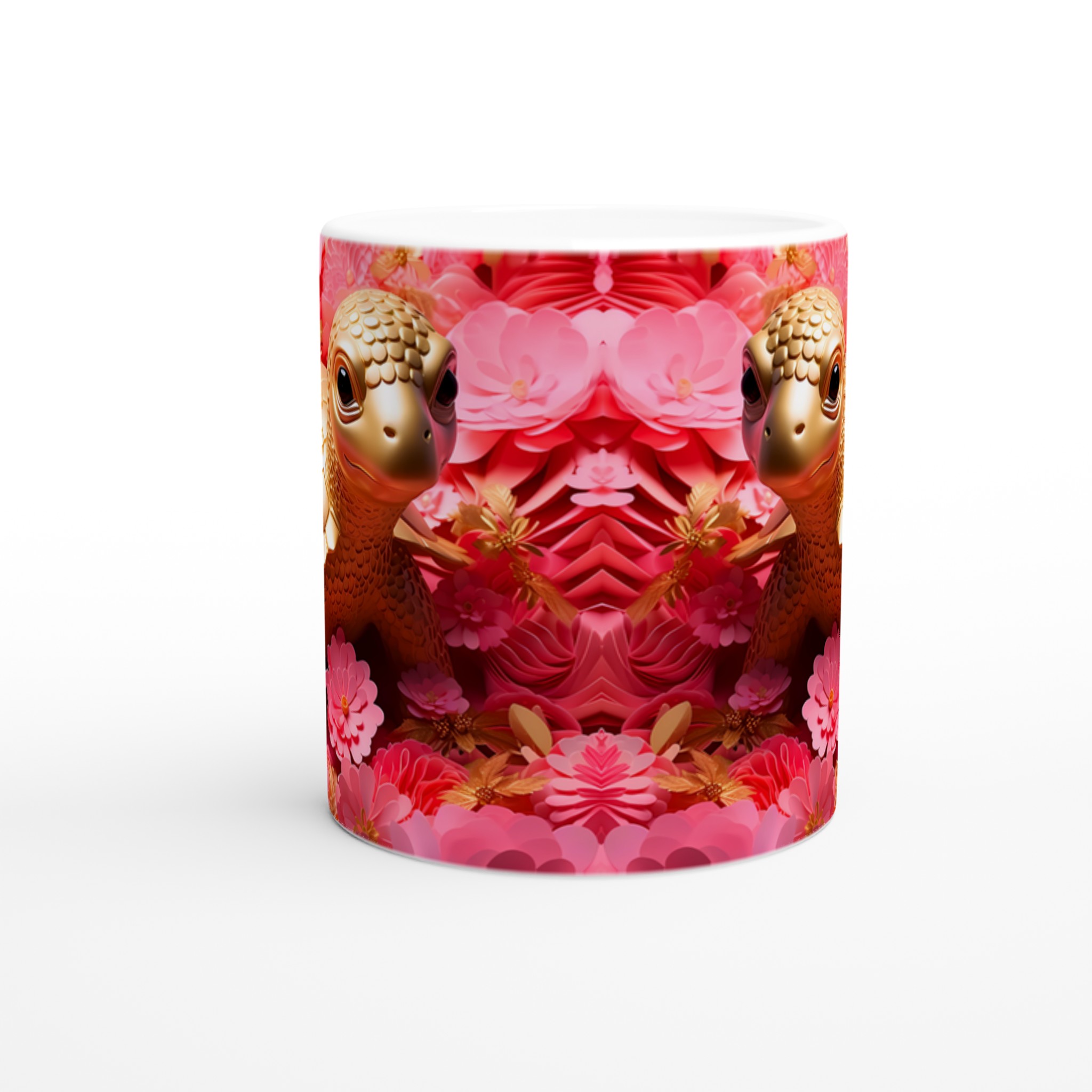 Låt varje fikastund bli en glädjefylld upplevelse med vår charmiga Gyllene Sköldpadda Keramikmugg. Inspirerad av bilden som utstrålar lekfull elegans med sina gyllene toner mot en bakgrund av frodiga rosa blommor, förvandlas denna mugg snabbt till en vardagsfavorit. Den är perfekt för morgonkaffet, kvällens varma choklad eller när du bara vill njuta av en kopp te. Den blanka ytan gör att trycken framhävs med klara och levande färger, som håller sig fina även efter många turer i mikron och diskmaskinen.