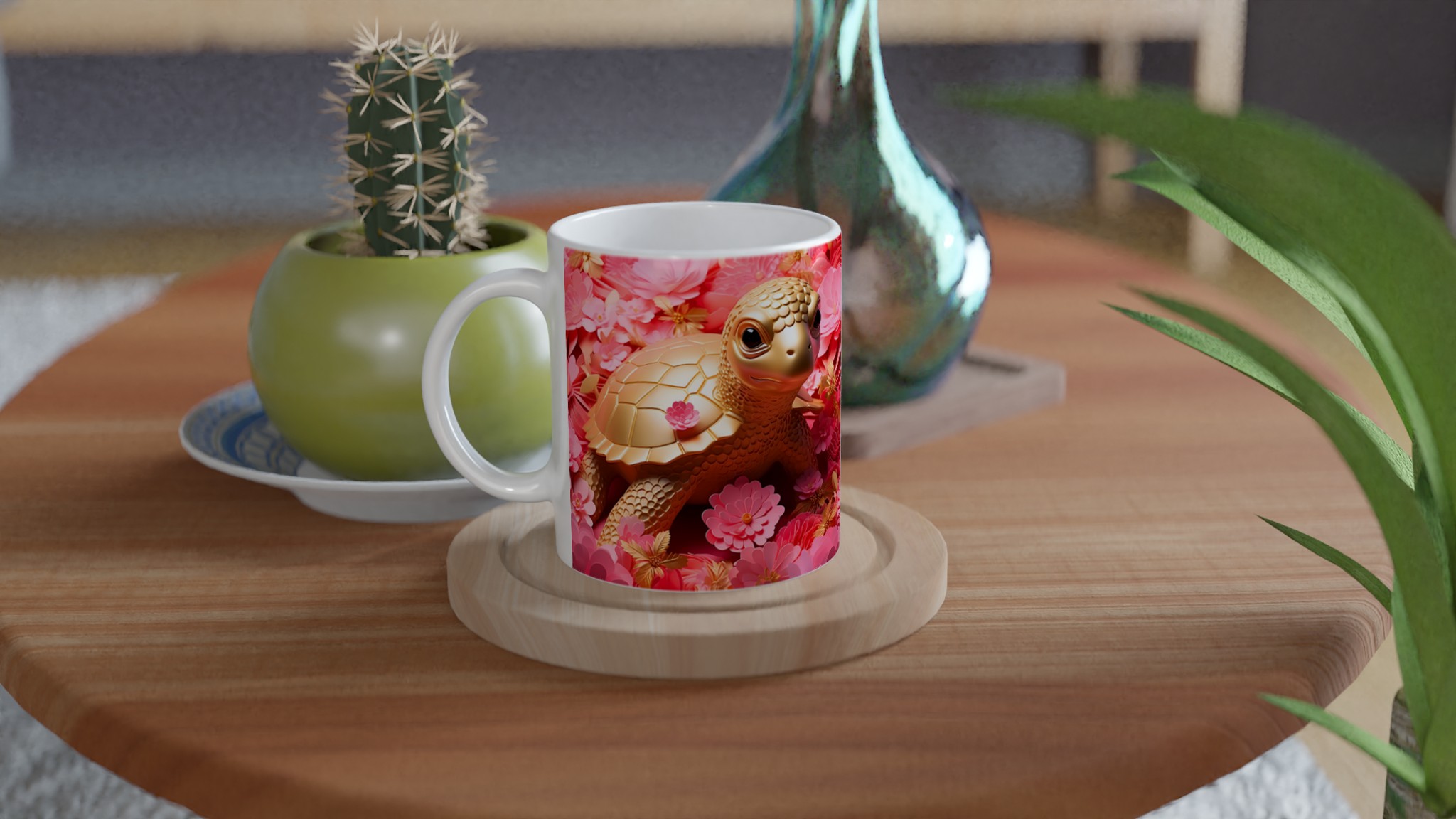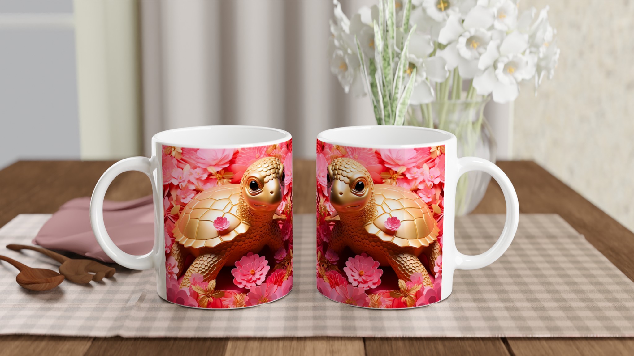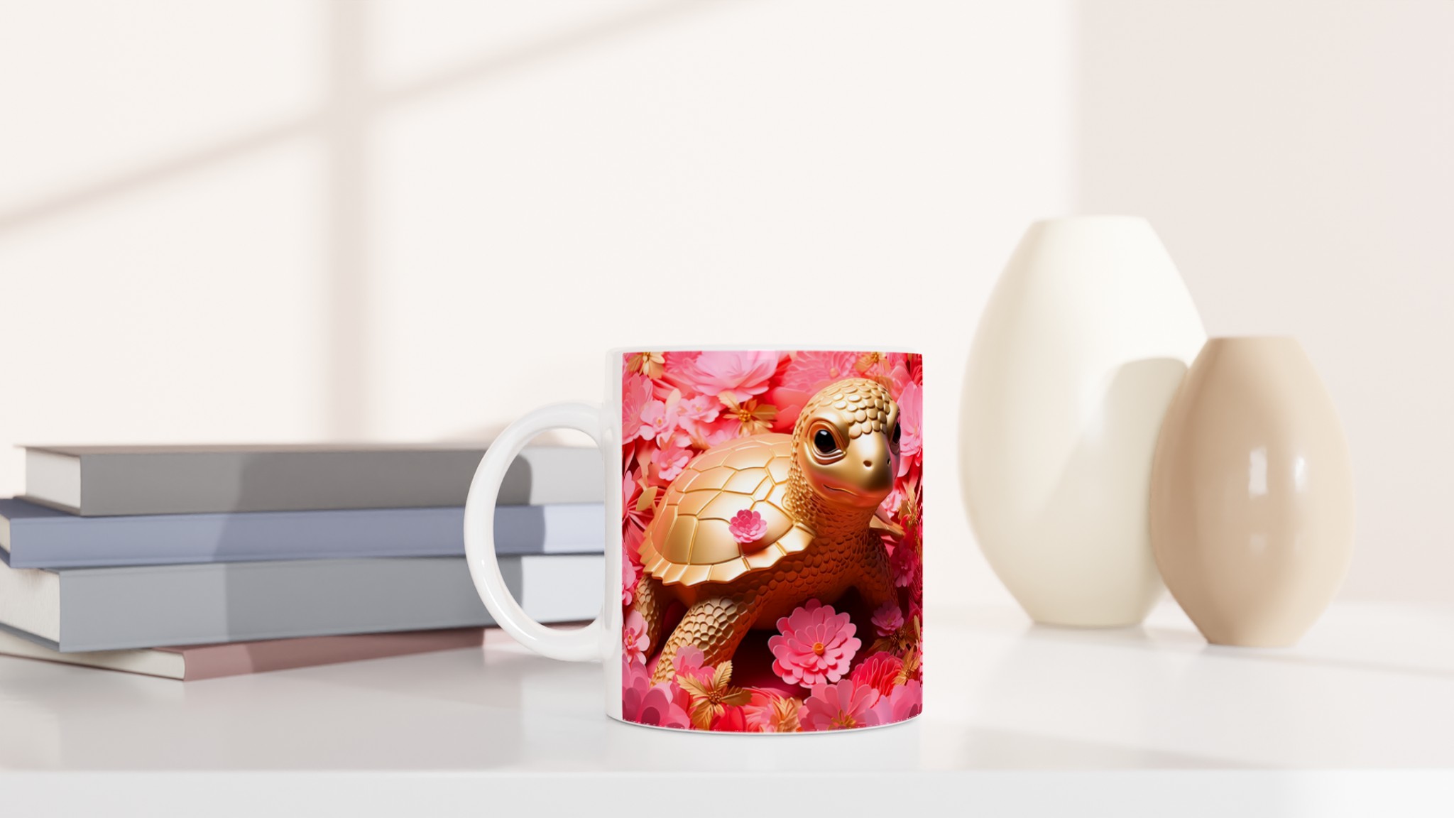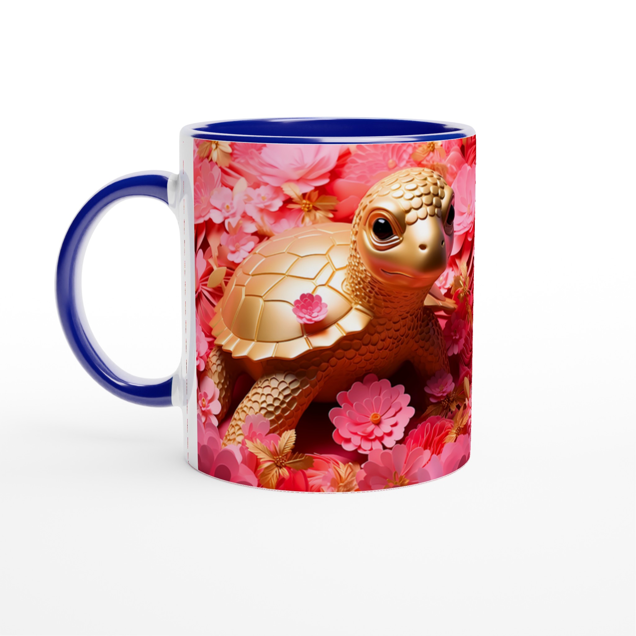 Låt varje fikastund bli en glädjefylld upplevelse med vår charmiga Gyllene Sköldpadda Keramikmugg. Inspirerad av bilden som utstrålar lekfull elegans med sina gyllene toner mot en bakgrund av frodiga rosa blommor, förvandlas denna mugg snabbt till en vardagsfavorit. Den är perfekt för morgonkaffet, kvällens varma choklad eller när du bara vill njuta av en kopp te. Den blanka ytan gör att trycken framhävs med klara och levande färger, som håller sig fina även efter många turer i mikron och diskmaskinen.