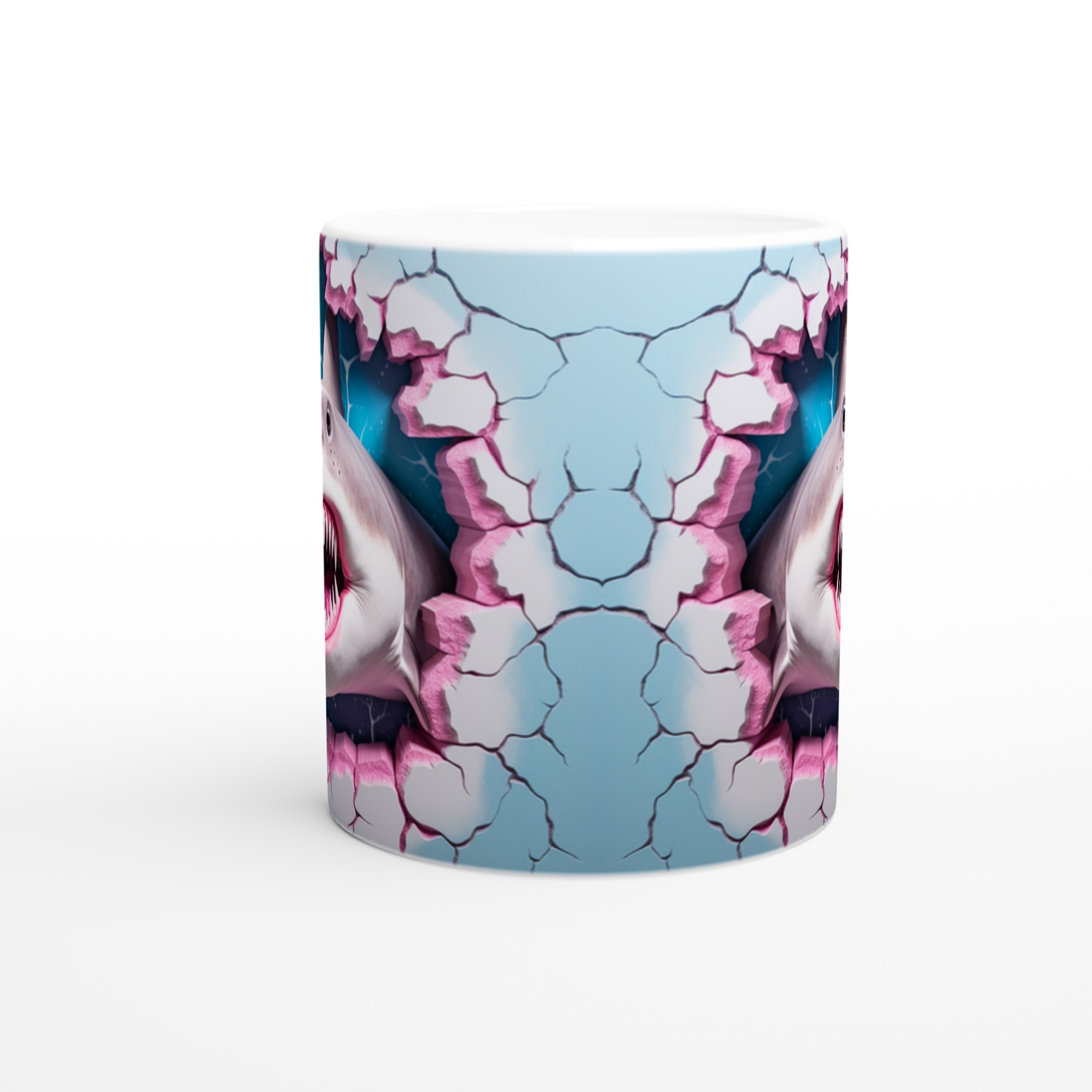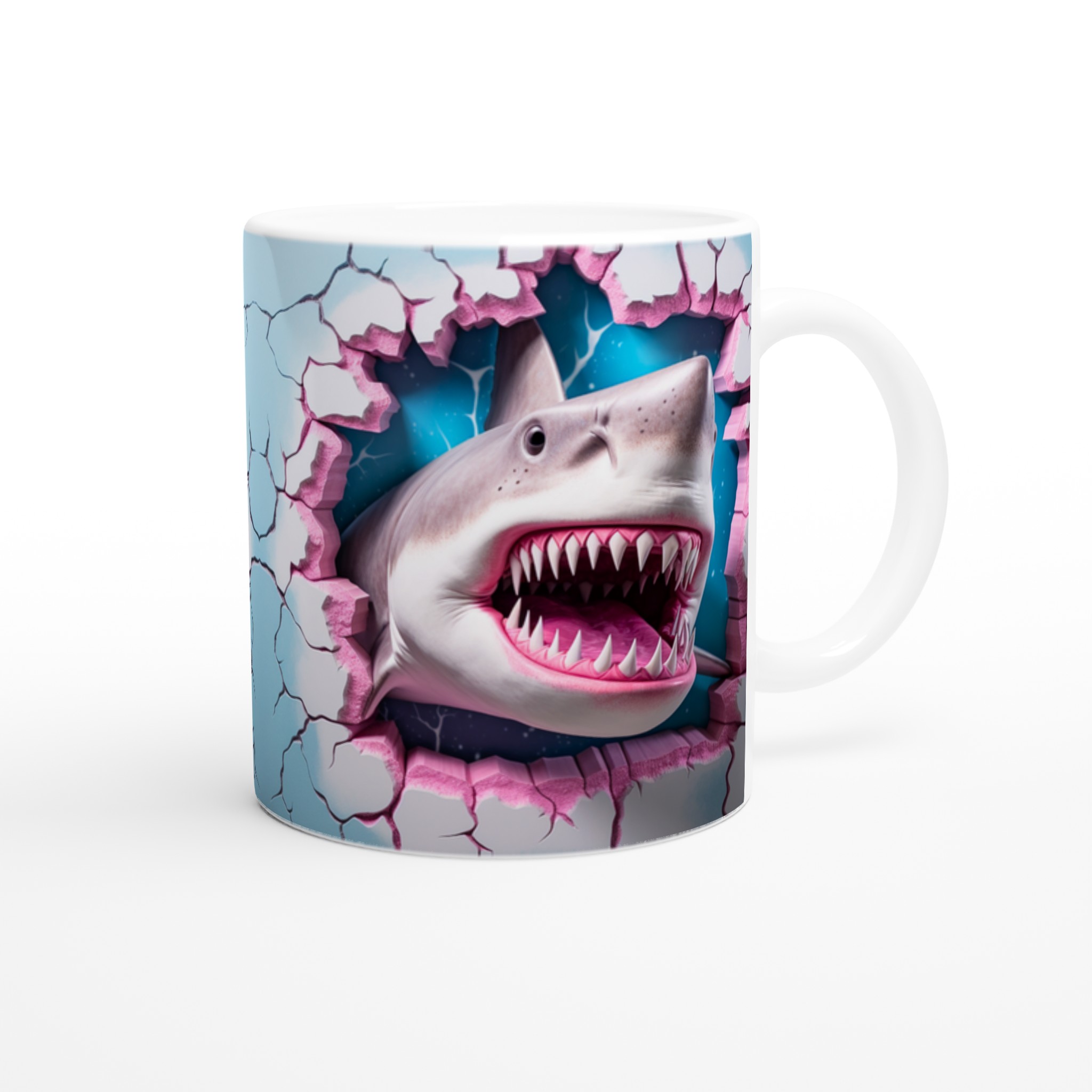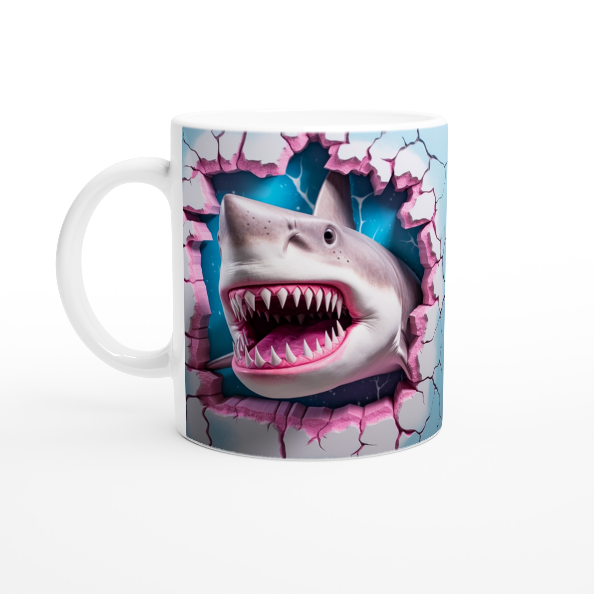 Denna stilrena keramiska mugg blir snabbt en vardagsfavorit, nu med en vass twist! Perfekt för morgonkaffet, kvällens varma choklad eller när du bara vill njuta av en kopp te. Med sitt unika, lekfulla hajtänder-motiv som bryter fram i rosa och blått, kommer din mugg garanterat att sticka ut. Den blanka vita ytan gör att trycken framhävs med klara och levande färger, som håller sig fina även efter många turer i mikron och diskmaskinen.