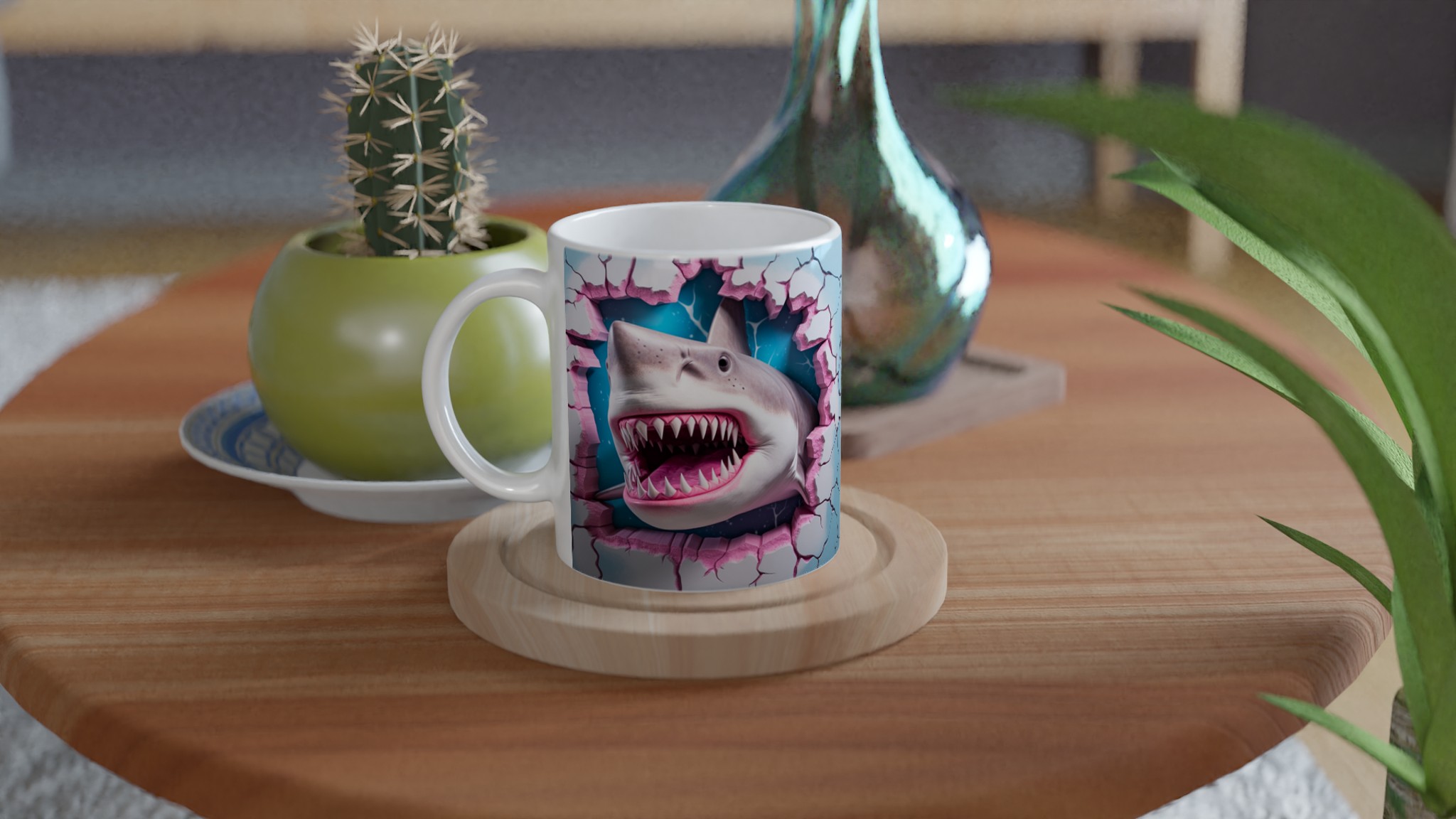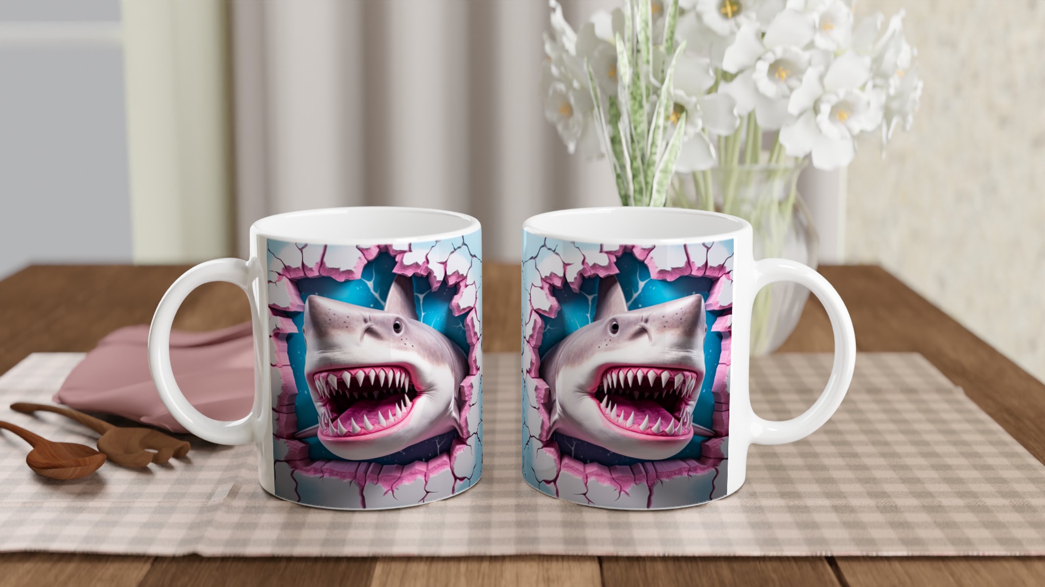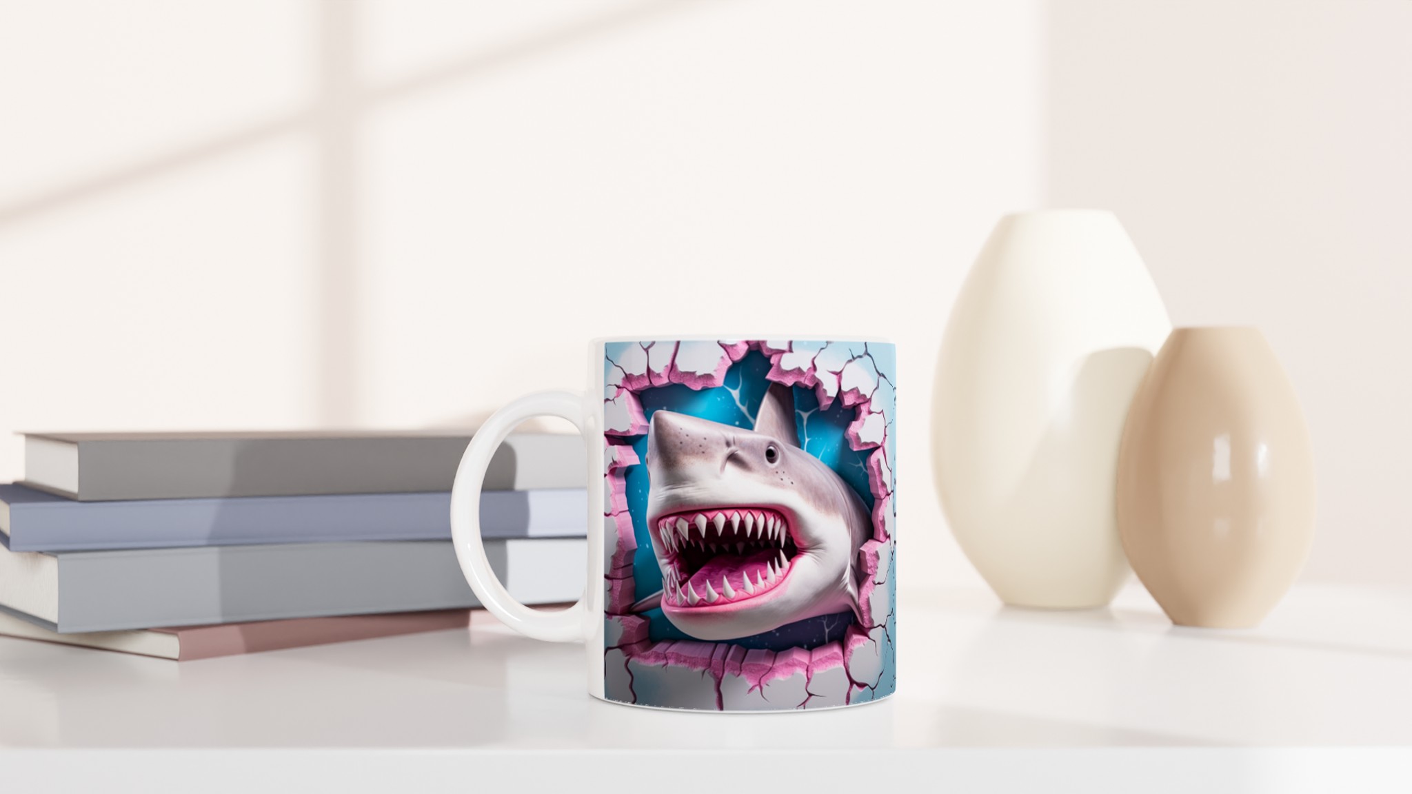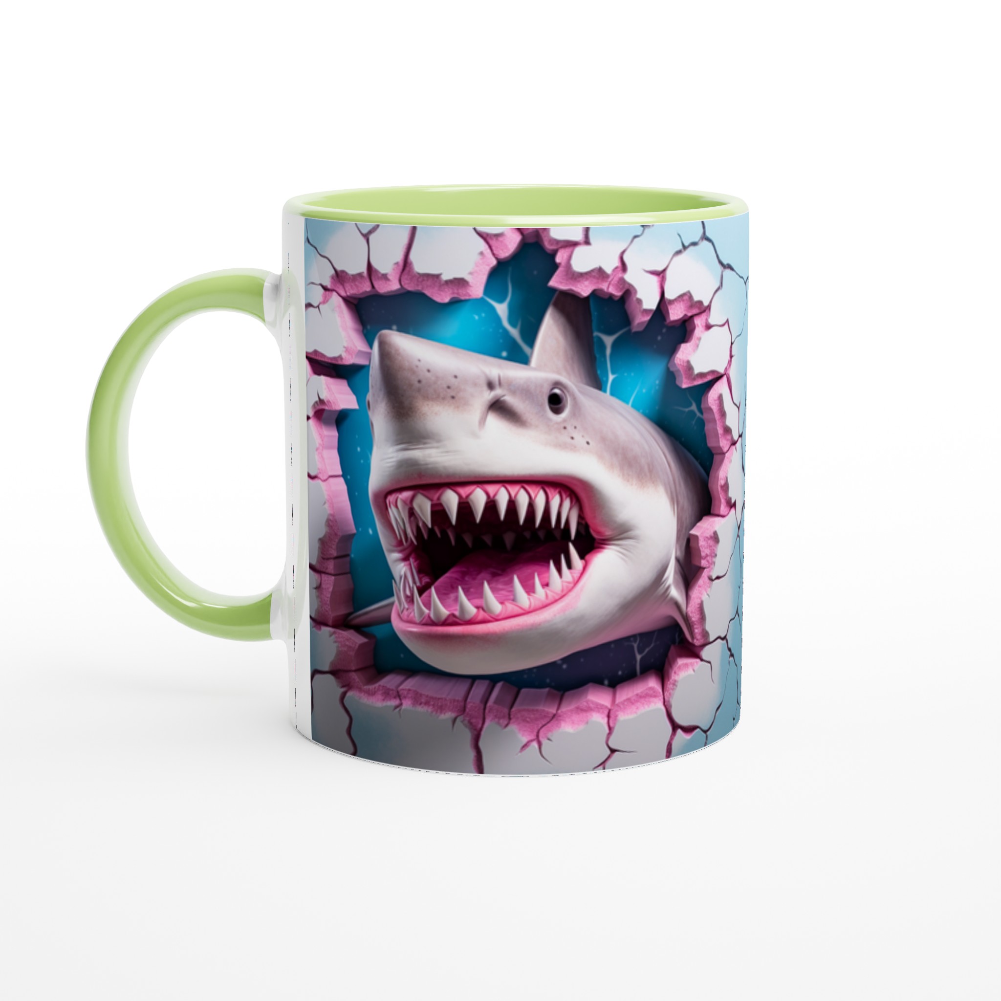 Denna stilrena keramiska mugg blir snabbt en vardagsfavorit, nu med en vass twist! Perfekt för morgonkaffet, kvällens varma choklad eller när du bara vill njuta av en kopp te. Med sitt unika, lekfulla hajtänder-motiv som bryter fram i rosa och blått, kommer din mugg garanterat att sticka ut. Den blanka vita ytan gör att trycken framhävs med klara och levande färger, som håller sig fina även efter många turer i mikron och diskmaskinen.