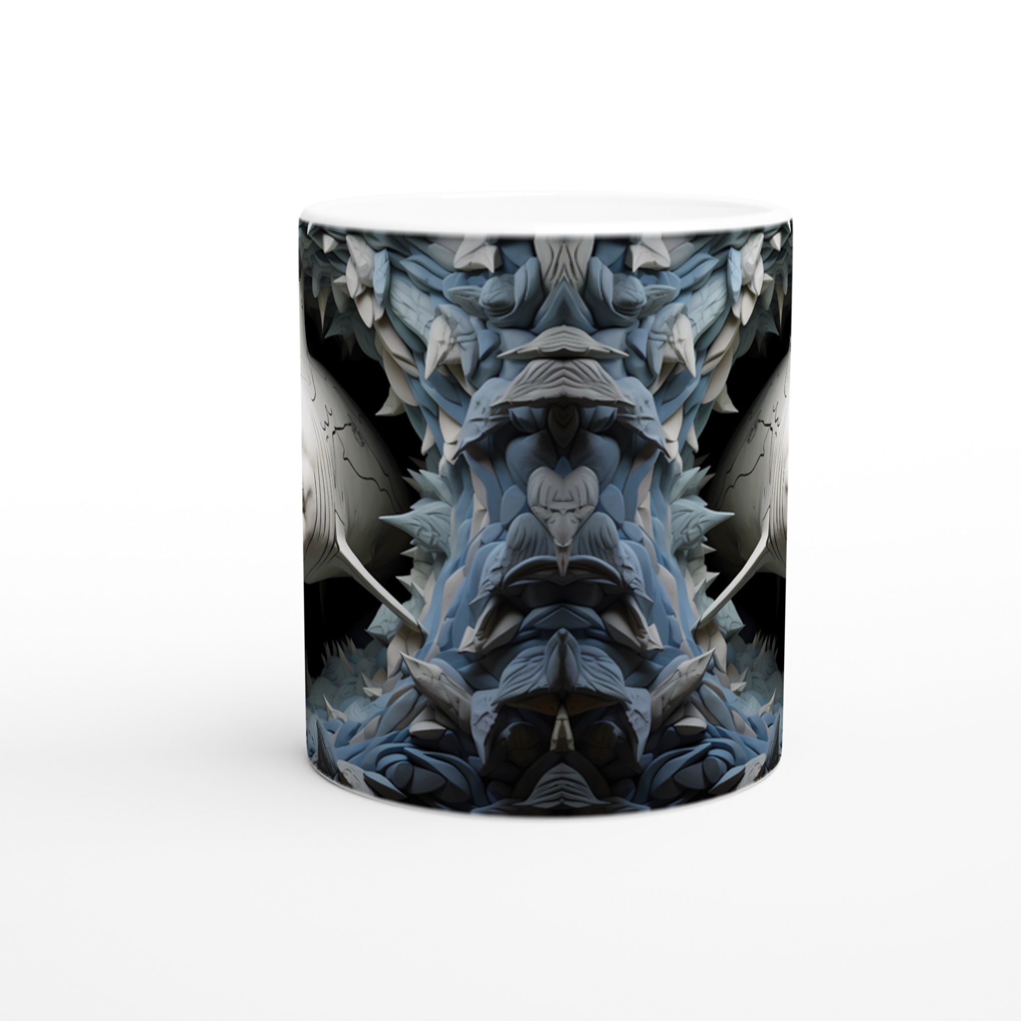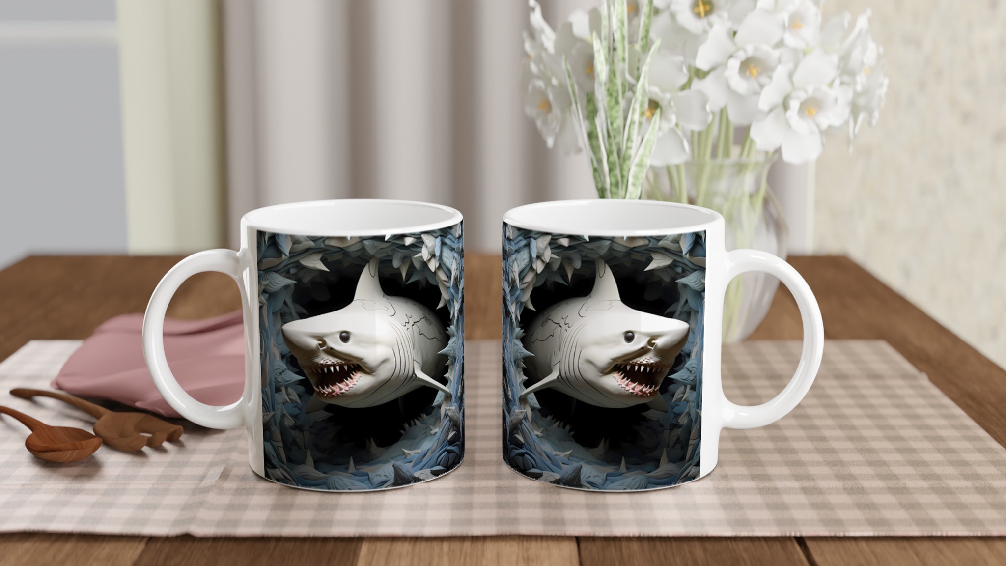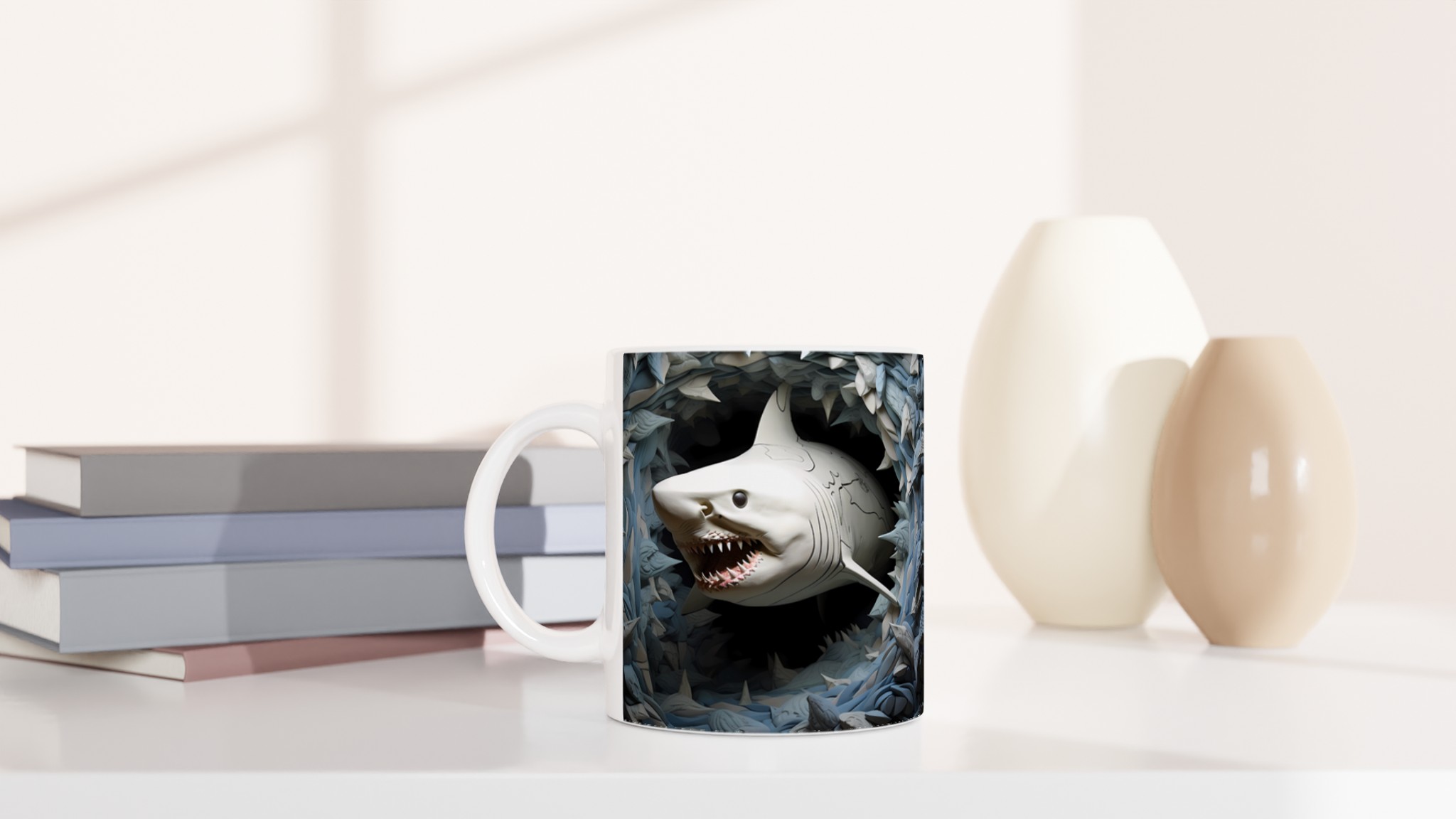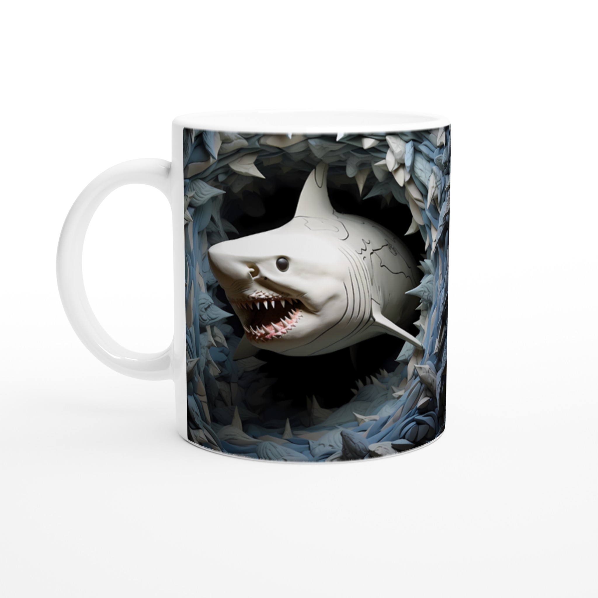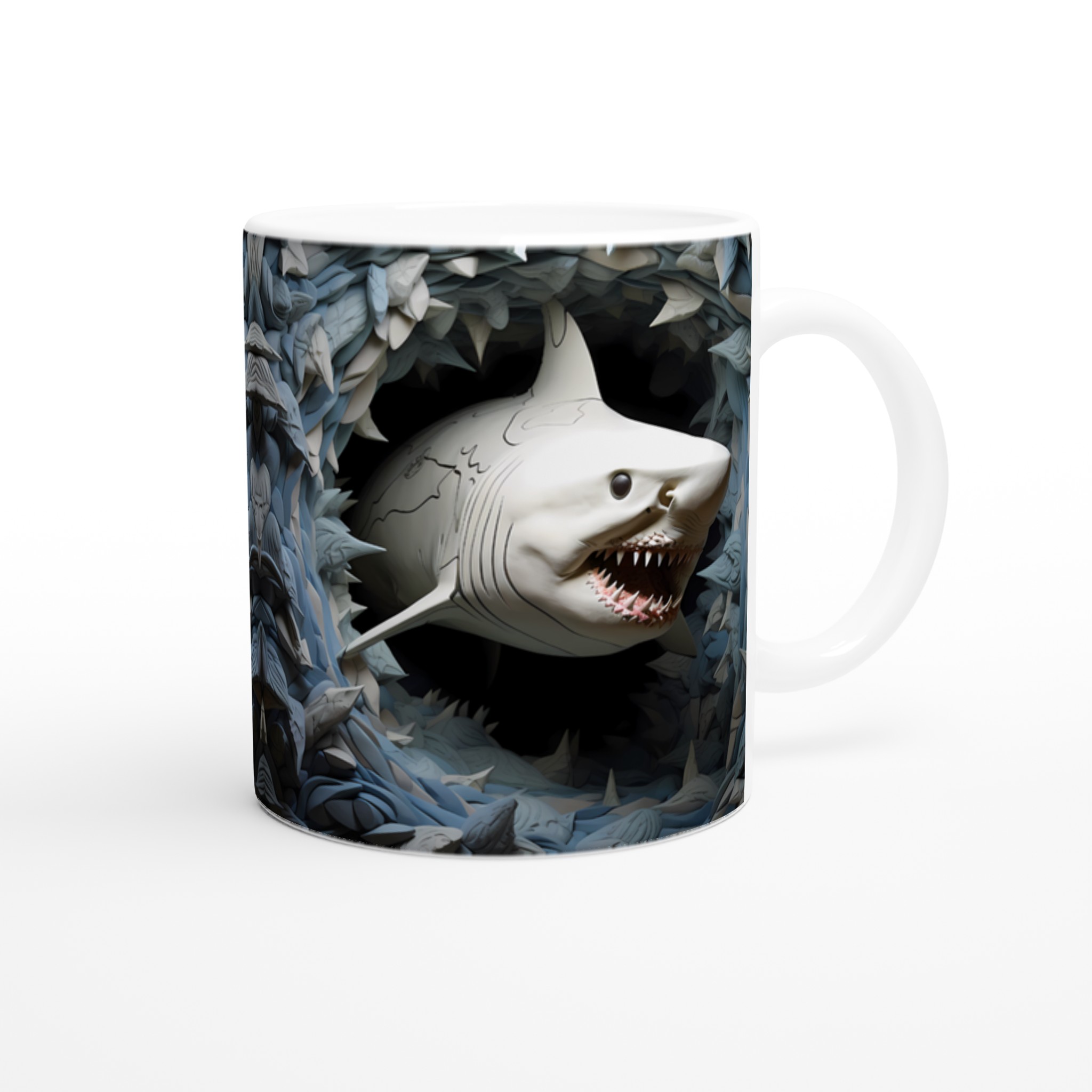 Dyk ner i en värld av stil med denna unika keramiska mugg, som fångar den majestätiska skönheten hos hajen i ett konstnärligt, nästan skulpturalt uttryck. Med sin blanka vita yta framhäver muggen trycket av de kraftfulla hajarna med otrolig klarhet och levande färger, omgiven av abstrakta, vågliknande former i nyanser av grått och blått. Denna mugg blir snabbt en vardagsfavorit, perfekt för morgonkaffet, kvällens varma choklad eller när du bara vill njuta av en kopp te medan du drömmer om havets djup.