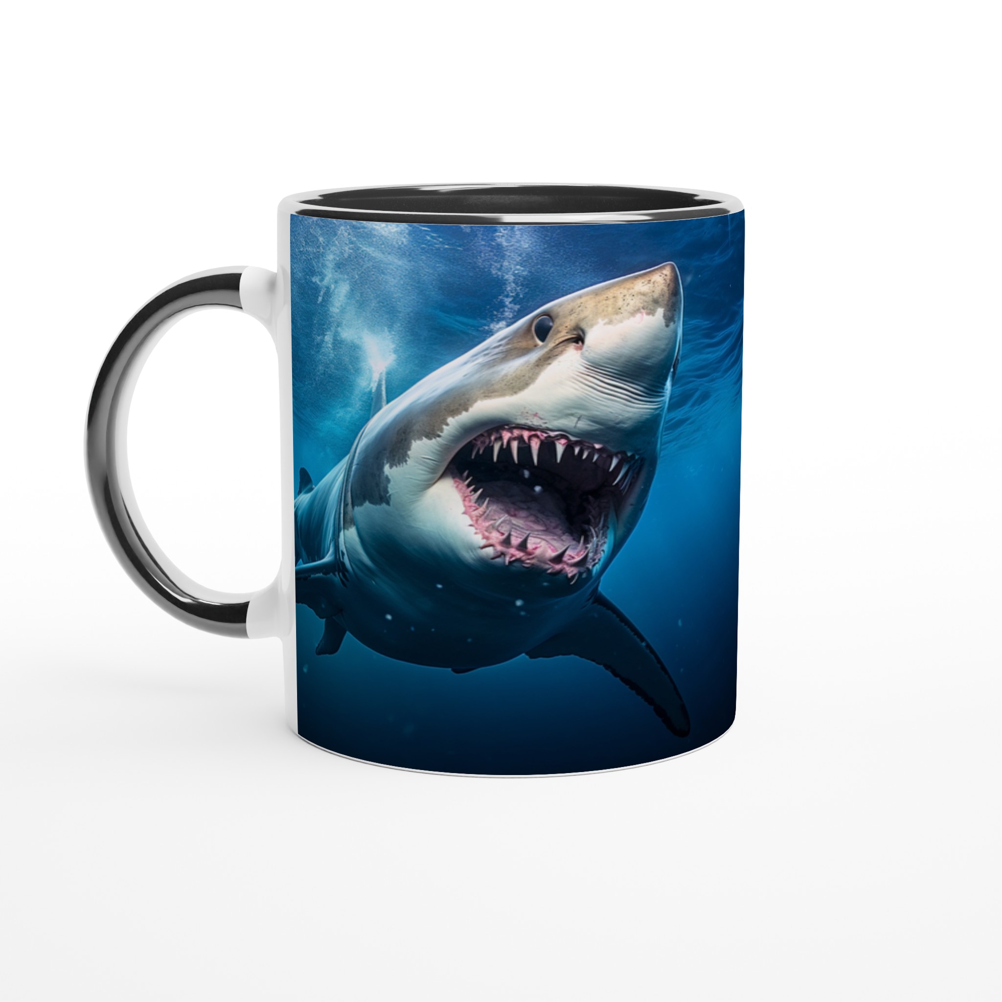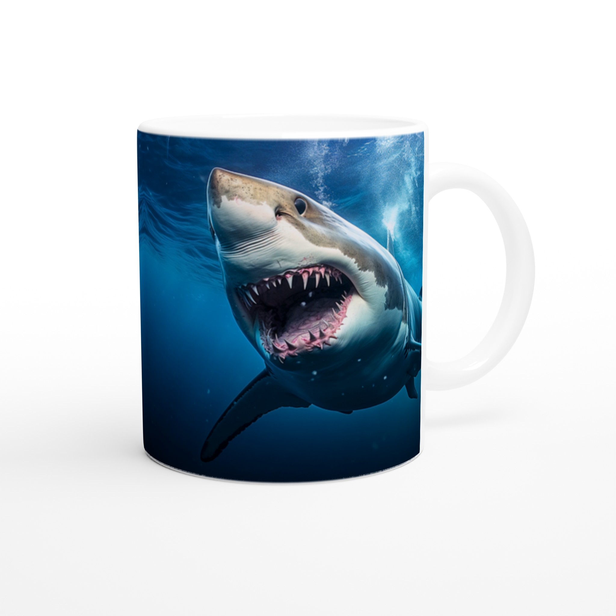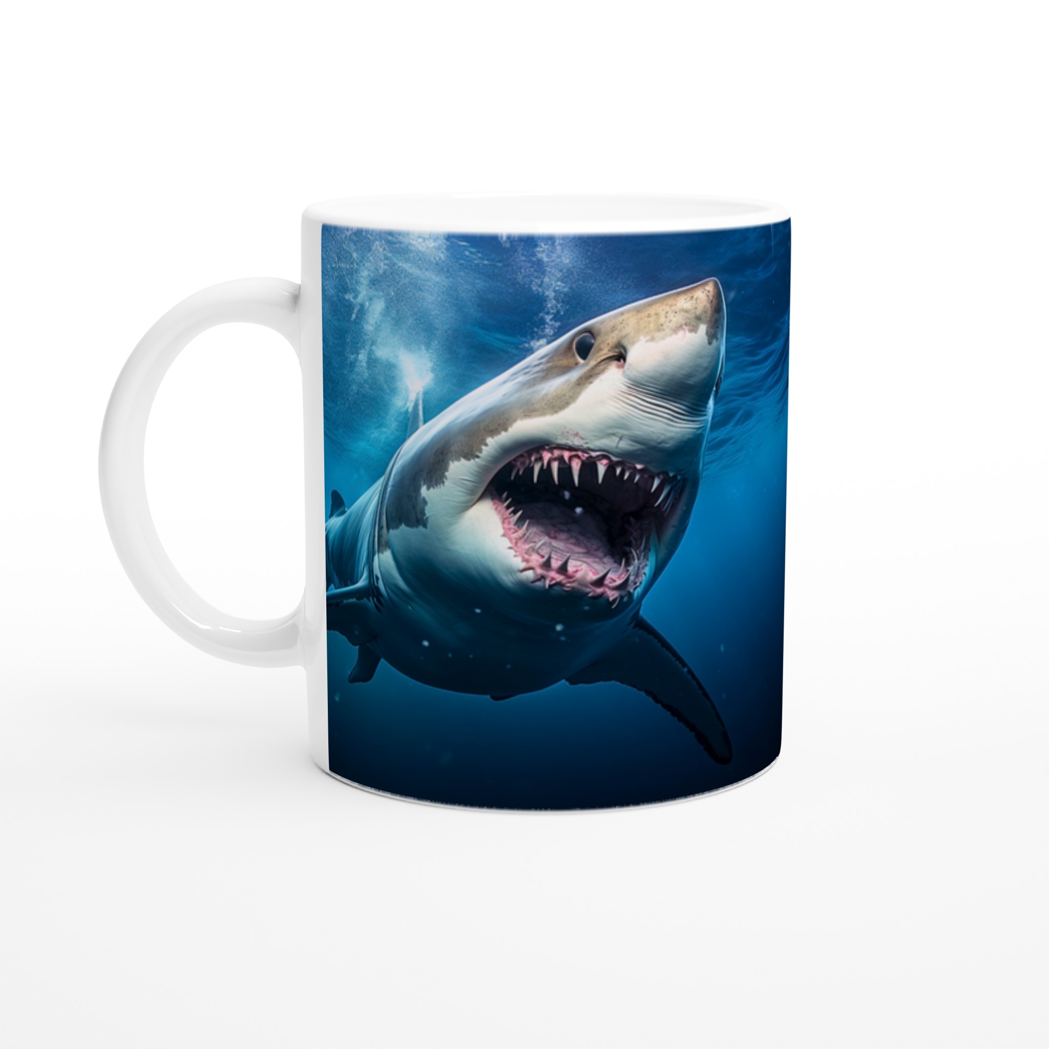 Ta en simtur på den vilda sidan med den här spännande keramiska muggen som har ett mäktigt hajmönster. Perfekt för morgonkaffet, kvällens varma choklad eller när du bara vill njuta av en kopp te. Den blanka vita ytan gör att trycken framhävs med klara och levande färger, som håller sig fina även efter många turer i mikron och diskmaskinen.