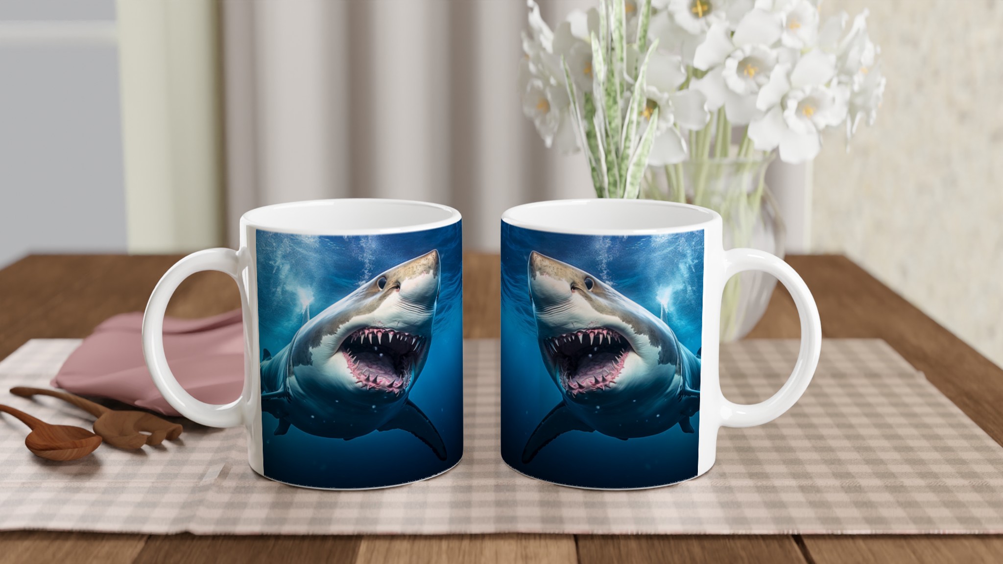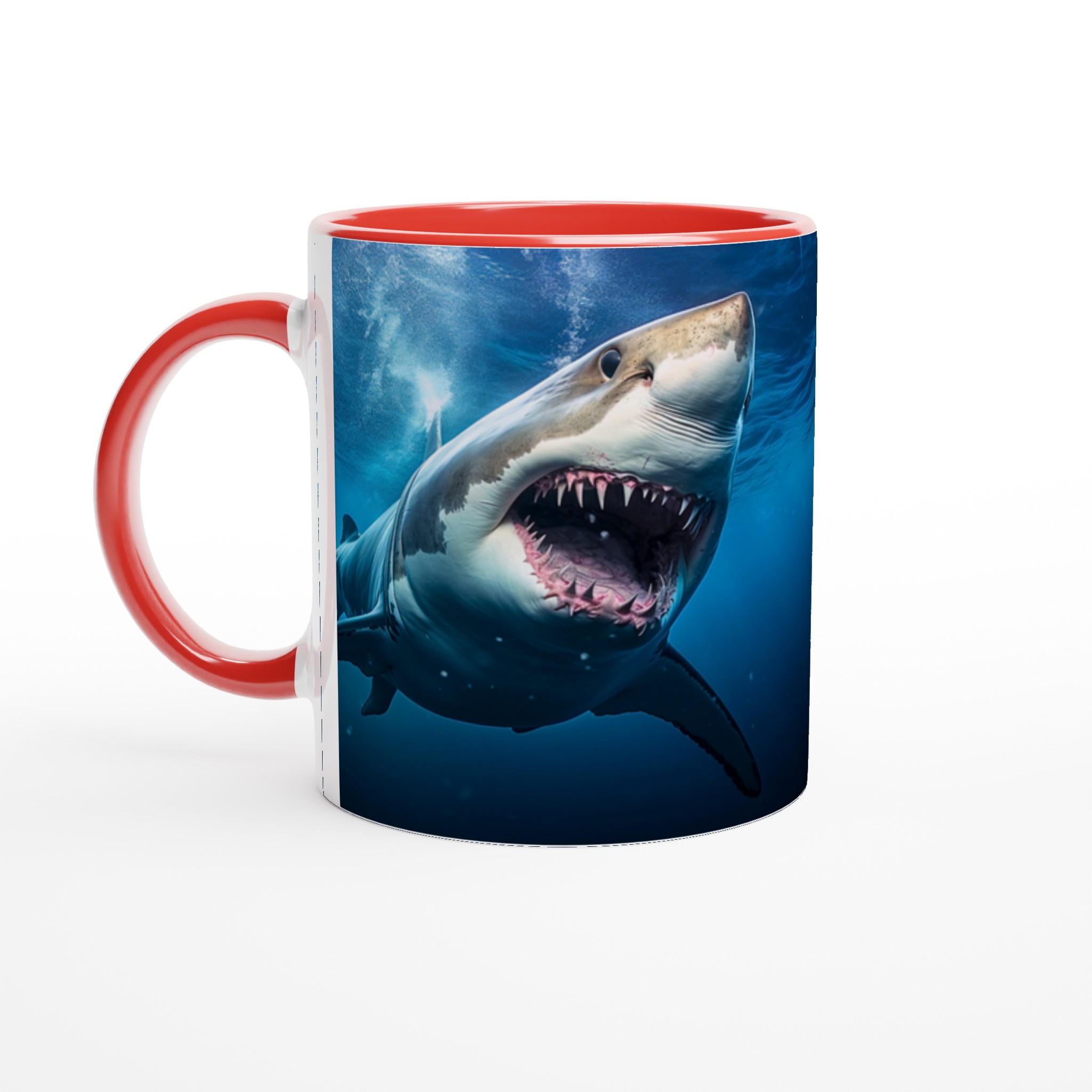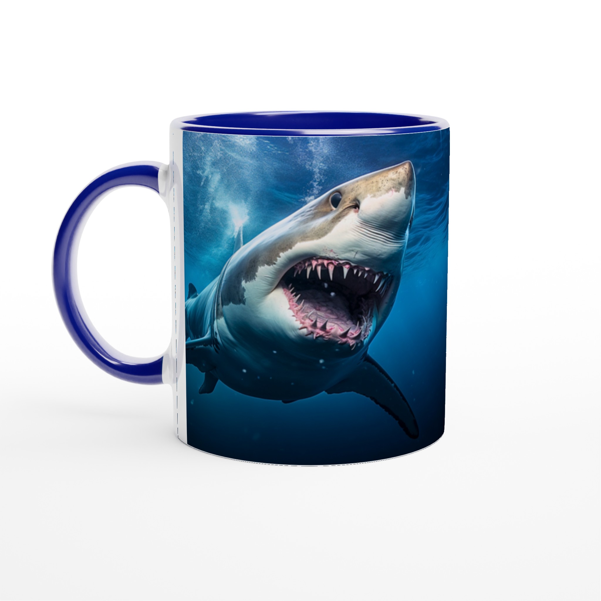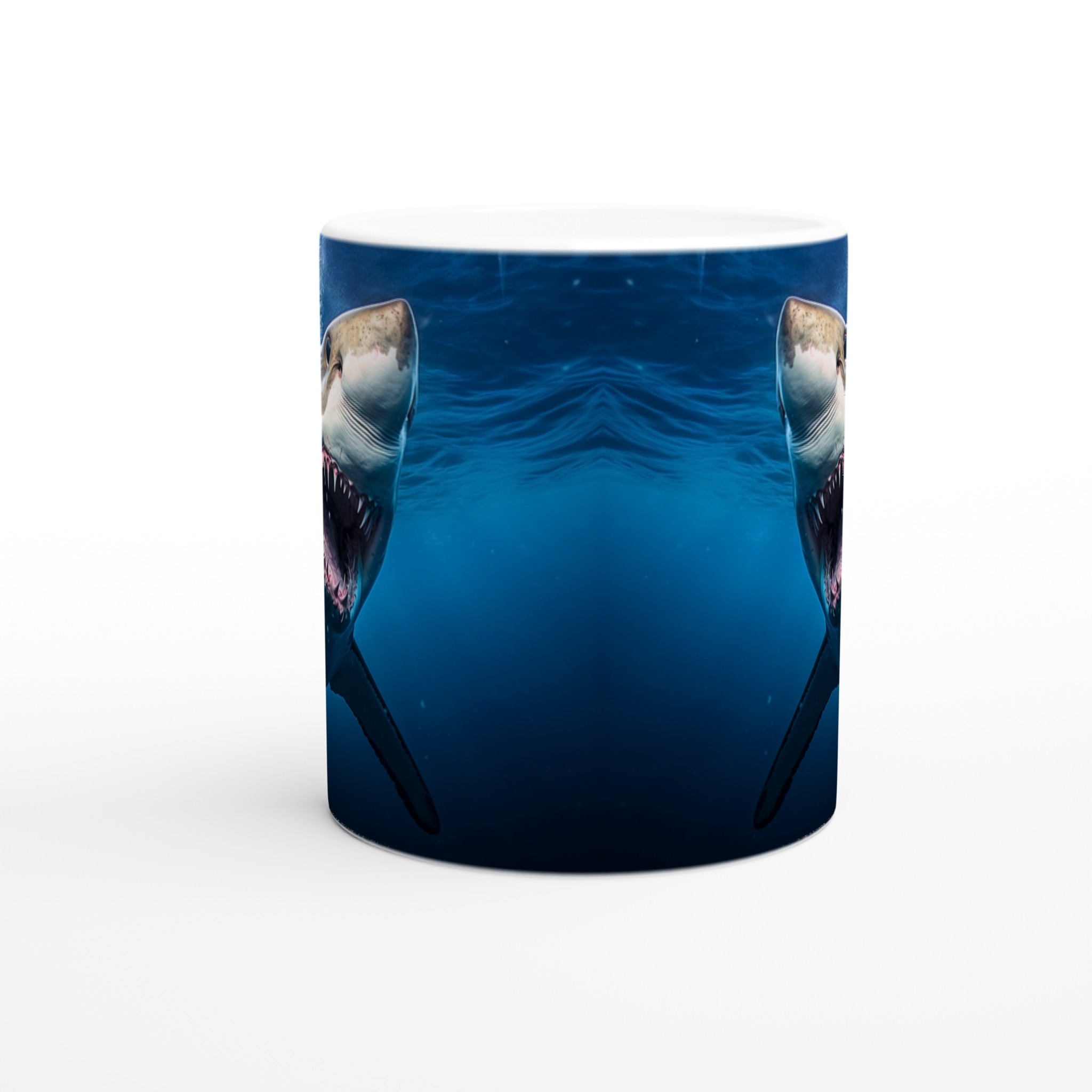 Ta en simtur på den vilda sidan med den här spännande keramiska muggen som har ett mäktigt hajmönster. Perfekt för morgonkaffet, kvällens varma choklad eller när du bara vill njuta av en kopp te. Den blanka vita ytan gör att trycken framhävs med klara och levande färger, som håller sig fina även efter många turer i mikron och diskmaskinen.