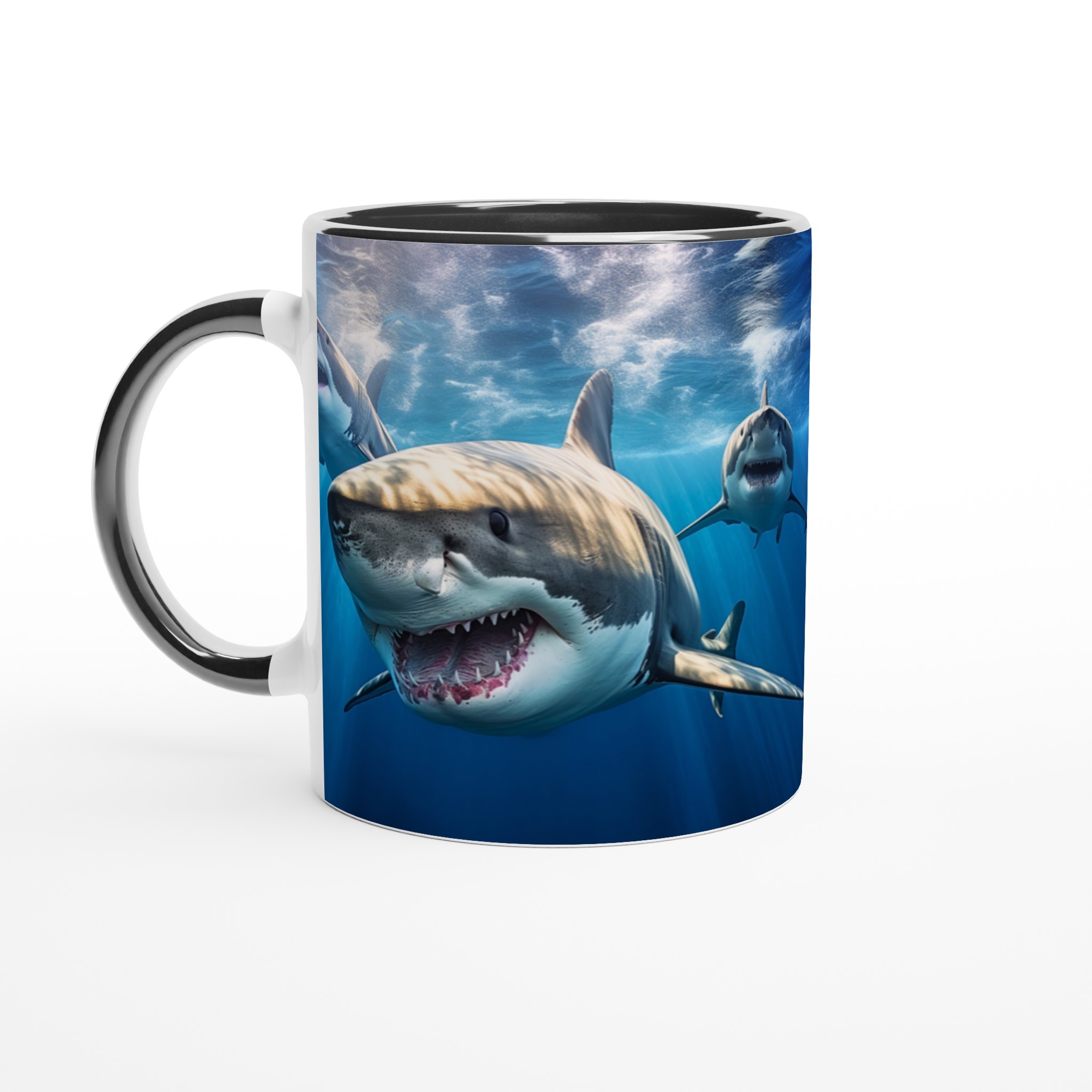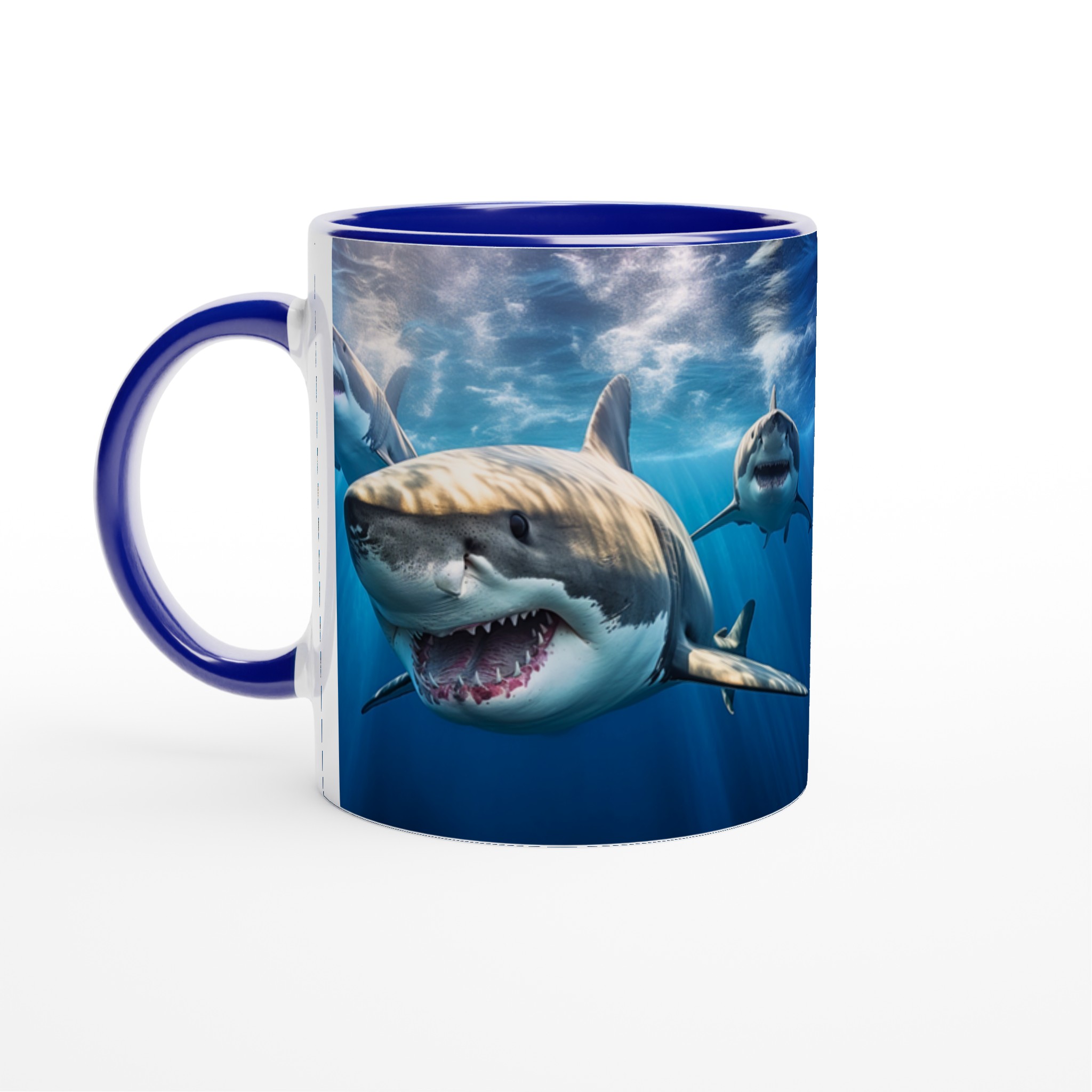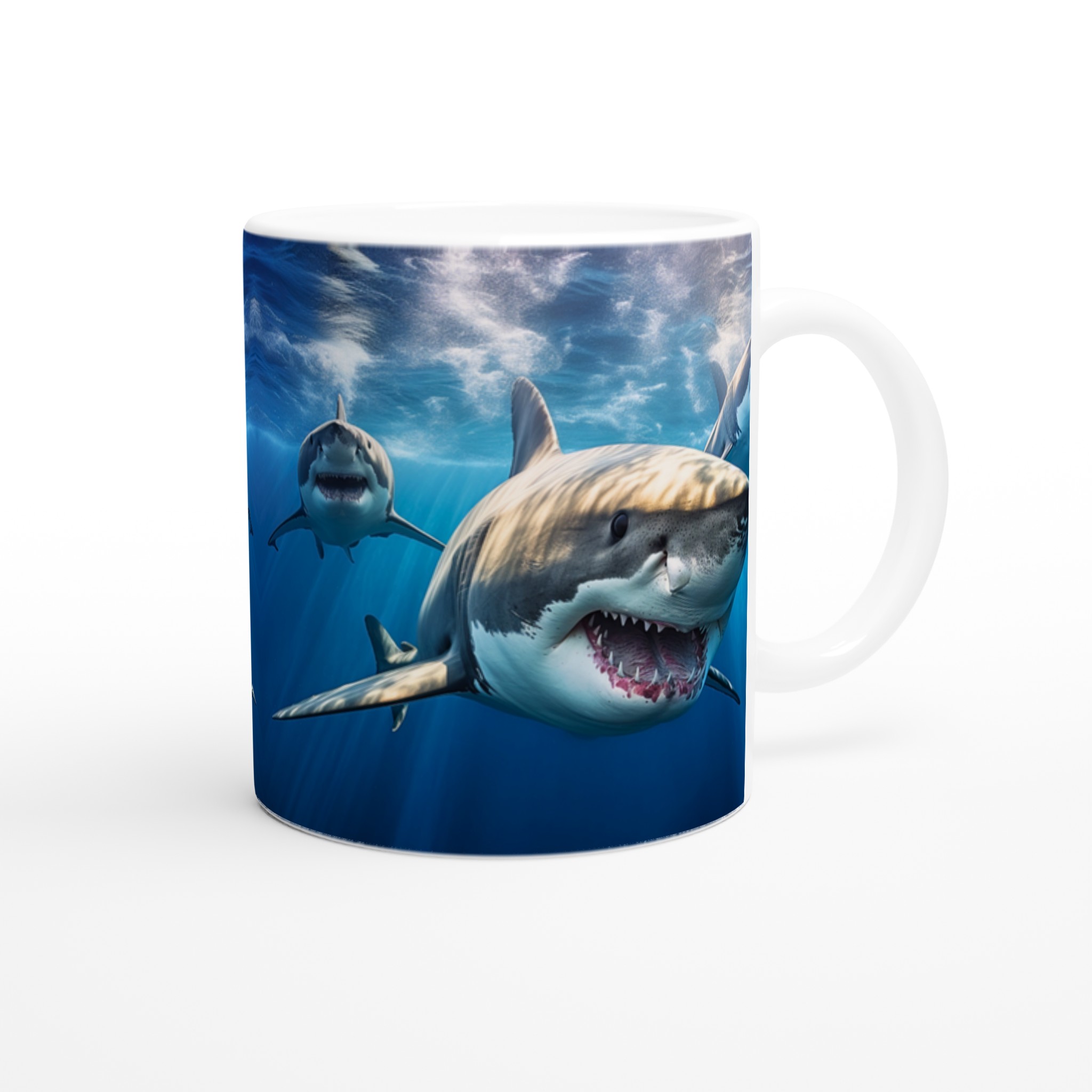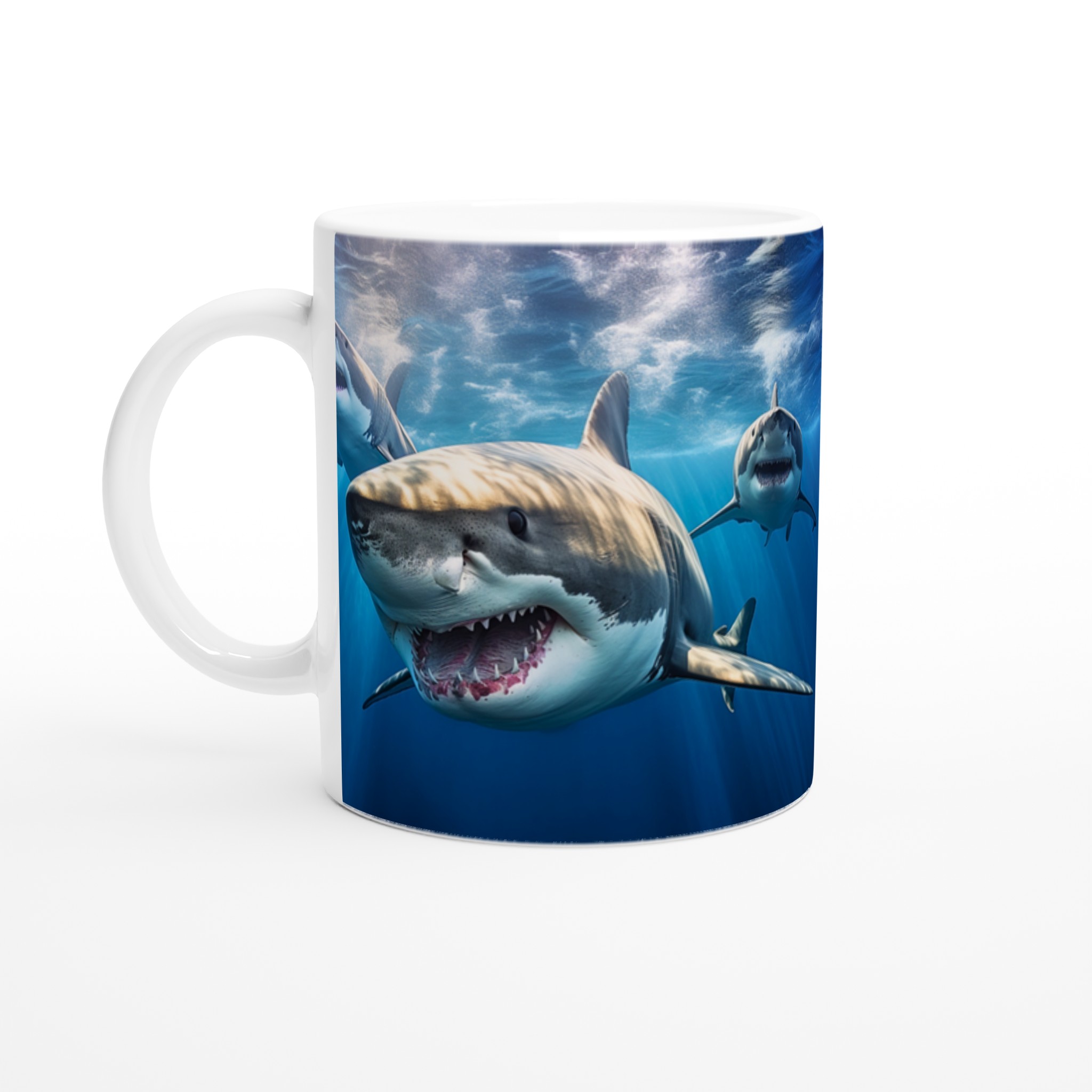 Ta med dig havets majestätiska kraft in i din vardag med denna imponerande keramiska mugg. Motivet av mäktiga hajar simmandes i det djupblå havet fångar en känsla av äventyr och respekt för naturen, perfekt för dig som älskar havet eller uppskattar en unik design. Den blanka vita ytan ser till att hajmotivet framhävs med otrolig skärpa och levande färger, som förblir lika fantastiska även efter otaliga turer i mikron och diskmaskinen.