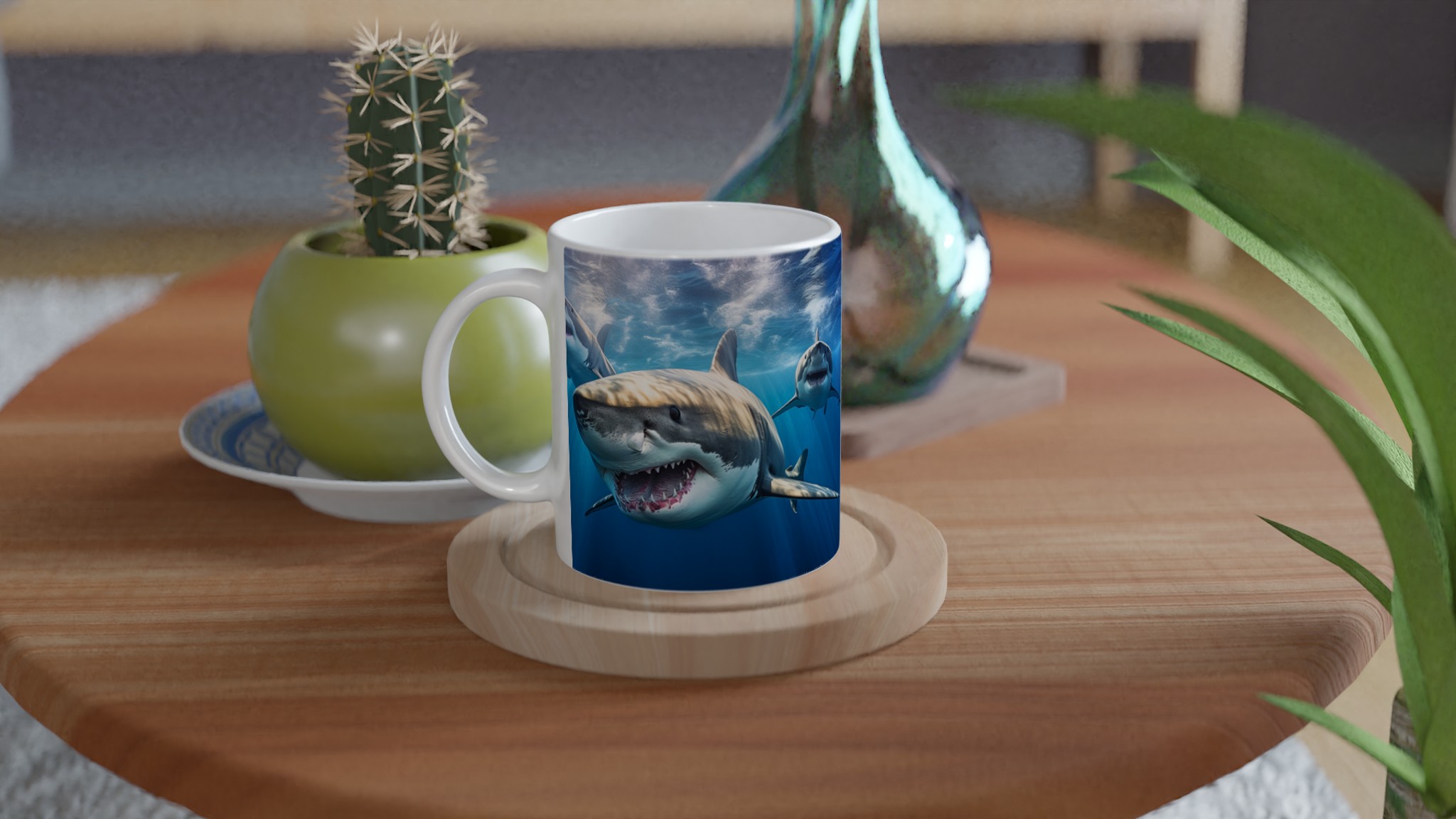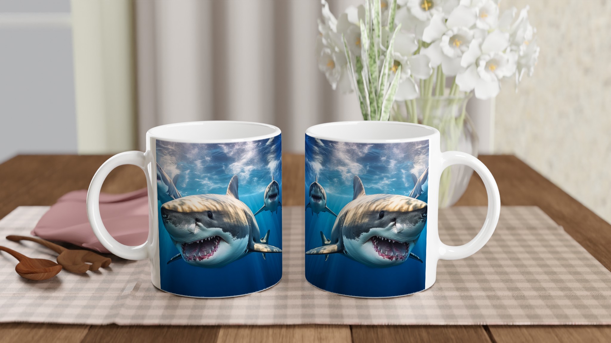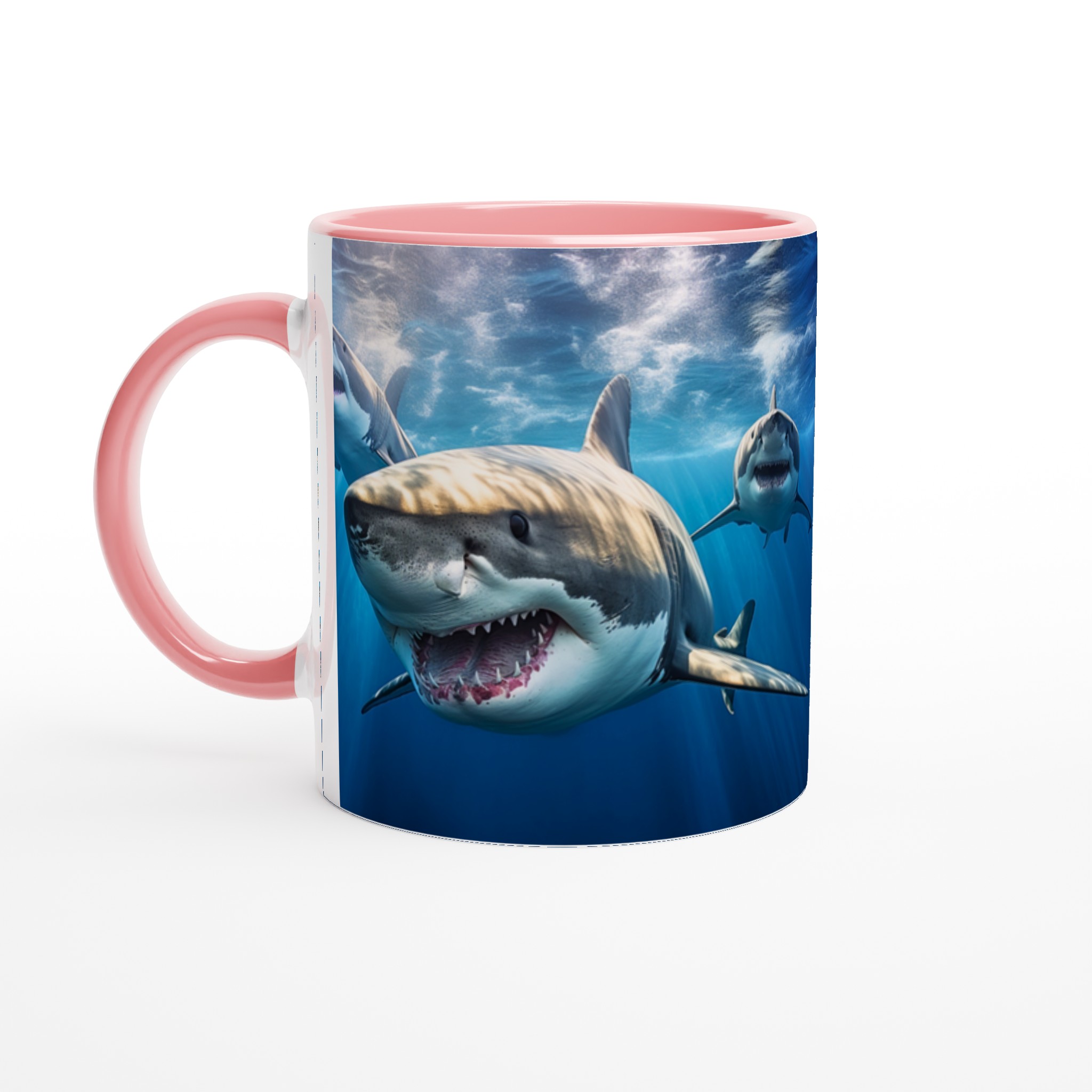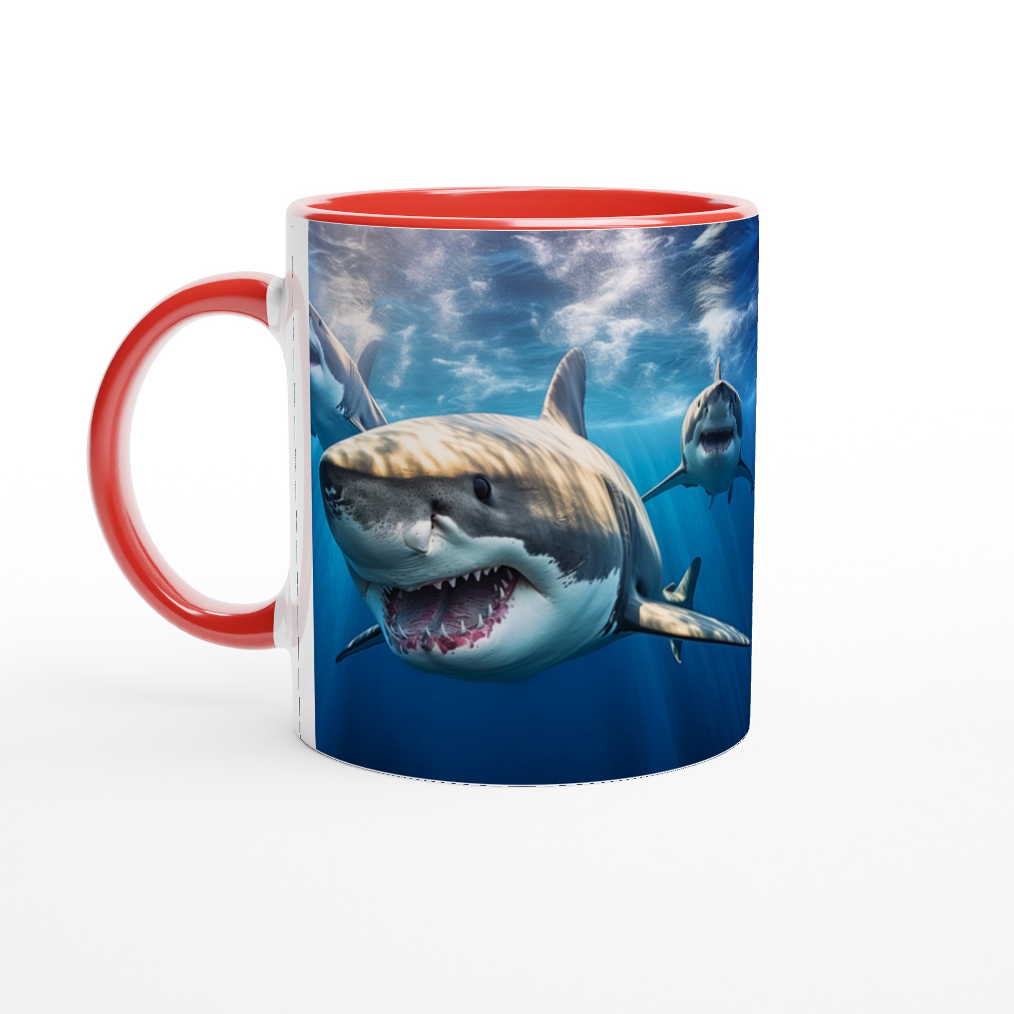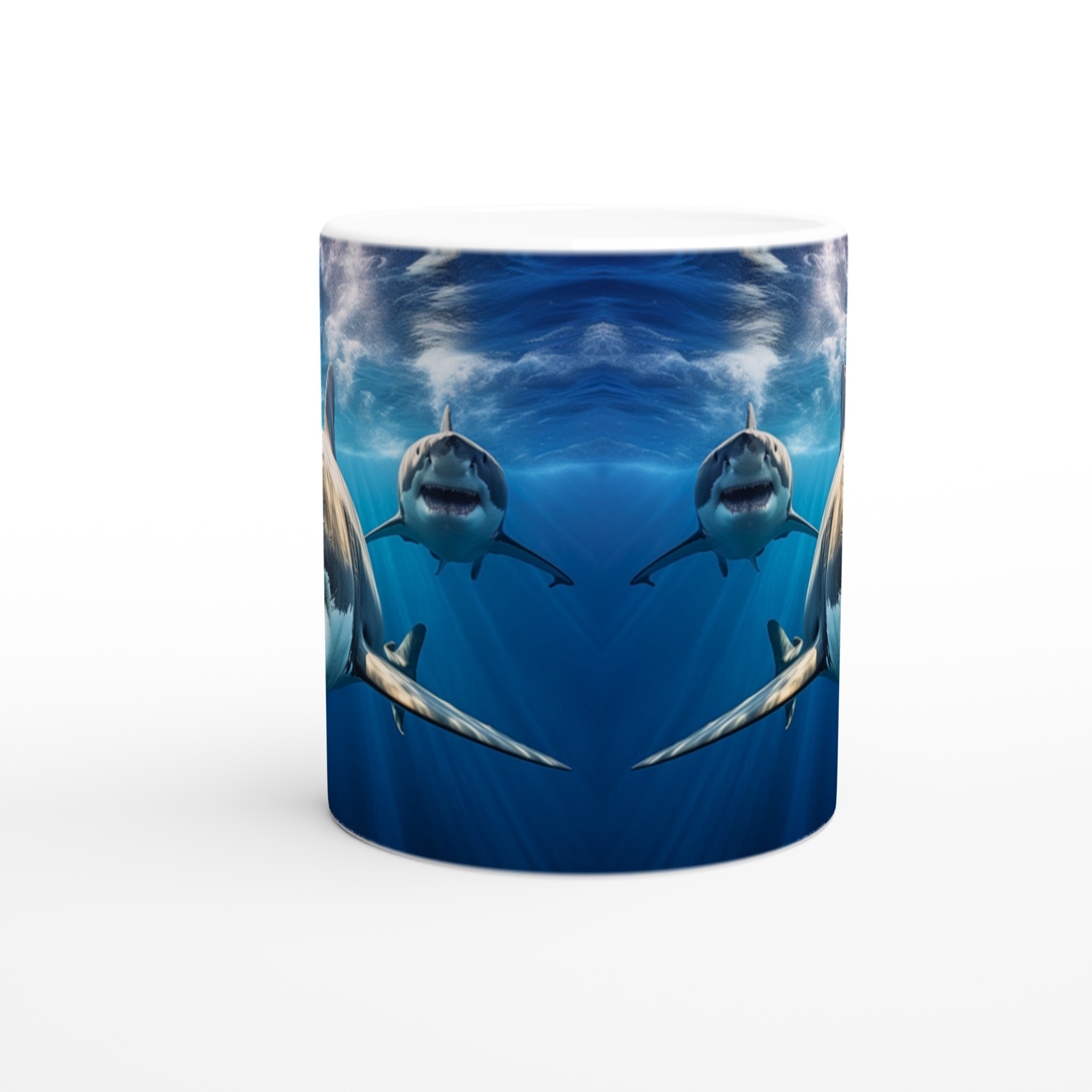 Ta med dig havets majestätiska kraft in i din vardag med denna imponerande keramiska mugg. Motivet av mäktiga hajar simmandes i det djupblå havet fångar en känsla av äventyr och respekt för naturen, perfekt för dig som älskar havet eller uppskattar en unik design. Den blanka vita ytan ser till att hajmotivet framhävs med otrolig skärpa och levande färger, som förblir lika fantastiska även efter otaliga turer i mikron och diskmaskinen.