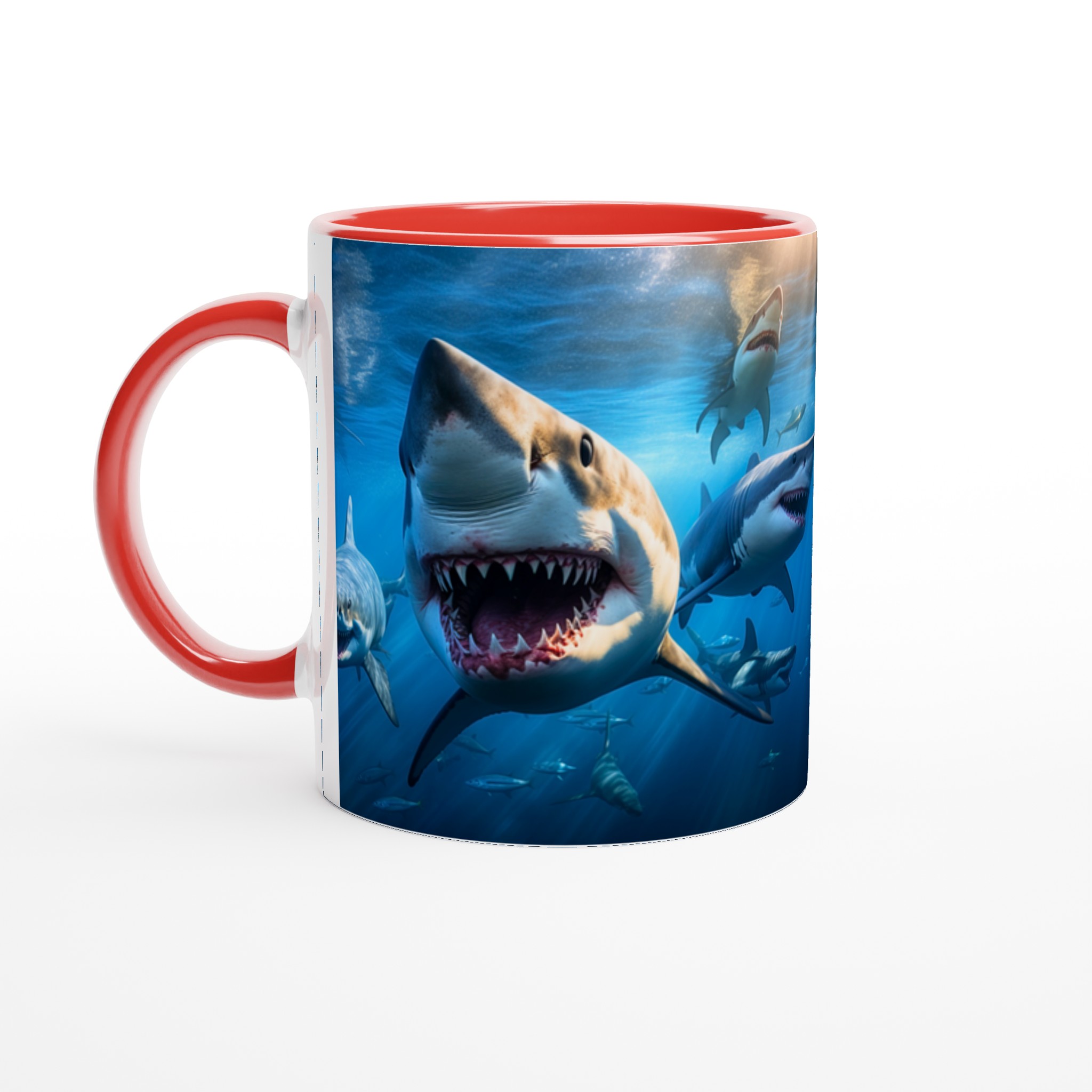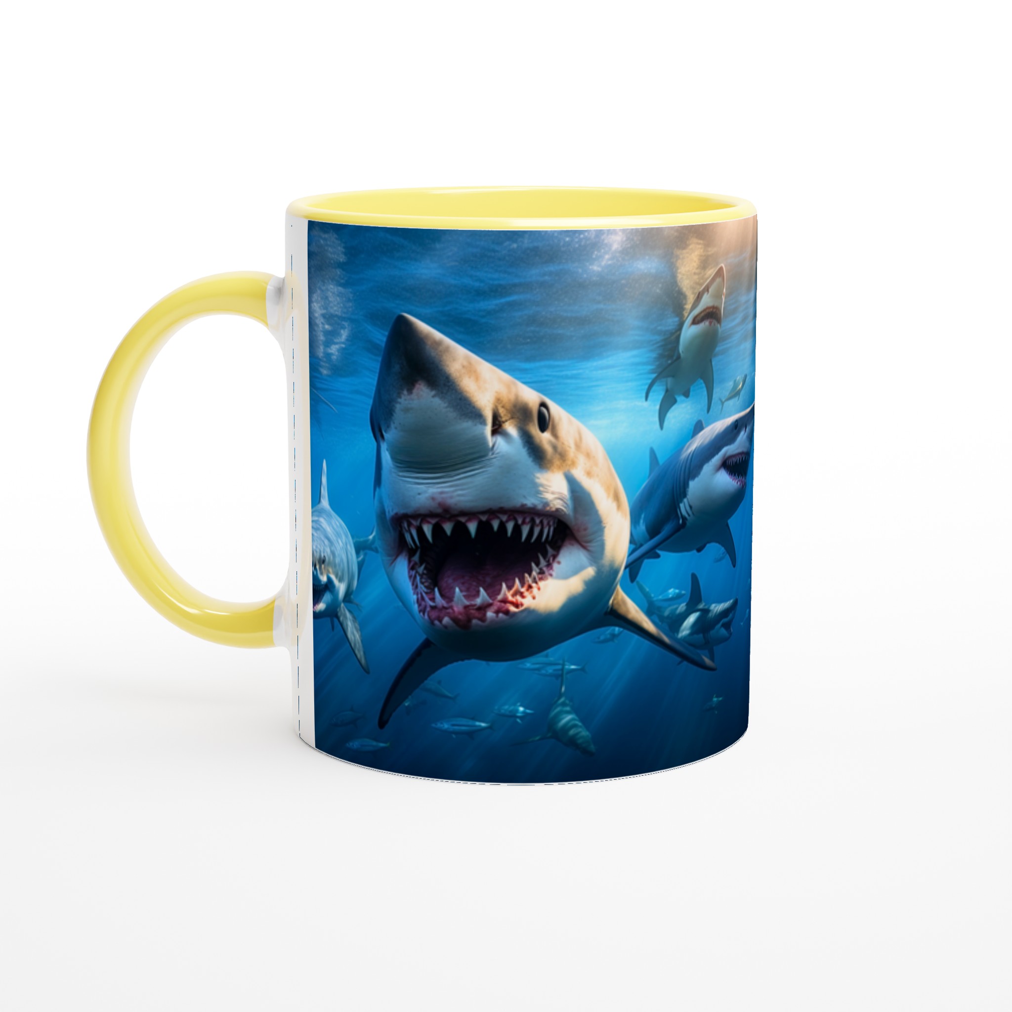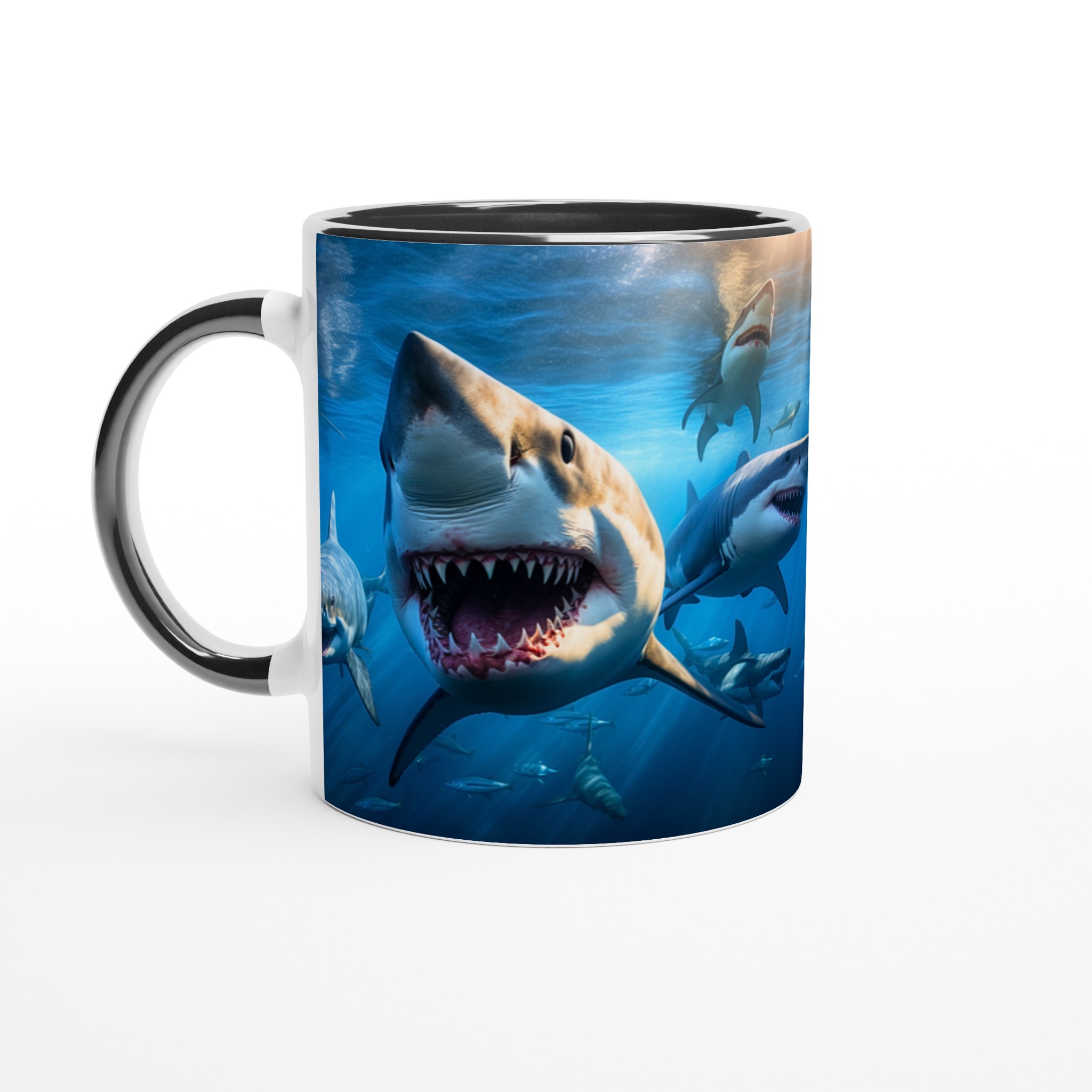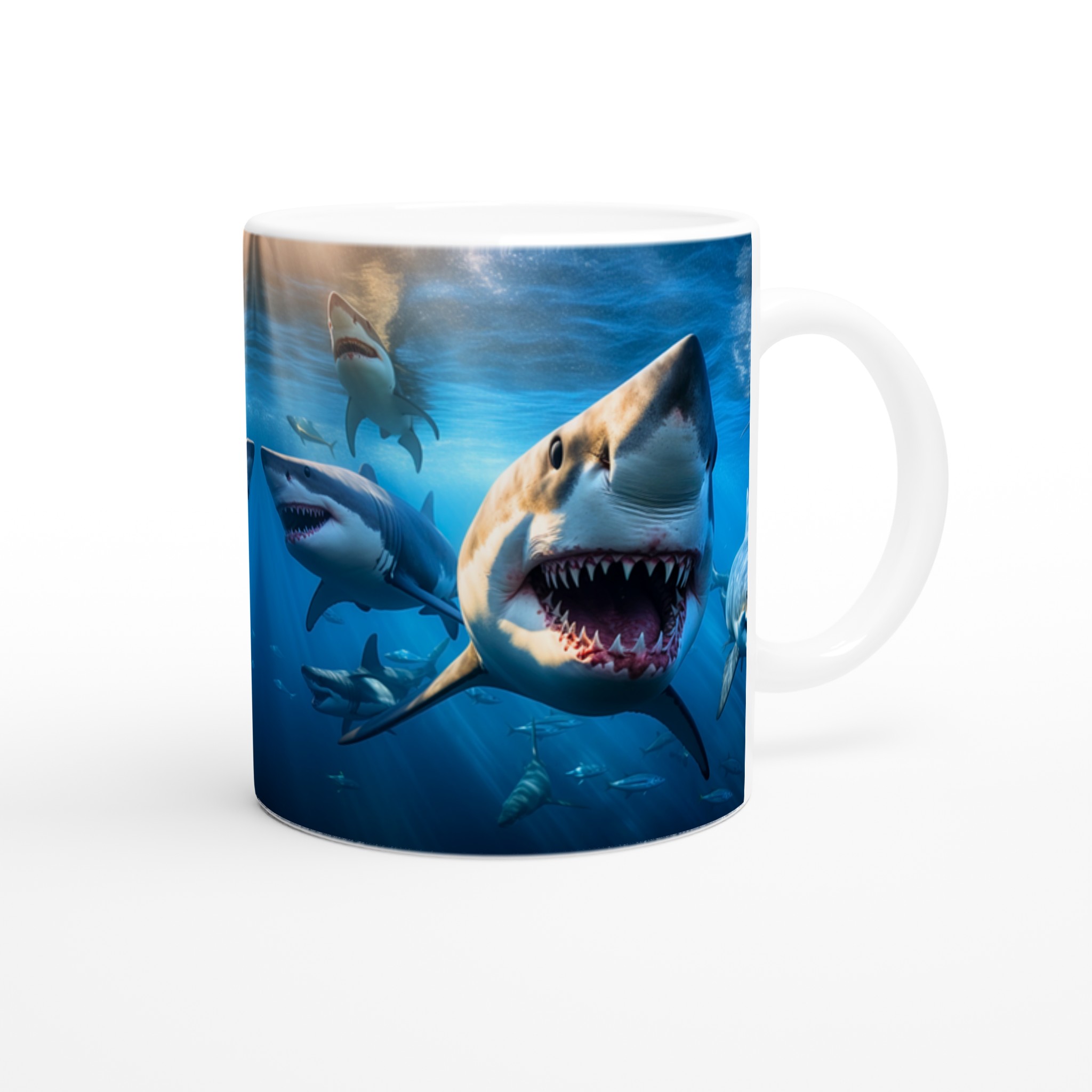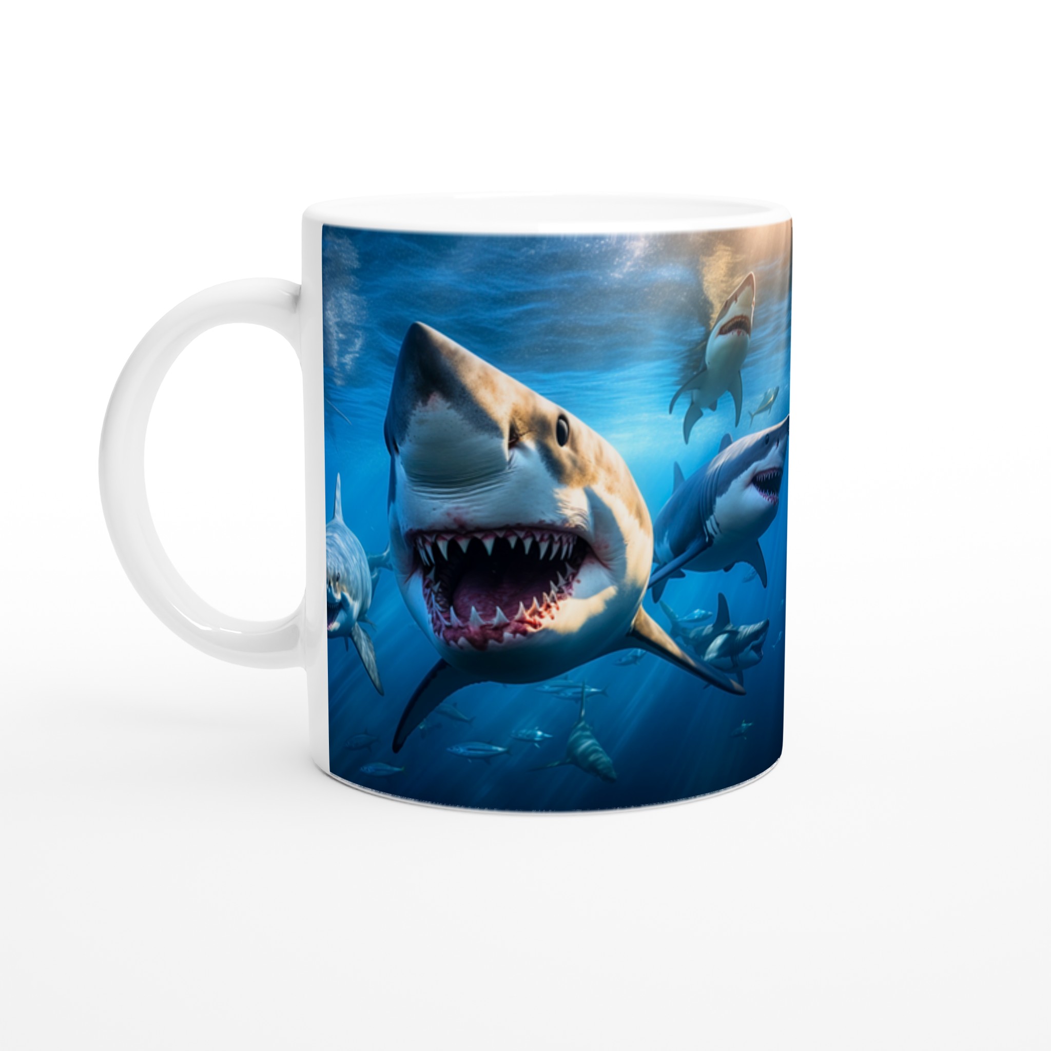 Dyk ner i spänningen varje morgon med denna otroliga keramiska mugg, som fångar den majestätiska och kraftfulla skönheten hos hajar under ytan. Med en livfull design som framhäver det dramatiska mötet med hajar, blir denna mugg snabbt din nya vardagsfavorit. Perfekt för morgonkaffet, kvällens varma choklad eller när du bara vill njuta av en kopp te – den blanka ytan får designen att framhävas med klara och levande färger, som håller sig fina även efter många turer i mikron och diskmaskinen.