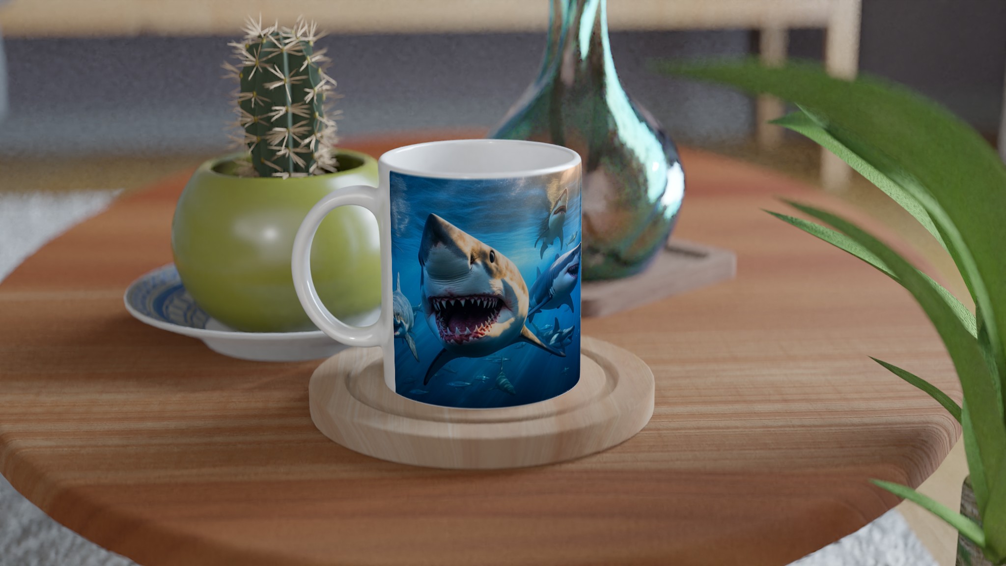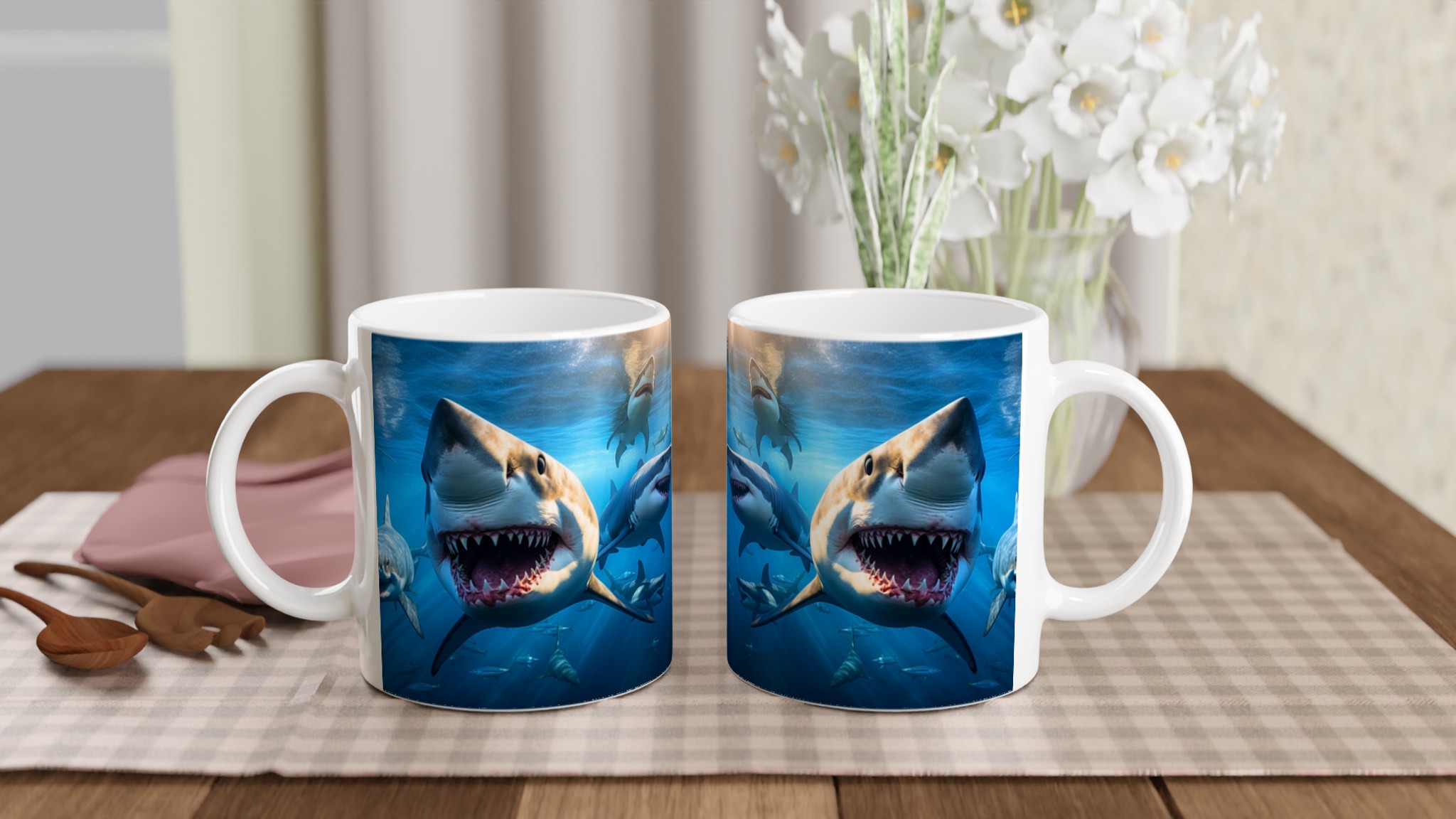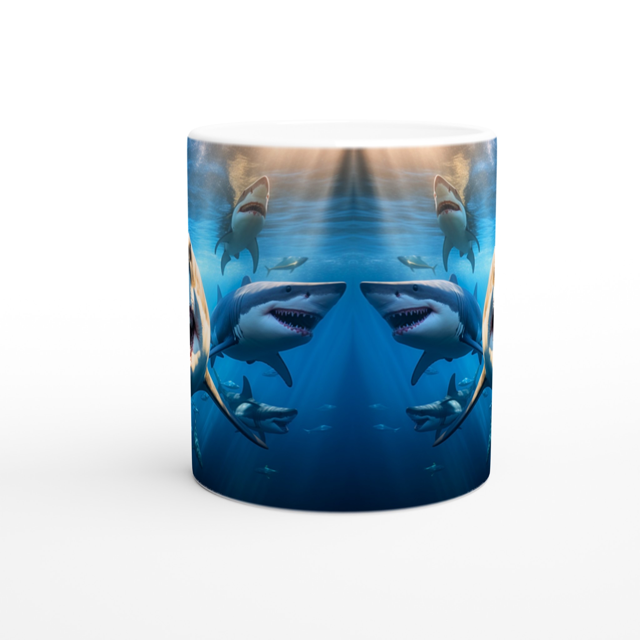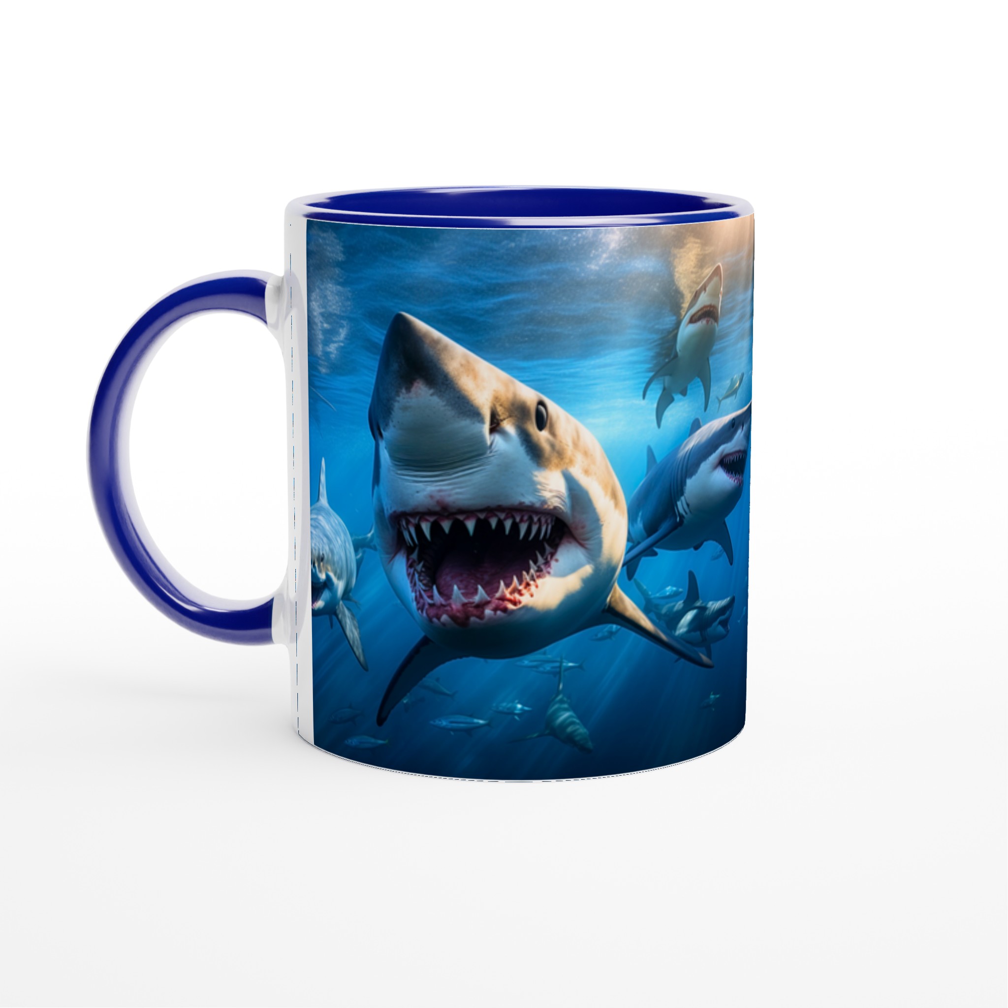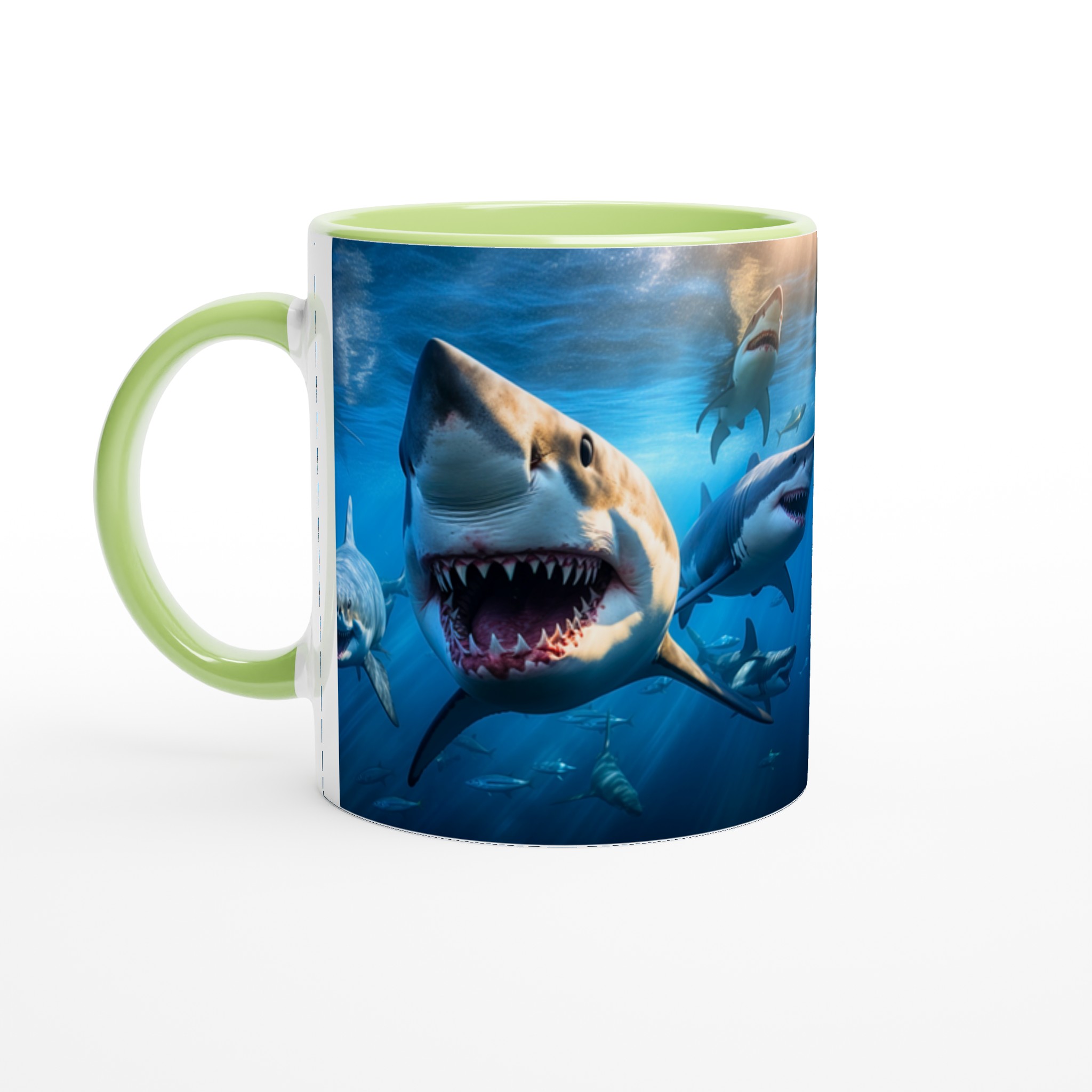 Dyk ner i spänningen varje morgon med denna otroliga keramiska mugg, som fångar den majestätiska och kraftfulla skönheten hos hajar under ytan. Med en livfull design som framhäver det dramatiska mötet med hajar, blir denna mugg snabbt din nya vardagsfavorit. Perfekt för morgonkaffet, kvällens varma choklad eller när du bara vill njuta av en kopp te – den blanka ytan får designen att framhävas med klara och levande färger, som håller sig fina även efter många turer i mikron och diskmaskinen.