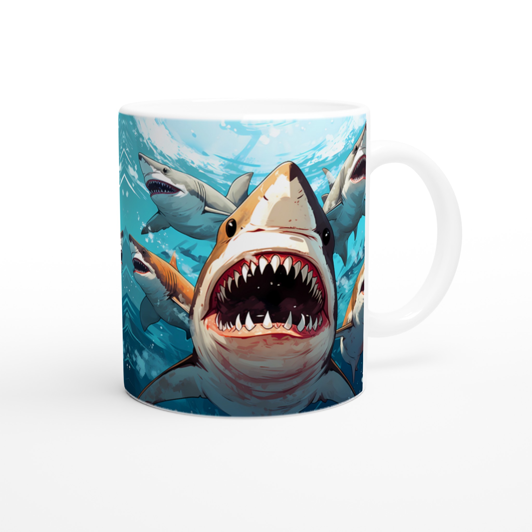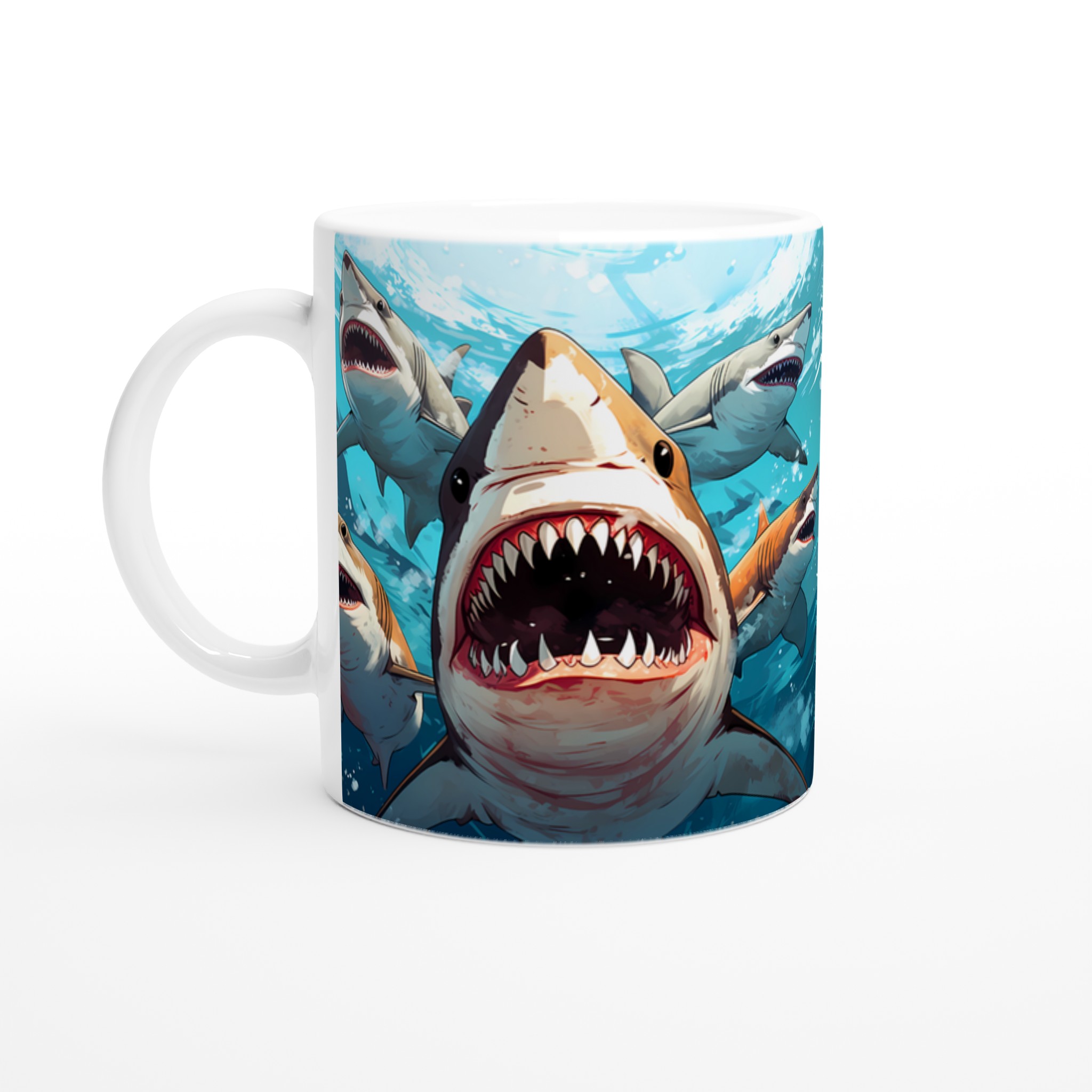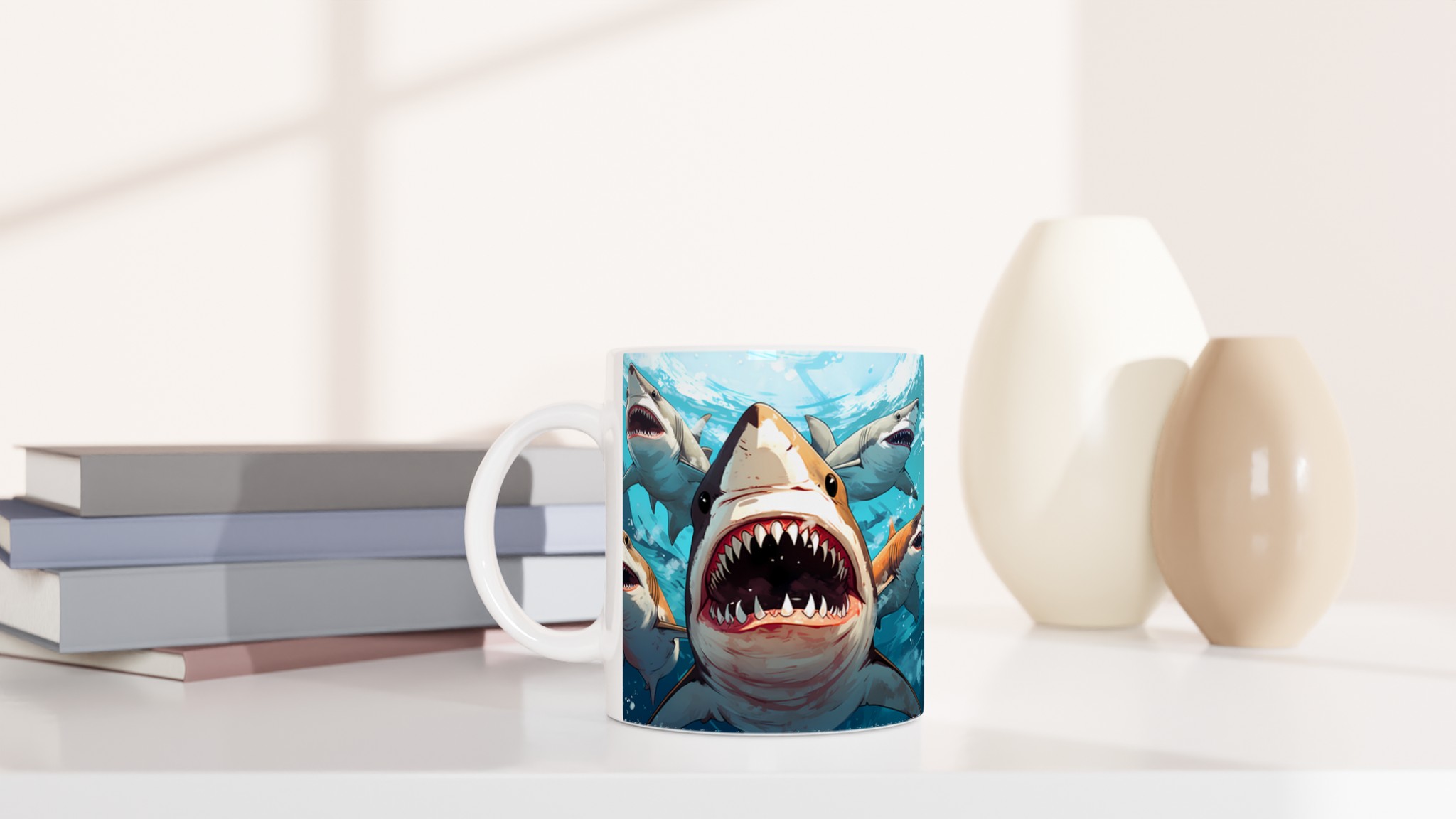 Dyk ner i en spännande start på dagen med denna haj-inspirerade keramiska mugg! Oavsett om du behöver en koffeinboost för att ta dig an dagen som en haj, eller bara vill njuta av en mysig kvällsdrink, blir den här muggen snabbt din nya favorit. Den djärva illustrationen med majestätiska hajar i turkost vatten kommer garanterat att väcka uppmärksamhet och ge energi till varje klunk.