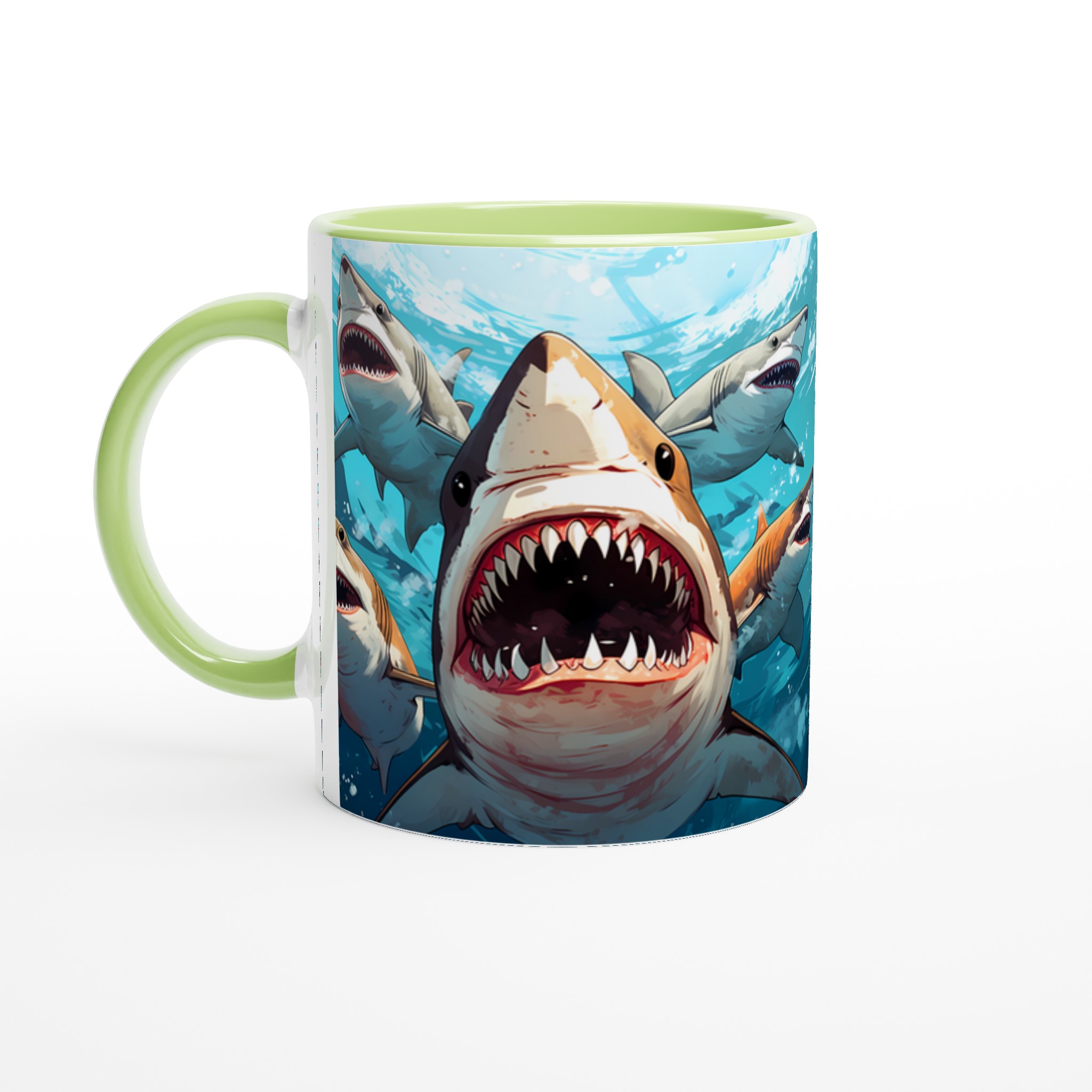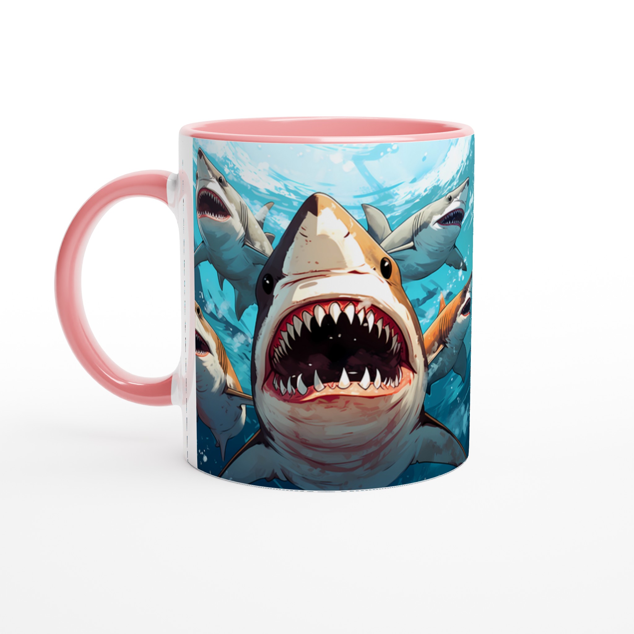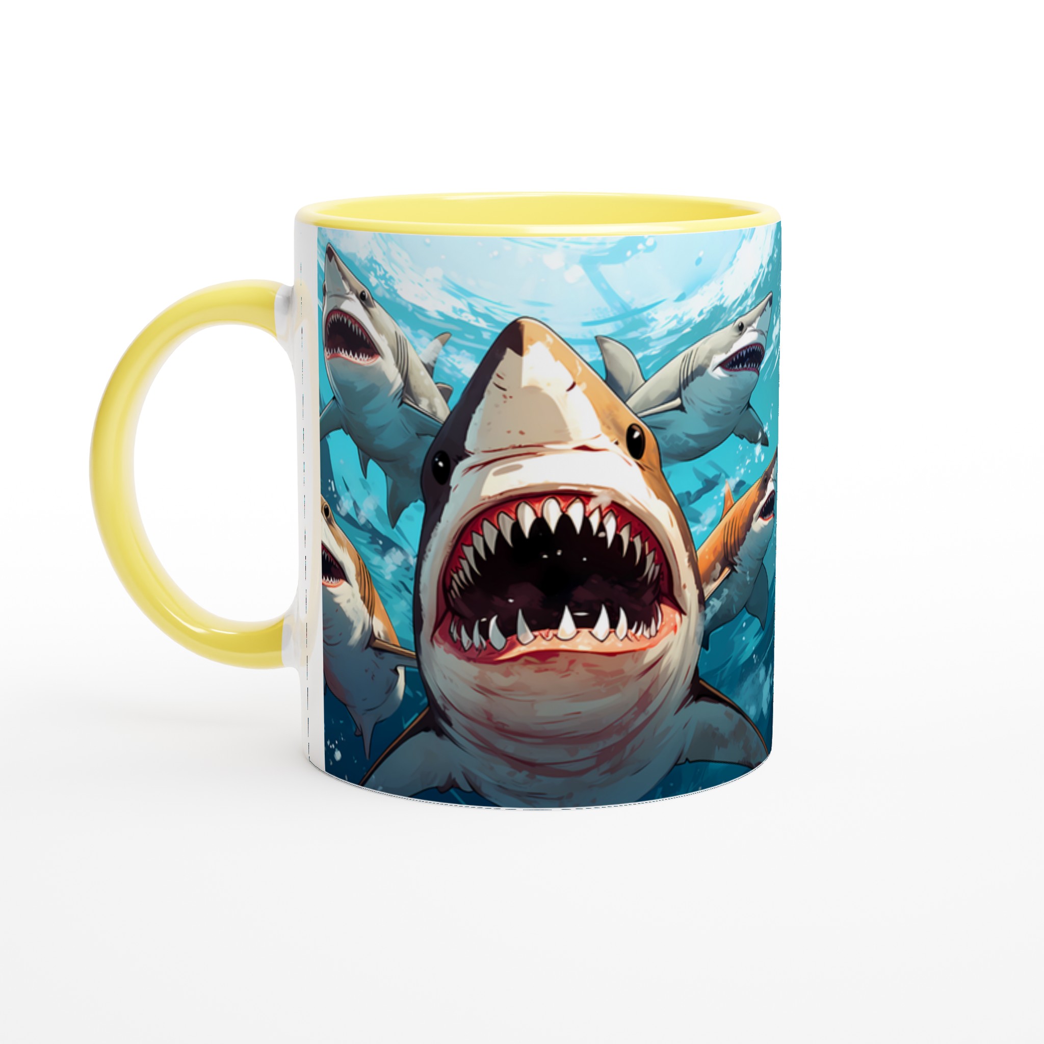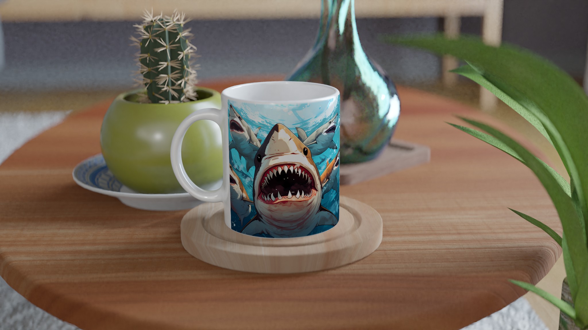 Dyk ner i en spännande start på dagen med denna haj-inspirerade keramiska mugg! Oavsett om du behöver en koffeinboost för att ta dig an dagen som en haj, eller bara vill njuta av en mysig kvällsdrink, blir den här muggen snabbt din nya favorit. Den djärva illustrationen med majestätiska hajar i turkost vatten kommer garanterat att väcka uppmärksamhet och ge energi till varje klunk.