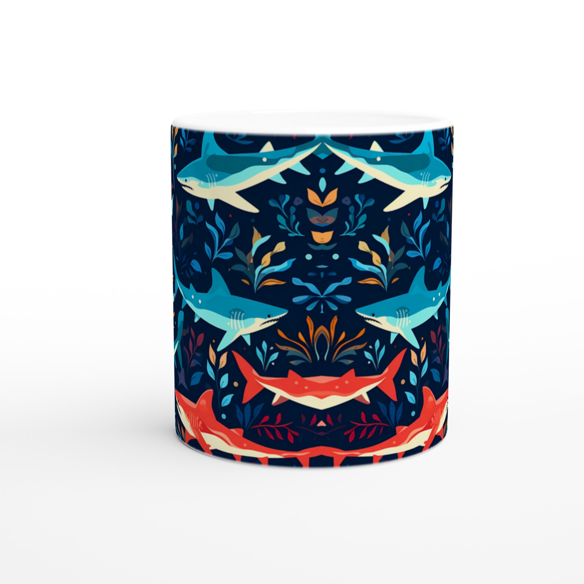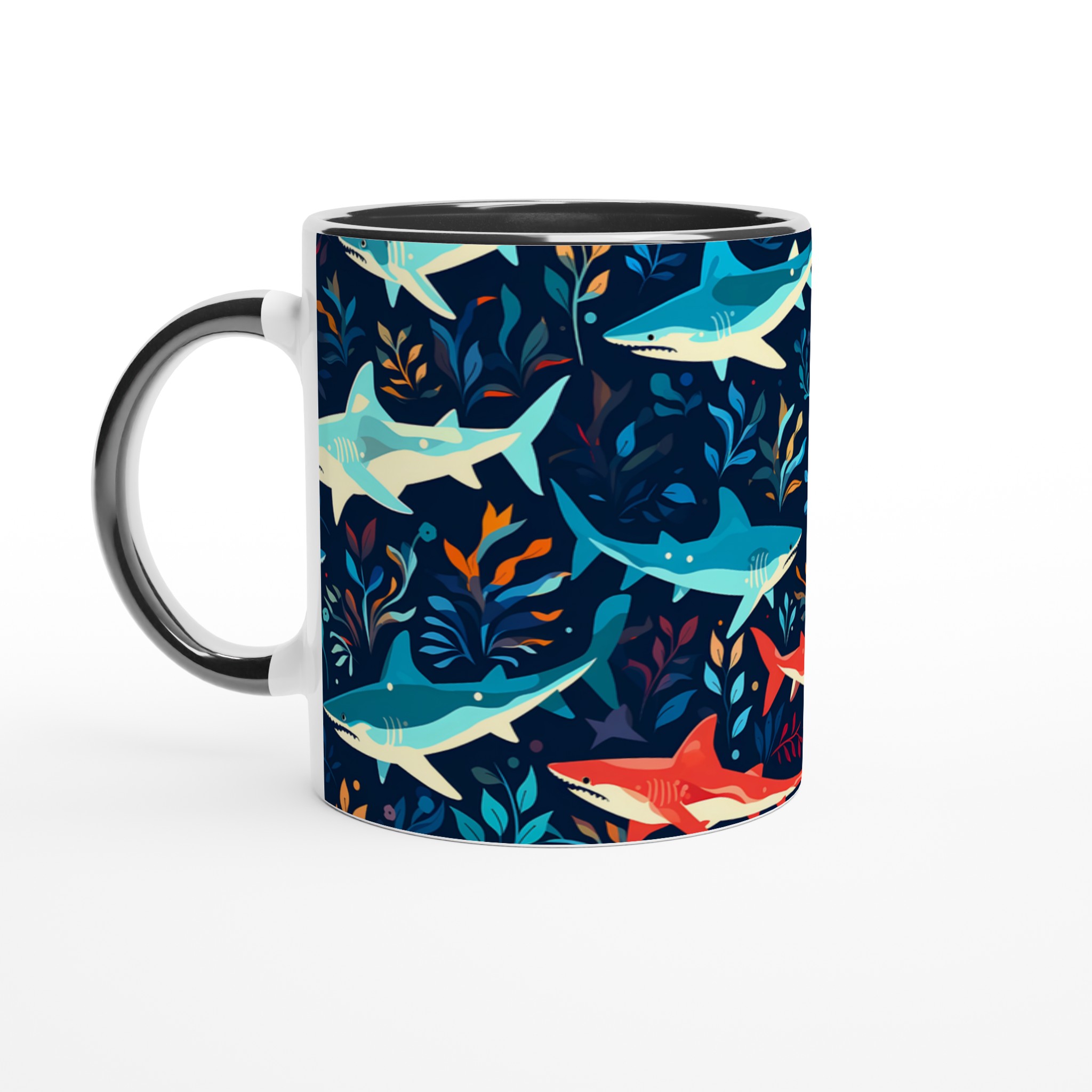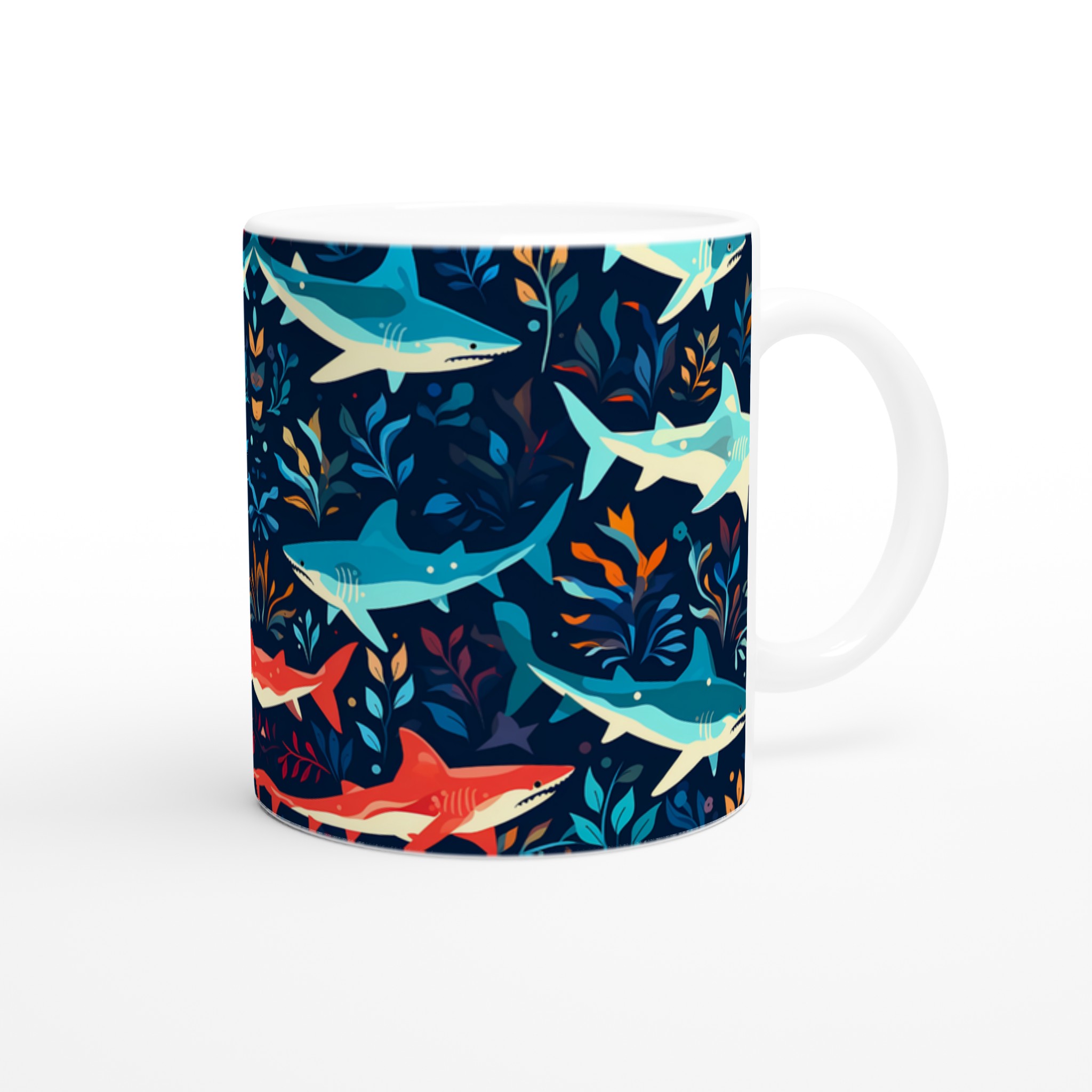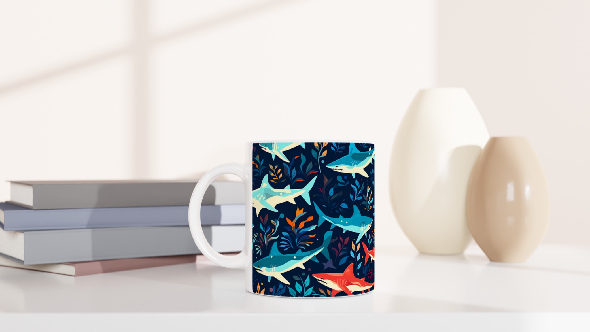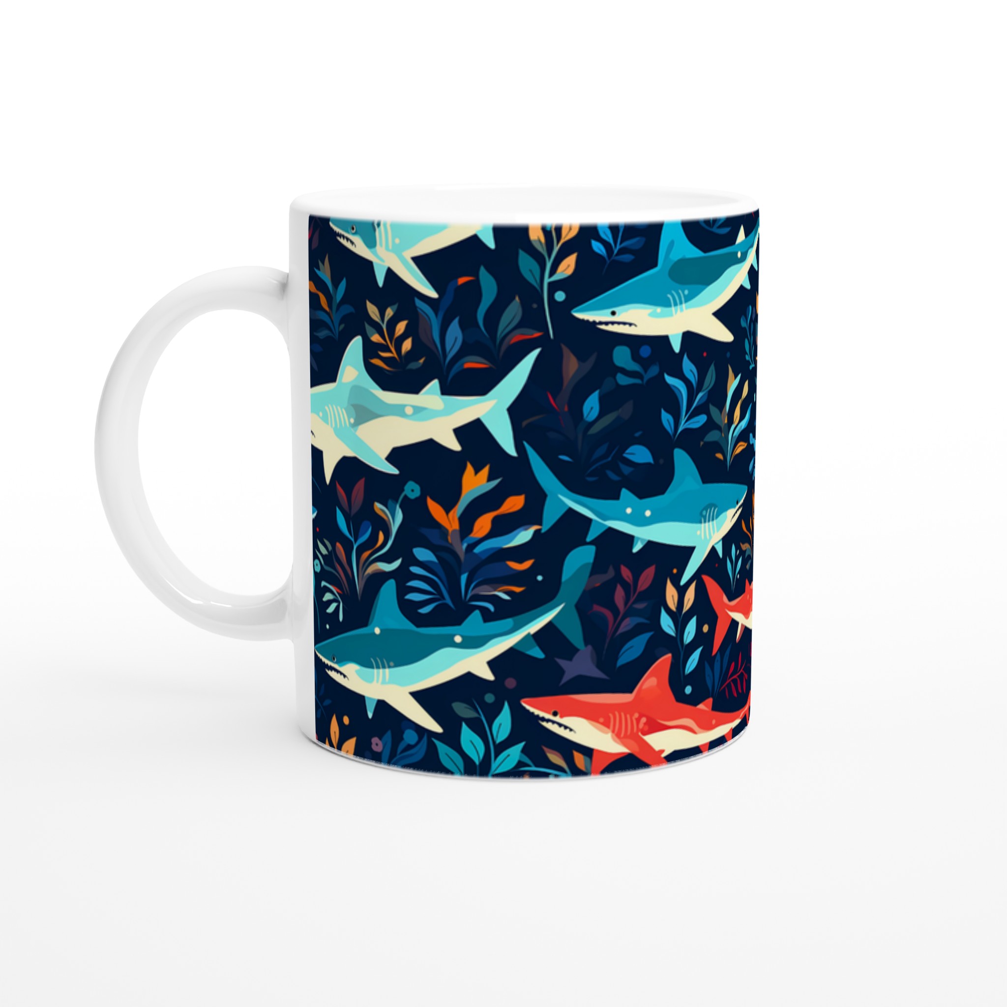 Dyk ner i en värld av färg och fantasi varje gång du tar en klunk! Denna stilrena keramiska mugg, prydd med ett lekfullt mönster av simmande hajar och livfulla sjöväxter mot en mörkblå bakgrund, blir snabbt en favorit. Den är perfekt för morgonkaffet, kvällens varma choklad eller när du bara vill njuta av en kopp te. Den blanka ytan gör att det unika trycket framhävs med klara och levande färger, som håller sig fina även efter många turer i mikron och diskmaskinen.
