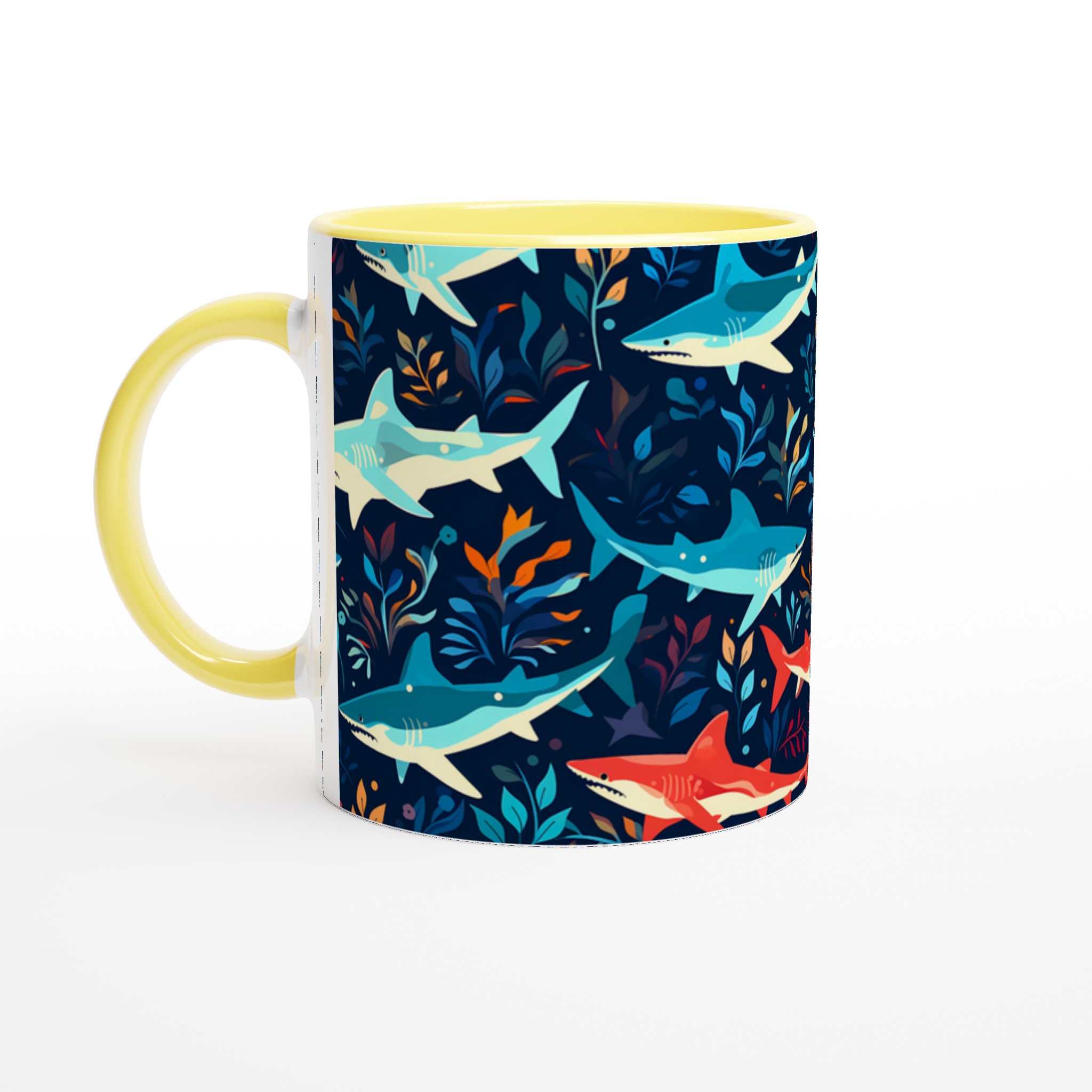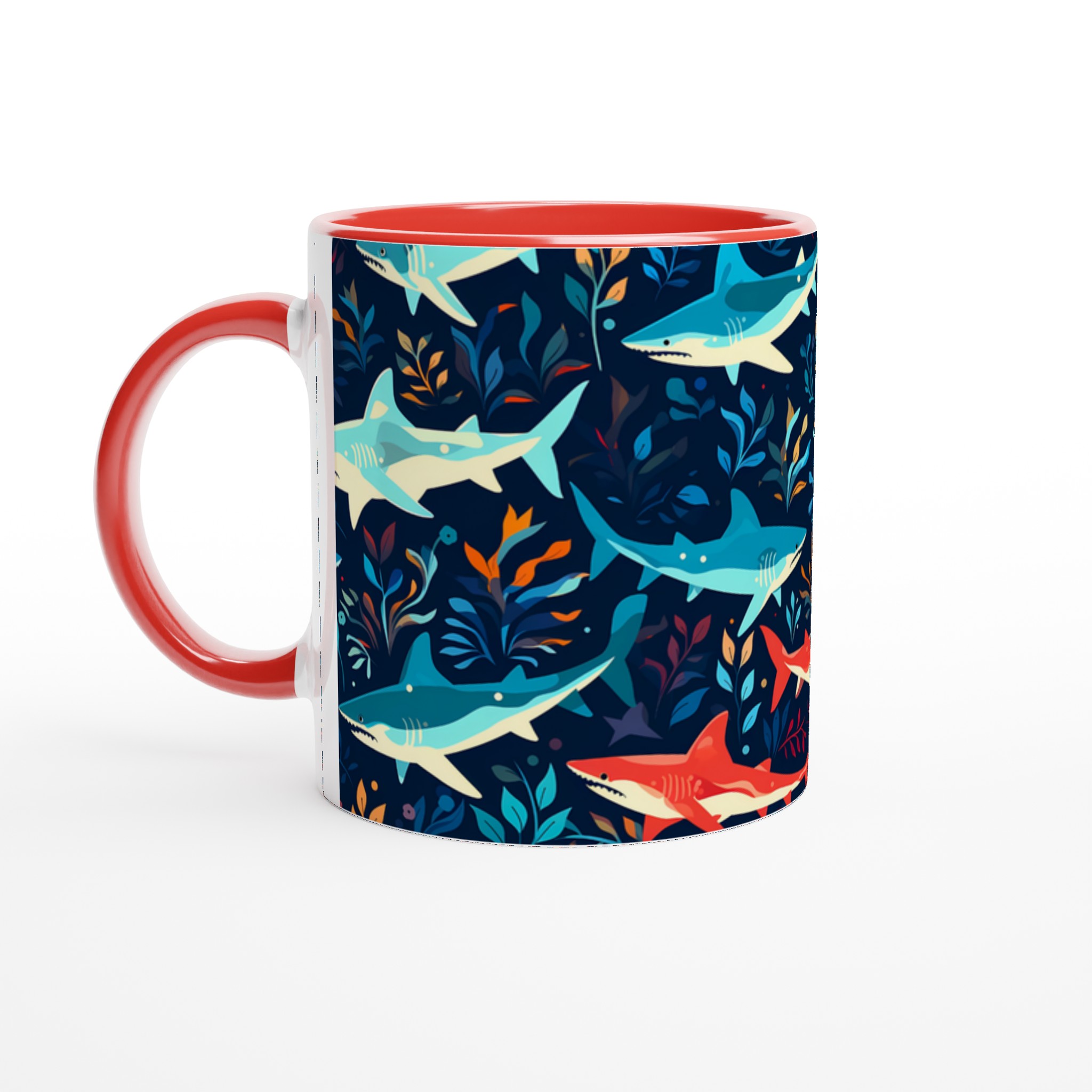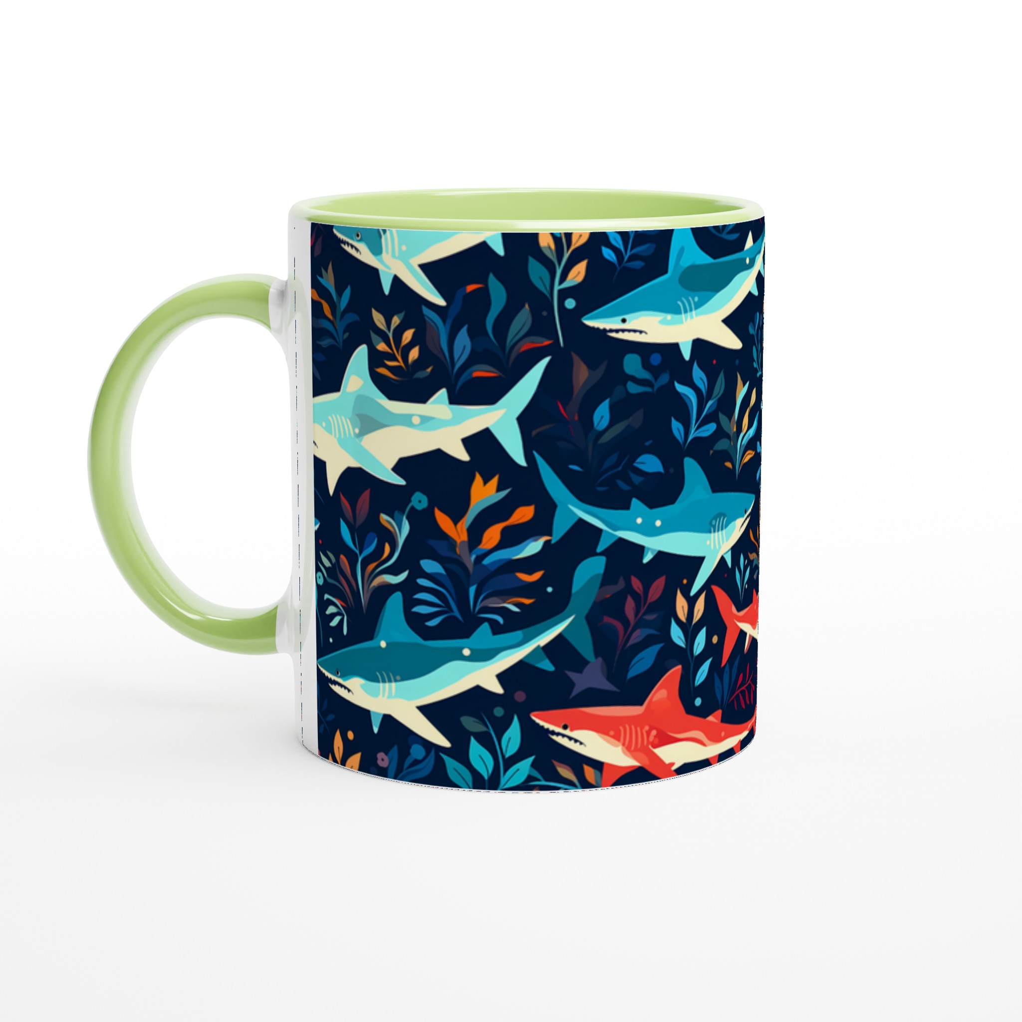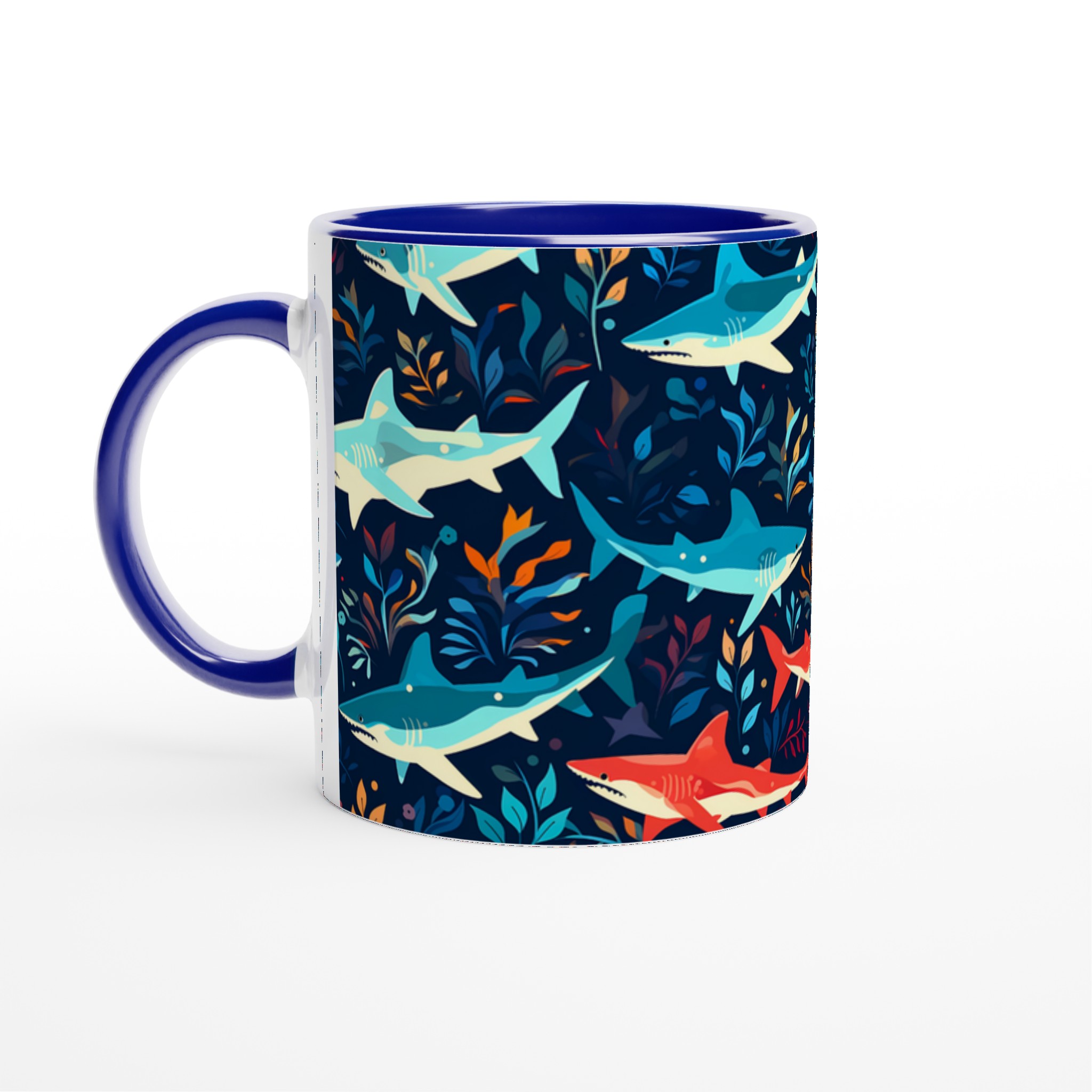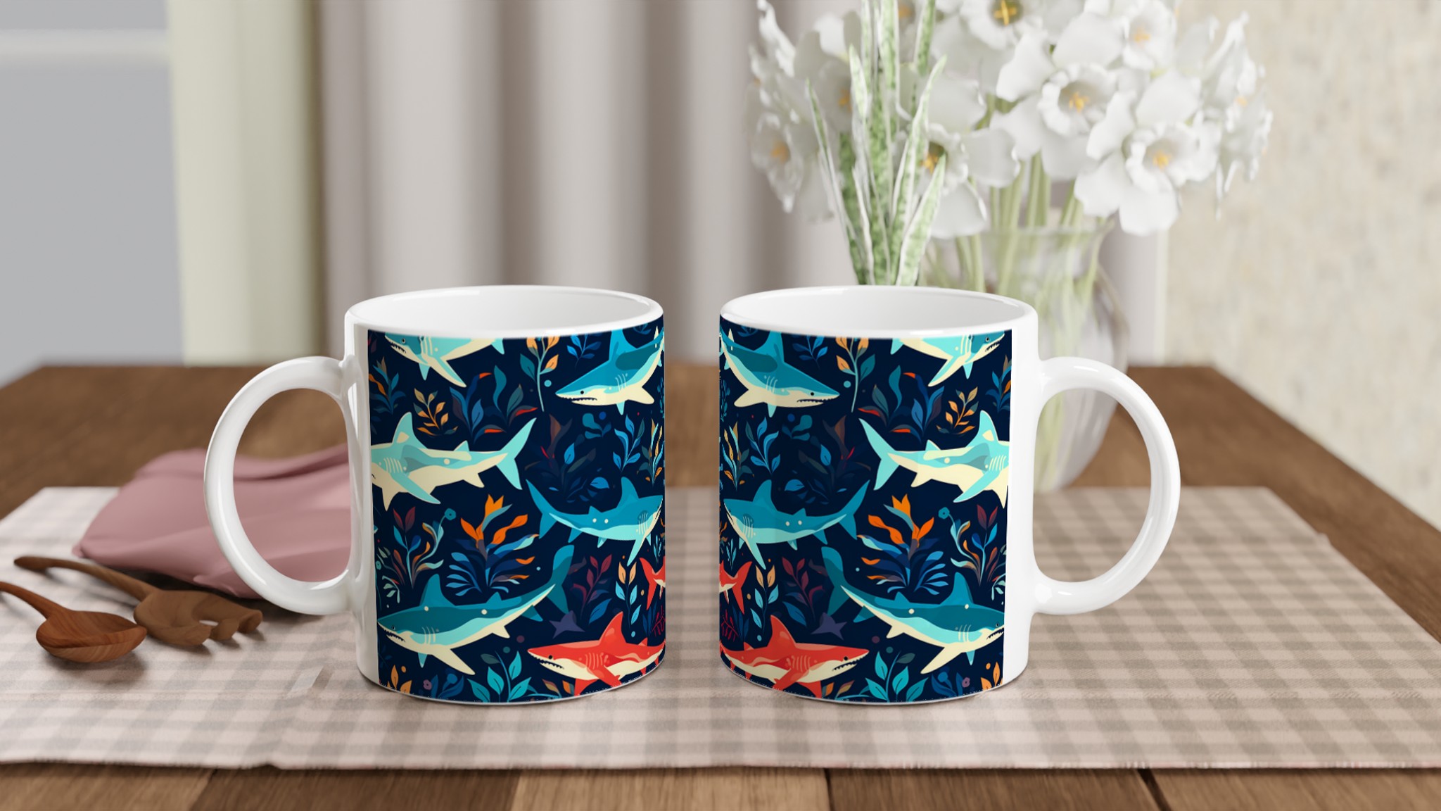 Dyk ner i en värld av färg och fantasi varje gång du tar en klunk! Denna stilrena keramiska mugg, prydd med ett lekfullt mönster av simmande hajar och livfulla sjöväxter mot en mörkblå bakgrund, blir snabbt en favorit. Den är perfekt för morgonkaffet, kvällens varma choklad eller när du bara vill njuta av en kopp te. Den blanka ytan gör att det unika trycket framhävs med klara och levande färger, som håller sig fina även efter många turer i mikron och diskmaskinen.