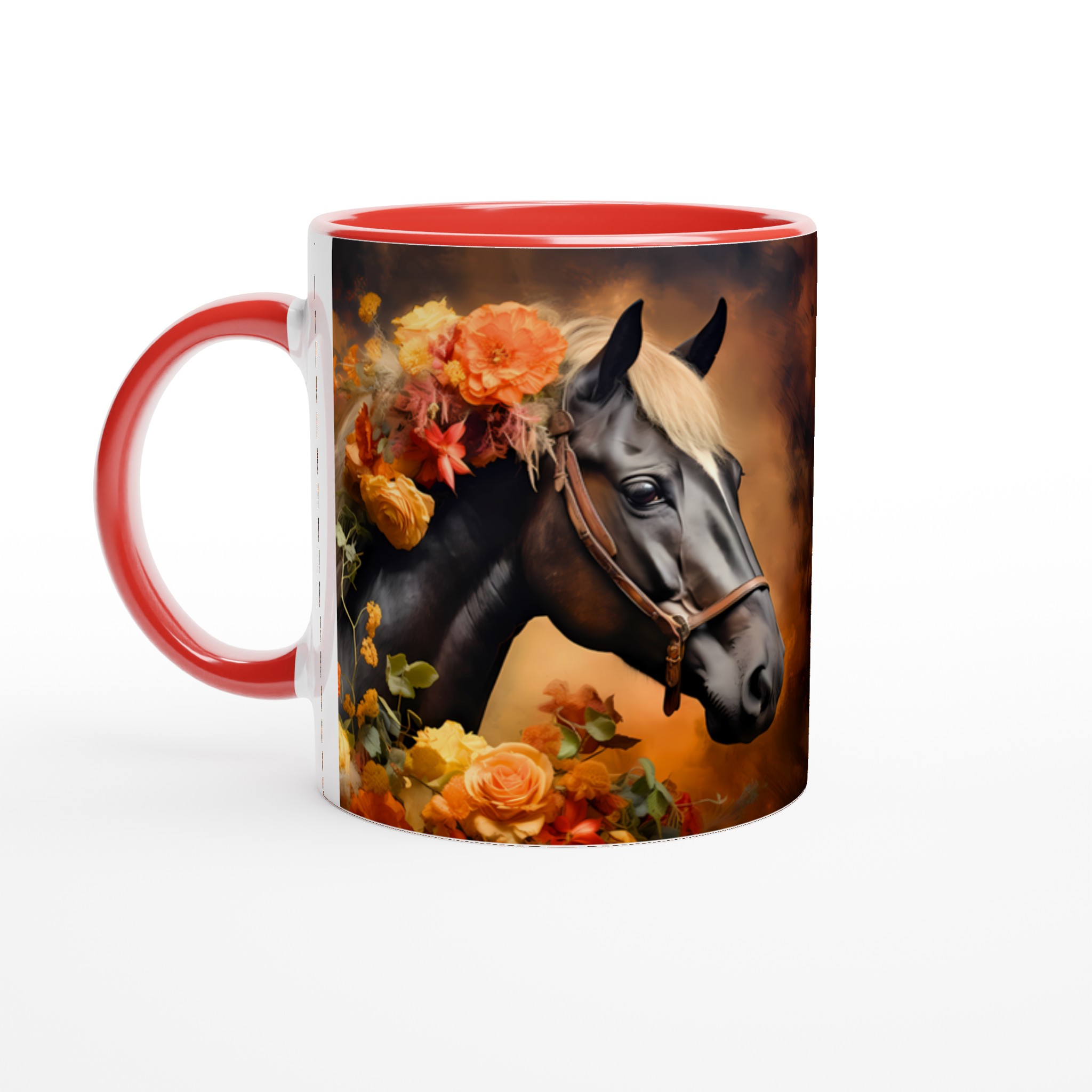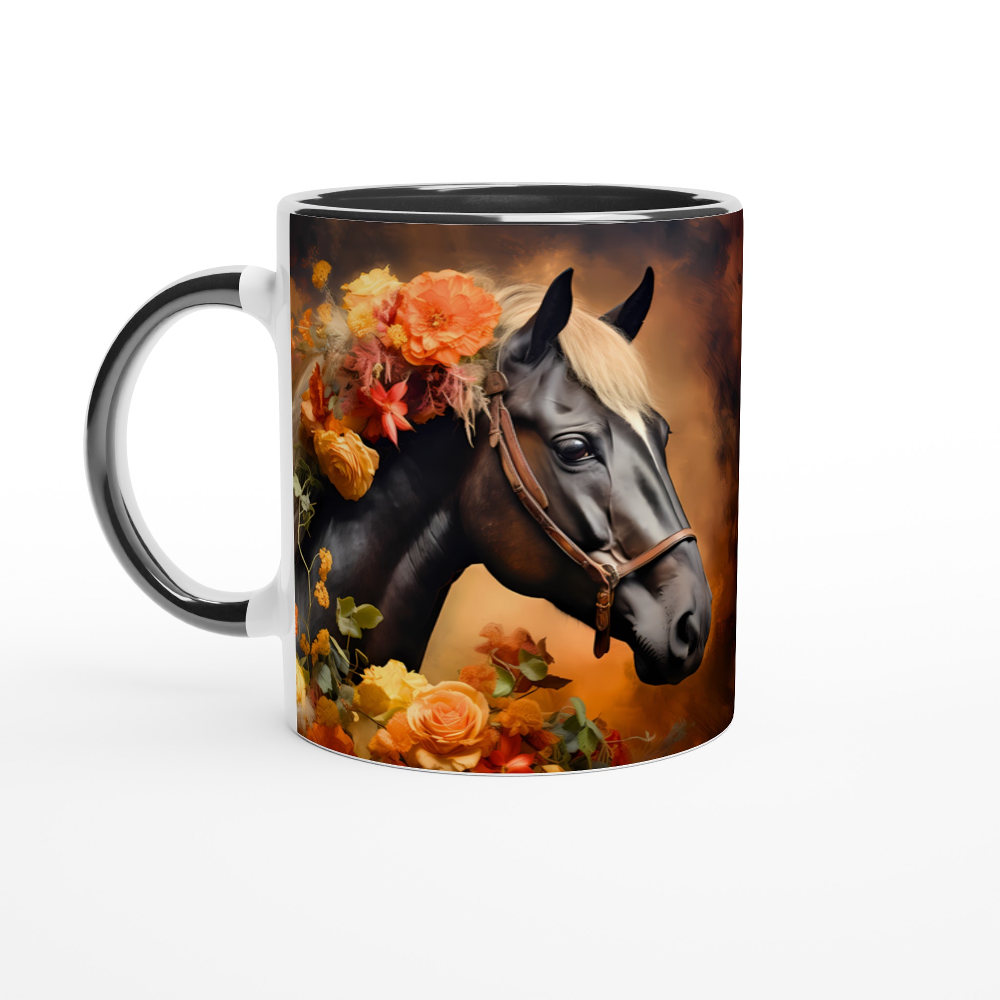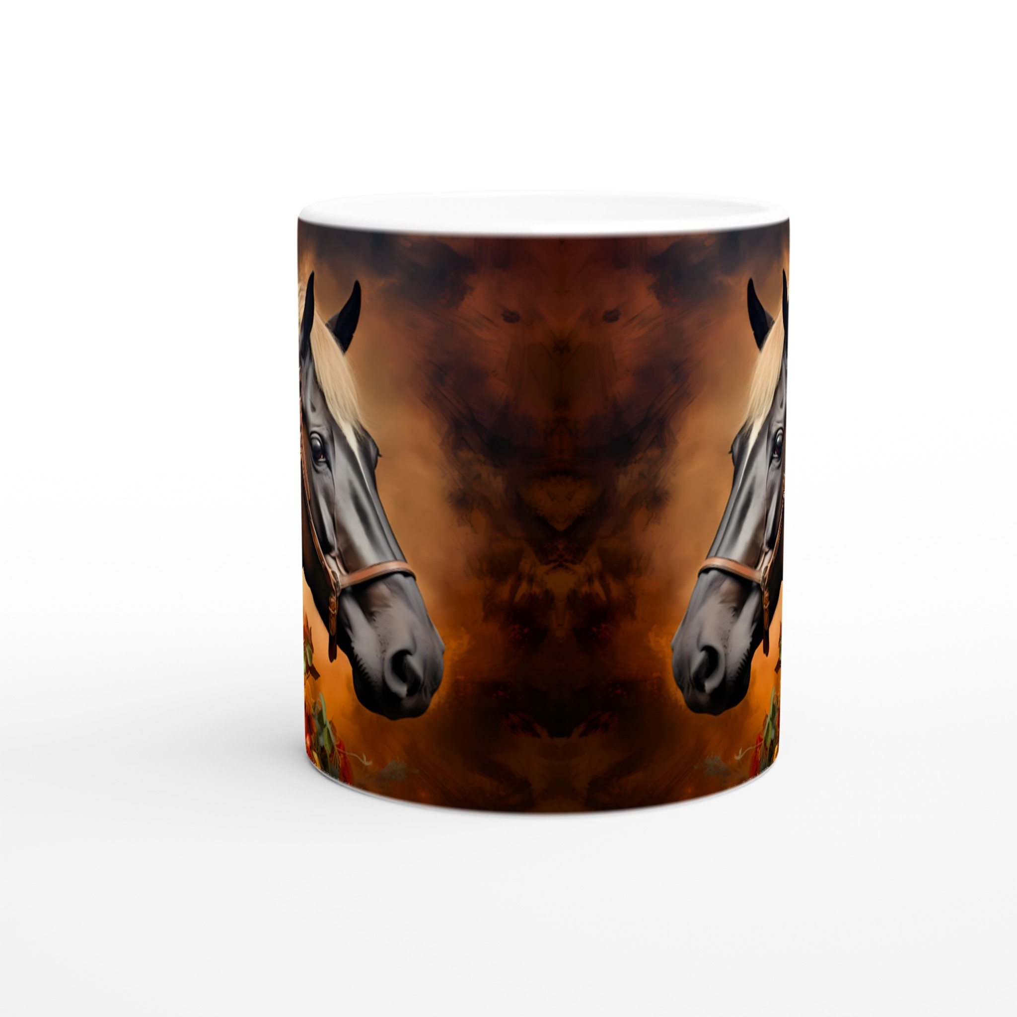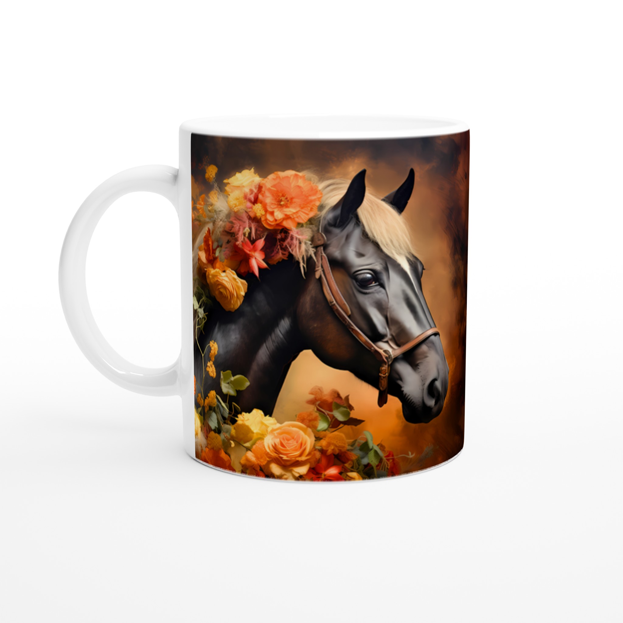 Låt dig förtrollas av denna majestätiska keramikmugg, prydd med en konstnärlig illustration av en häst med en ljuvligt blommande man i varma, jordnära hösttoner. Varje klunk blir en stund av lugn och skönhet, perfekt för morgonkaffet, kvällens varma choklad eller när du bara vill njuta av en kopp te. Den blanka ytan lyfter fram designens klara och levande färger, som förblir lika strålande även efter otaliga turer i mikron och diskmaskinen.