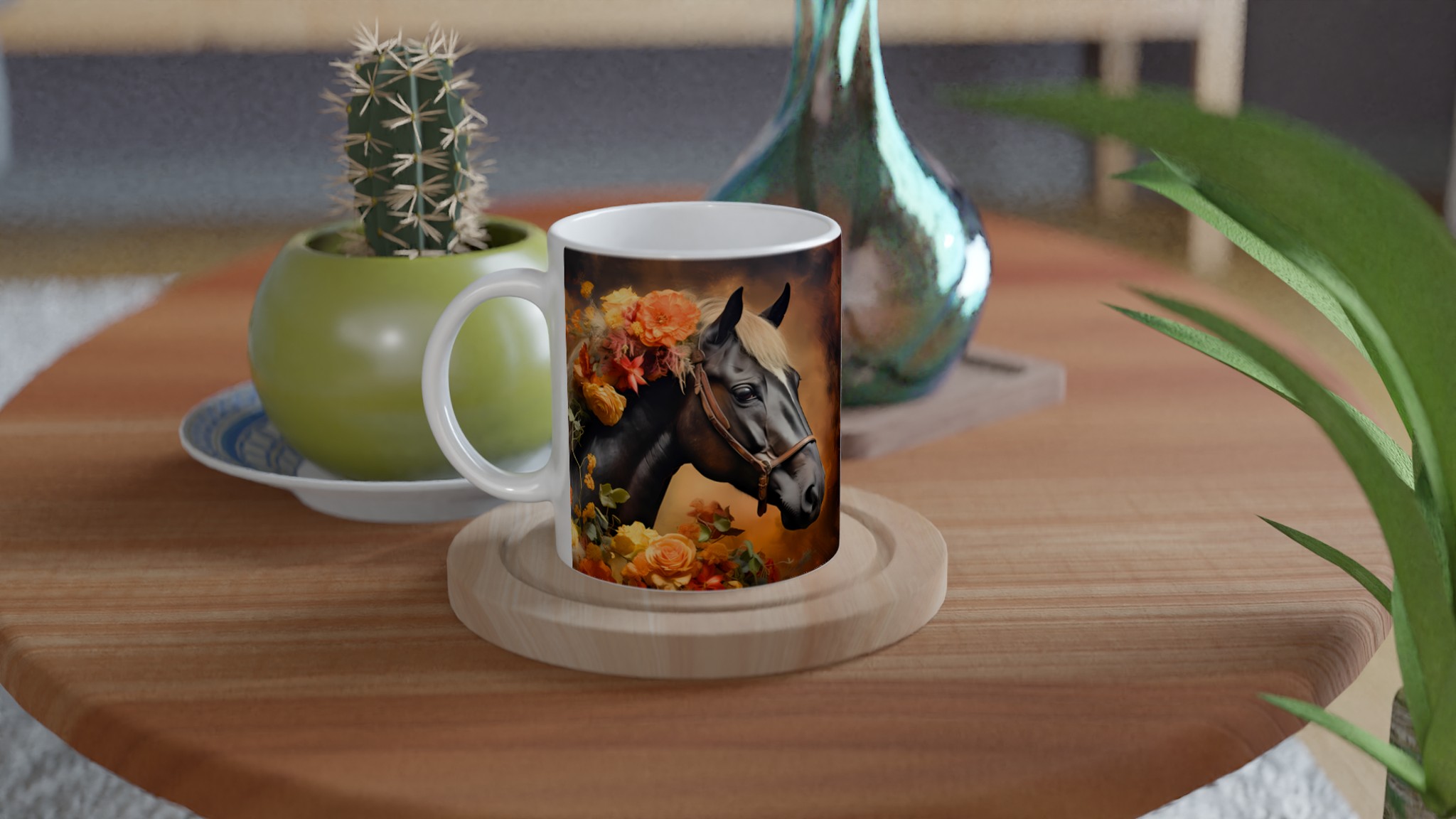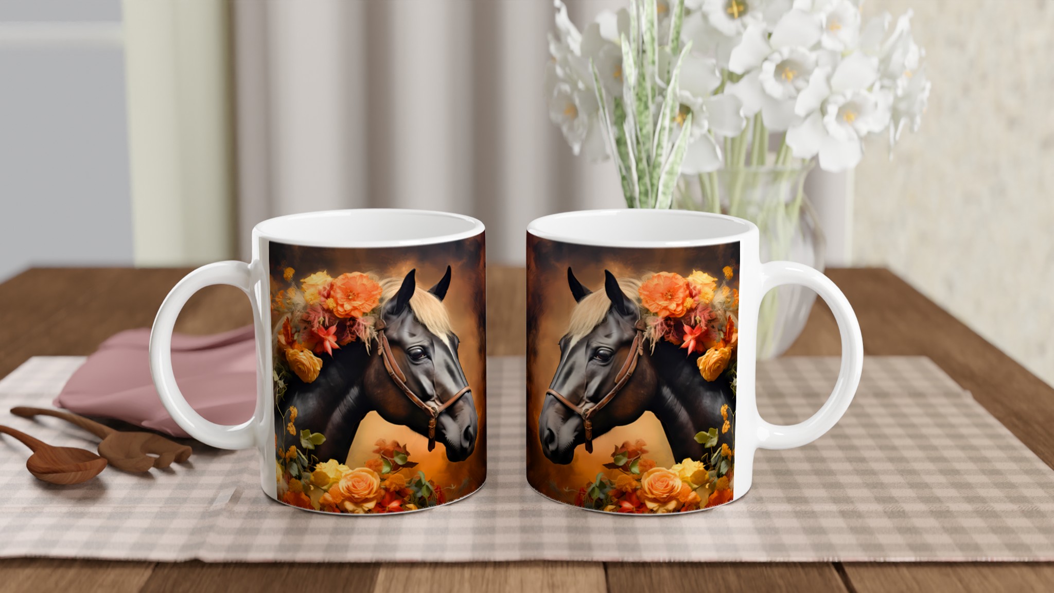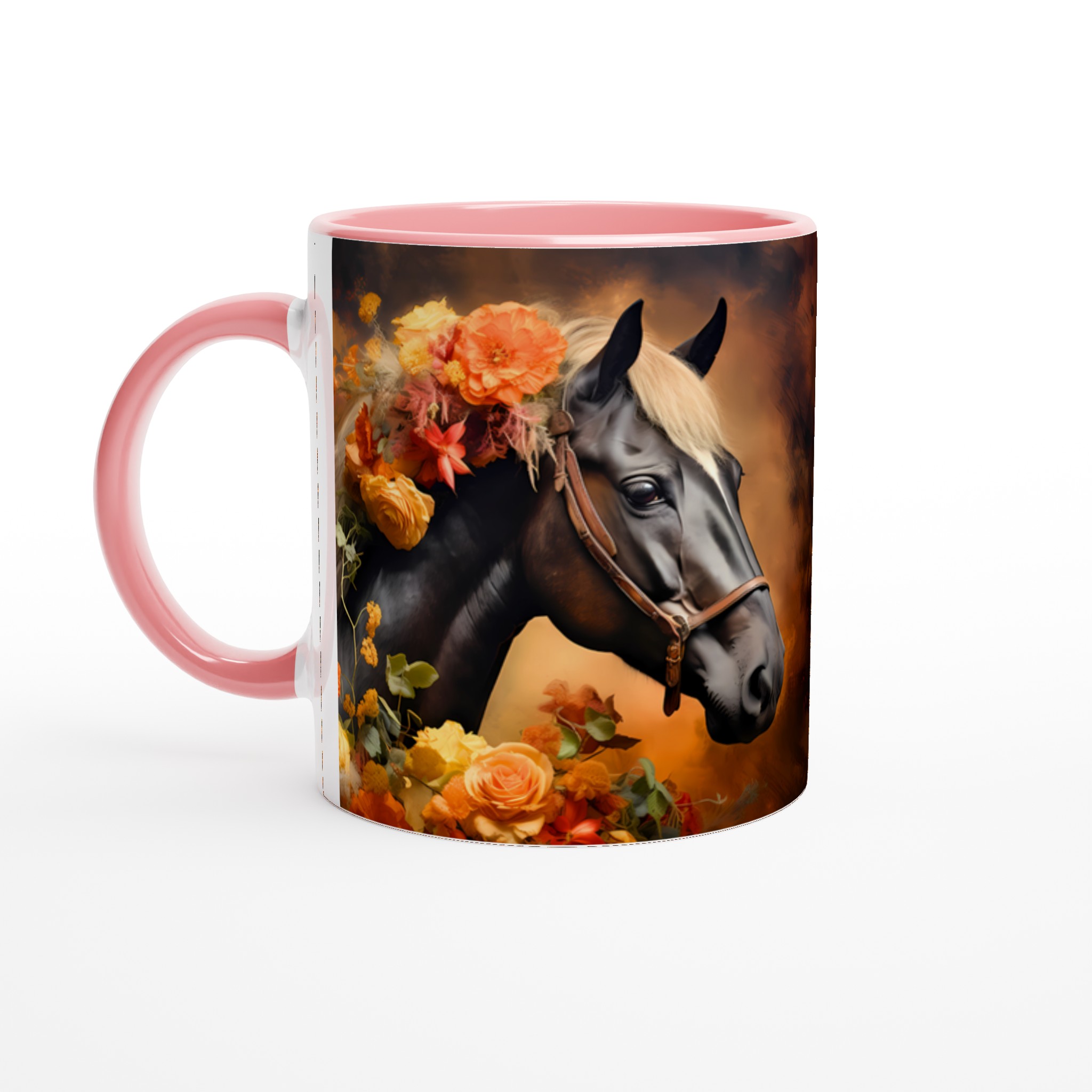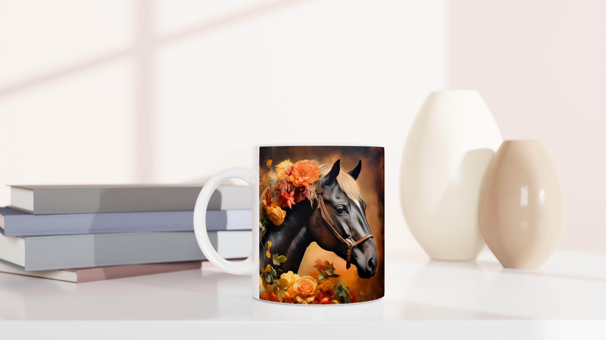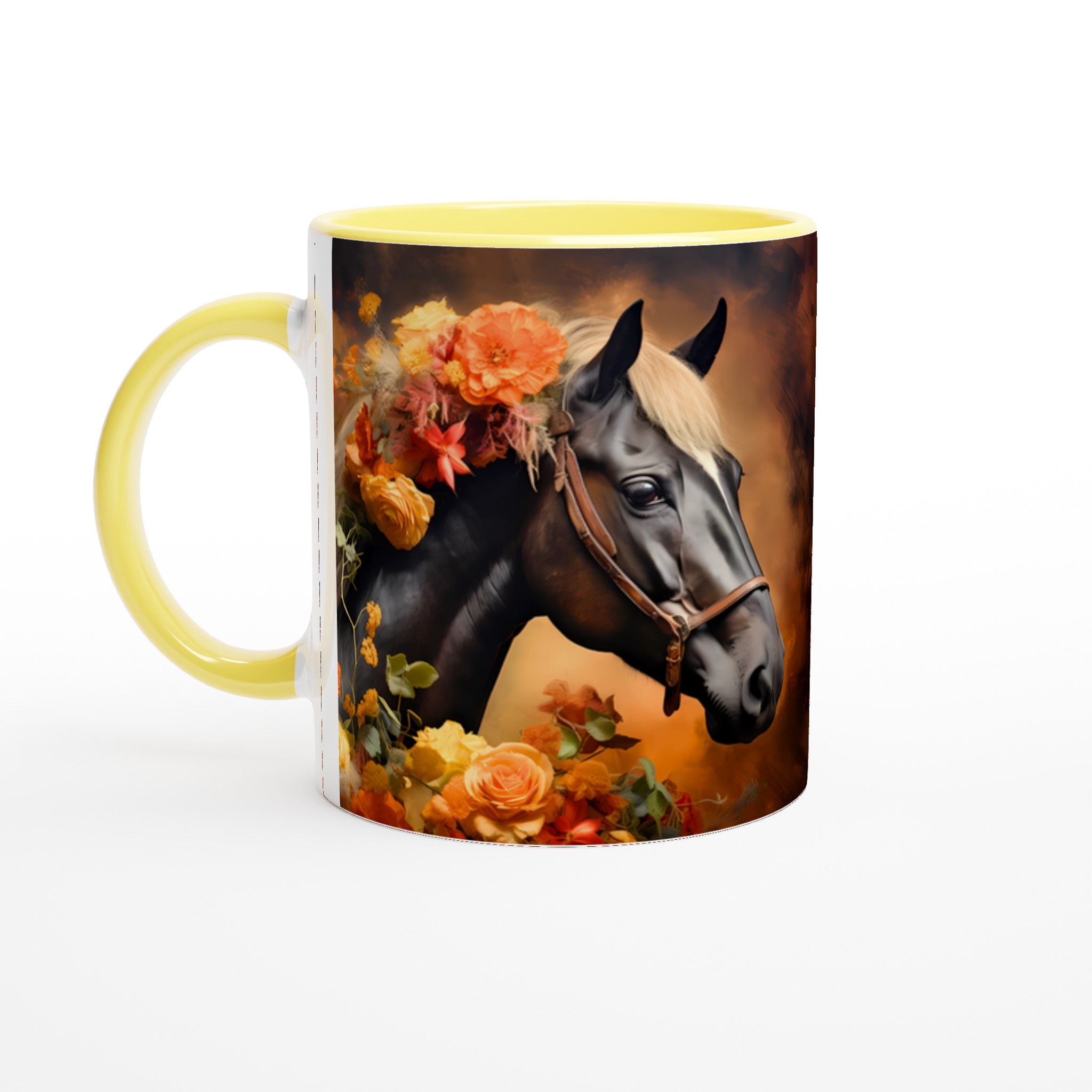 Låt dig förtrollas av denna majestätiska keramikmugg, prydd med en konstnärlig illustration av en häst med en ljuvligt blommande man i varma, jordnära hösttoner. Varje klunk blir en stund av lugn och skönhet, perfekt för morgonkaffet, kvällens varma choklad eller när du bara vill njuta av en kopp te. Den blanka ytan lyfter fram designens klara och levande färger, som förblir lika strålande även efter otaliga turer i mikron och diskmaskinen.