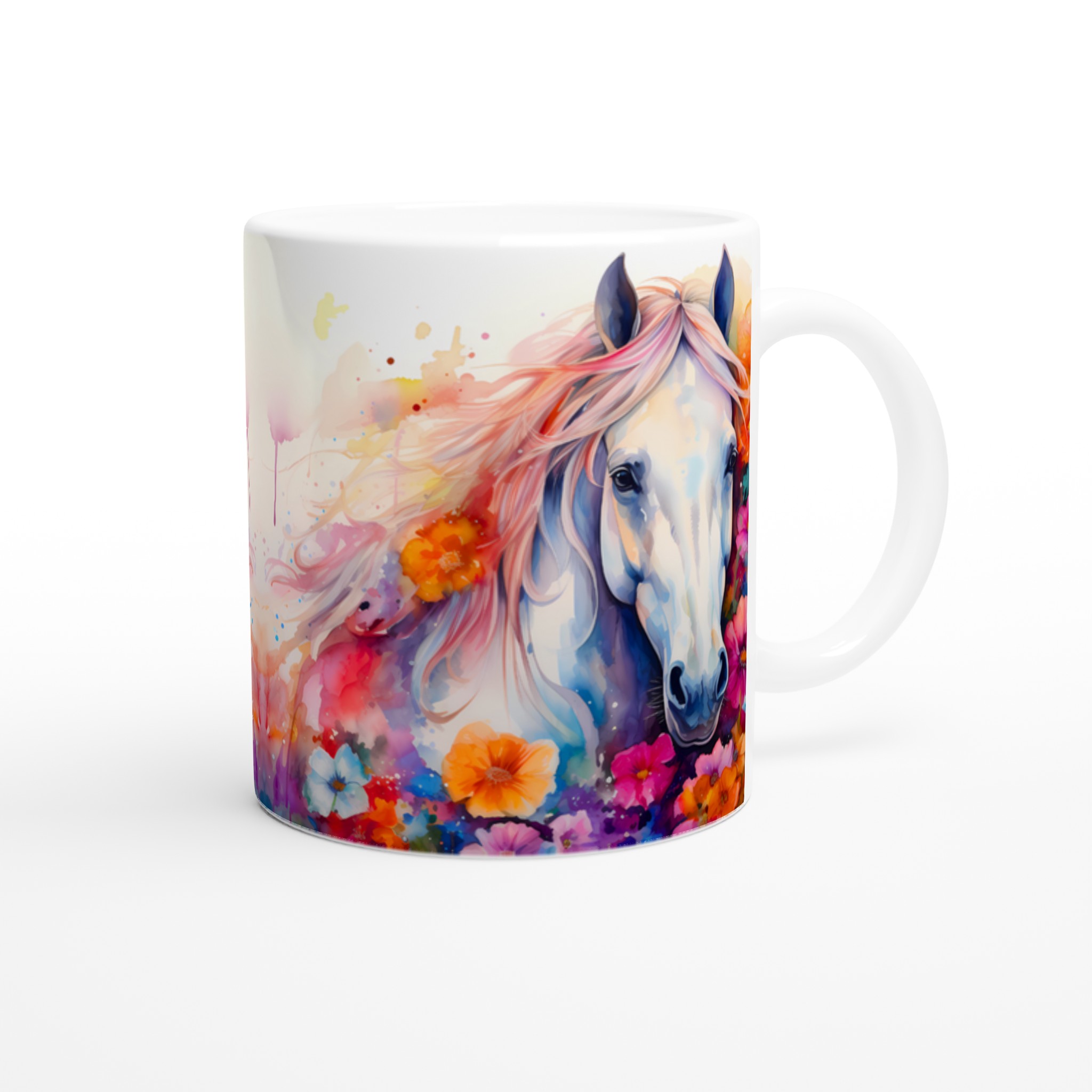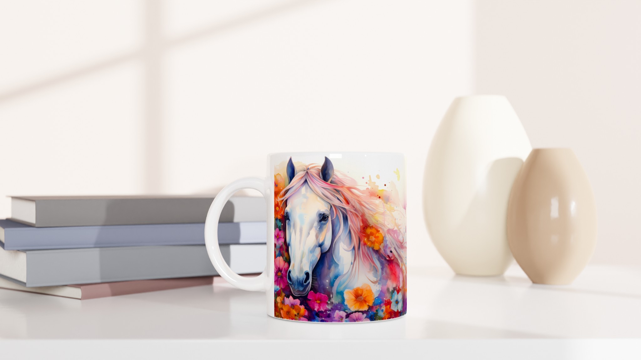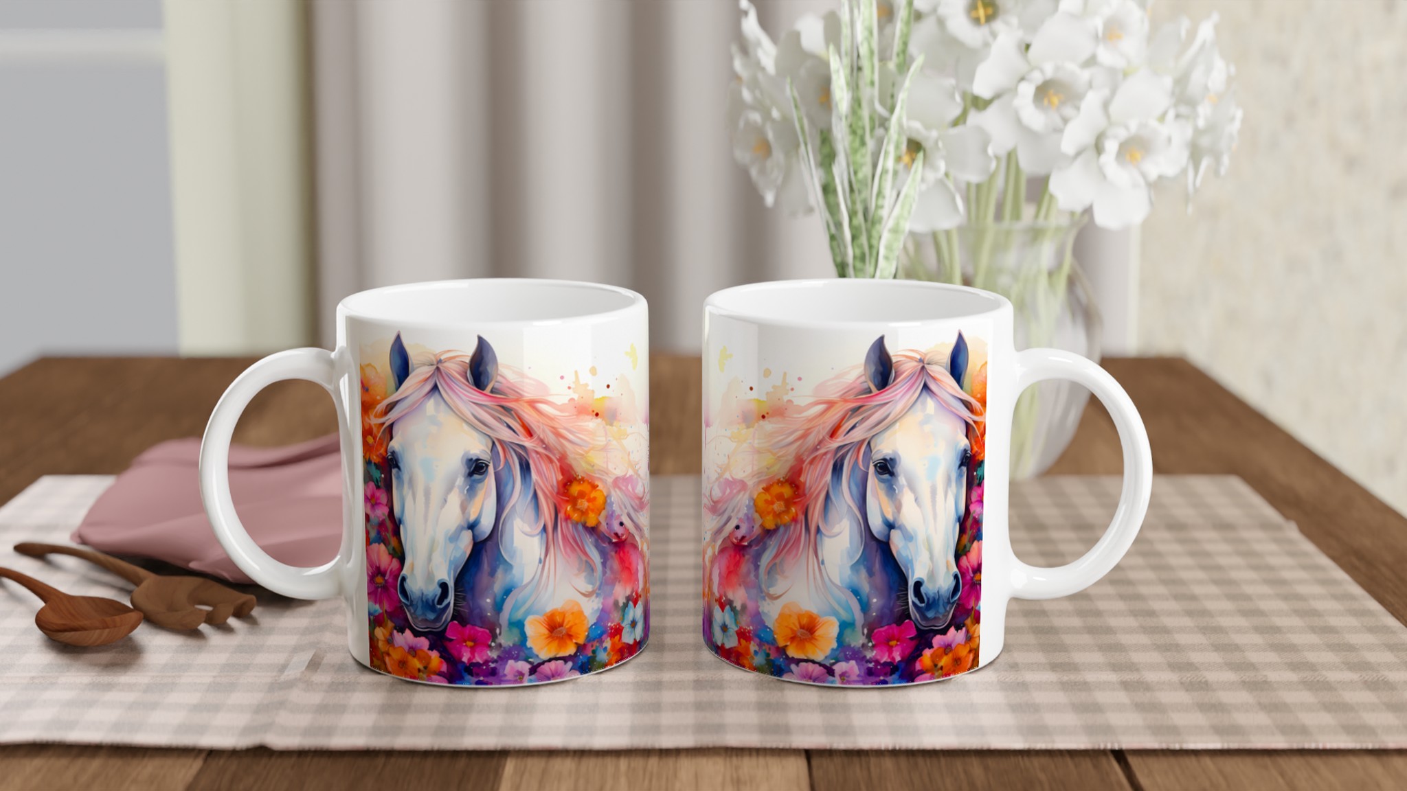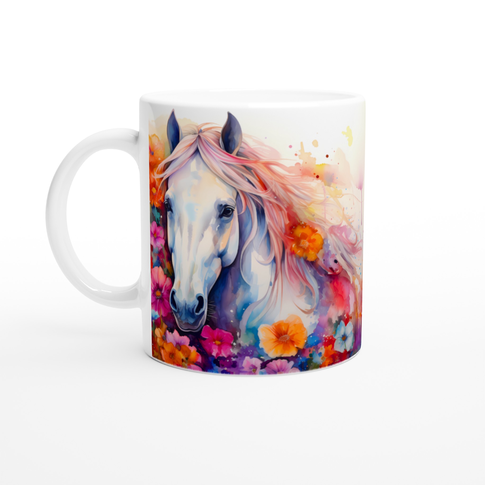 Låt varje klunk bli en konstnärlig upplevelse med denna förtrollande keramiska mugg, prydd med en levande akvarell av en ståtlig häst omgiven av en explosion av färgglada blommor. Denna mugg är inte bara en vardagsfavorit för ditt morgonkaffe, kvällens varma choklad eller när du bara vill njuta av en kopp te; den är en hyllning till skönhet och fantasi. Den blanka vita ytan framhäver tryckets klara och levande färger, som behåller sin lyster även efter otaliga turer i mikron och diskmaskinen.