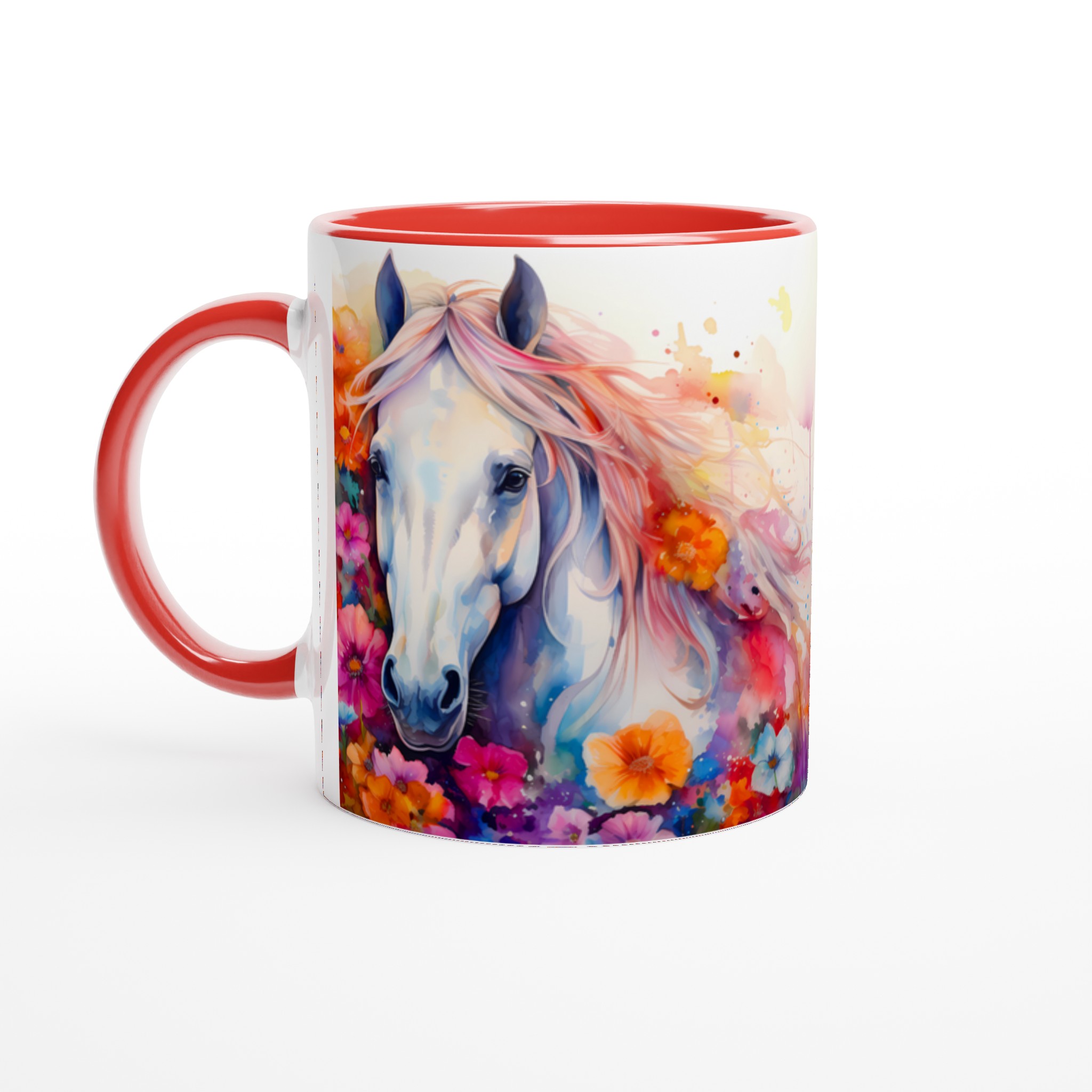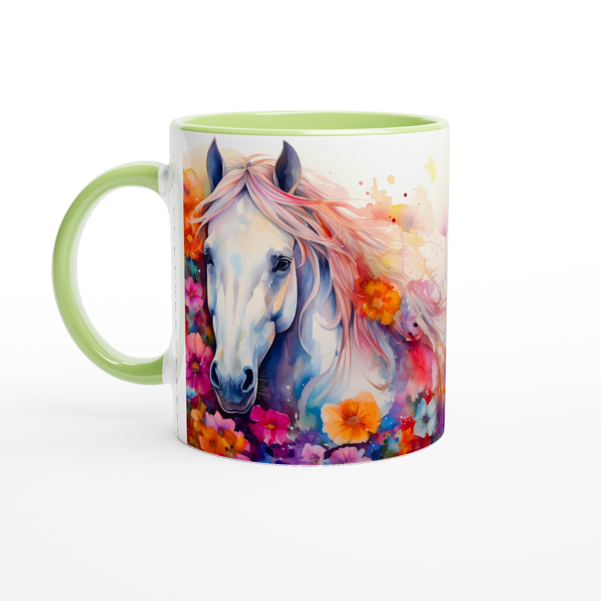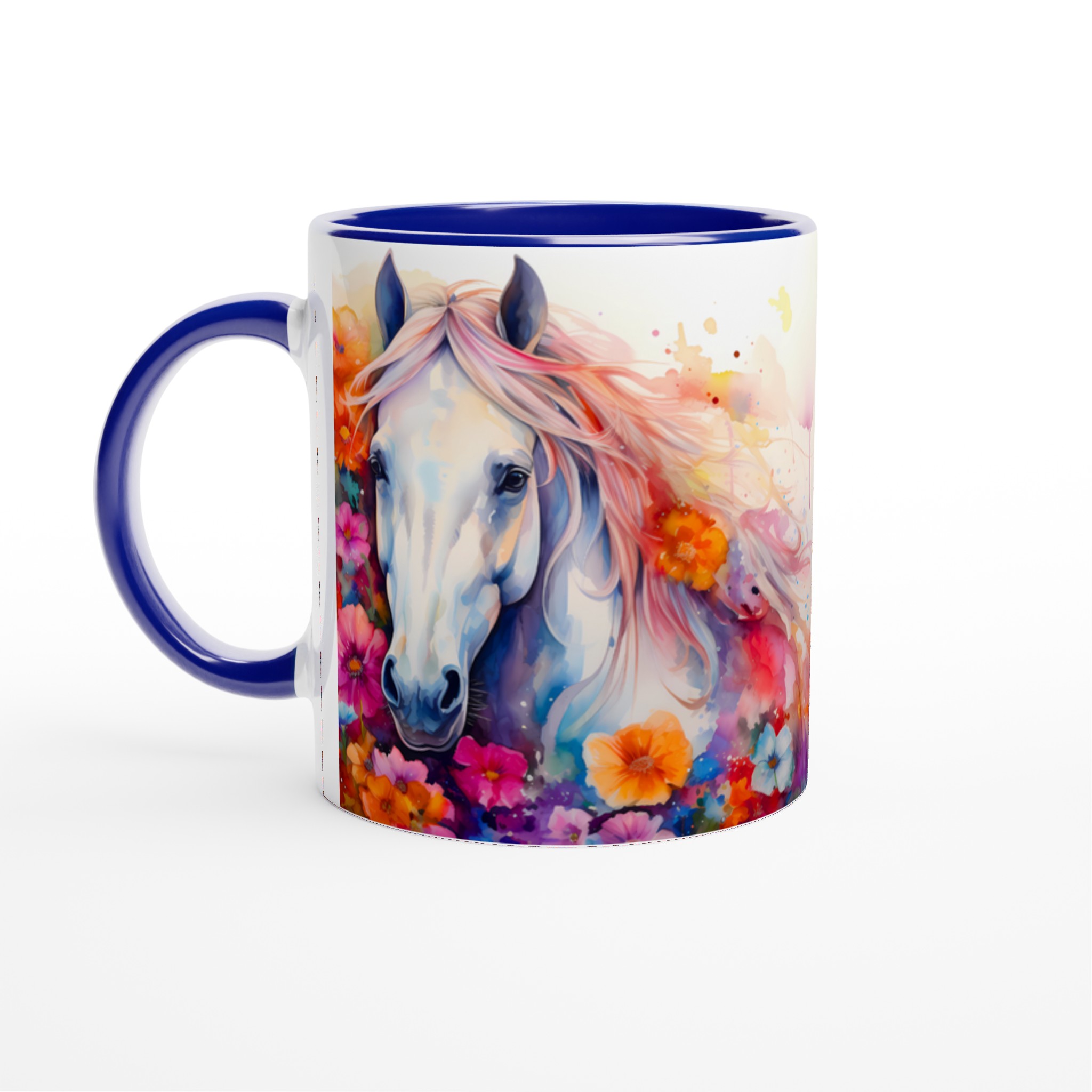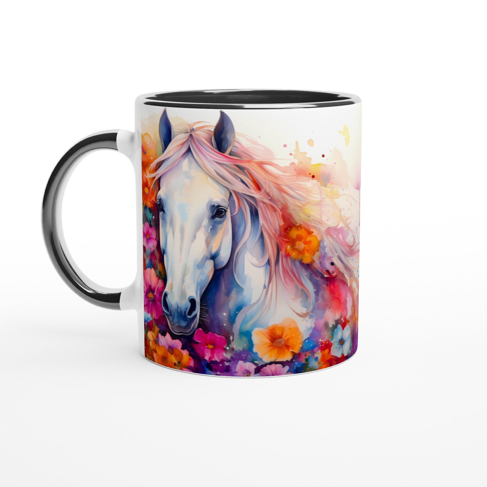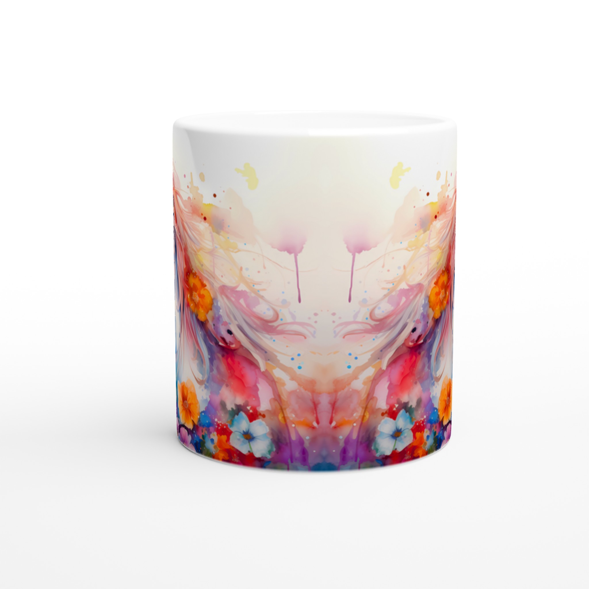 Låt varje klunk bli en konstnärlig upplevelse med denna förtrollande keramiska mugg, prydd med en levande akvarell av en ståtlig häst omgiven av en explosion av färgglada blommor. Denna mugg är inte bara en vardagsfavorit för ditt morgonkaffe, kvällens varma choklad eller när du bara vill njuta av en kopp te; den är en hyllning till skönhet och fantasi. Den blanka vita ytan framhäver tryckets klara och levande färger, som behåller sin lyster även efter otaliga turer i mikron och diskmaskinen.