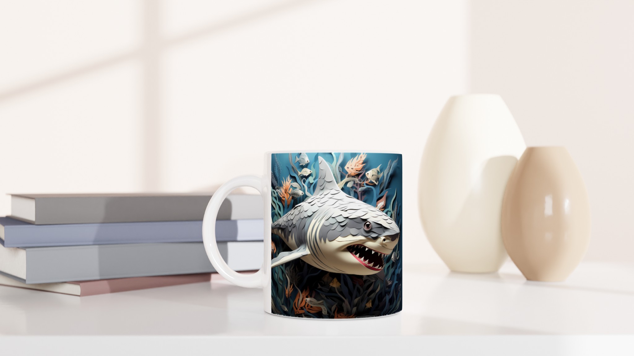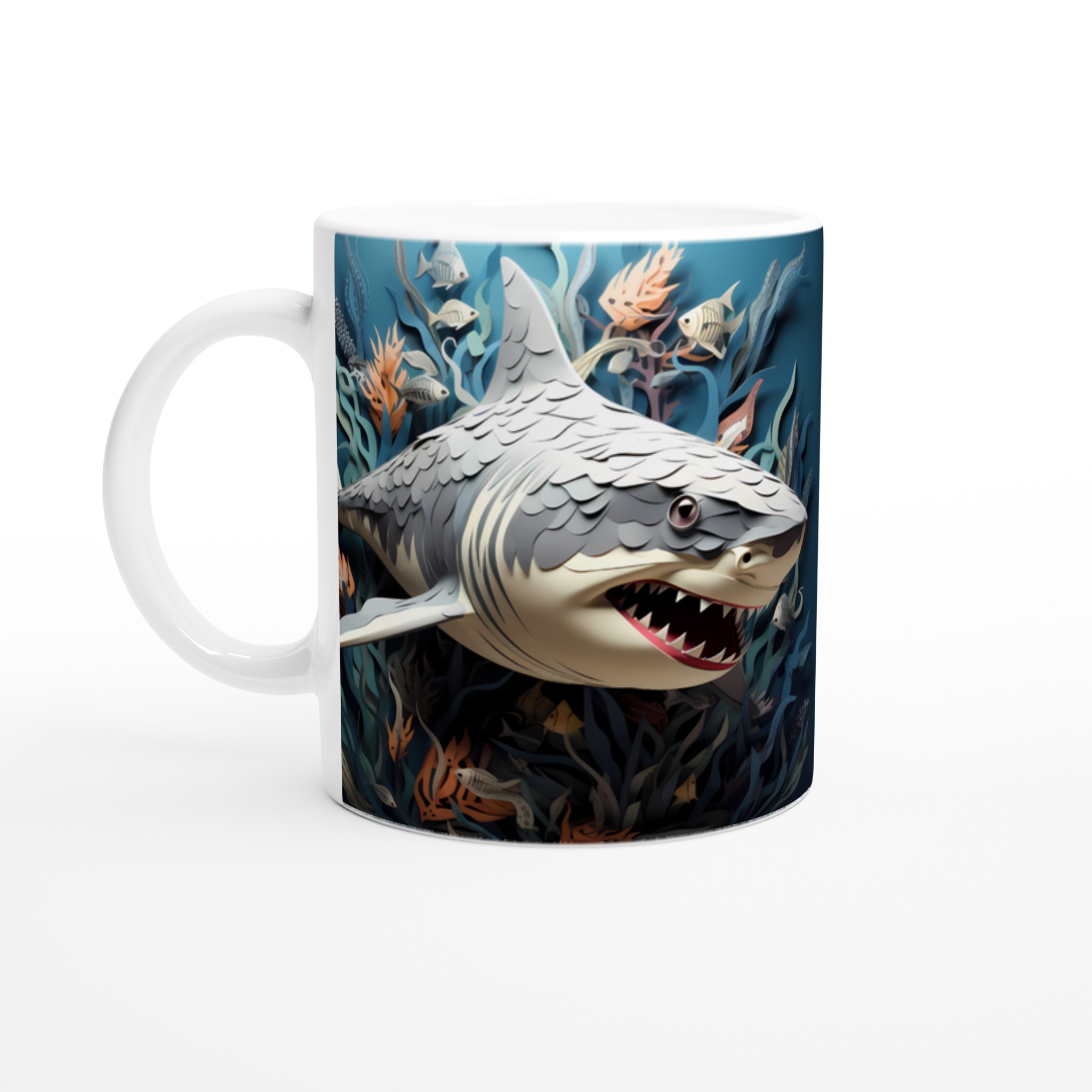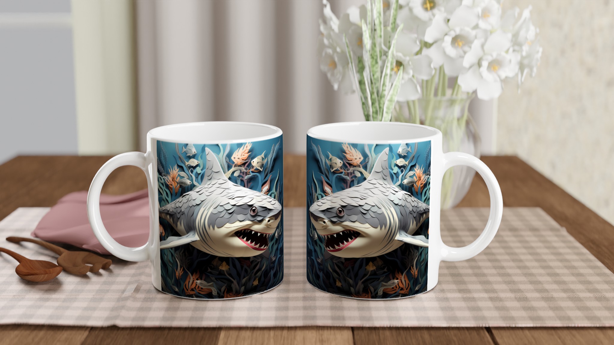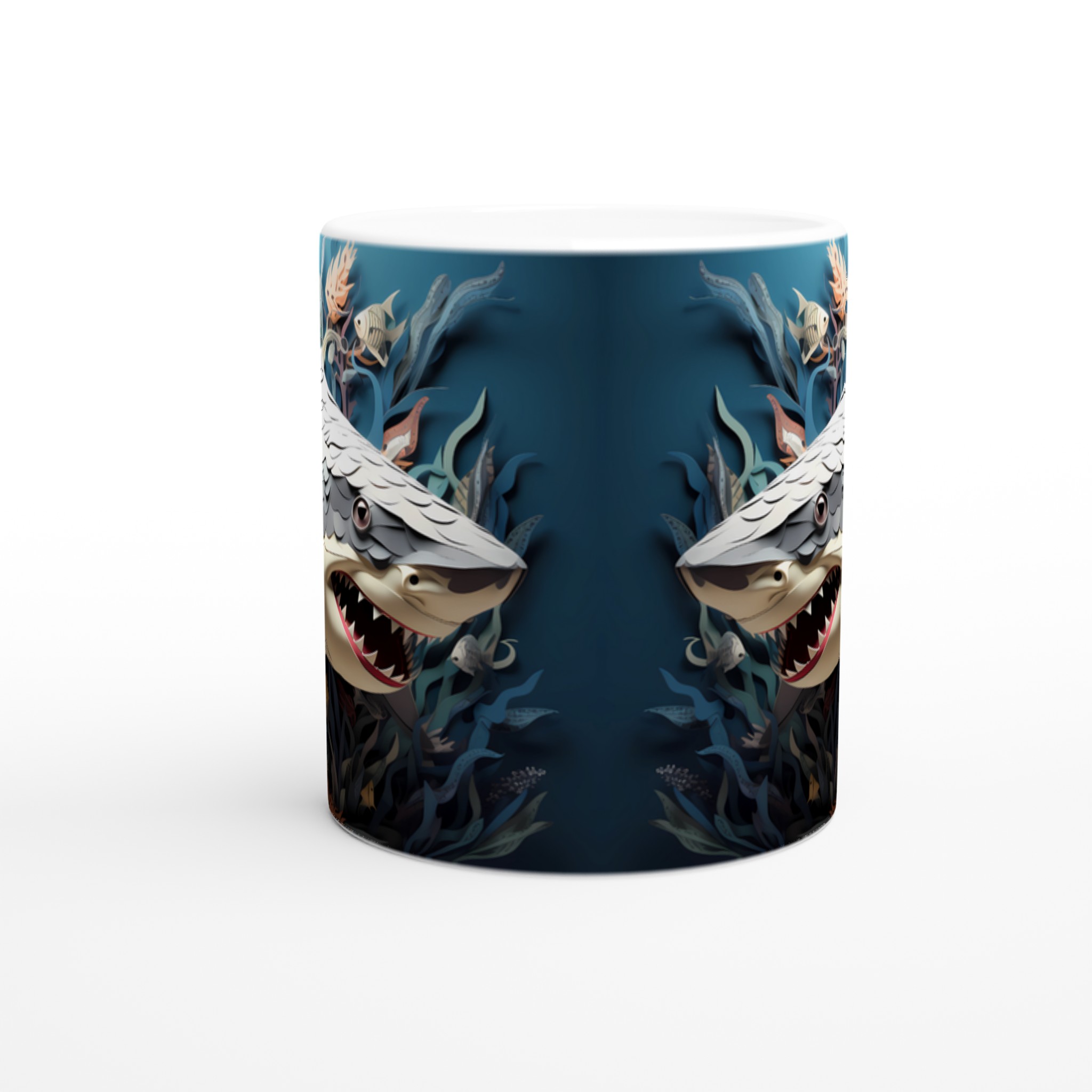 Dyk ner i havets djup med vår unika keramiska mugg, prydd med ett majestätiskt hajmönster i detaljerad papperskonst-stil. De mjuka grå- och krämfärgade tonerna på hajarna, mot en lugnande blå bakgrund med skira sjögräsdetaljer, skapar en konstnärlig och fängslande design. Den här stilrena keramiska muggen blir snabbt en vardagsfavorit. Perfekt för morgonkaffet, kvällens varma choklad eller när du bara vill njuta av en kopp te.