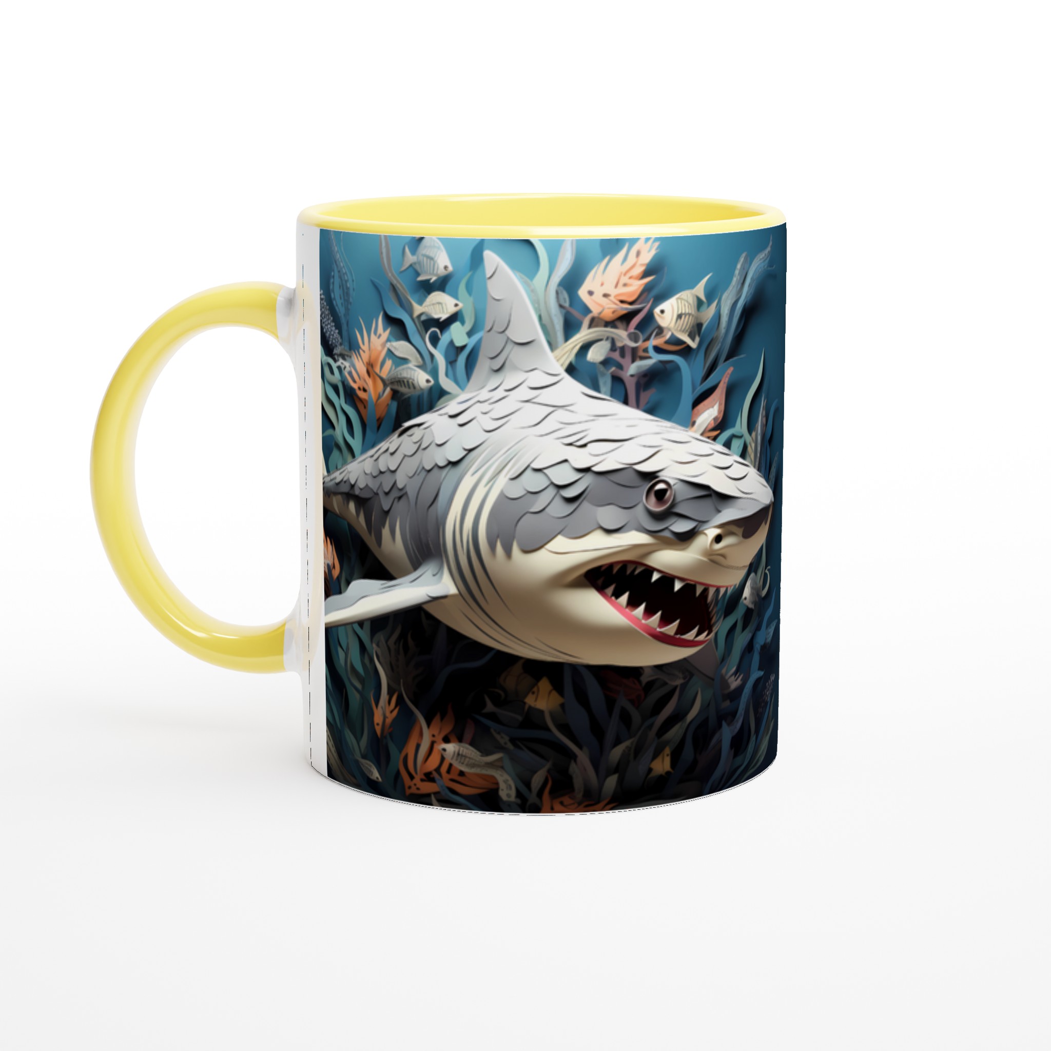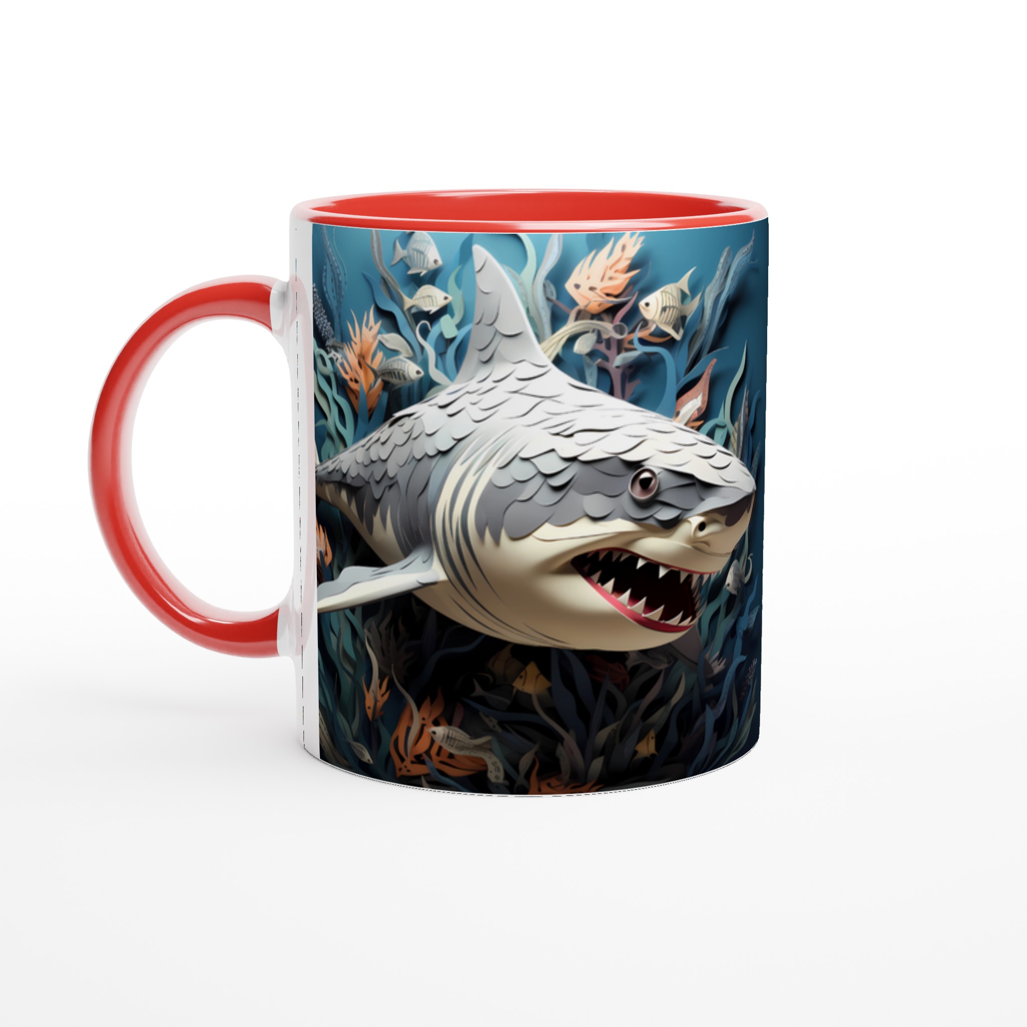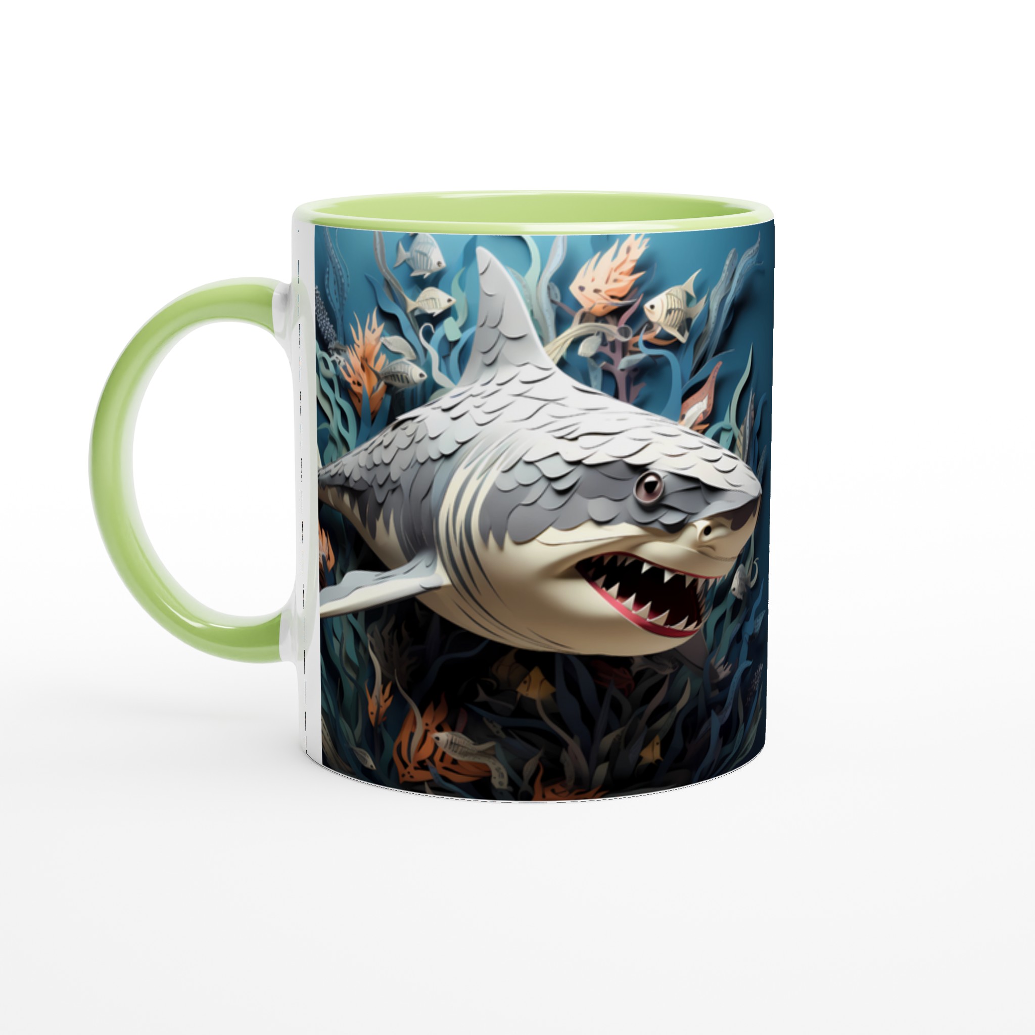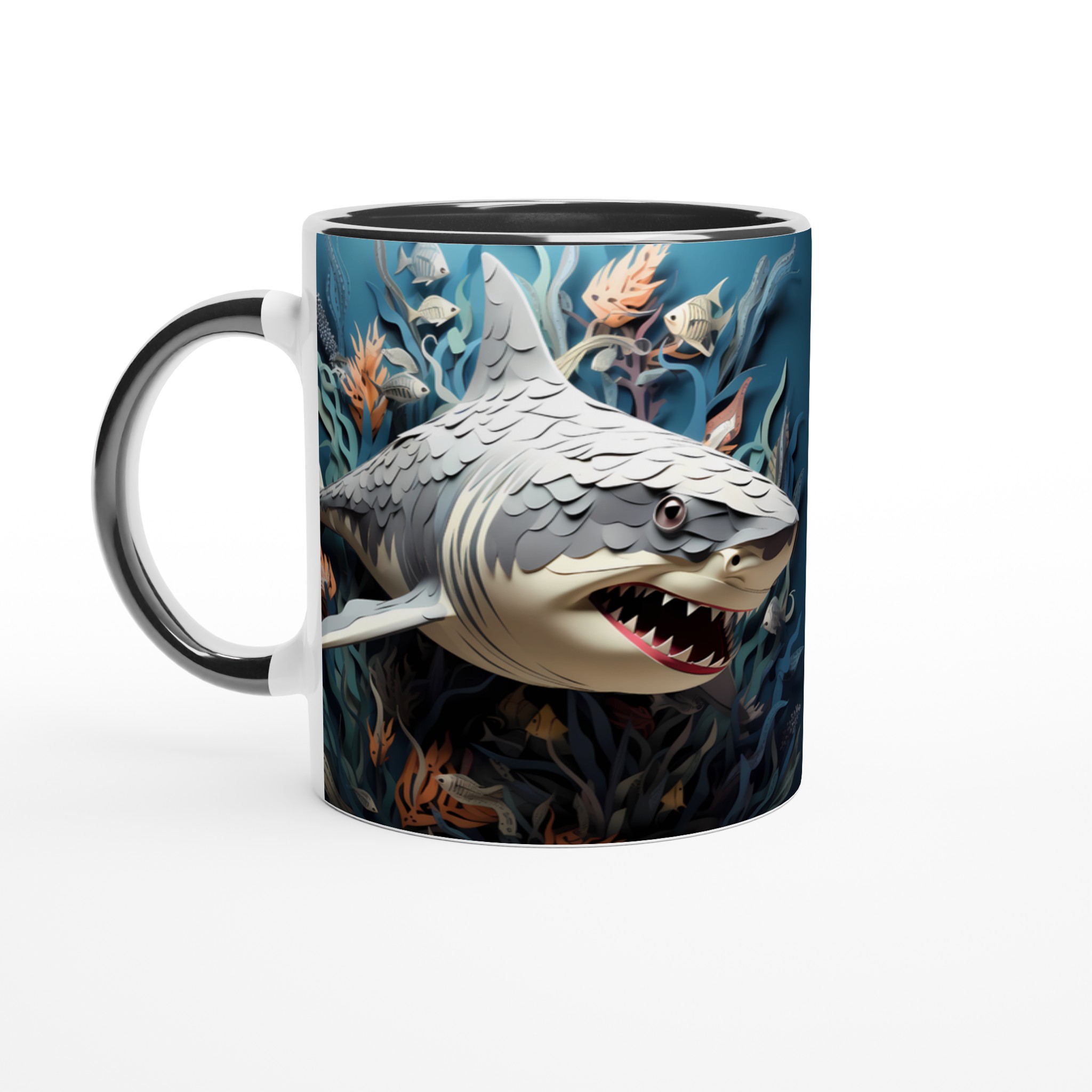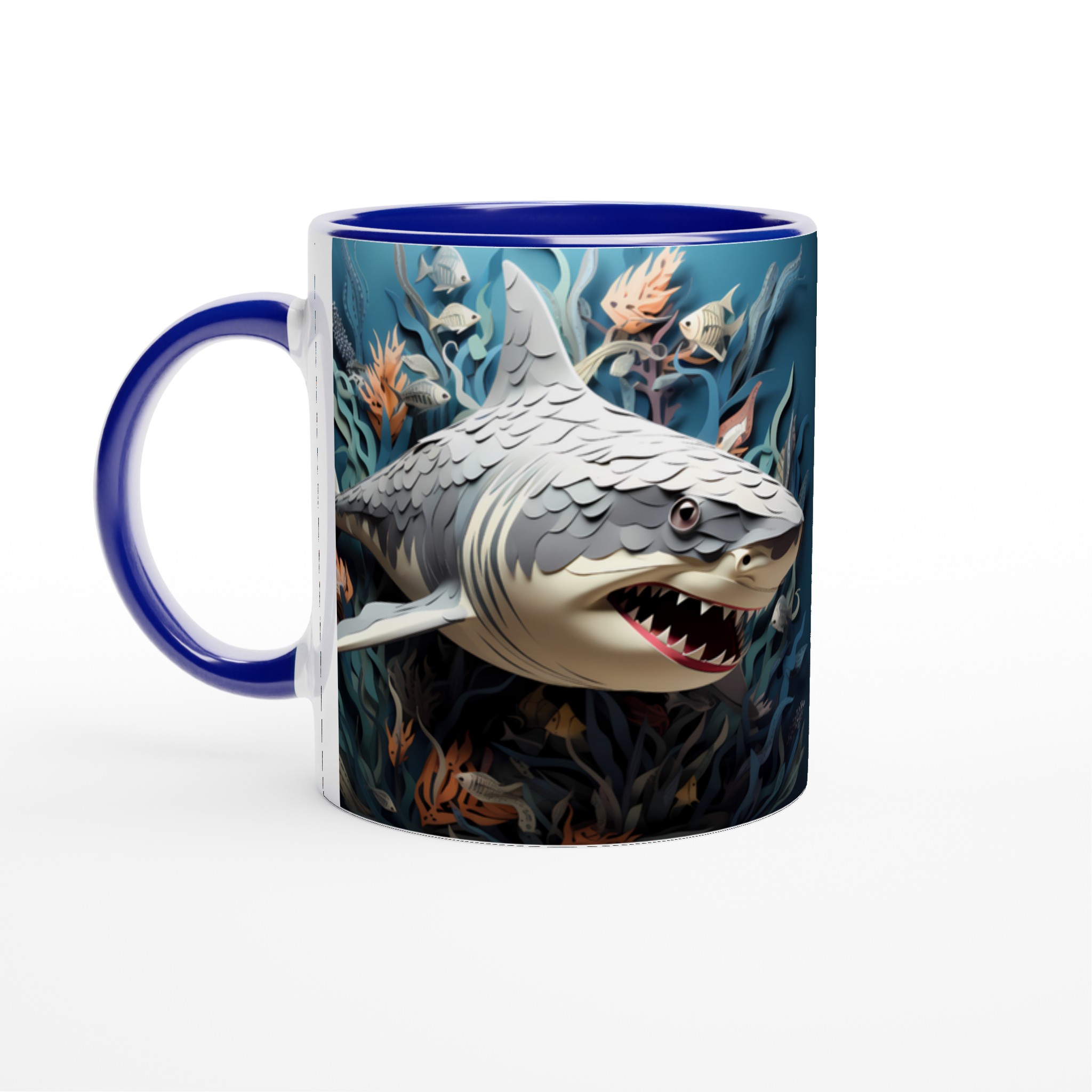 Dyk ner i havets djup med vår unika keramiska mugg, prydd med ett majestätiskt hajmönster i detaljerad papperskonst-stil. De mjuka grå- och krämfärgade tonerna på hajarna, mot en lugnande blå bakgrund med skira sjögräsdetaljer, skapar en konstnärlig och fängslande design. Den här stilrena keramiska muggen blir snabbt en vardagsfavorit. Perfekt för morgonkaffet, kvällens varma choklad eller när du bara vill njuta av en kopp te.