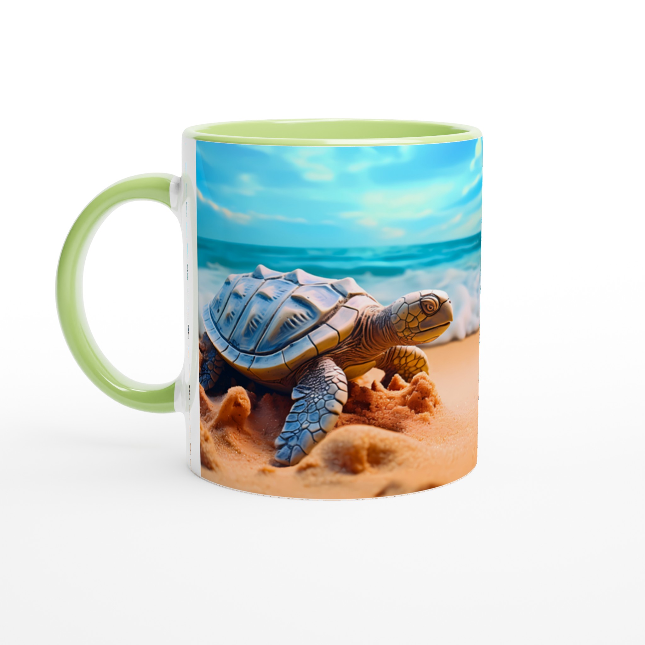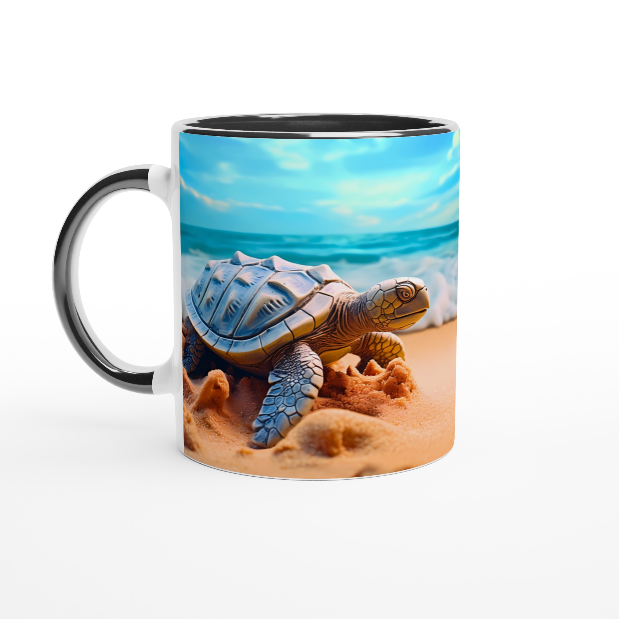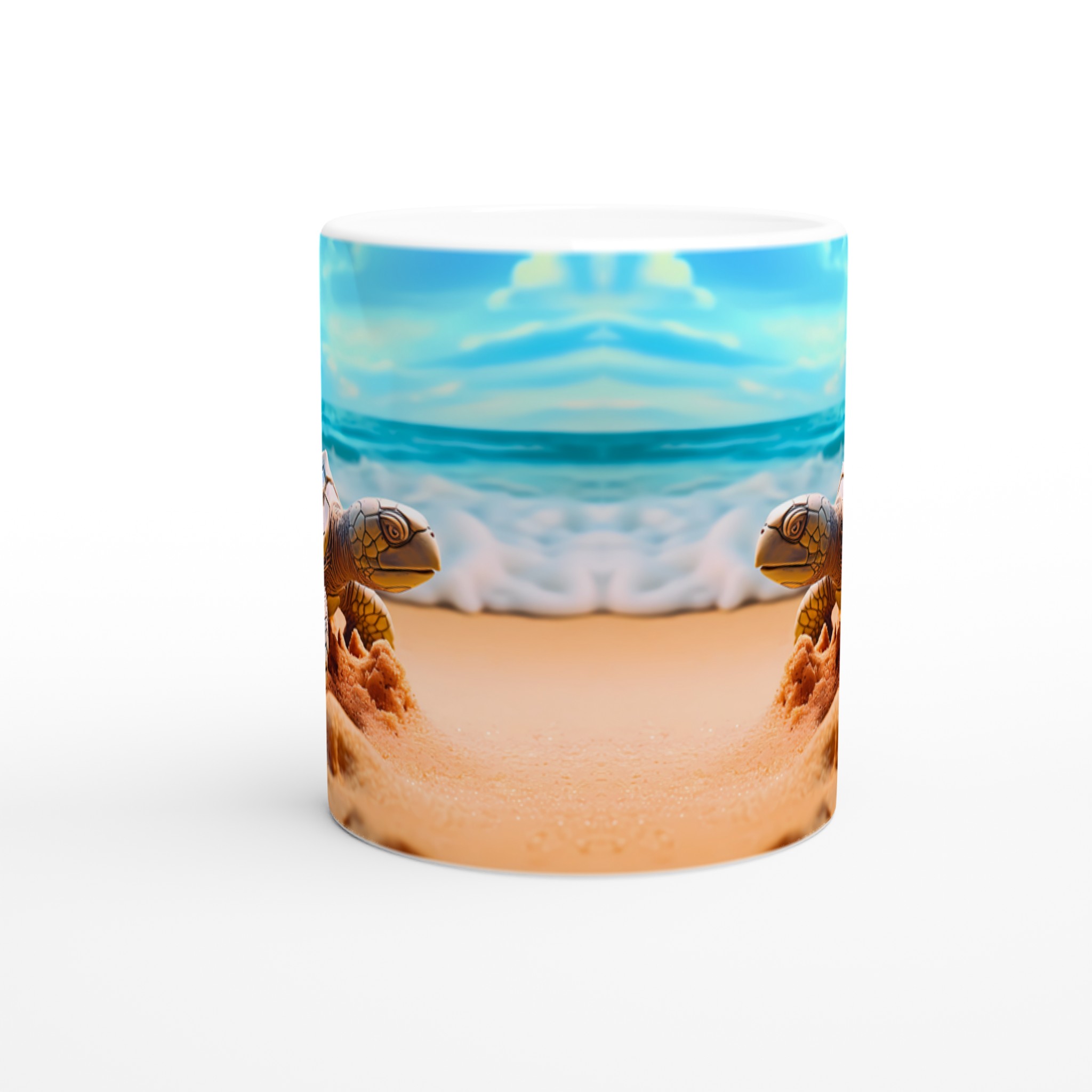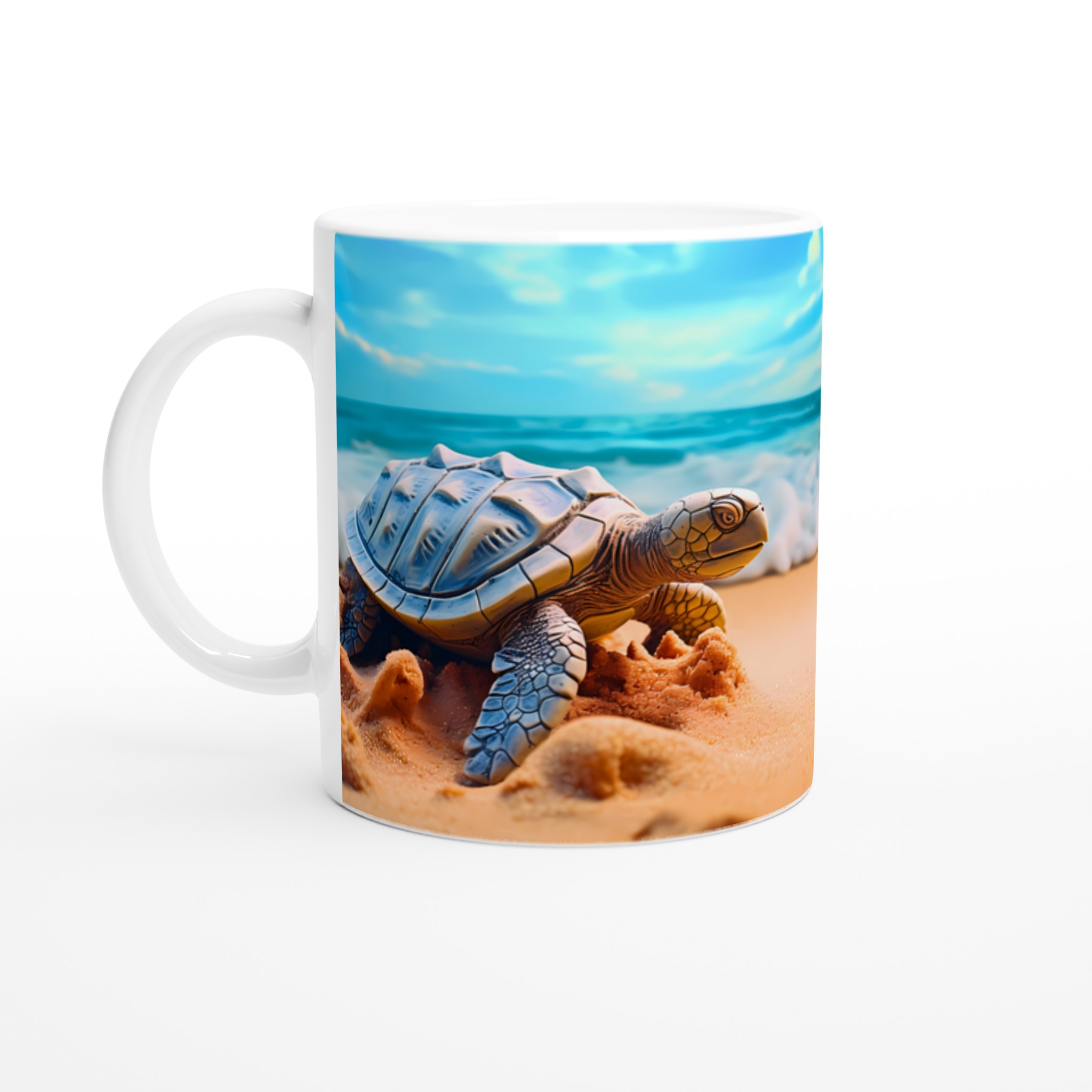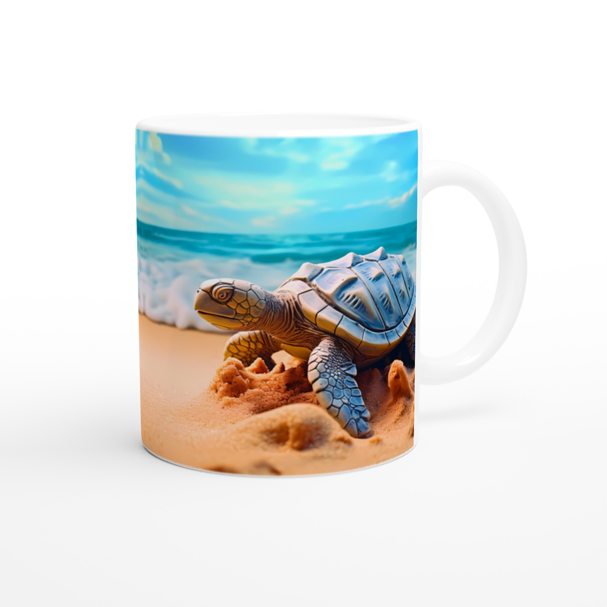 Föreställ dig en lugn stund vid havet varje gång du tar en klunk! Denna charmiga keramiska mugg fångar den fridfulla skönheten hos havssköldpaddor vid en solig strandkant, med vågor som försiktigt rullar in under en klarblå himmel. Denna stilrena keramiska mugg blir snabbt en vardagsfavorit. Perfekt för morgonkaffet, kvällens varma choklad eller när du bara vill njuta av en kopp te. Den blanka ytan gör att trycken framhävs med klara och levande färger, som håller sig fina även efter många turer i mikron och diskmaskinen.