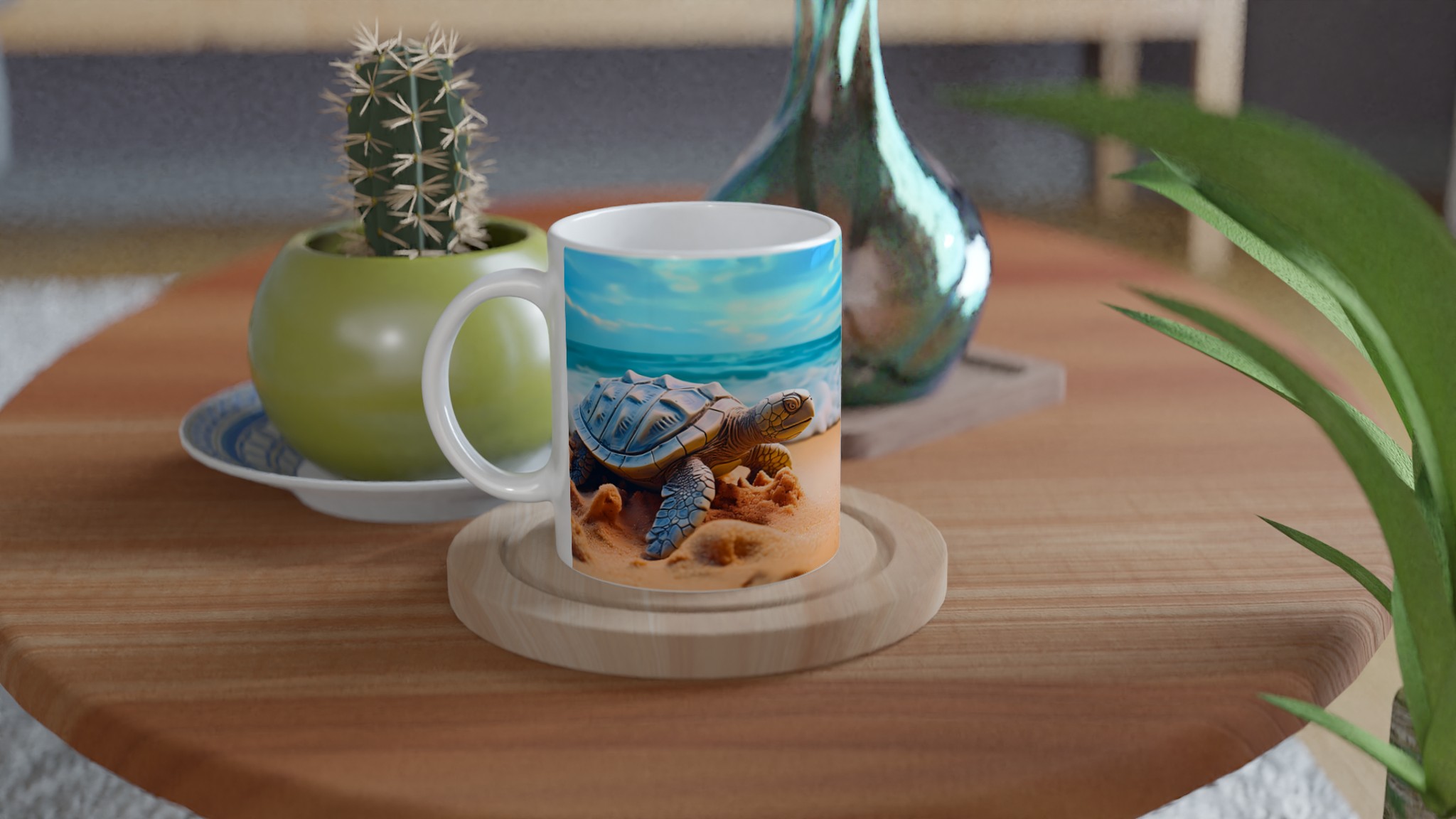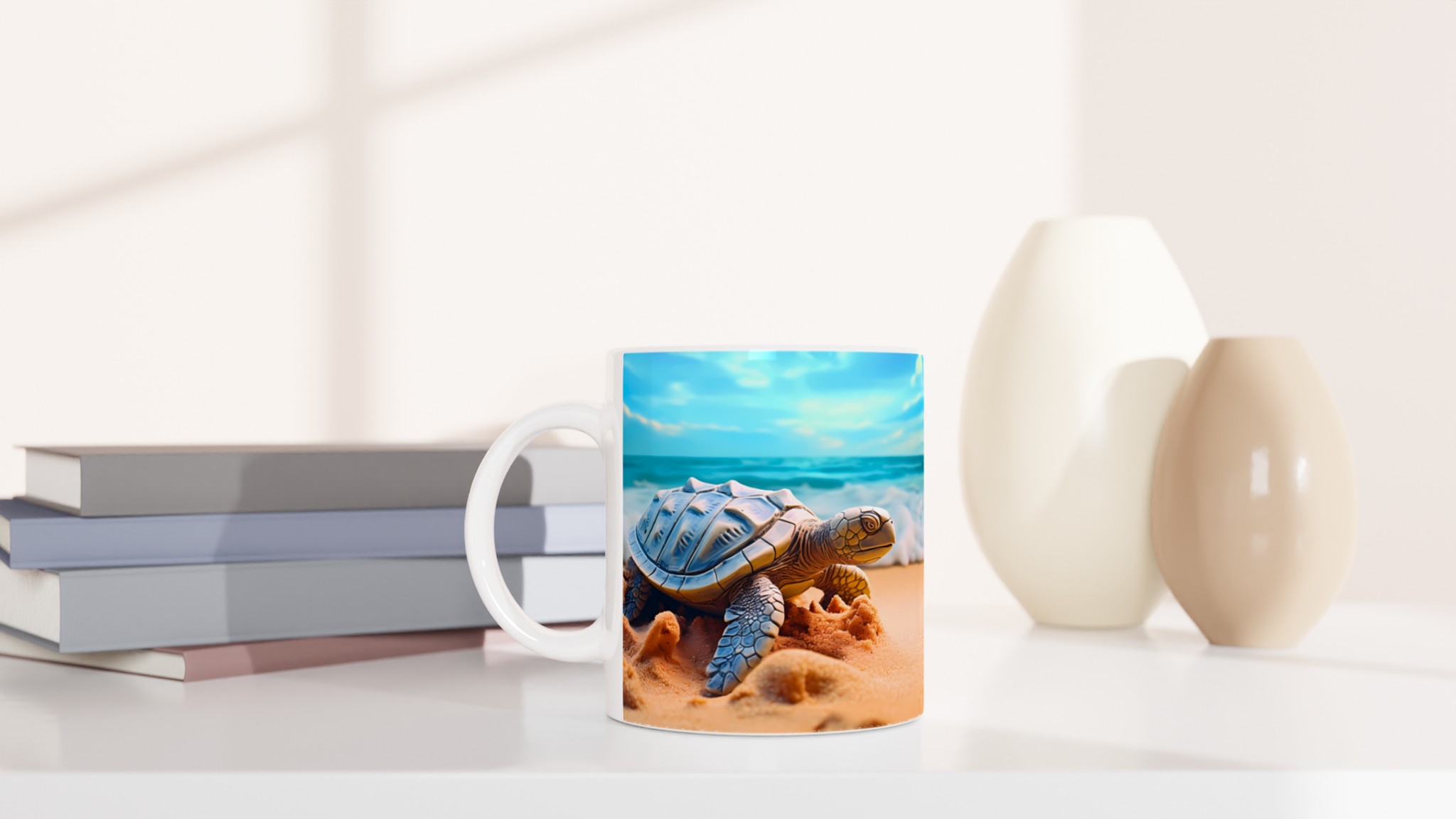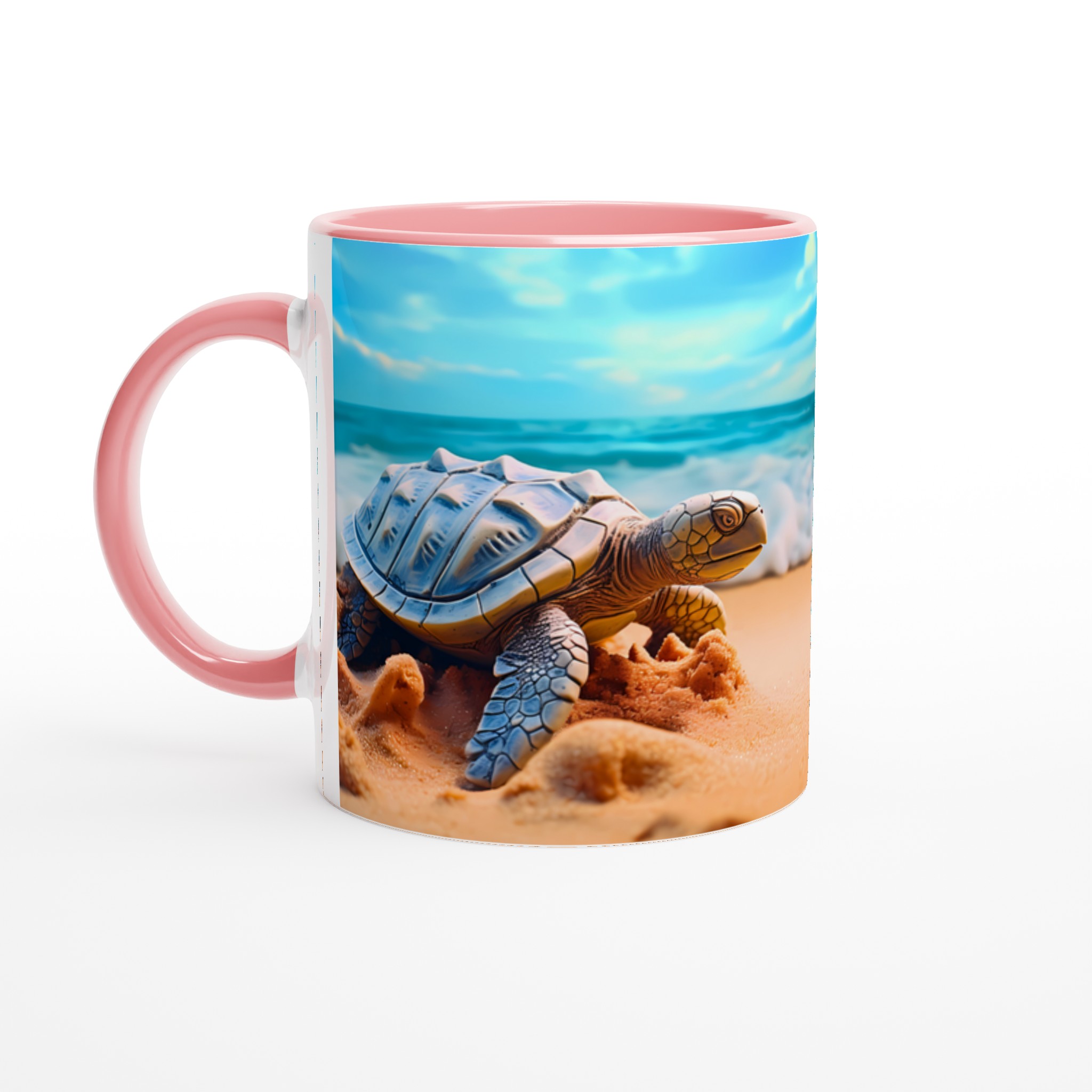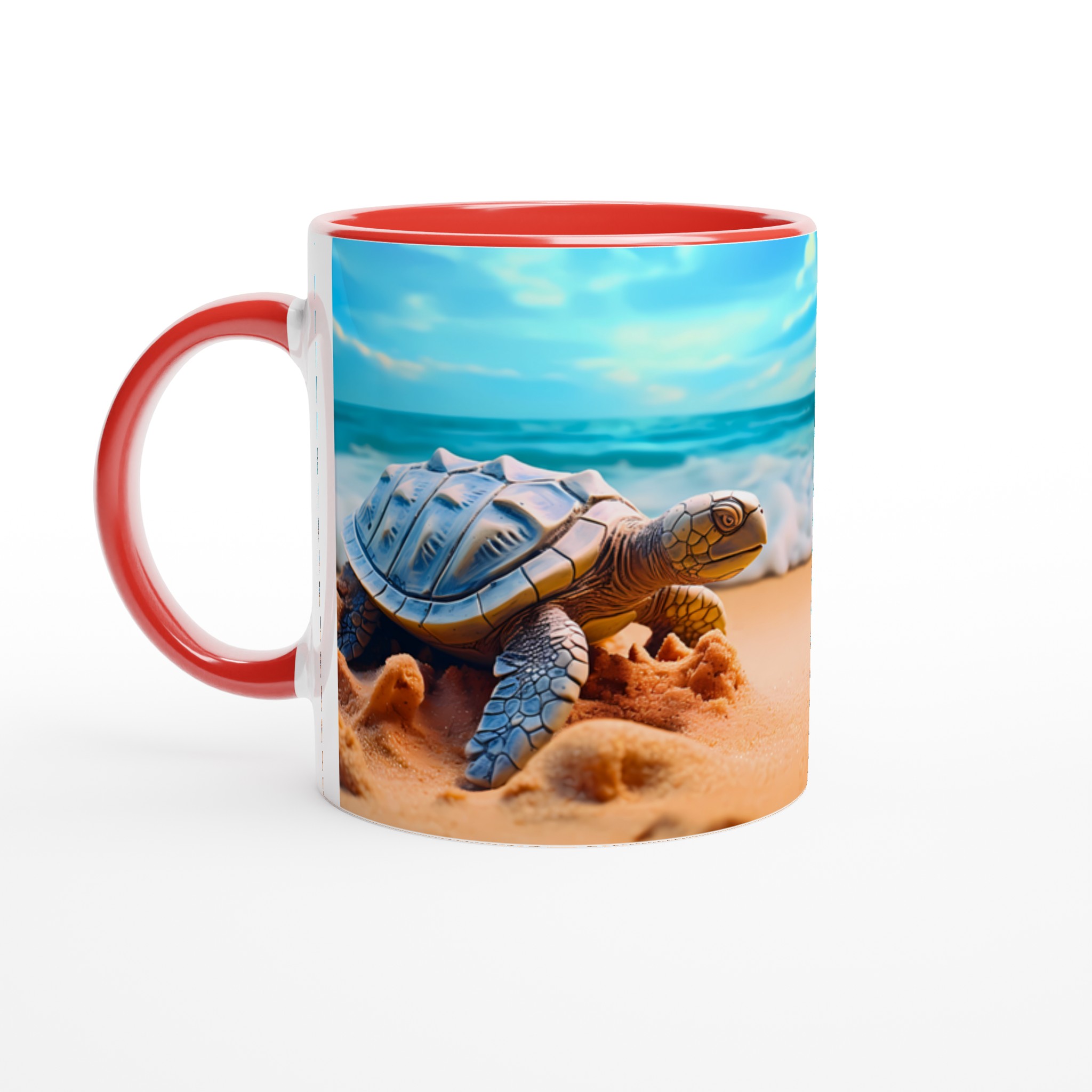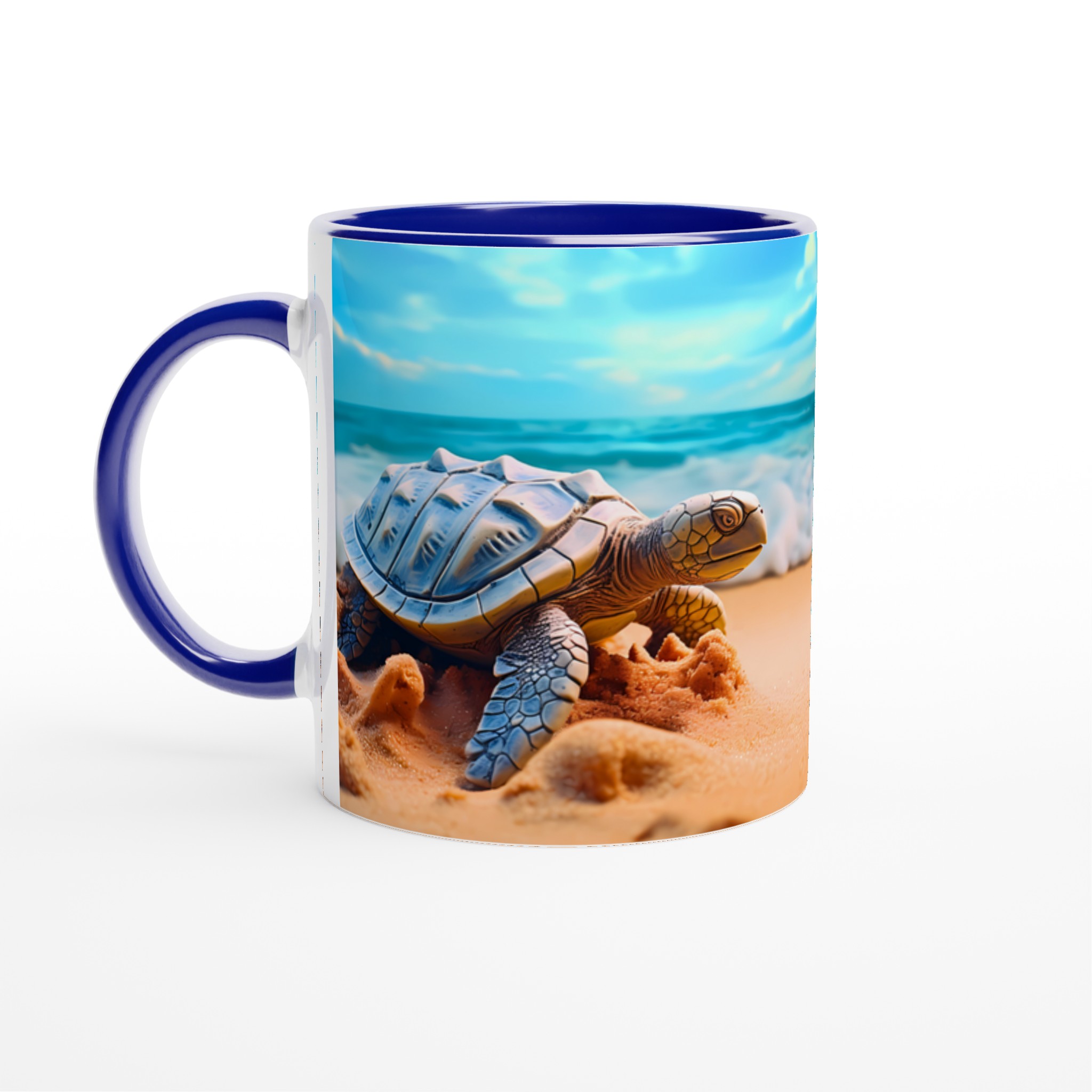 Föreställ dig en lugn stund vid havet varje gång du tar en klunk! Denna charmiga keramiska mugg fångar den fridfulla skönheten hos havssköldpaddor vid en solig strandkant, med vågor som försiktigt rullar in under en klarblå himmel. Denna stilrena keramiska mugg blir snabbt en vardagsfavorit. Perfekt för morgonkaffet, kvällens varma choklad eller när du bara vill njuta av en kopp te. Den blanka ytan gör att trycken framhävs med klara och levande färger, som håller sig fina även efter många turer i mikron och diskmaskinen.