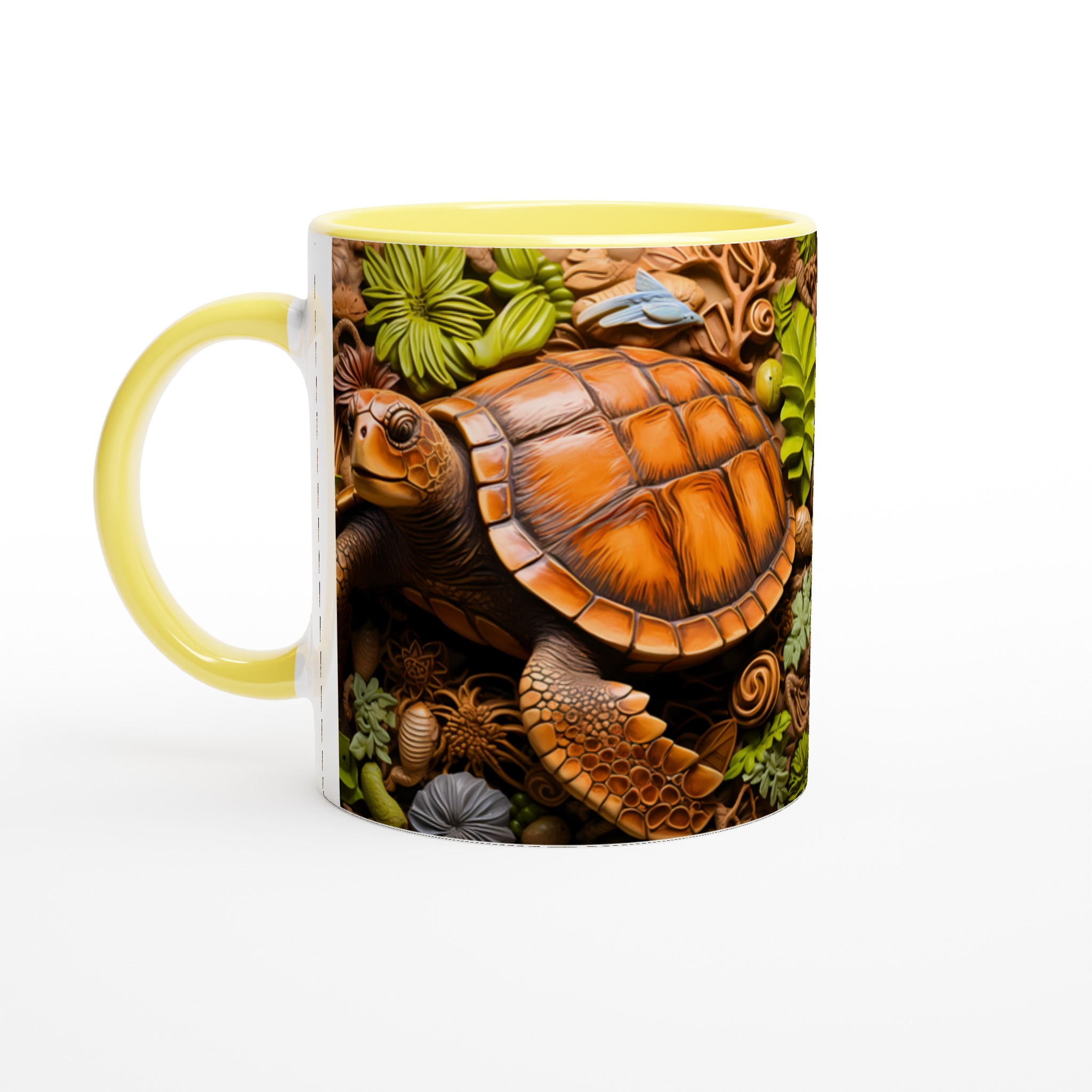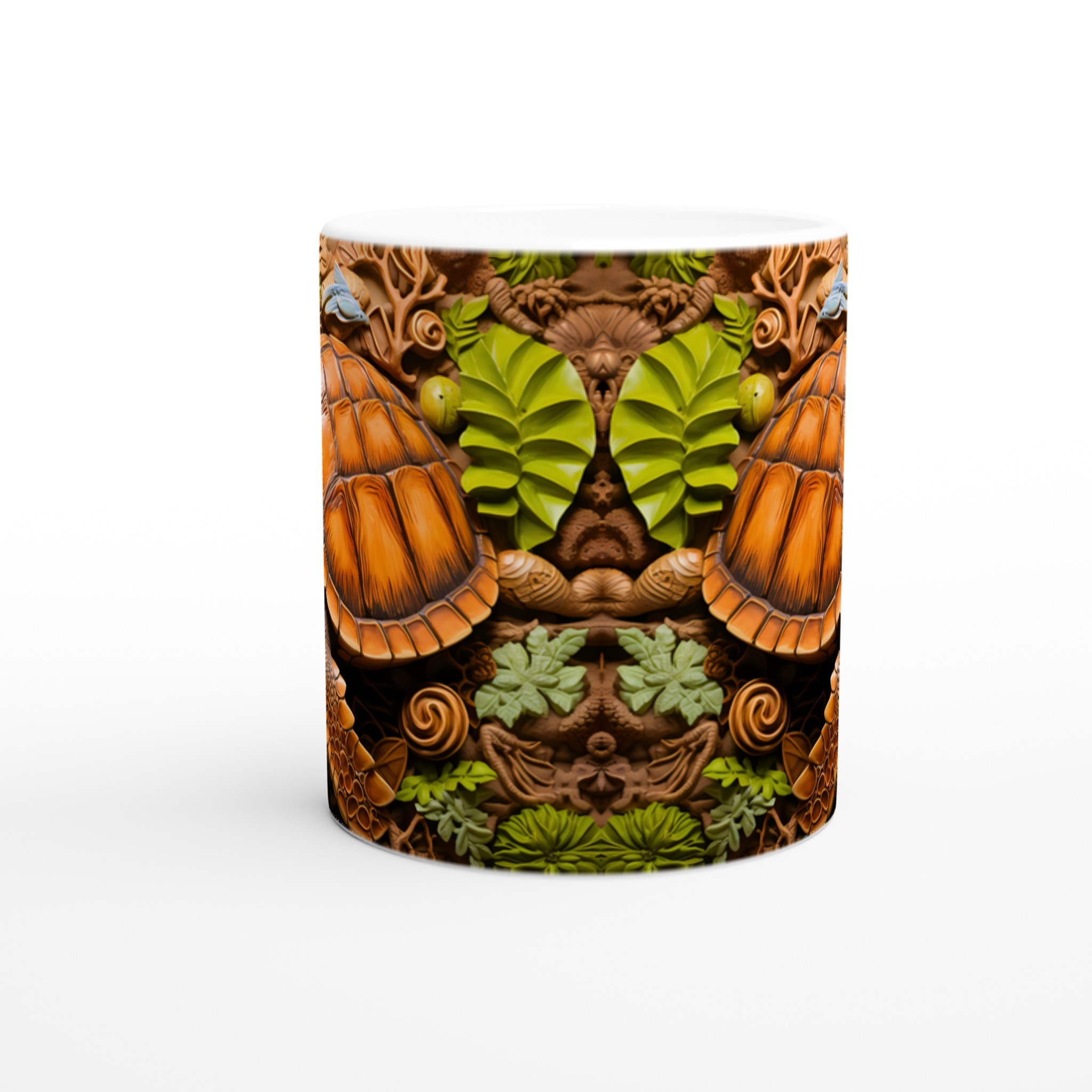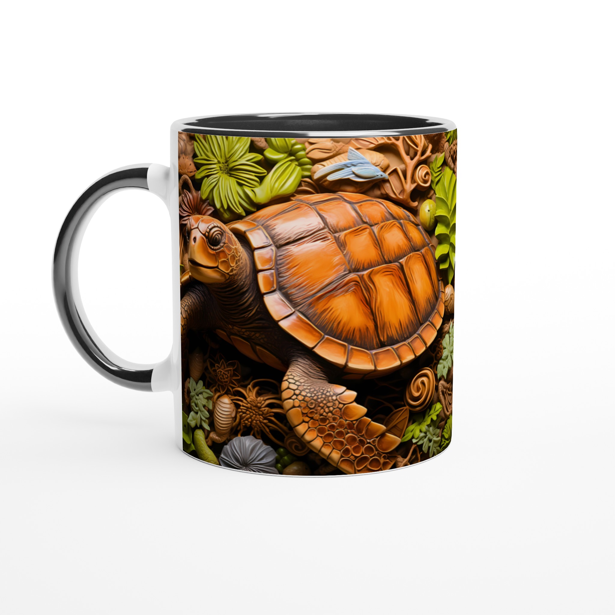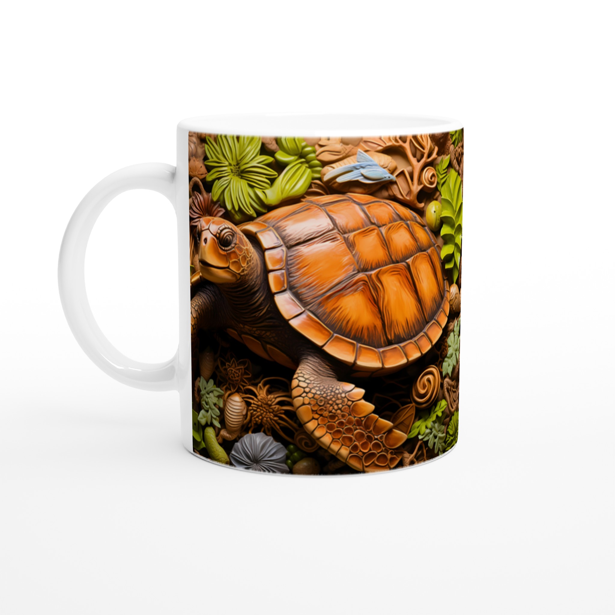 Fånga den marina drömmen med vår unika keramiska mugg, som stolt visar upp en detaljrik havssköldpadda omgiven av frodigt tropiskt bladverk. Denna mugg blir snabbt en vardagsfavorit, perfekt för morgonkaffet, kvällens varma choklad eller när du bara vill njuta av en kopp te. Den blanka vita ytan gör att trycket framhävs med klara och levande färger, som håller sig fina även efter många turer i mikron och diskmaskinen.