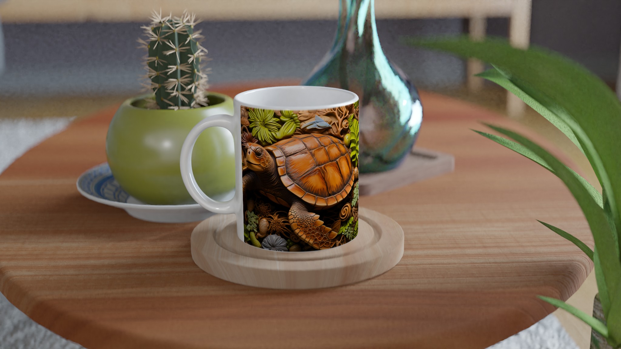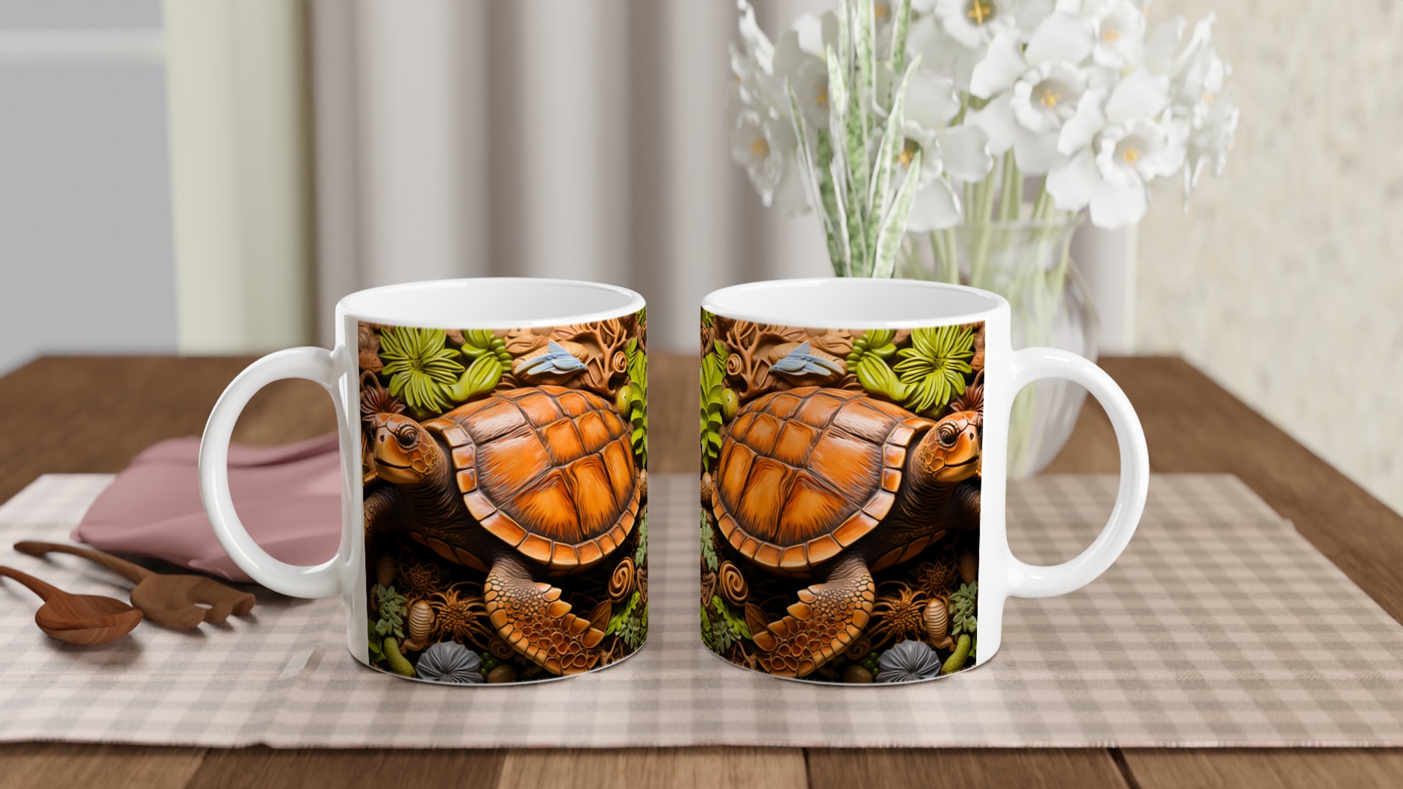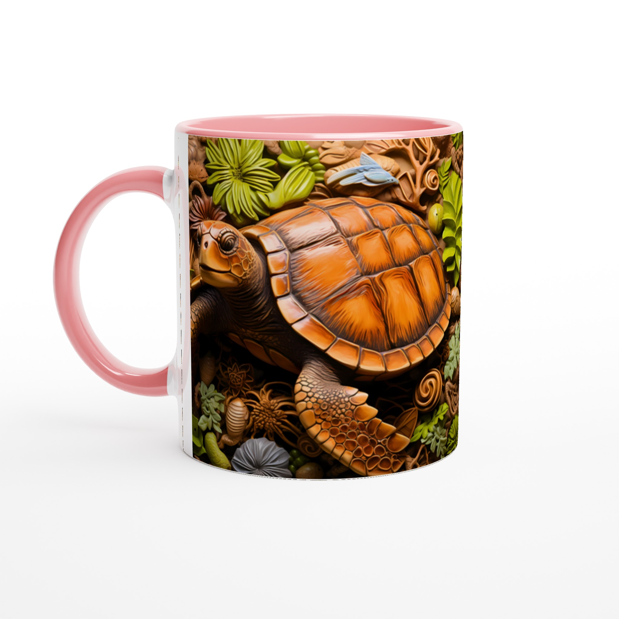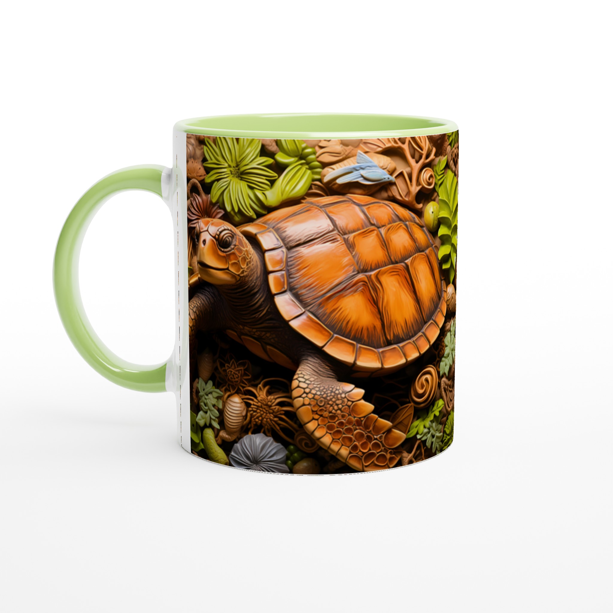 Fånga den marina drömmen med vår unika keramiska mugg, som stolt visar upp en detaljrik havssköldpadda omgiven av frodigt tropiskt bladverk. Denna mugg blir snabbt en vardagsfavorit, perfekt för morgonkaffet, kvällens varma choklad eller när du bara vill njuta av en kopp te. Den blanka vita ytan gör att trycket framhävs med klara och levande färger, som håller sig fina även efter många turer i mikron och diskmaskinen.