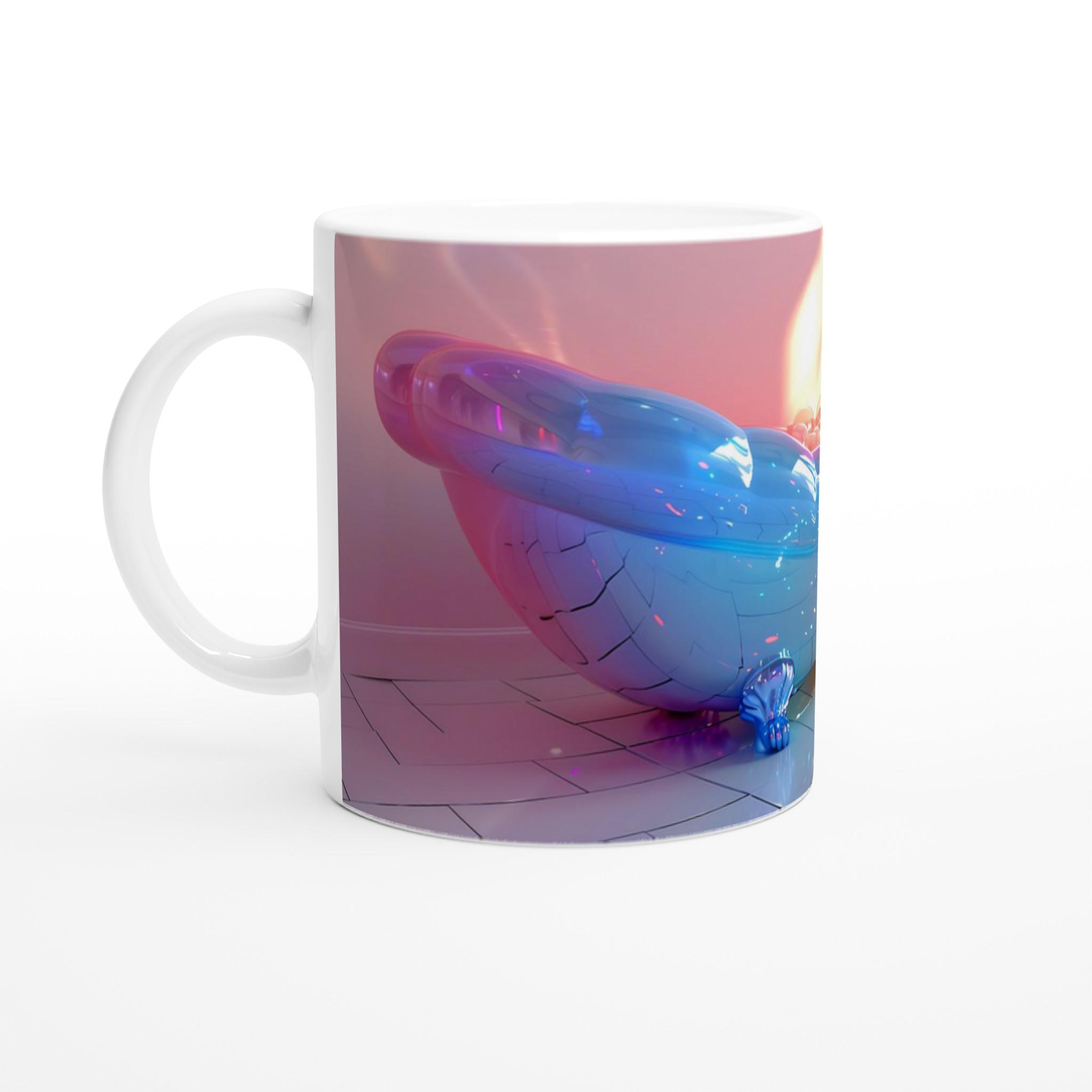 Inspirerad av den drömska glansen från ett holografiskt badkar fyllt med eteriska bubblor, fångar denna mugg en känsla av lugn och modern elegans. Den blanka vita ytan ger ett skarpt och levande tryck som verkligen sticker ut, oavsett om det är en personlig design, ett roligt citat eller en present till någon du tycker om.