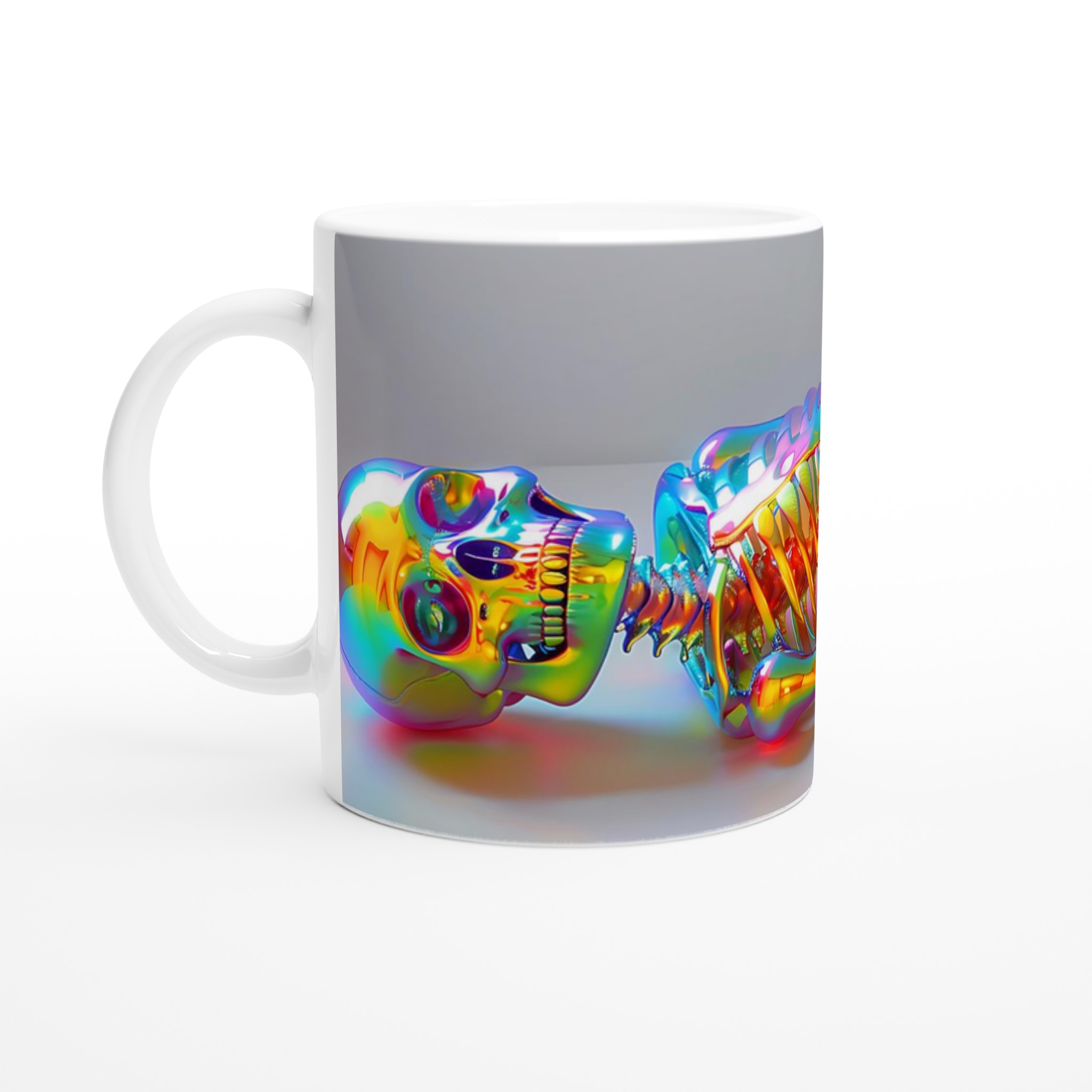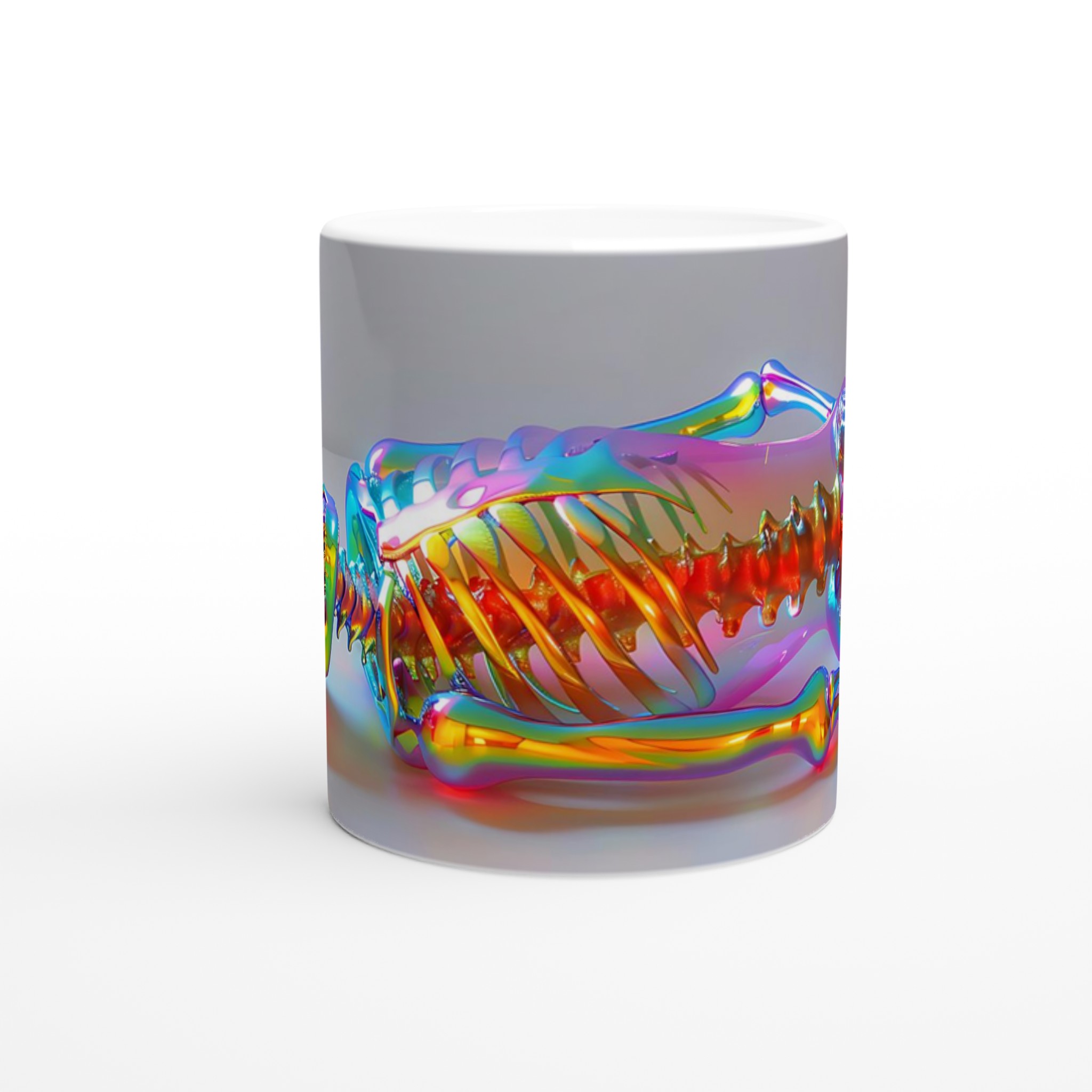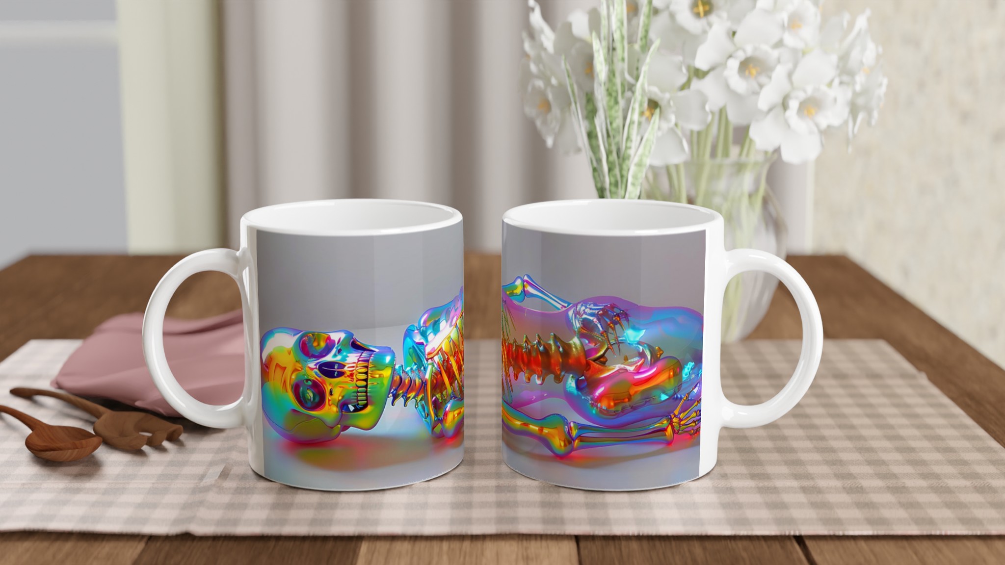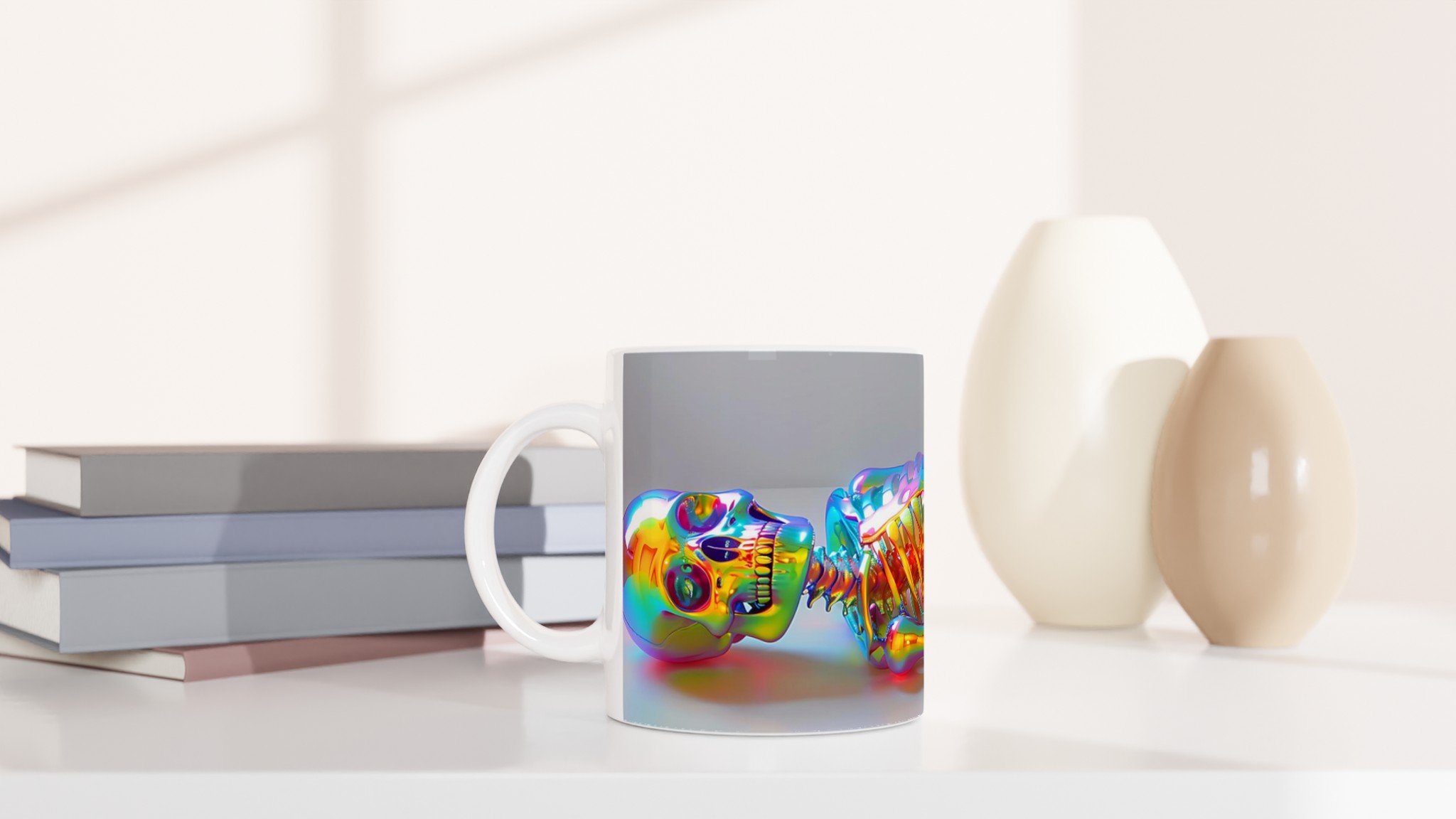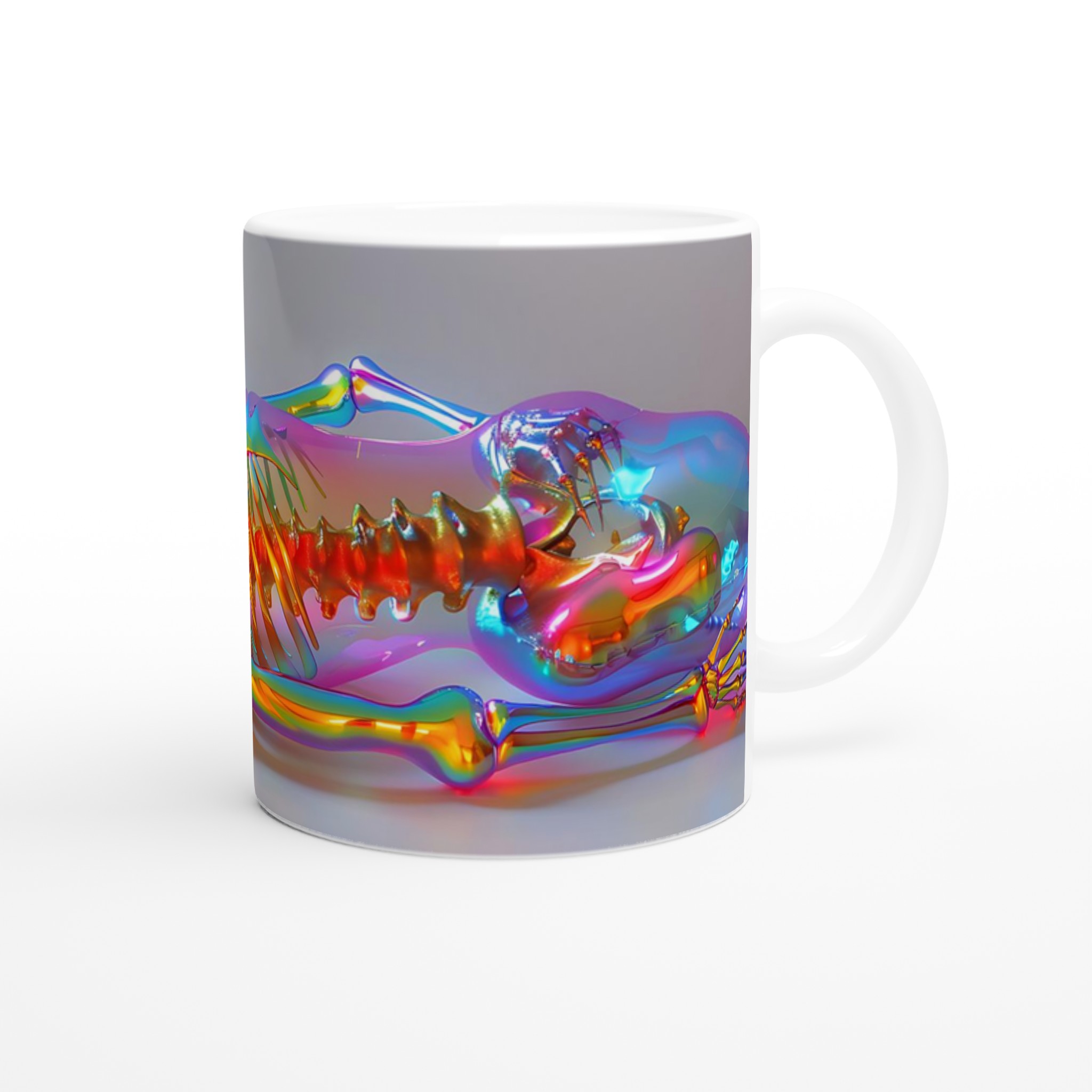 Väck dina sinnen varje morgon med den här unika keramiska muggen, inspirerad av holografiska färgskiftningar som efterliknar den futuristiska bilden av ett skelett i neonfärger. Den blir snabbt en vardagsfavorit och en garanterad konversationsstartare. Perfekt för morgonkaffet, kvällens varma choklad eller när du bara vill njuta av en kopp te. Den blanka vita ytan gör att trycken framhävs med klara och levande färger, som håller sig fina även efter många turer i mikron och diskmaskinen.