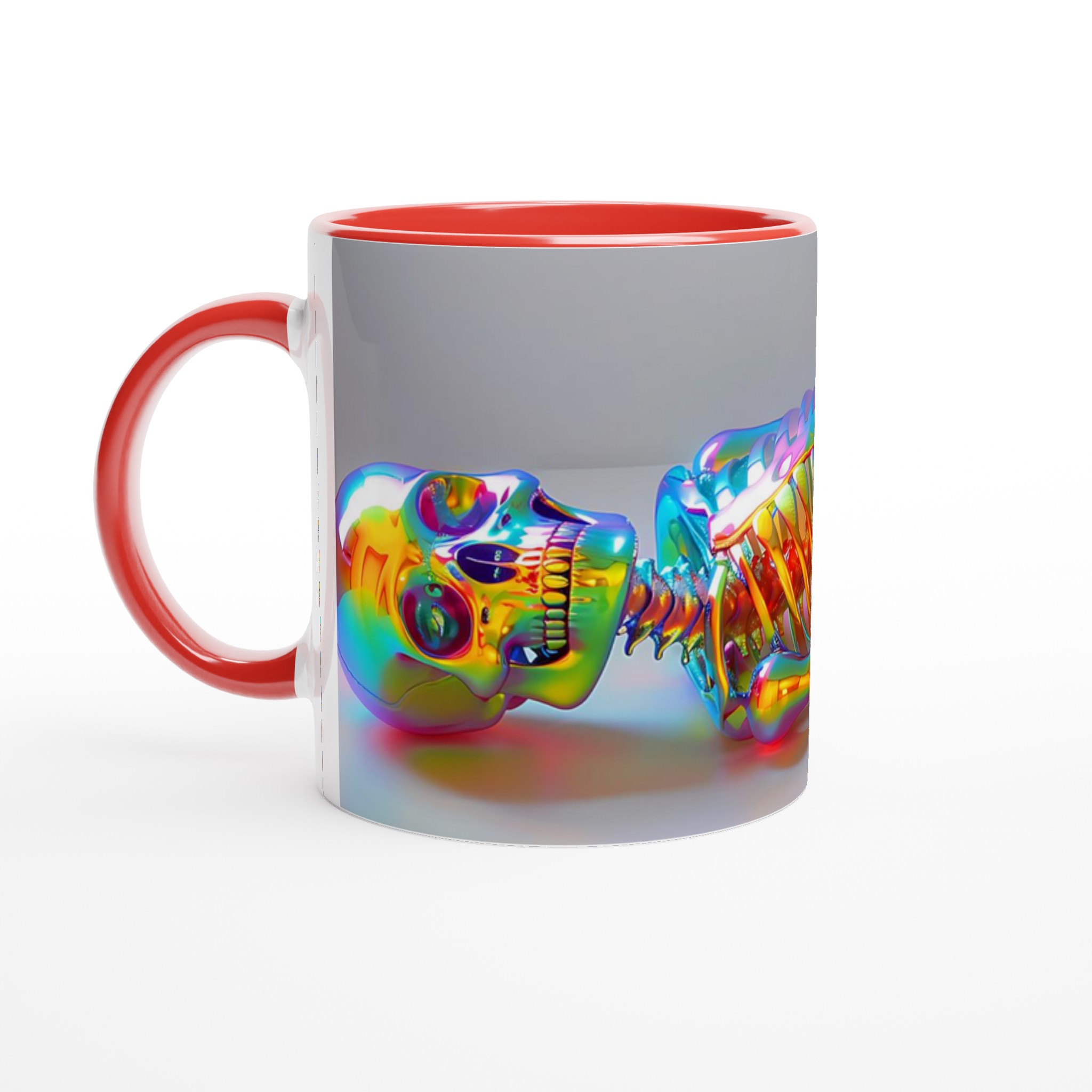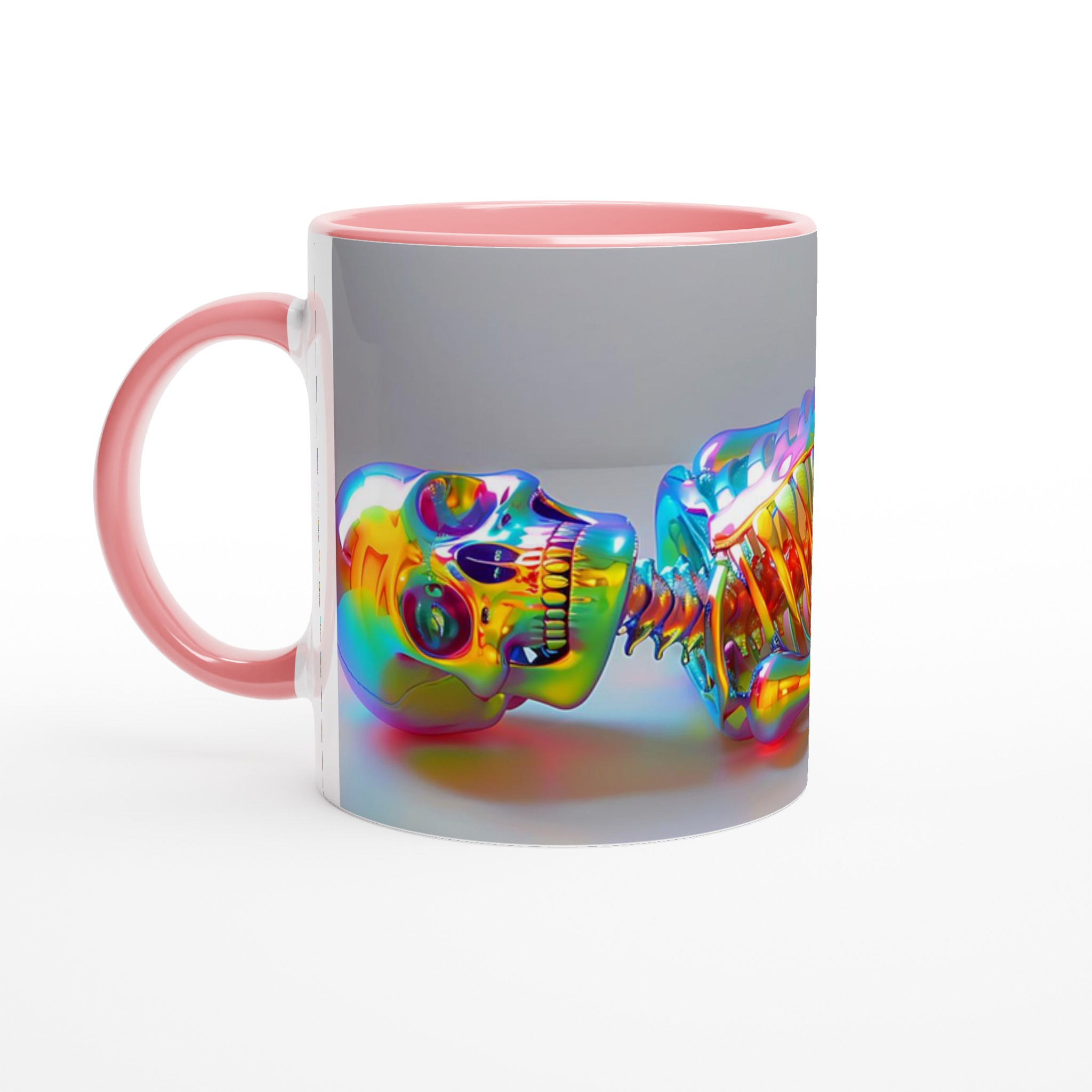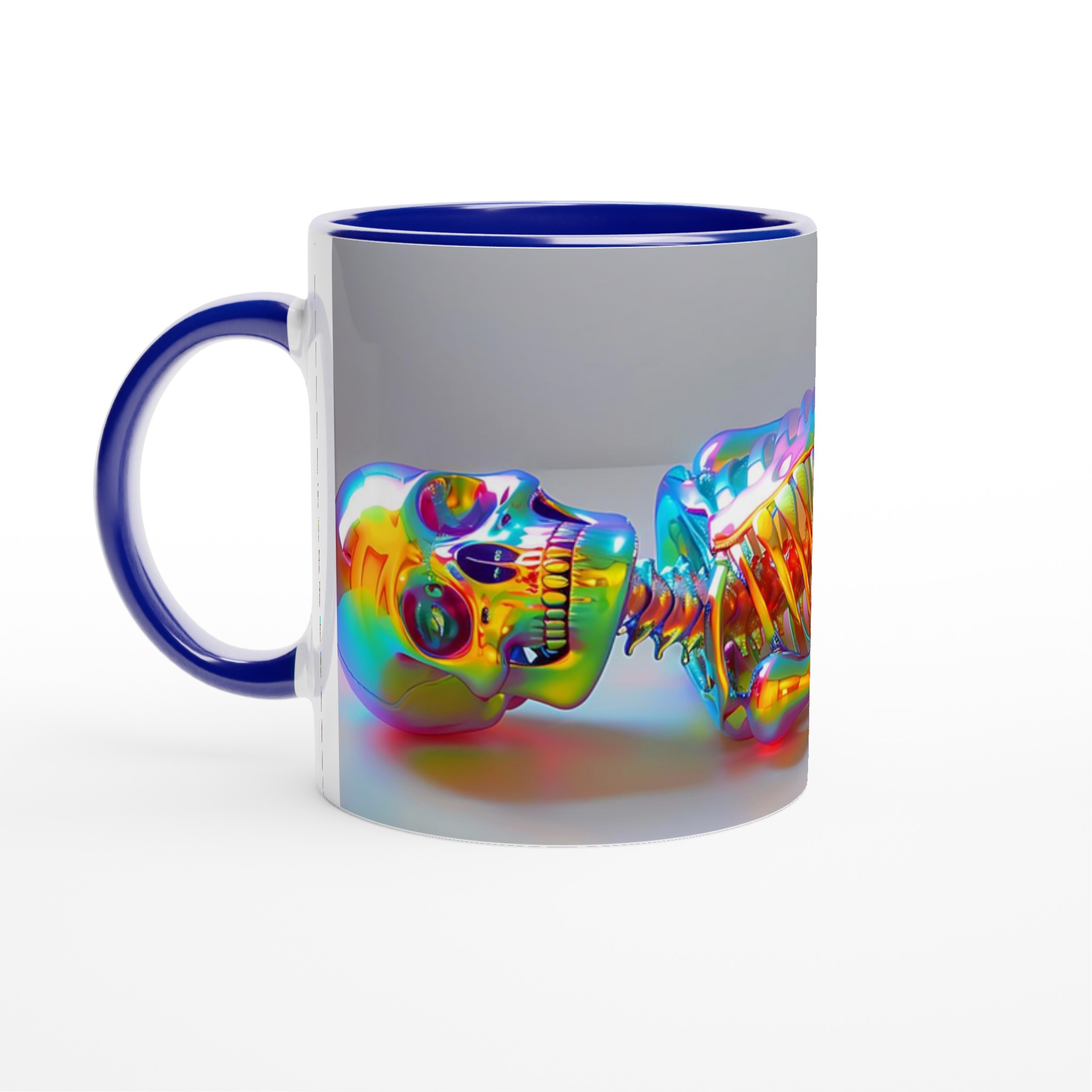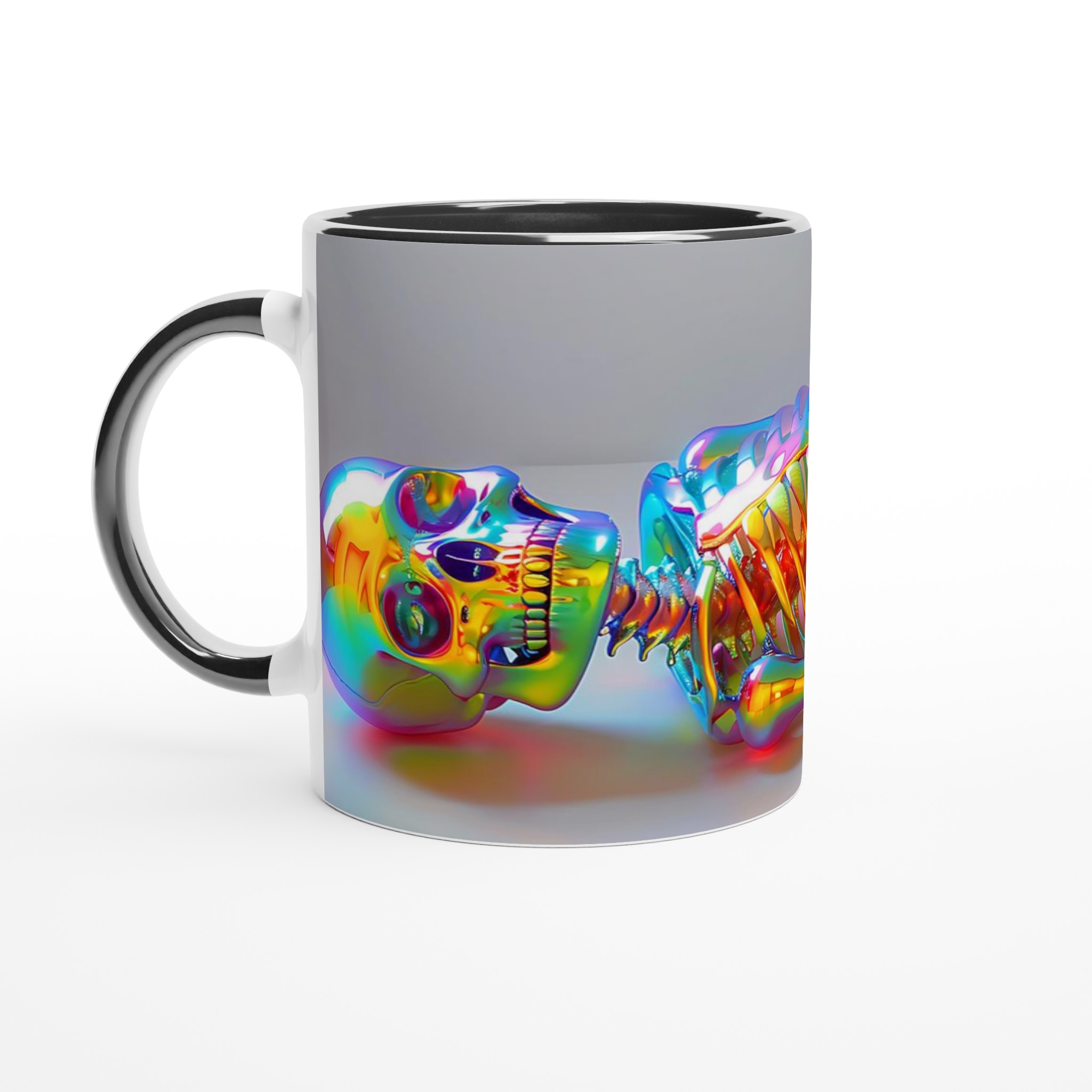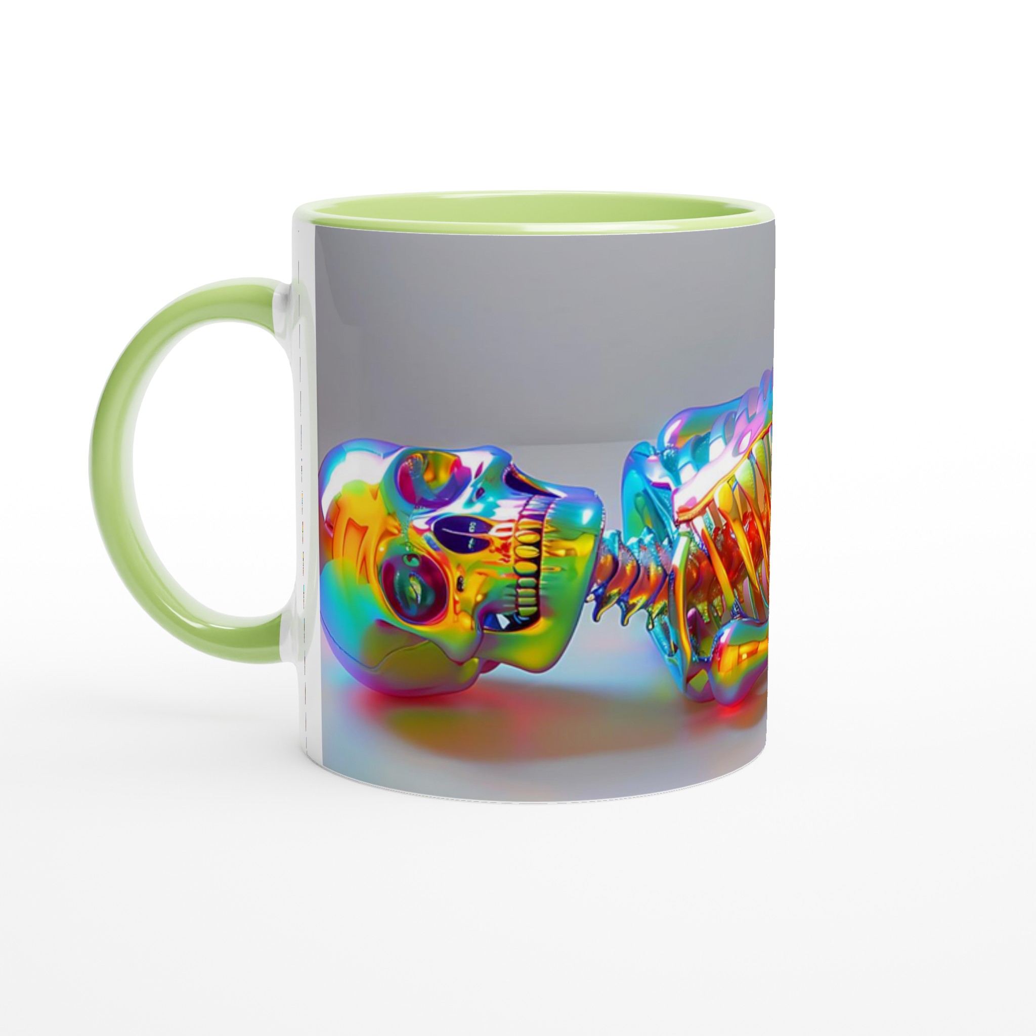 Väck dina sinnen varje morgon med den här unika keramiska muggen, inspirerad av holografiska färgskiftningar som efterliknar den futuristiska bilden av ett skelett i neonfärger. Den blir snabbt en vardagsfavorit och en garanterad konversationsstartare. Perfekt för morgonkaffet, kvällens varma choklad eller när du bara vill njuta av en kopp te. Den blanka vita ytan gör att trycken framhävs med klara och levande färger, som håller sig fina även efter många turer i mikron och diskmaskinen.