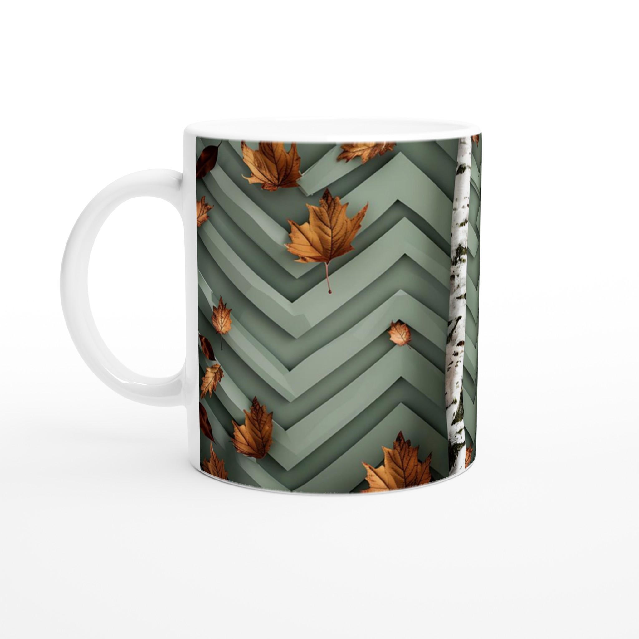 Inspirerad av höstens rofyllda skönhet, med vita björkstammar och gyllenbruna lönnlöv mot en mjukt grön bakgrund, ger denna mugg en känsla av lugn och natur till din vardag. Den blanka vita ytan ger ett skarpt och levande tryck som verkligen sticker ut, oavsett om det är en personlig design, ett roligt citat eller en present till någon du tycker om.