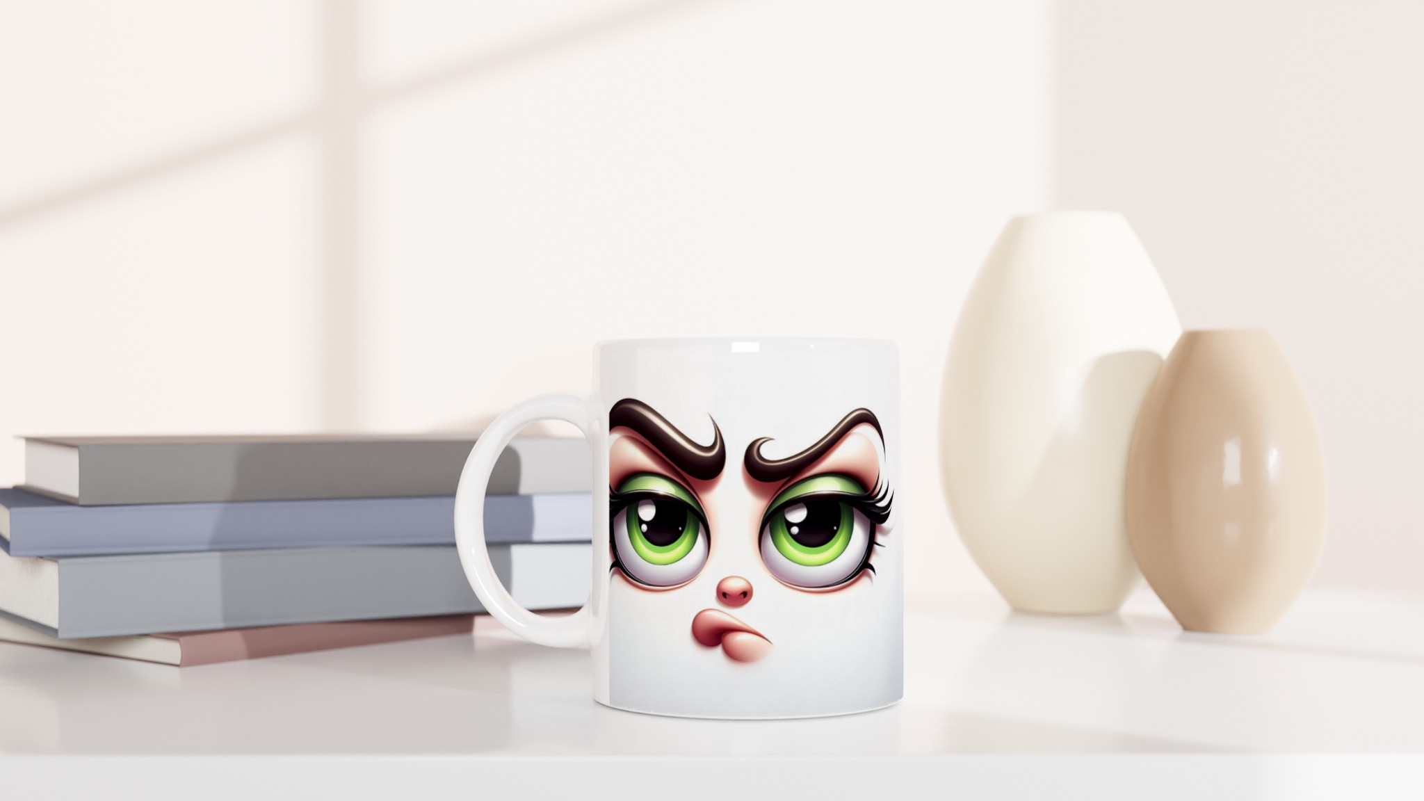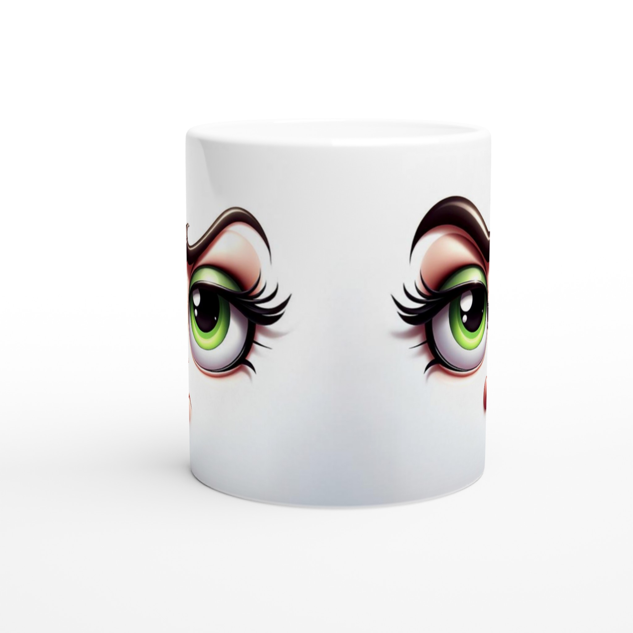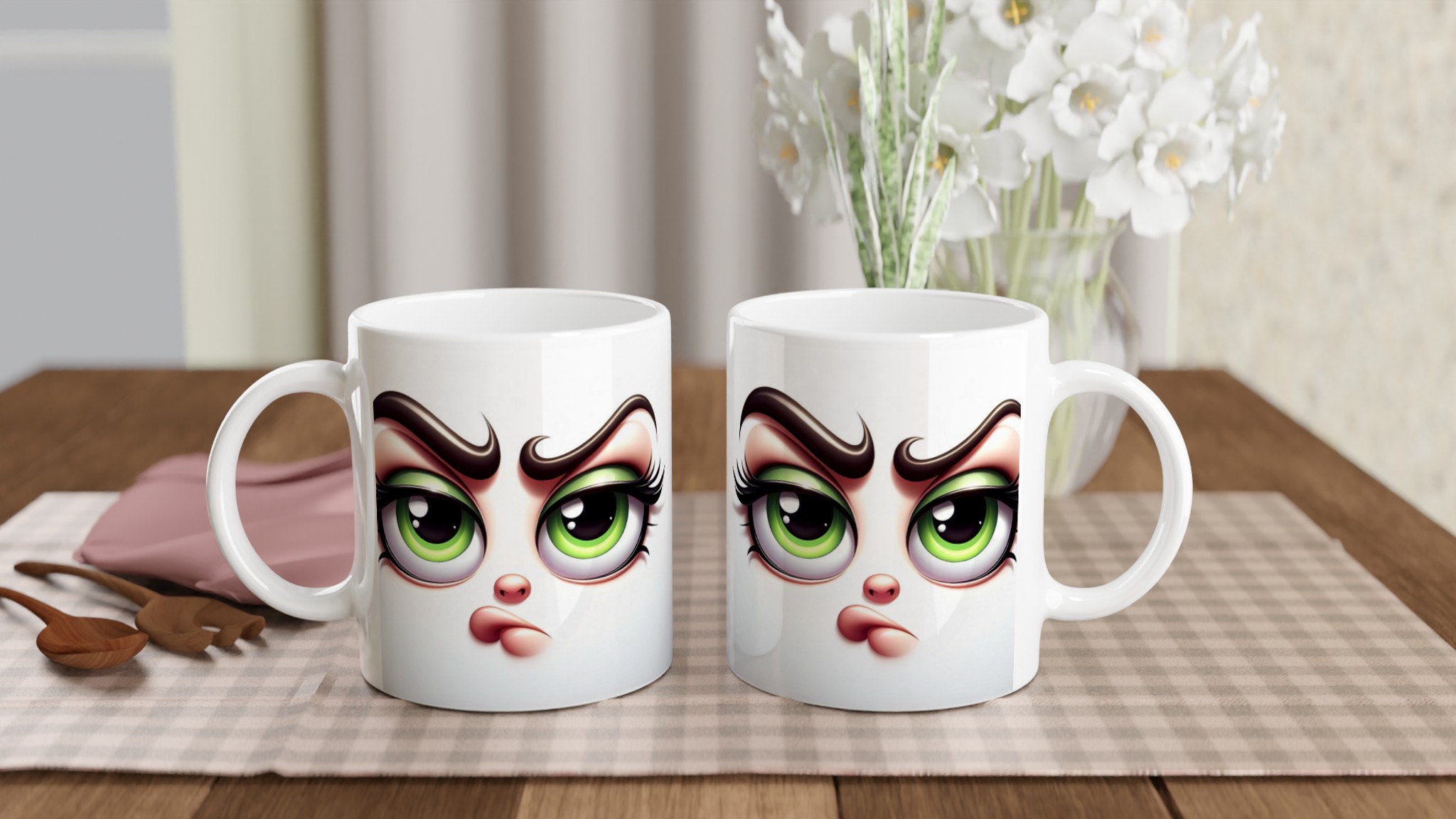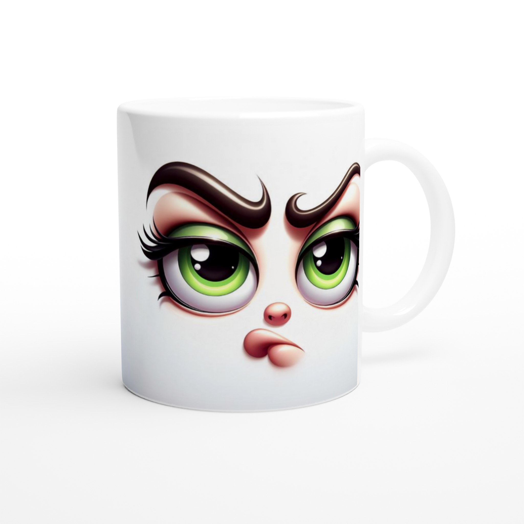 Lyft varje kaffestund med vår premium keramikmugg – stilren, hållbar och skapad för att låta ditt motiv glänsa. Denna lekfulla mugg fångar ögat med sitt uttrycksfulla ansikte, komplett med stora, gröna ögon och en humoristisk twist som garanterat sprider glädje. Perfekt för den som älskar att starta dagen med ett leende eller vill ge bort en present som verkligen sticker ut.