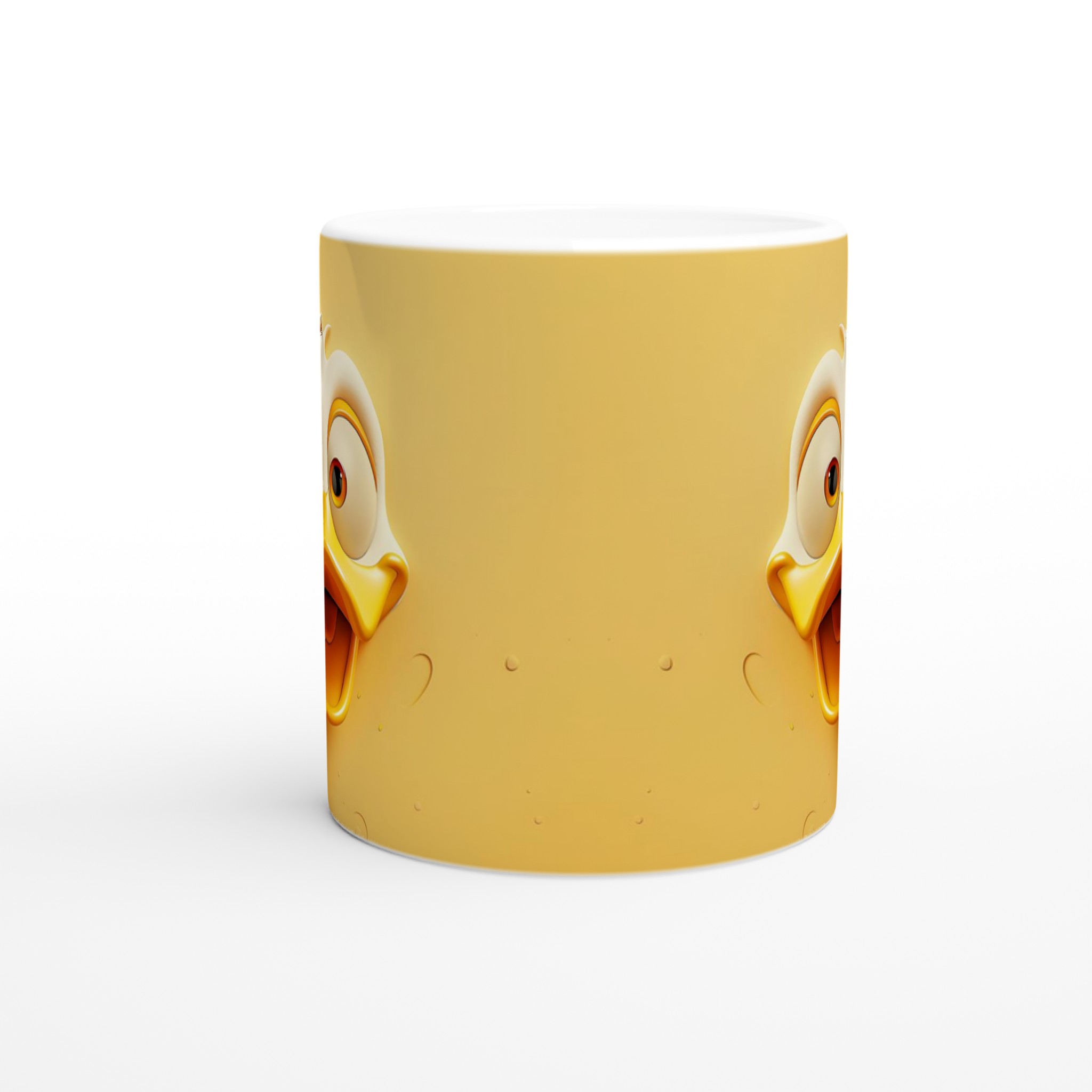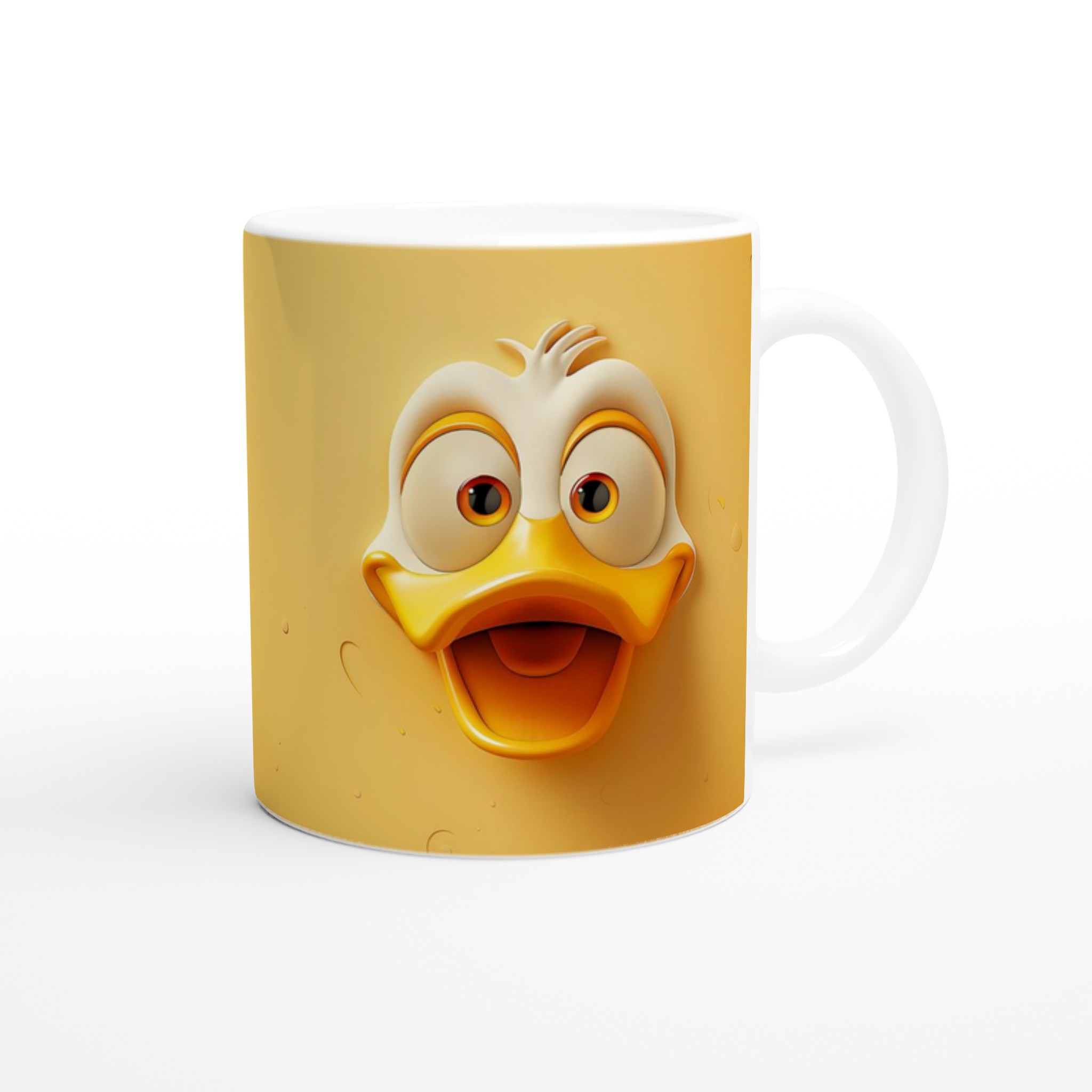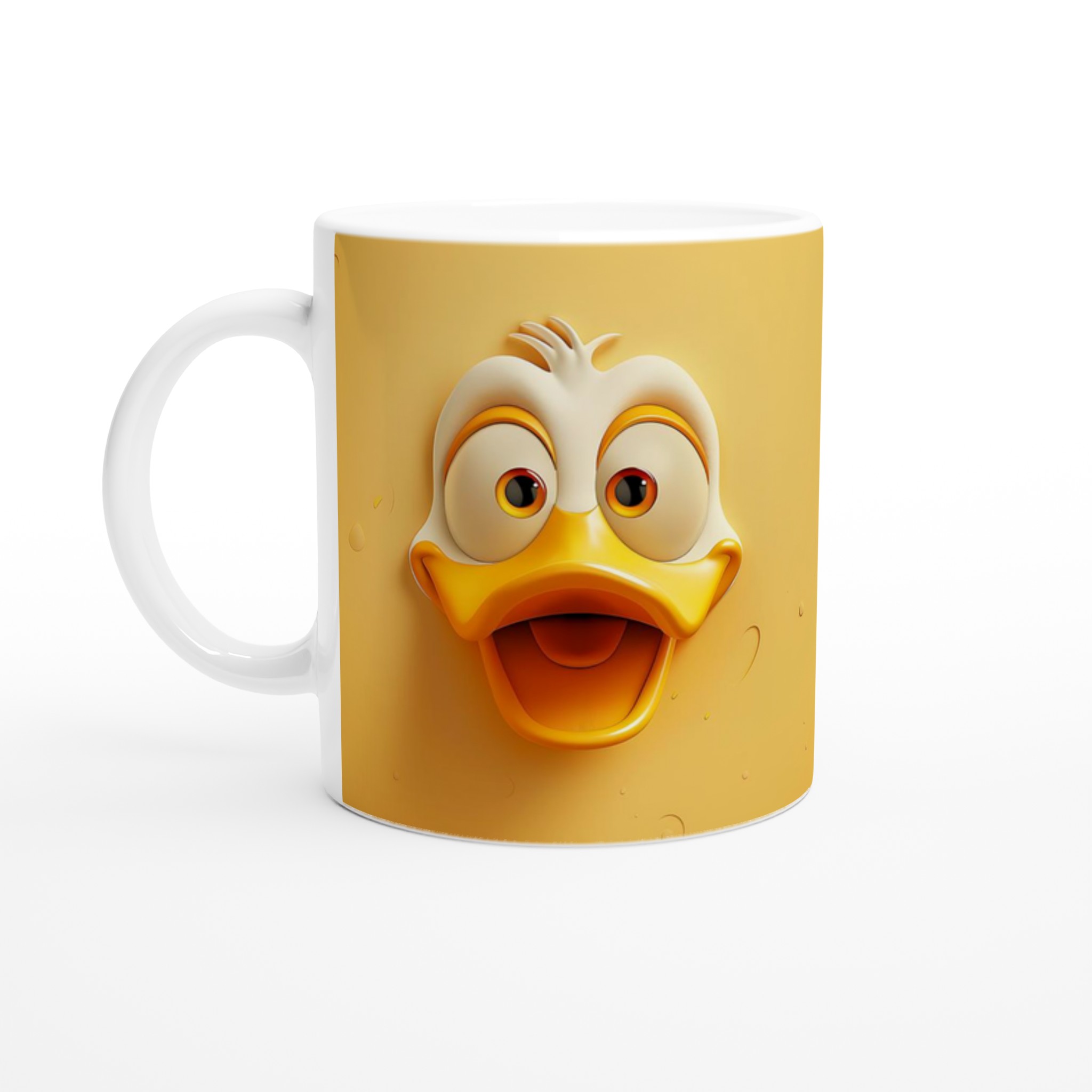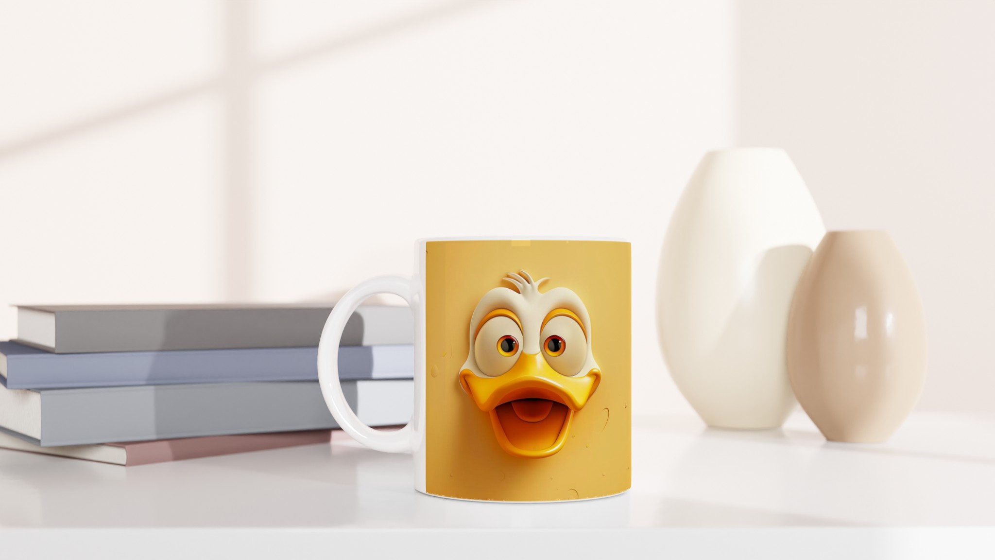 Lyft varje kaffestund med vår premium keramikmugg – stilren, hållbar och skapad för att låta ditt motiv glänsa. Denna charmiga mugg pryds av en humoristisk serieanka med stora, uttrycksfulla ögon och en öppen näbb, som garanterat sprider glädje och skratt till din vardag. Med sin lekfulla karaktär, inbäddad i en varm gul färgpalett, är den den perfekta konversationsstartaren eller en glädjefull present till någon speciell.