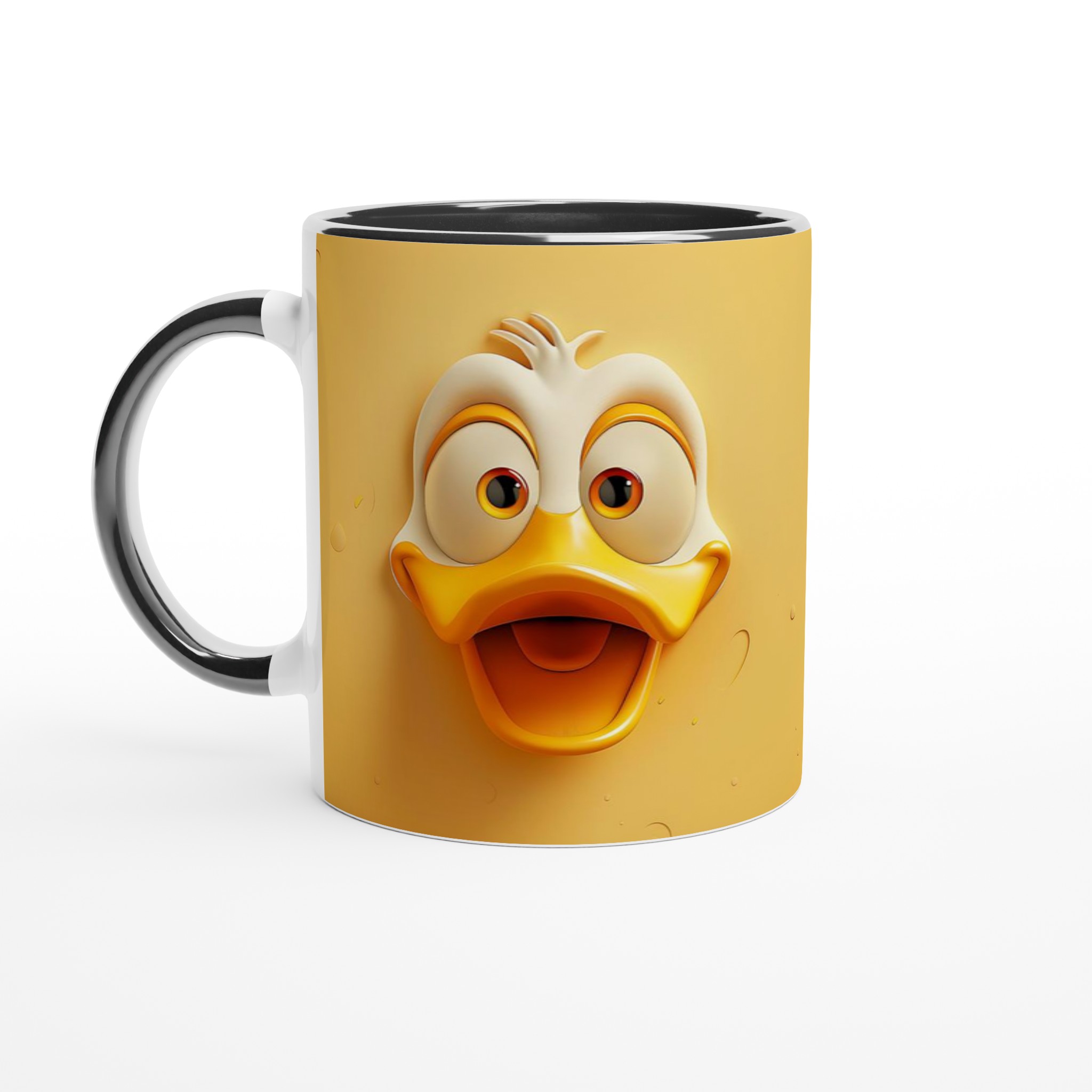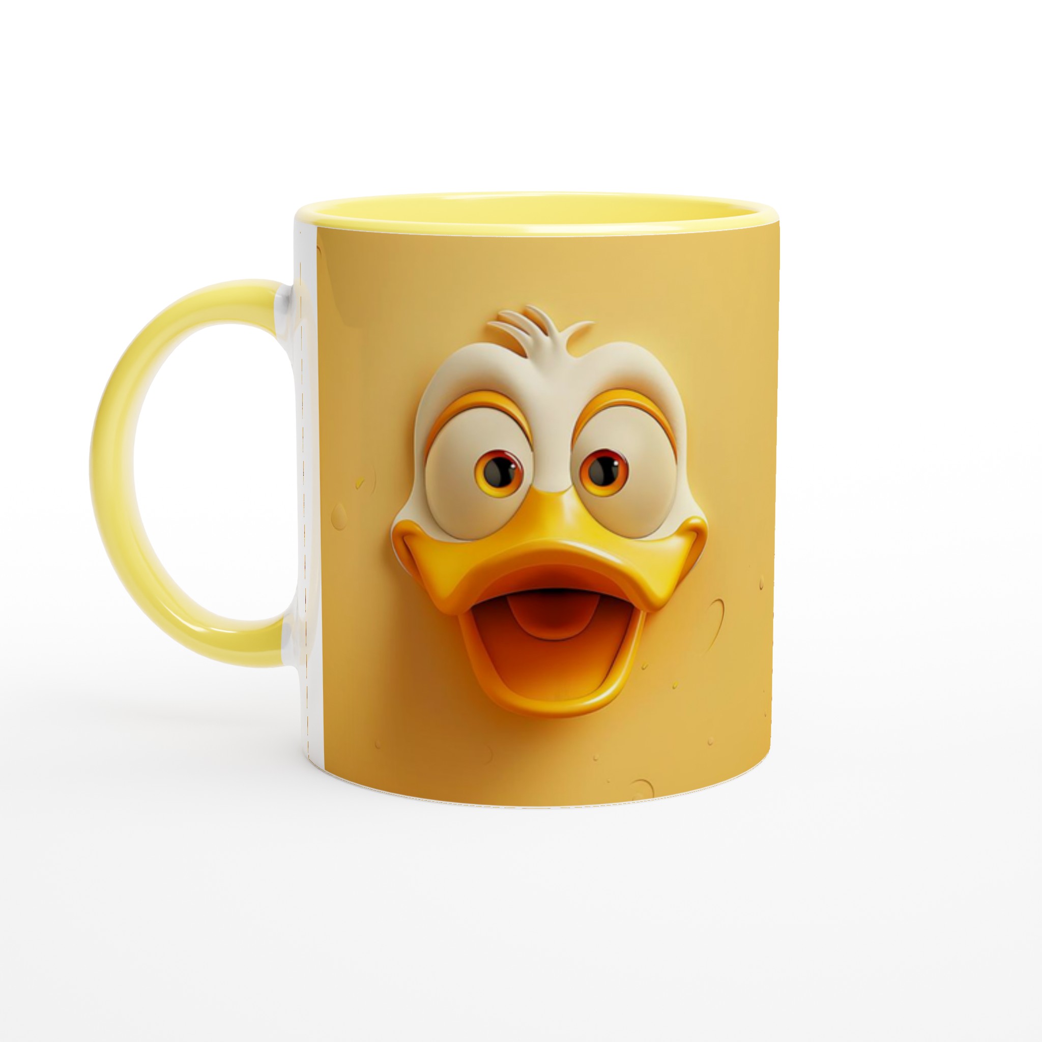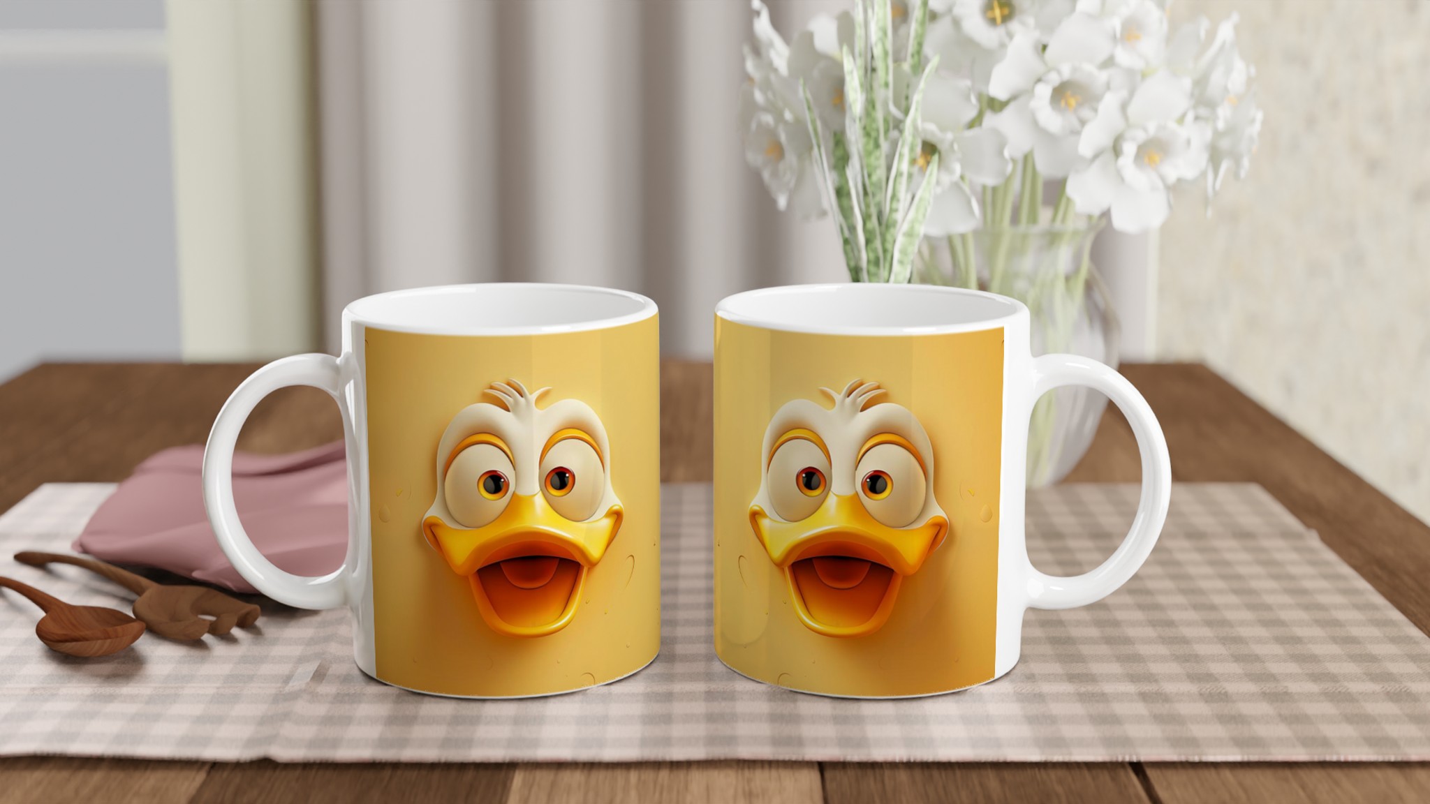 Lyft varje kaffestund med vår premium keramikmugg – stilren, hållbar och skapad för att låta ditt motiv glänsa. Denna charmiga mugg pryds av en humoristisk serieanka med stora, uttrycksfulla ögon och en öppen näbb, som garanterat sprider glädje och skratt till din vardag. Med sin lekfulla karaktär, inbäddad i en varm gul färgpalett, är den den perfekta konversationsstartaren eller en glädjefull present till någon speciell.