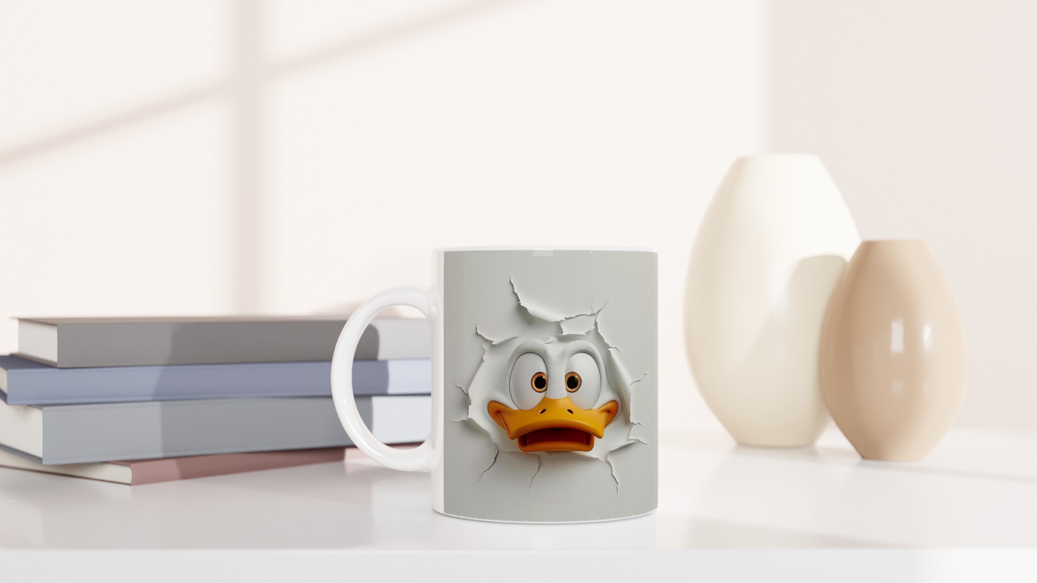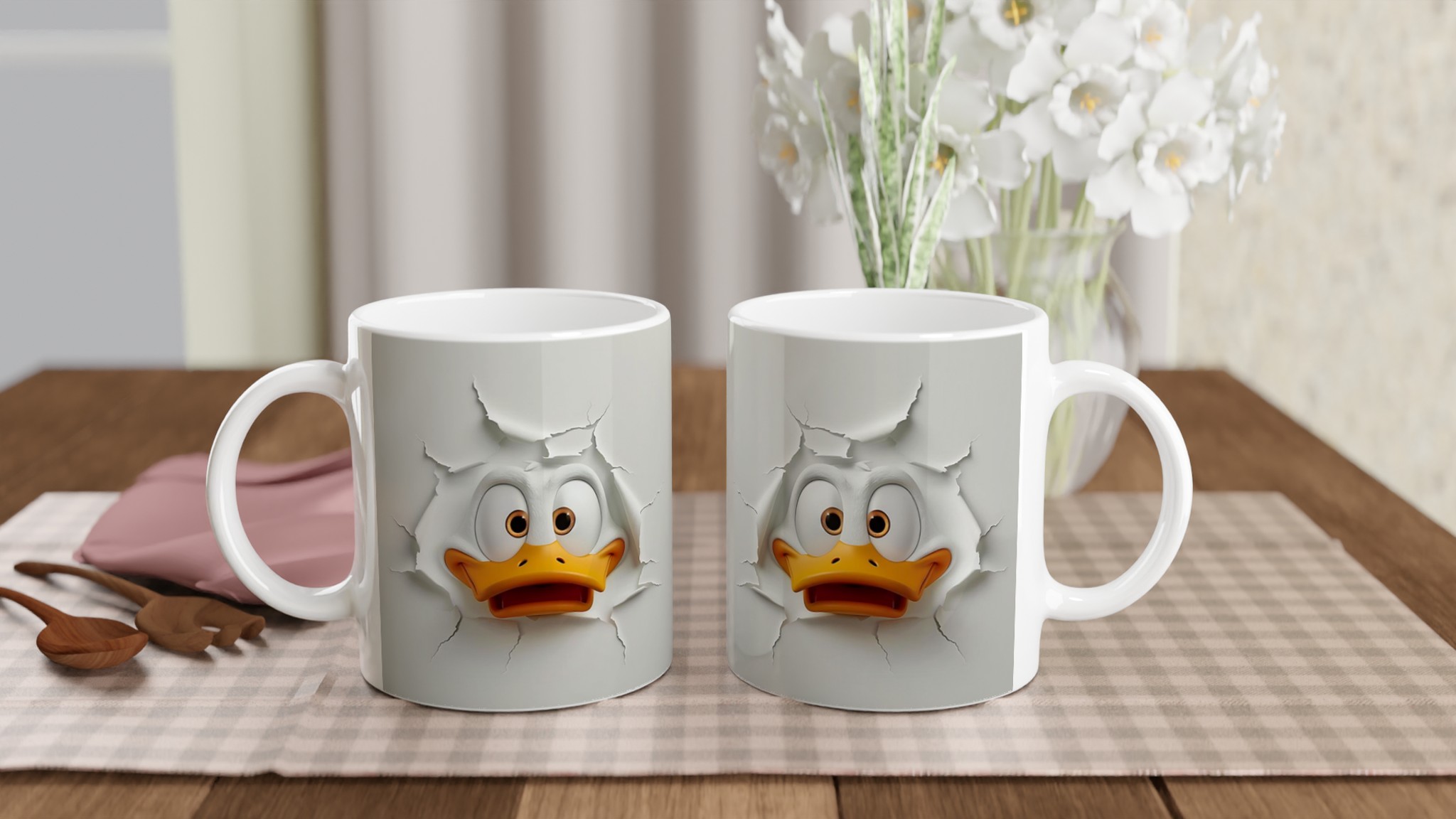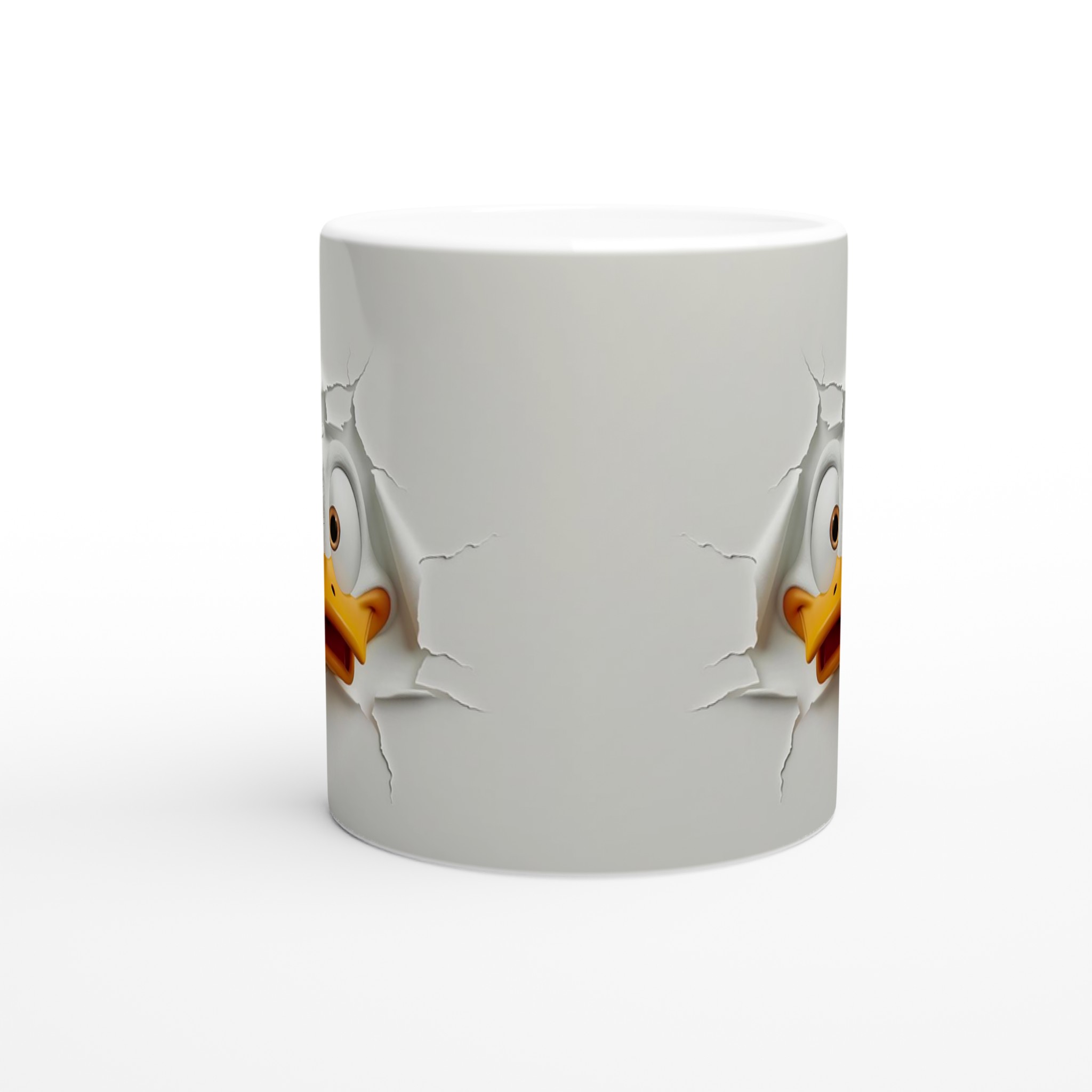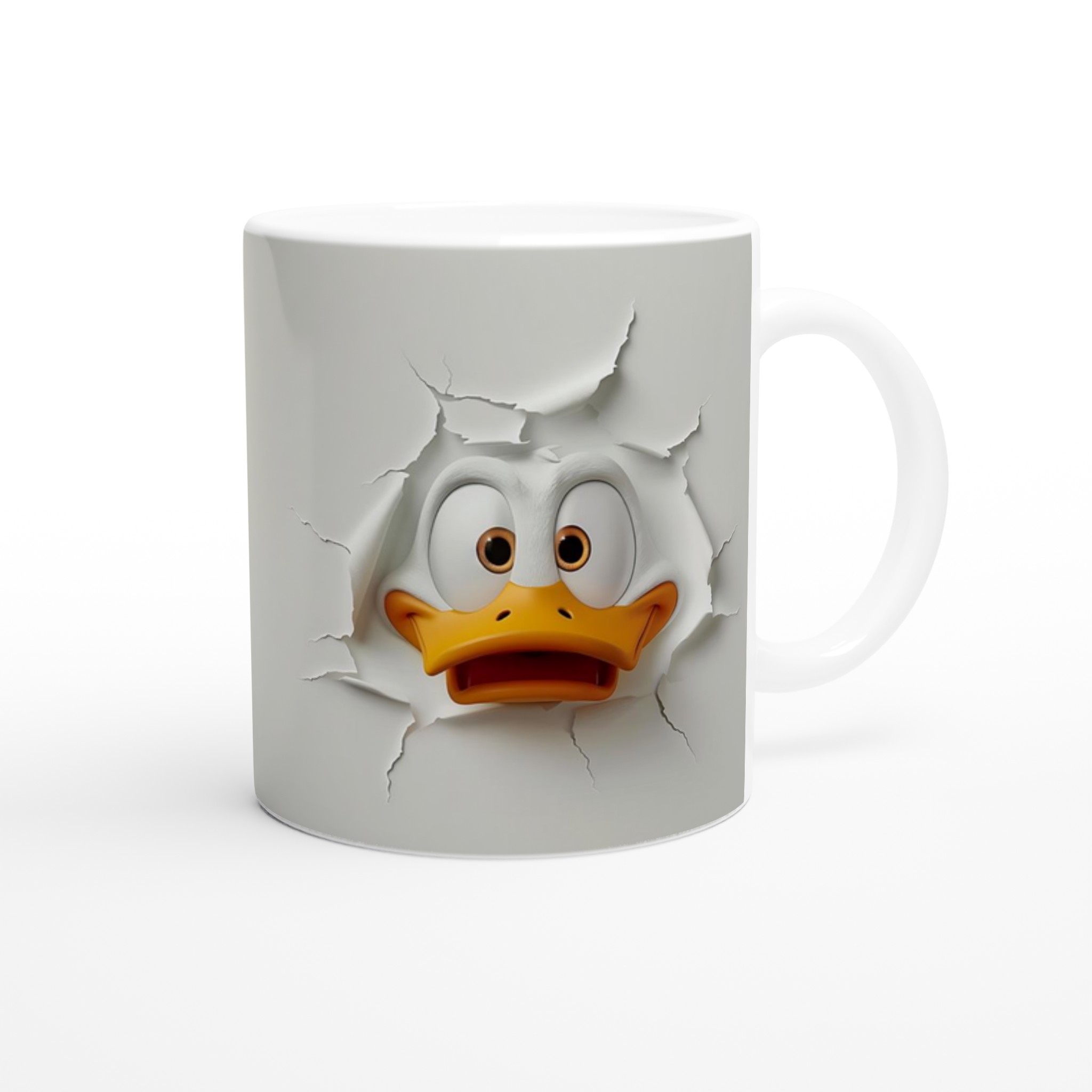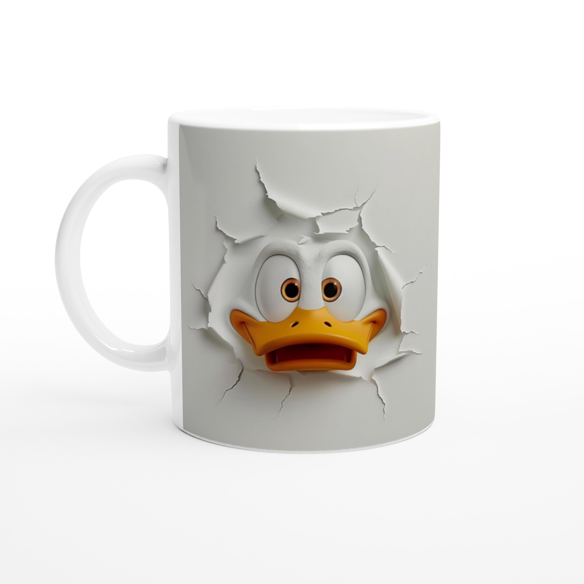 Denna mugg fångar ögonblicket av överraskning och lekfullhet, med en design som ser ut att bryta igenom ytan. Den blanka vita ytan ger ett skarpt och levande tryck som verkligen sticker ut, oavsett om det är en personlig design, ett roligt citat eller en present till någon du tycker om.