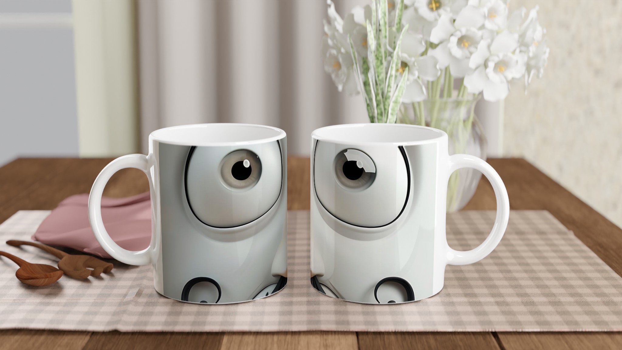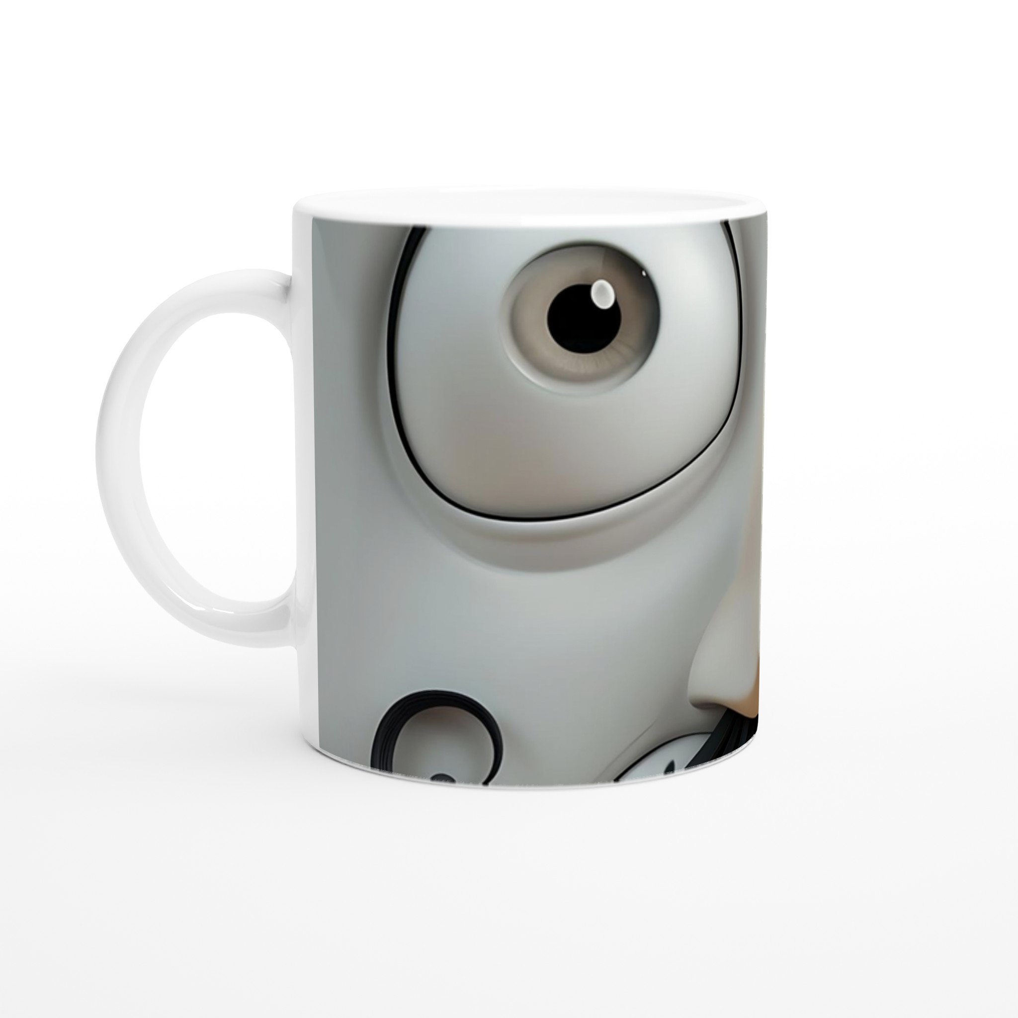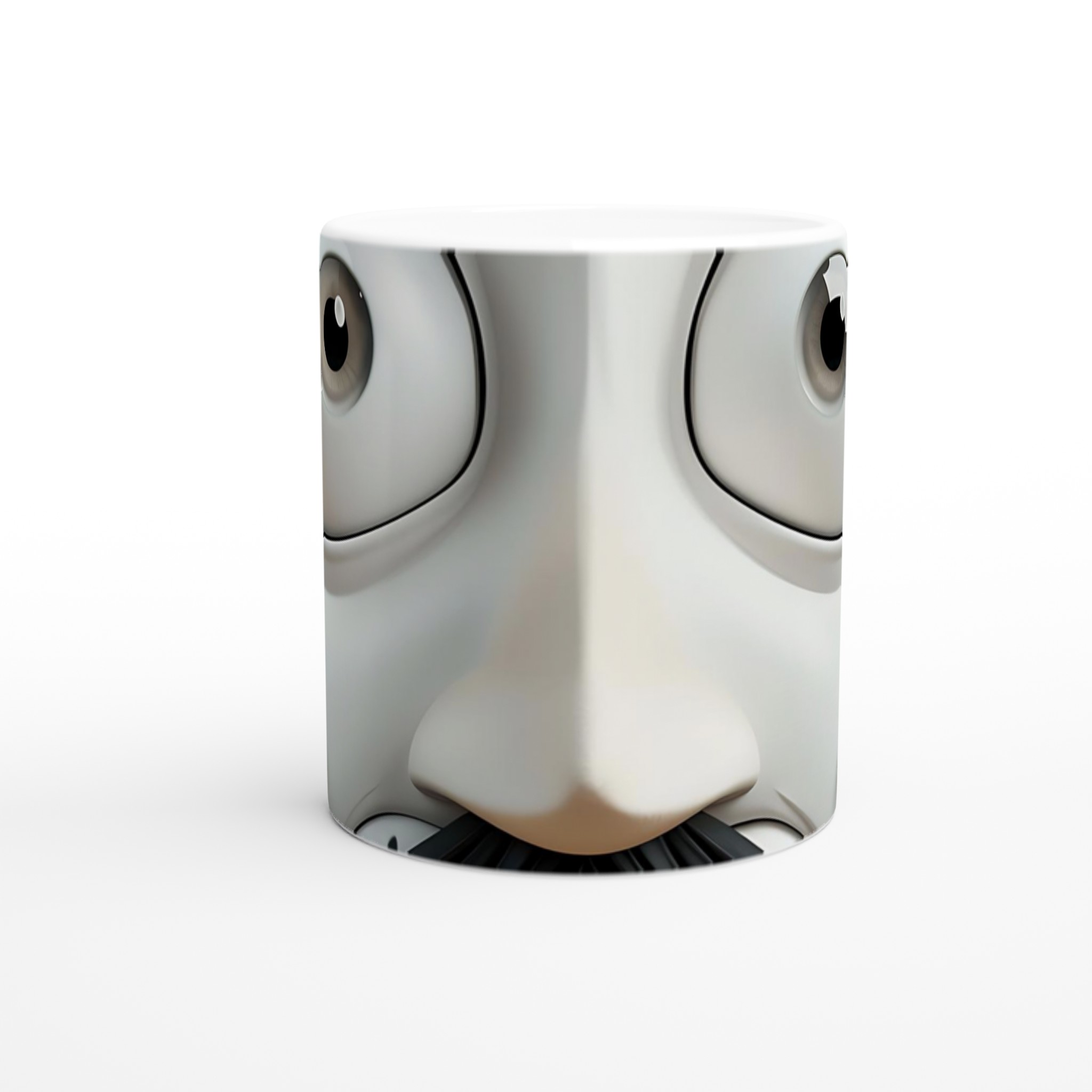 Denna lekfulla mugg fångar omedelbart blicken med sitt humoristiska herransikte, komplett med stora ögonbryn, förvånade ögon och en magnifik mustasch. Den blanka vita ytan ger ett skarpt och levande tryck som verkligen sticker ut, oavsett om det är en personlig design, ett roligt citat eller en present till någon du tycker om. Väck ett leende till liv vid varje kaffepaus, perfekt för den som uppskattar en touch av charm och karaktär i sin vardag.
