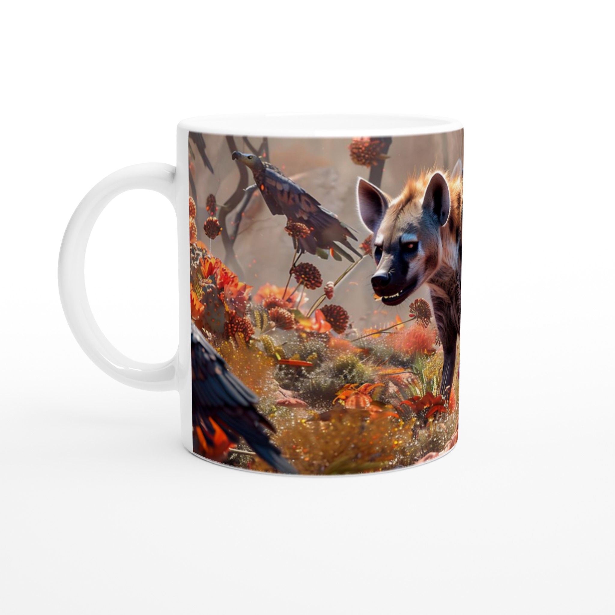 Inspirerad av den mystiska hyenan som smyger fram i gryningens magiska ljus, omgiven av en explosion av varma, orangeröda blommor och frodig vegetation, fångar denna mugg äventyret. Den blanka vita ytan ger ett skarpt och levande tryck som verkligen sticker ut, oavsett om det är en personlig design, ett roligt citat eller en present till någon du tycker om.