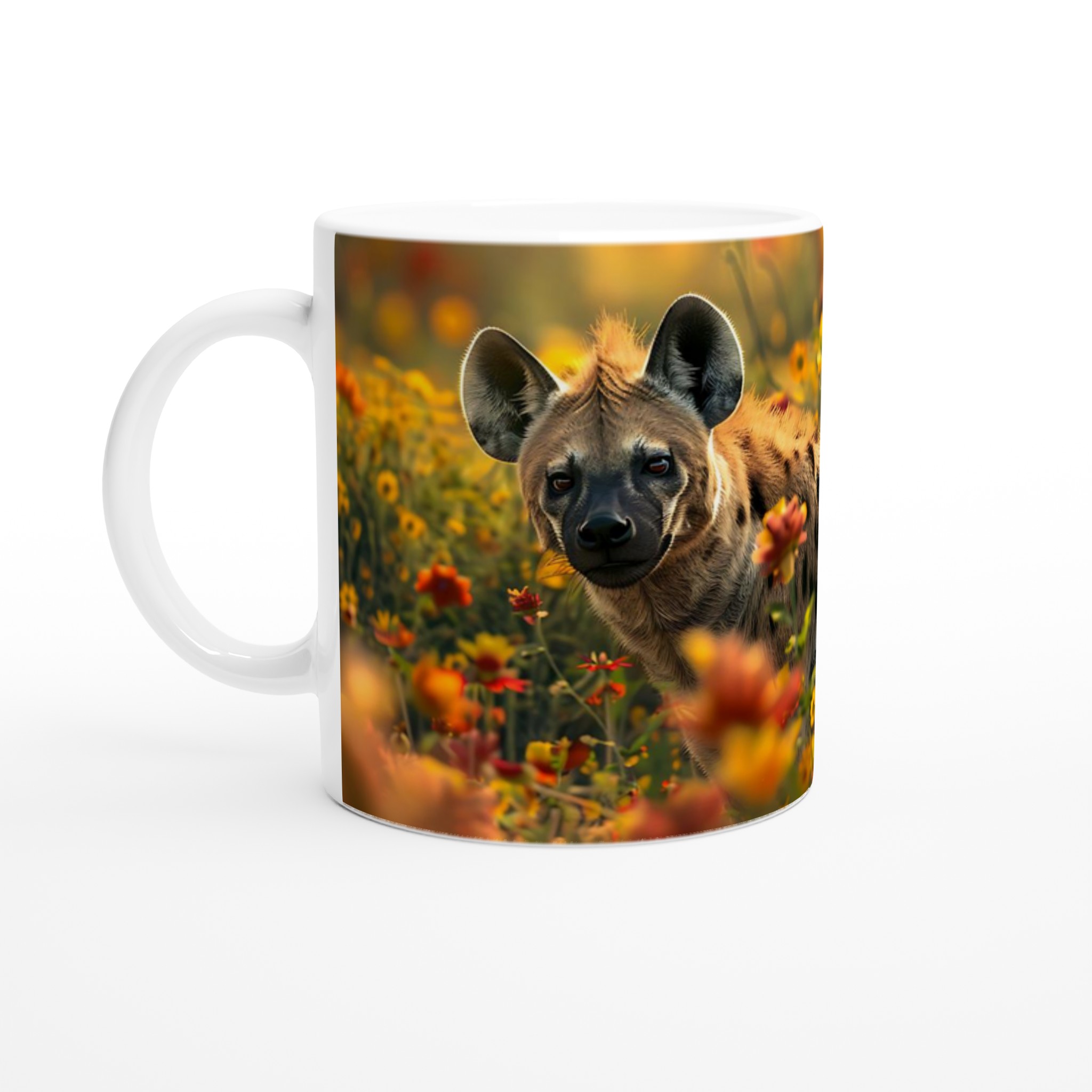 Inspirerad av den majestätiska hyenan som smyger genom en soldränkt blomsteräng, fångar denna mugg naturens vilda skönhet. Den blanka vita ytan ger ett skarpt och levande tryck som verkligen sticker ut, oavsett om det är en personlig design, ett roligt citat eller en present till någon du tycker om. Varje klunk blir en påminnelse om lugnet i naturen och de vackra, levande färgerna från en solig äng.