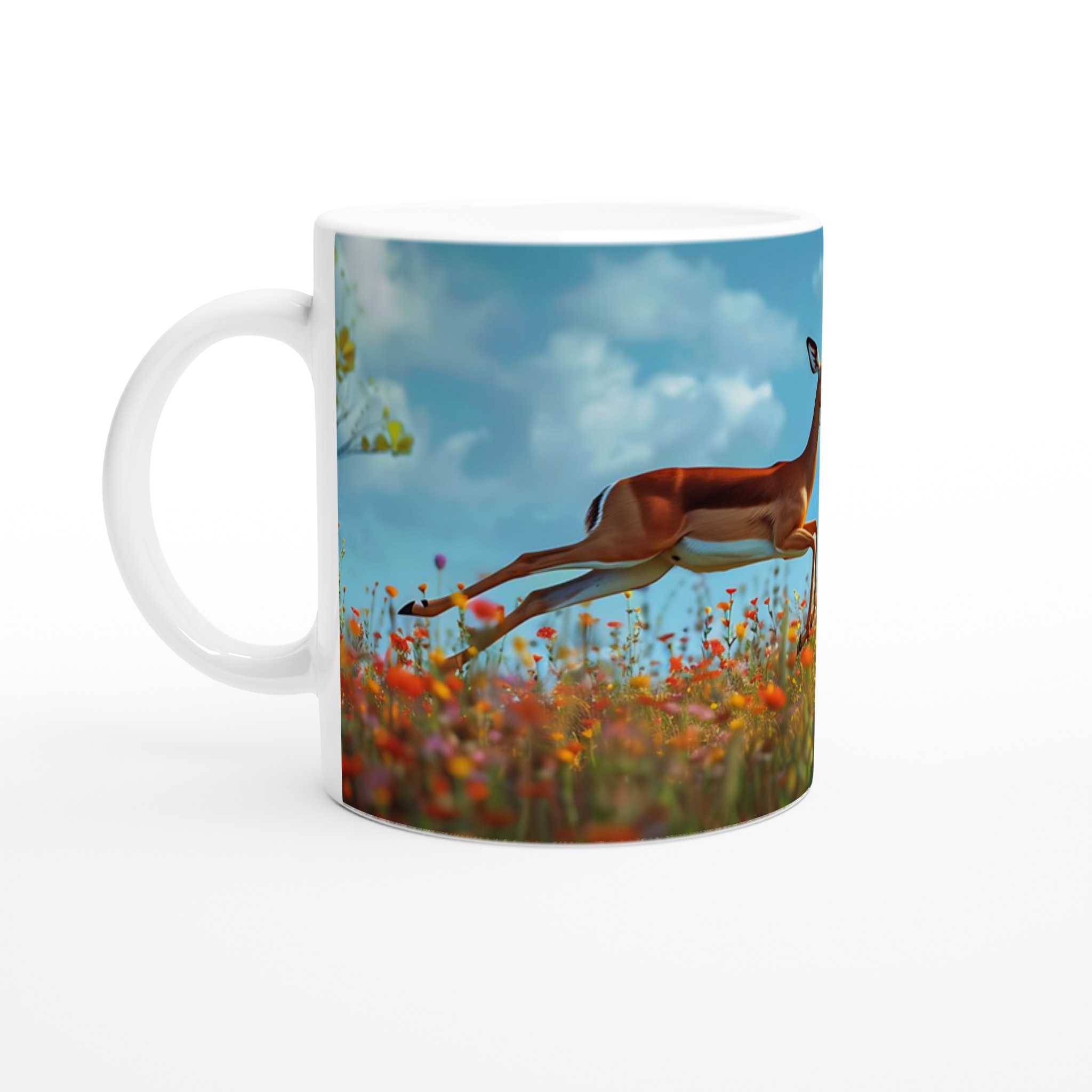 Inspirerad av impalans graciösa språng över en äng fylld med vilda blommor under en klarblå himmel, fångar denna mugg ögonblickets frihet och skönhet. Den blanka vita ytan ger ett skarpt och levande tryck som verkligen sticker ut, oavsett om det är en personlig design, ett roligt citat eller en present till någon du tycker om.