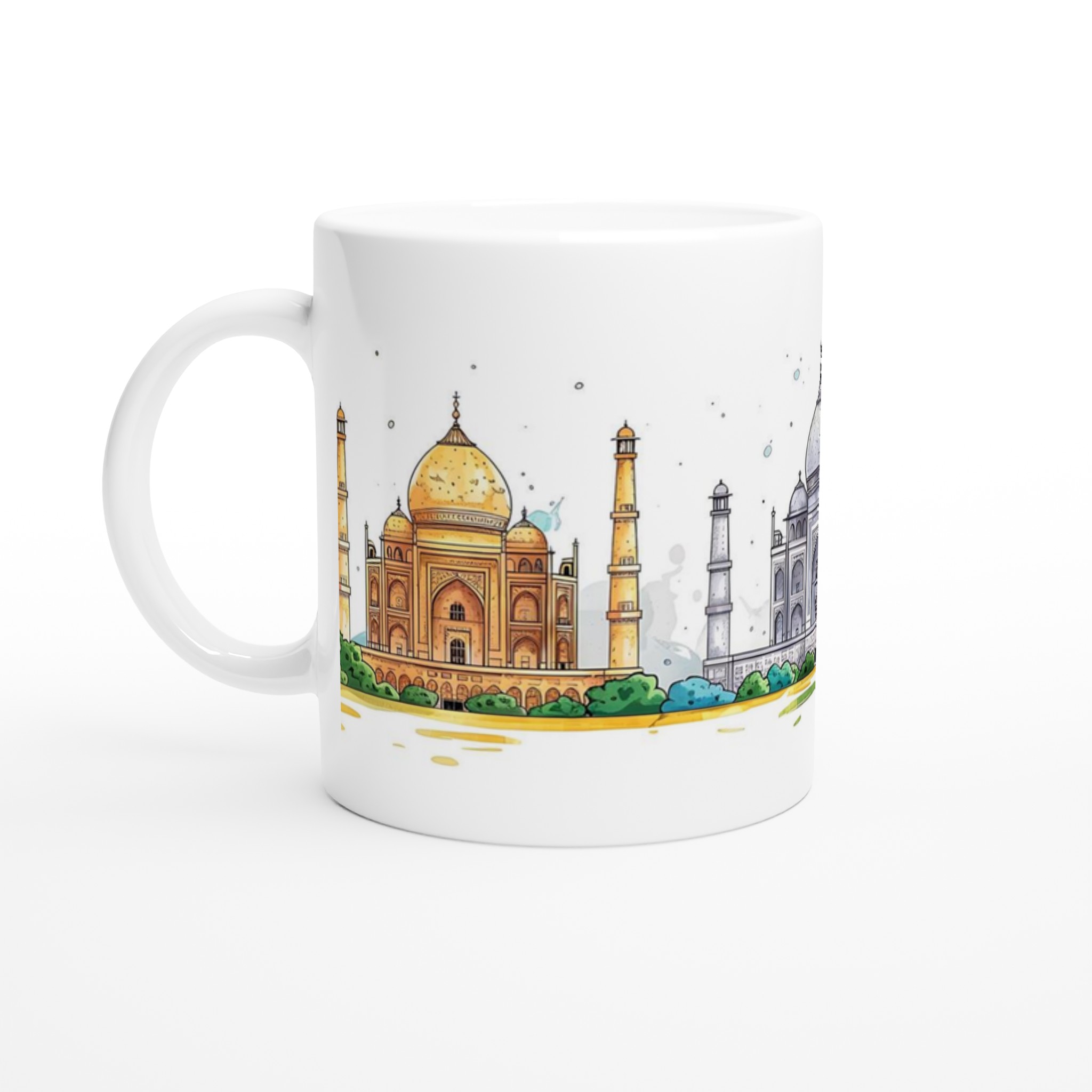 Lyft varje kaffestund med vår premium keramikmugg – stilren, hållbar och skapad för att låta ditt motiv glänsa. Denna charmiga mugg pryds av en akvarellinspirerad illustration med indiska palats i varma, jordnära toner och en lugn, drömsk stil. Den blanka vita ytan ger ett skarpt och levande tryck som verkligen sticker ut, oavsett om det är en personlig design, ett roligt citat eller en present till någon du tycker om.