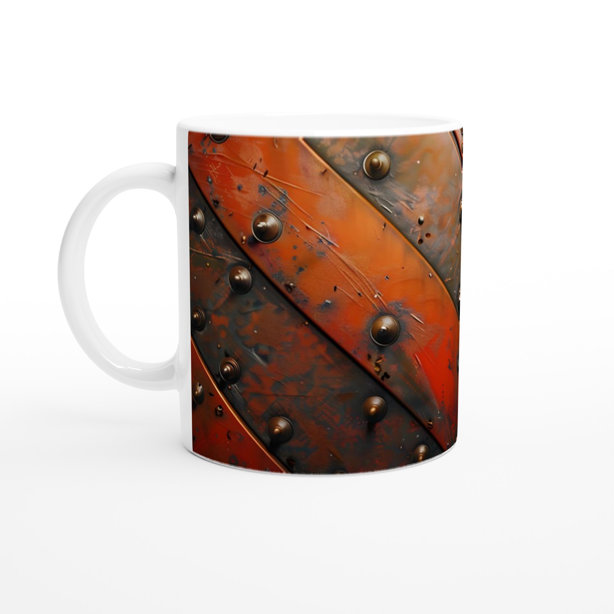 Inspirerad av rå industriell estetik med djupa röda och mörka toner, kompletterad med nitar som ger en autentisk och robust känsla. Den blanka vita ytan ger ett skarpt och levande tryck som verkligen sticker ut, oavsett om det är en personlig design, ett roligt citat eller en present till någon du tycker om.