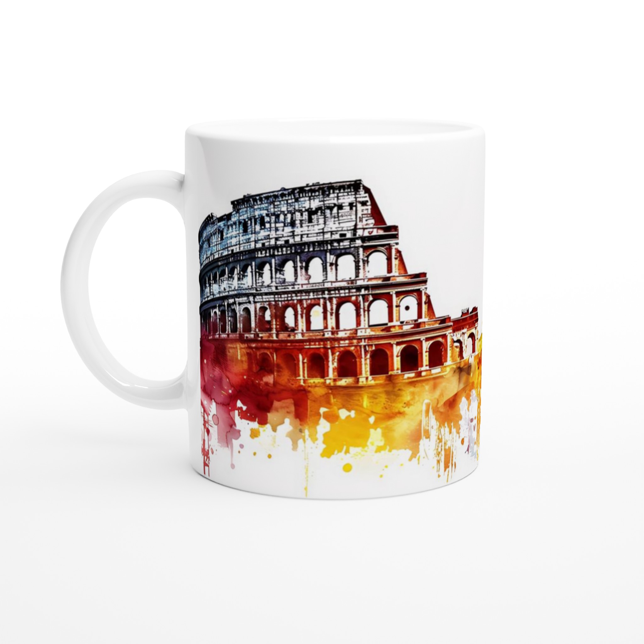 Lyft varje kaffestund med vår premium keramikmugg – stilren, hållbar och skapad för att låta ditt motiv glänsa. Denna konstnärliga mugg fångar essensen av Italiens ikoniska landmärken, Colosseum och lutande tornet i Pisa, återgivna i en livfull vattenfärgstil med varma röda, gula och svala blå toner. Det uttrycksfulla akvarelltrycket med stänk och droppar ger en dynamisk känsla som för tankarna till sydeuropeisk charm och konstnärlig flair.