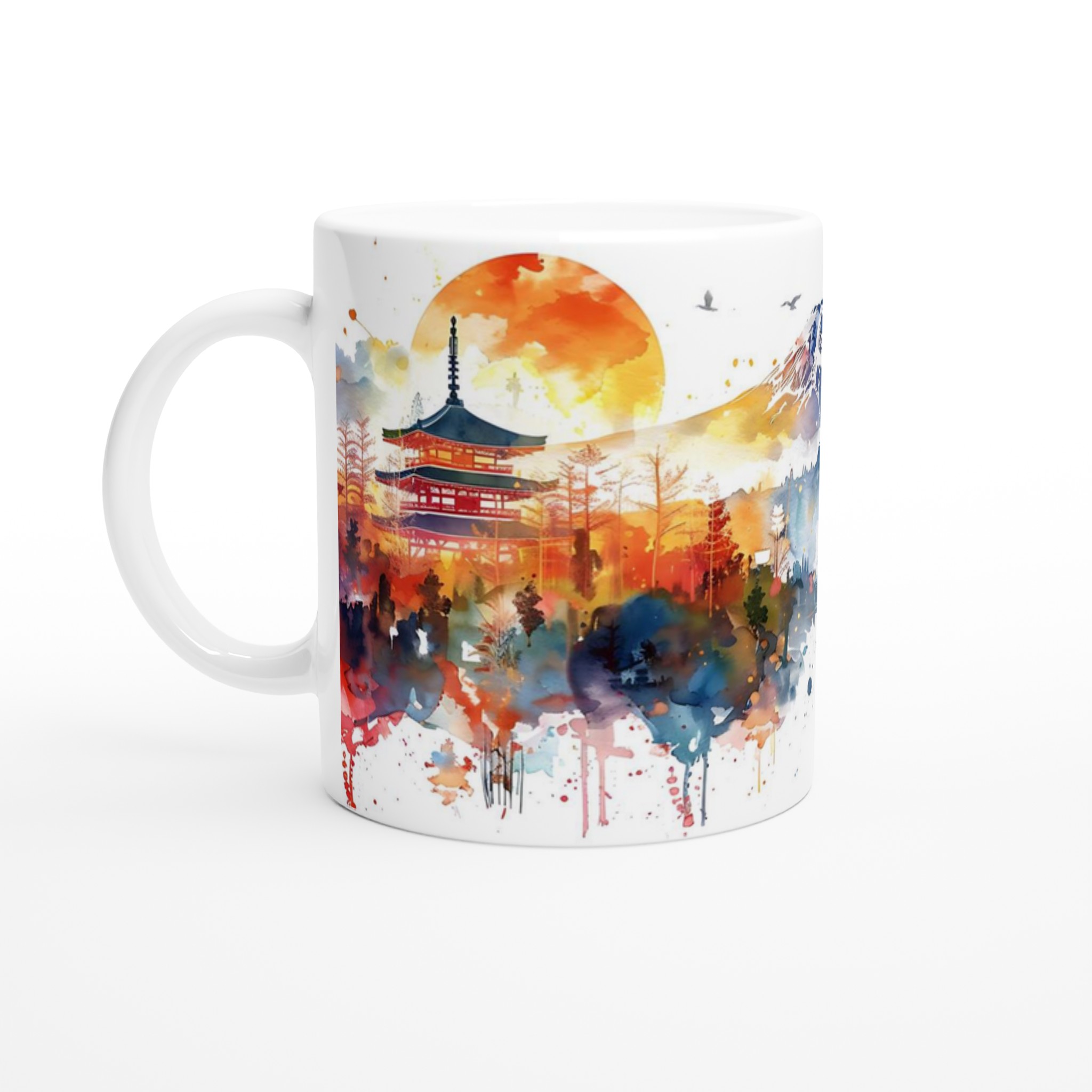 Inspirerad av den fridfulla skönheten i japanska landskap, pryds denna mugg av en levande akvarellmålning föreställande majestätiska berg som Fuji, traditionella pagoder och en strålande solnedgång. Färgpaletten i varma orangea, röda och svala blåa toner, med skvättar av livfulla nyanser, skapar en konstnärlig och lugnande känsla som för tankarna till en avkopplande resa.