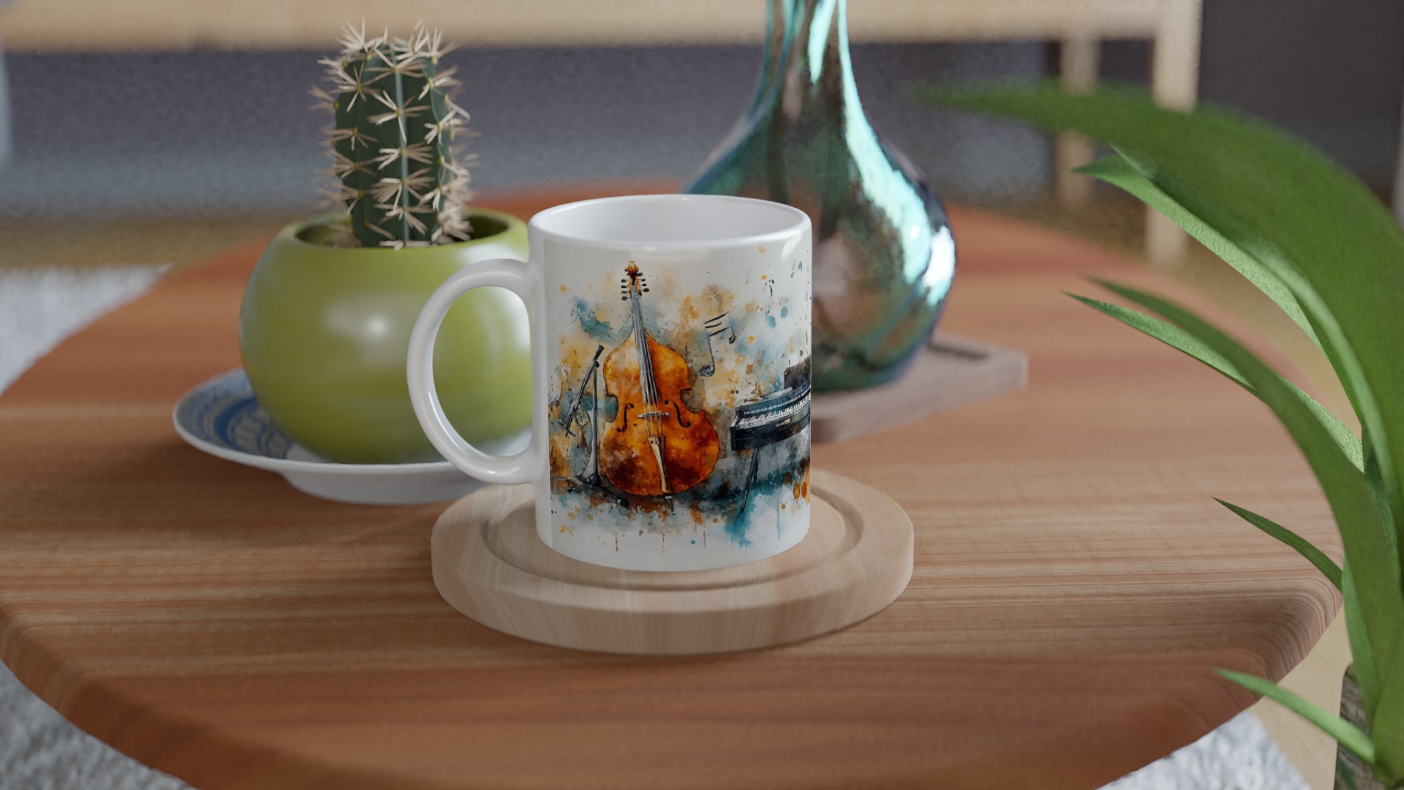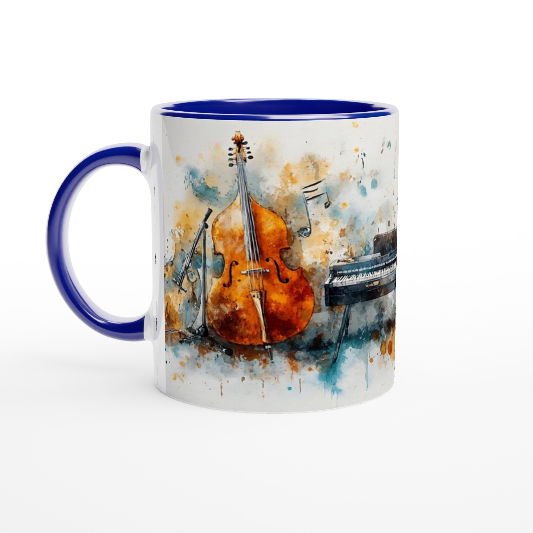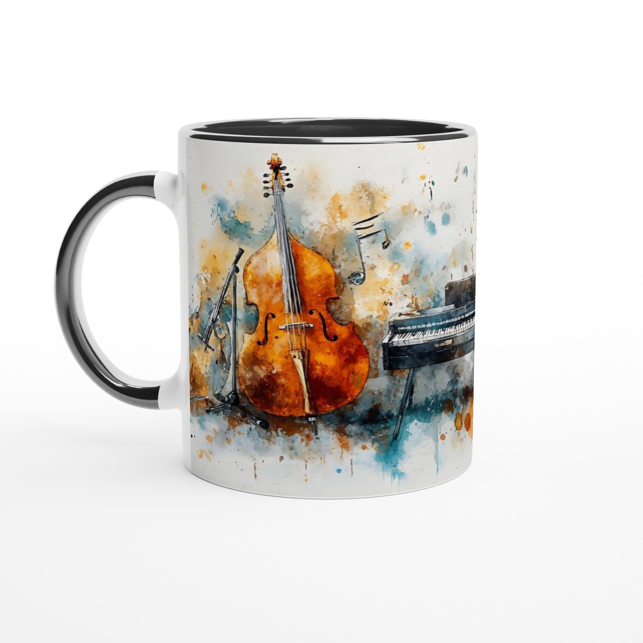 Låt musiken flöda med denna unika keramiska mugg, prydd med ett levande akvarellmotiv av klassiska jazzinstrument. Denna mugg fångar den dynamiska energin från en jazzfusion-session, med varma toner av brunt och gult mot svala blåa och turkosa stänk. Perfekt för musikälskare och de som uppskattar konstnärliga uttryck, blir den snabbt en vardagsfavorit för morgonkaffet, kvällens varma choklad eller när du bara vill njuta av en kopp te.