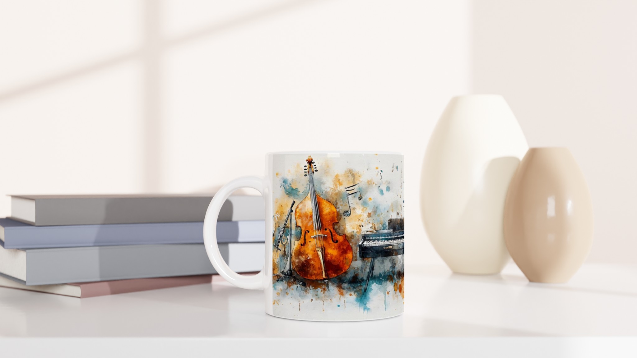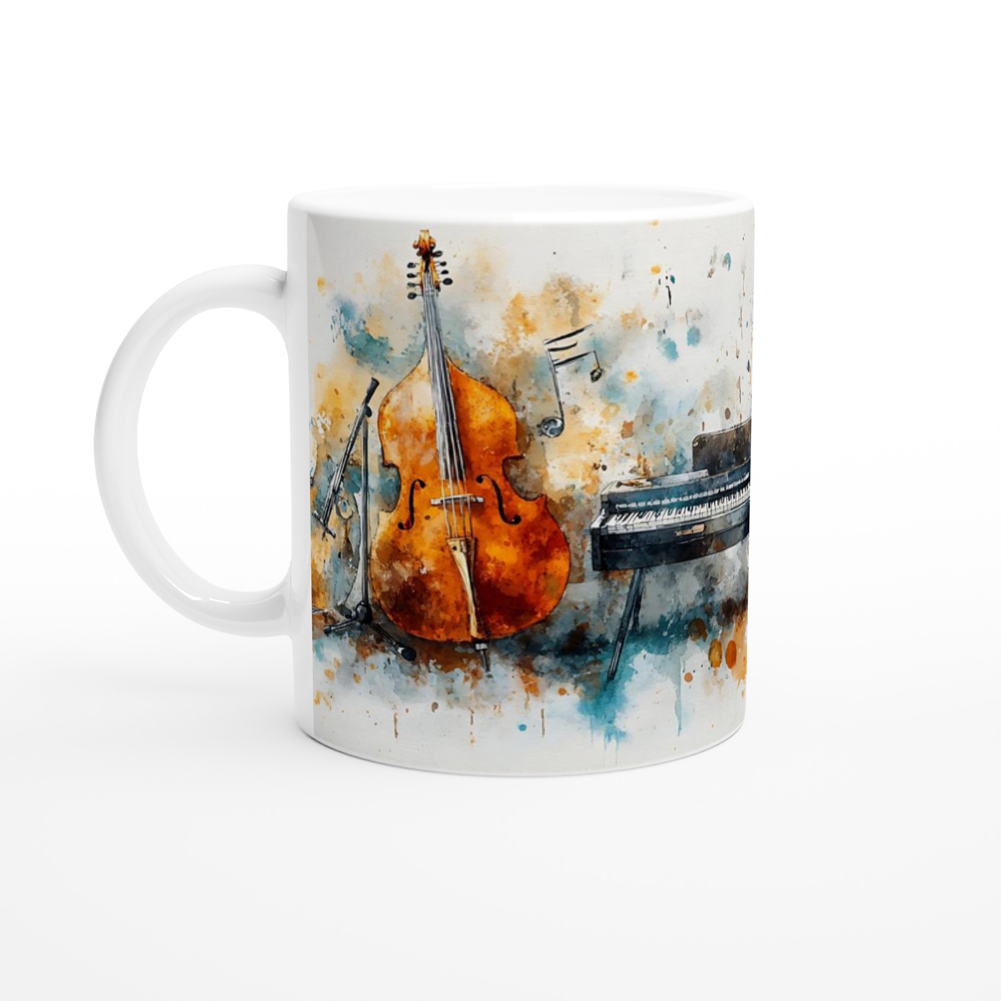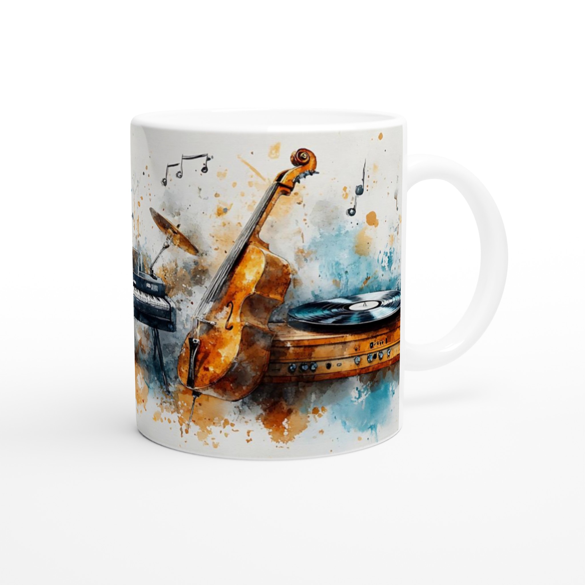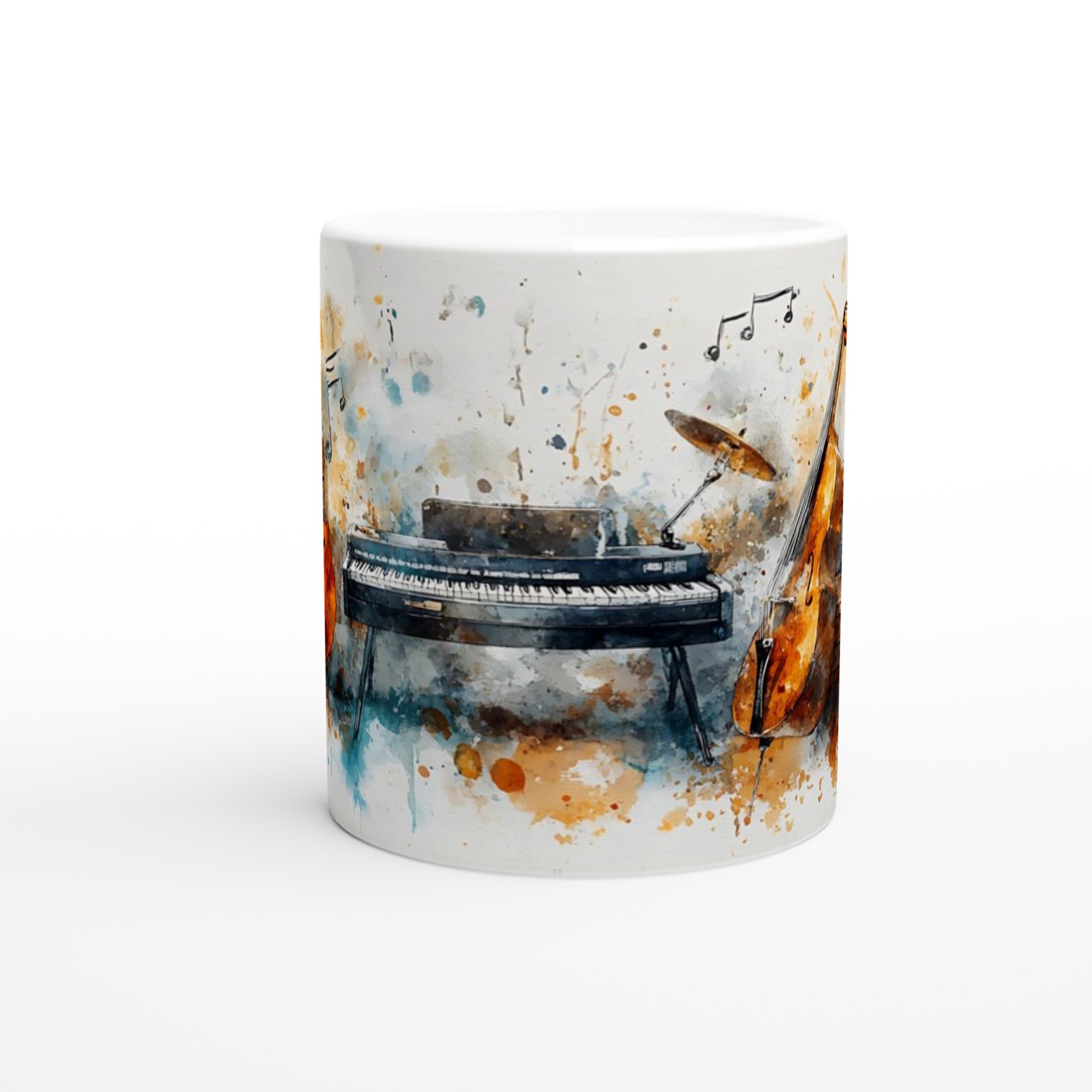 Denna exklusiva keramikmugg fångar den livfulla energin av en jazzfusion-session med sin dynamiska akvarelldesign. Med instrument som bas och piano omgivna av sprudlande toner i varma orangeröda och svala blå nyanser, är detta mer än bara en mugg – det är ett konstverk som hyllar musikens själ. Den blanka vita ytan ger ett skarpt och levande tryck som verkligen sticker ut, oavsett om det är en personlig design, ett roligt citat eller en present till någon du tycker om.