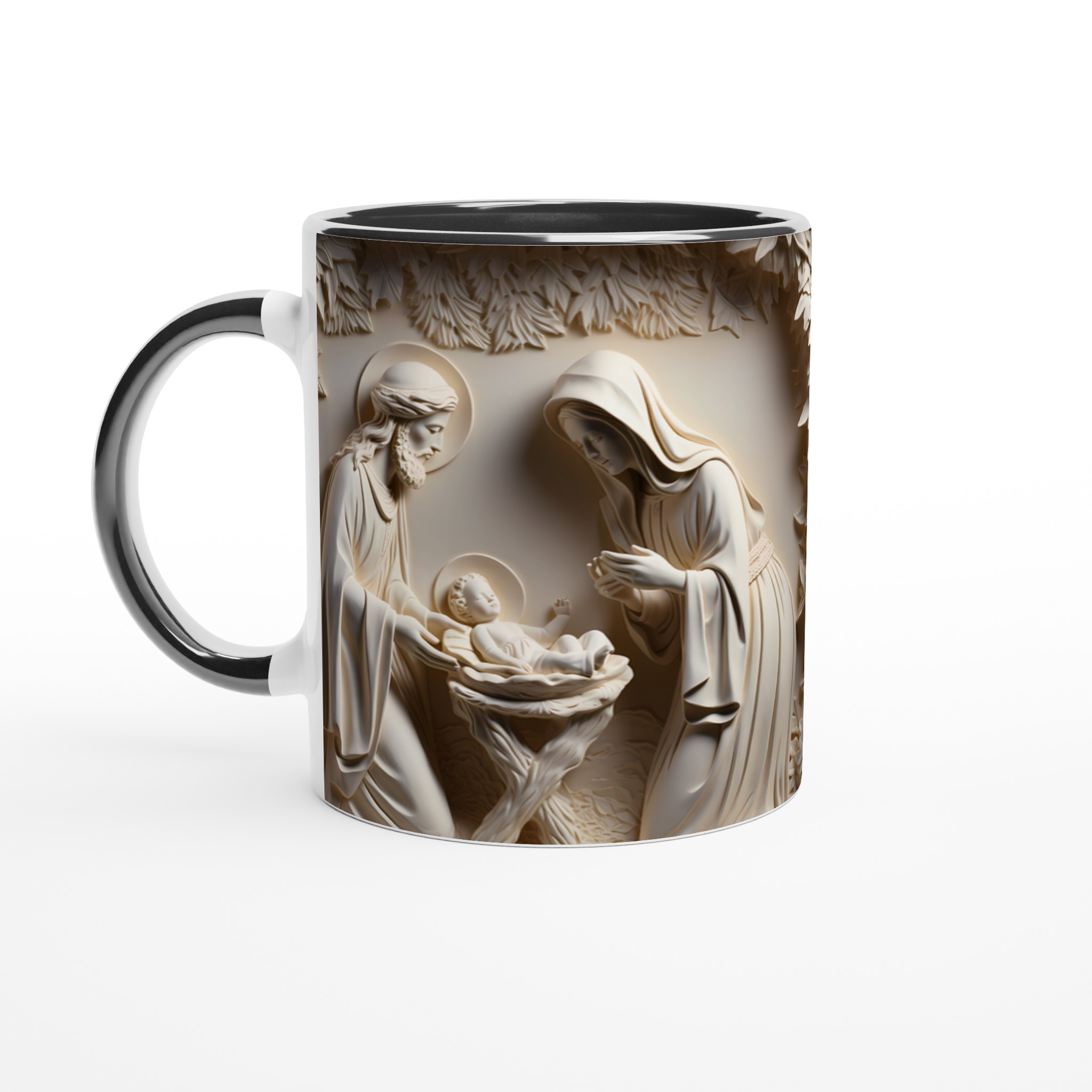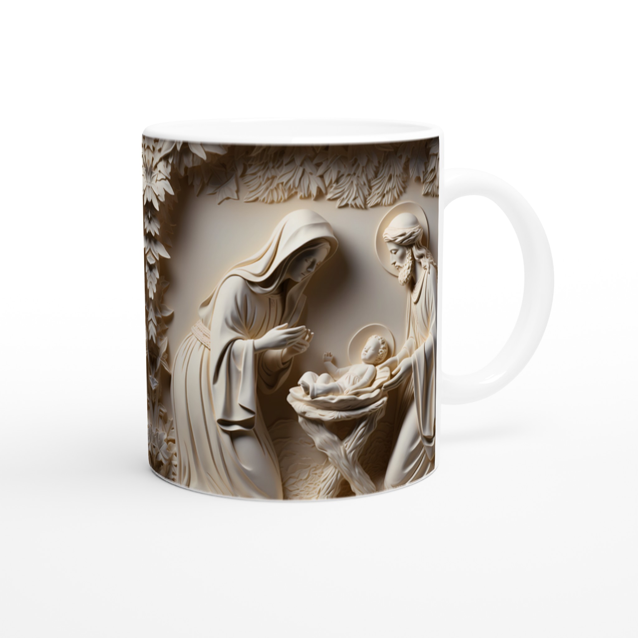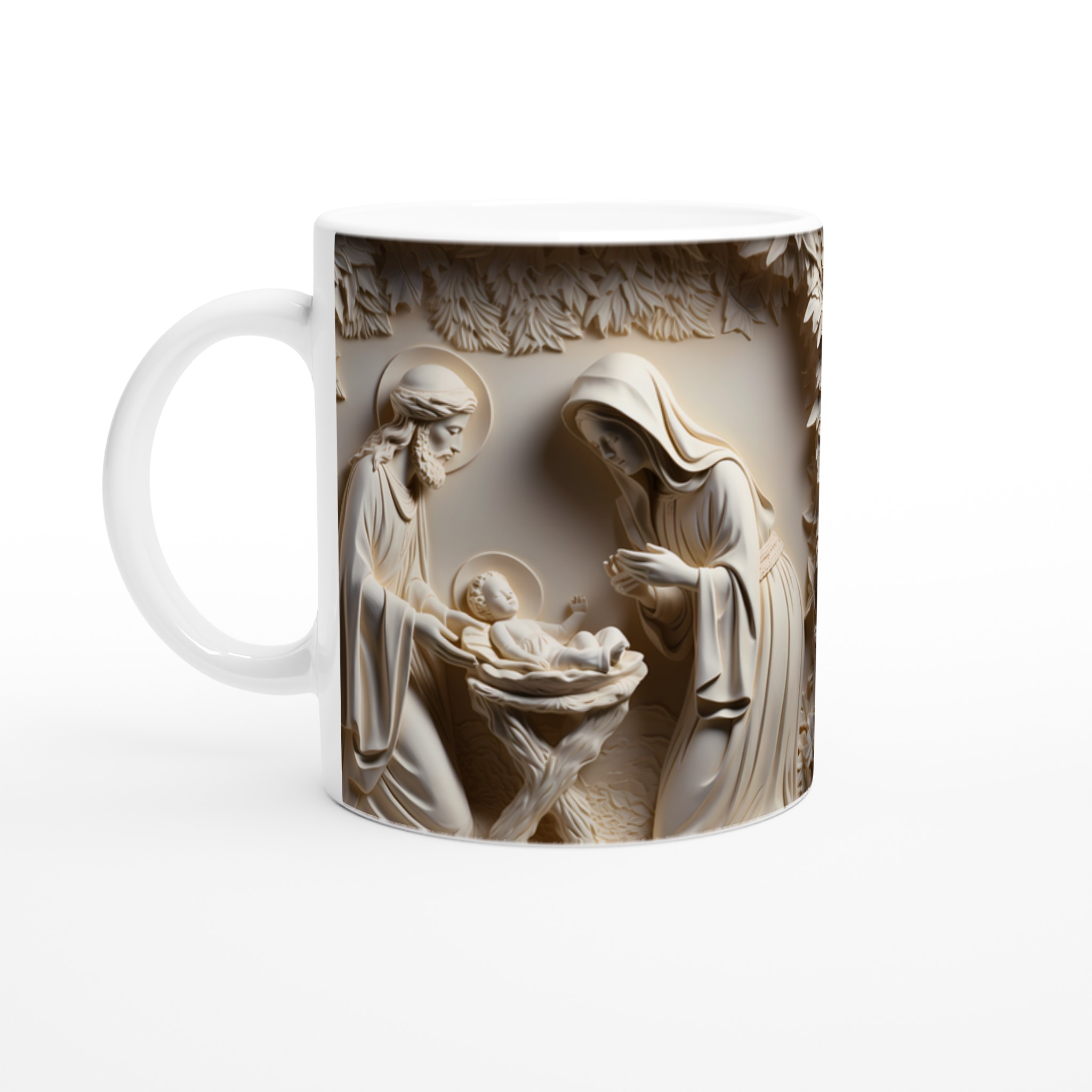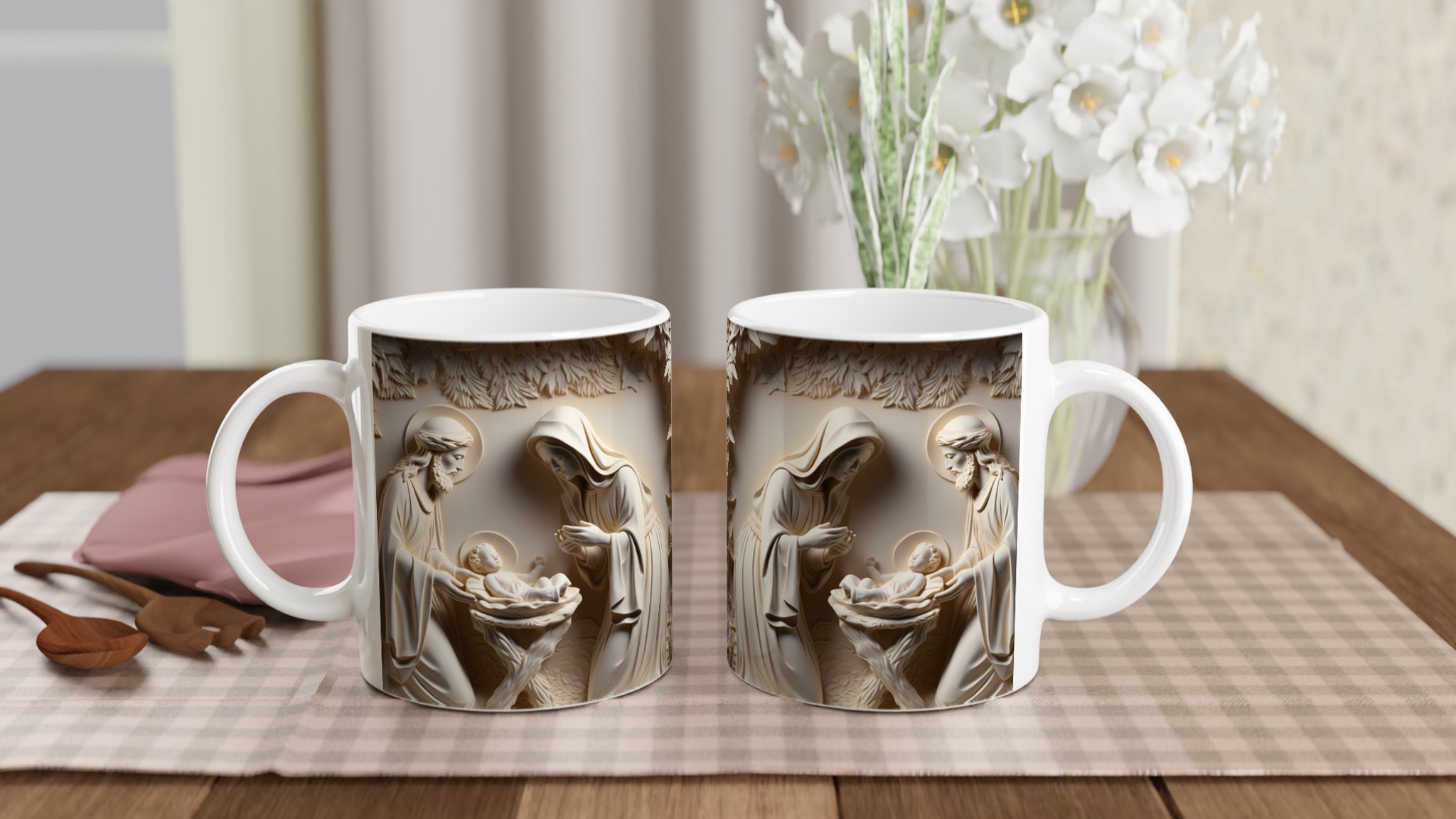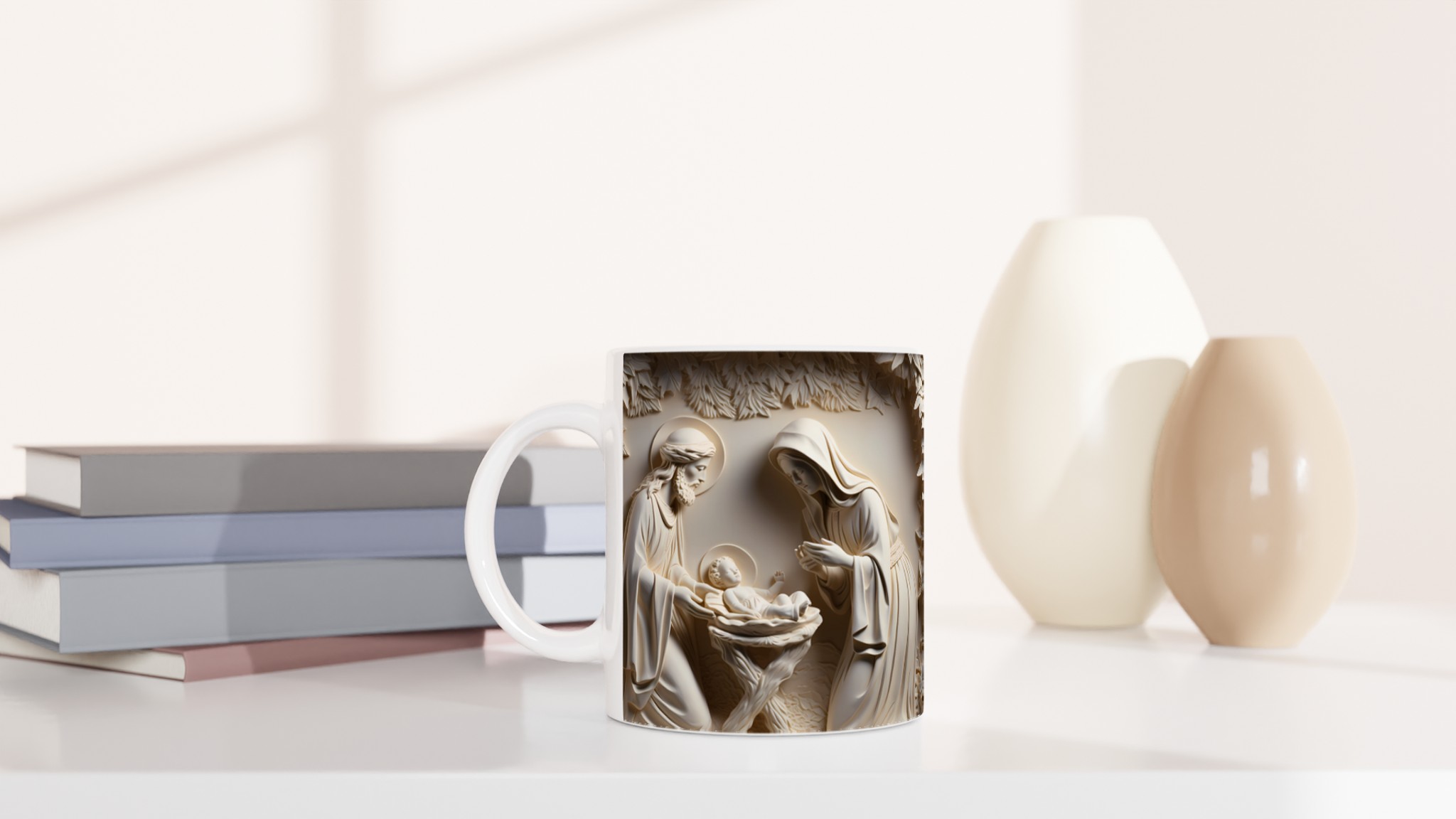 Väck din tro och finn lugn med denna vackra keramiska mugg, prydd med en konstnärlig avbildning av Jesu födelse i en fridfull reliefstil. Den detaljerade designen, som fångar ögonblicket av Joseph, Maria och Jesusbarnet, ger en känsla av stillhet och andlig reflektion till varje kopp. Den här stilrena keramiska muggen blir snabbt en vardagsfavorit. Perfekt för morgonkaffet, kvällens varma choklad eller när du bara vill njuta av en kopp te.