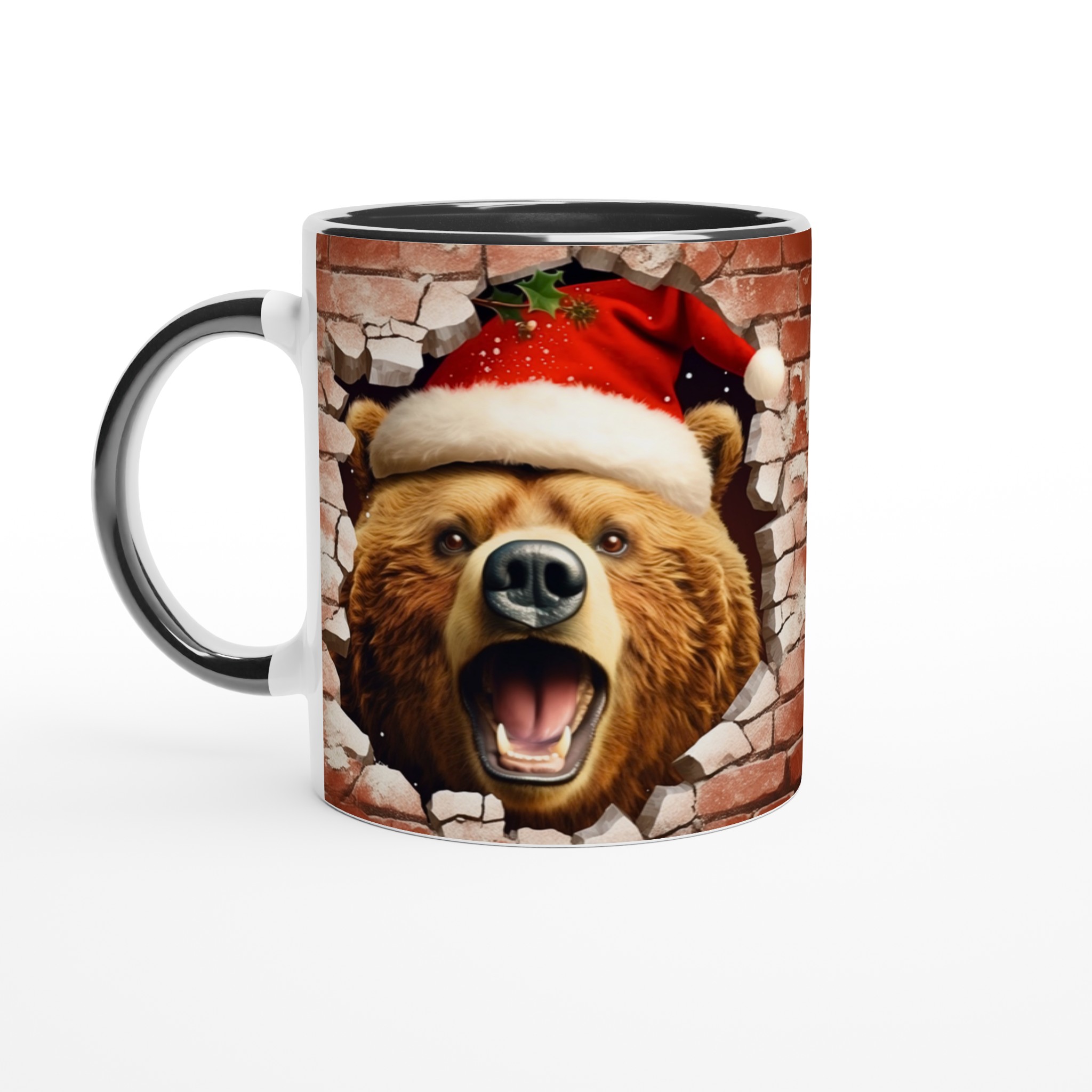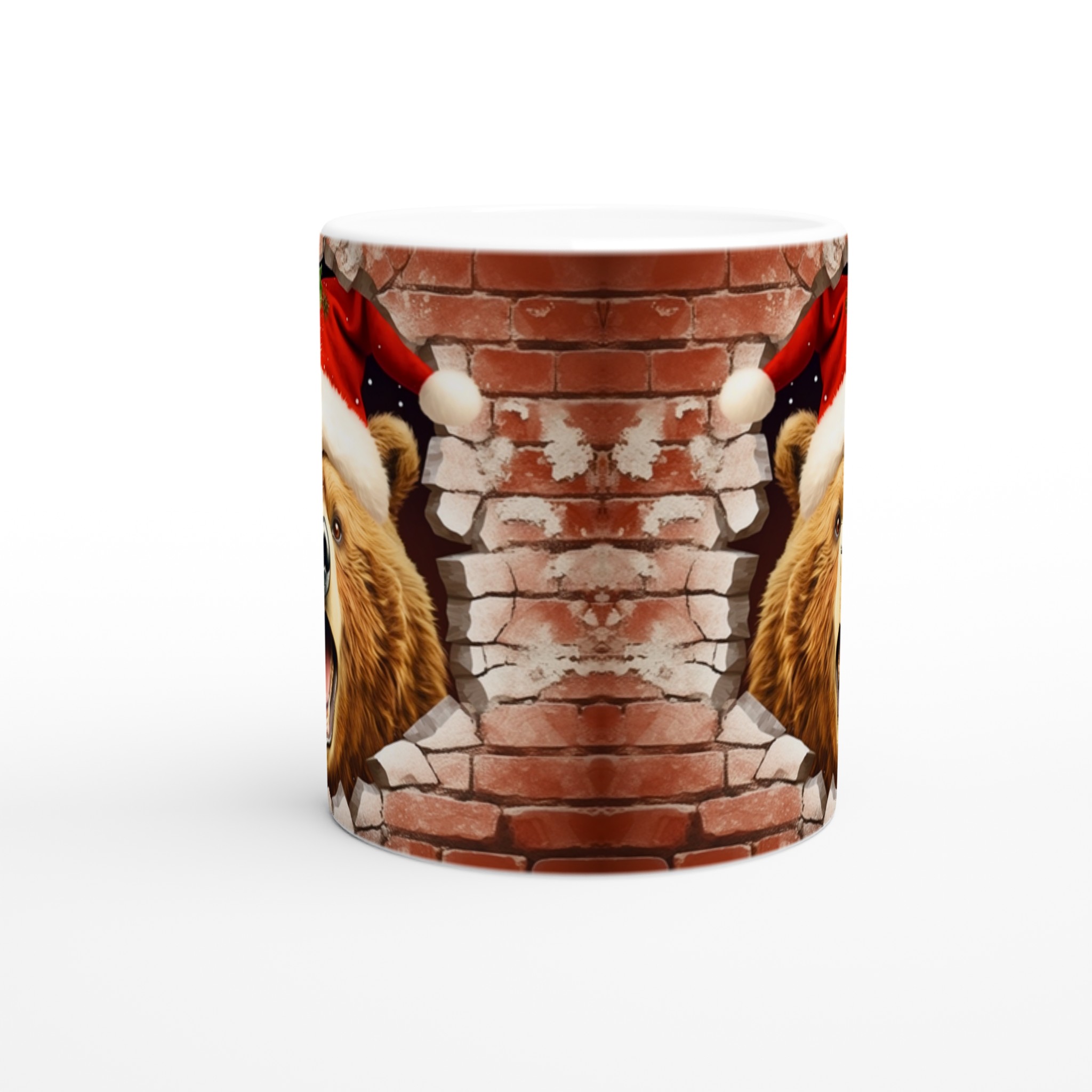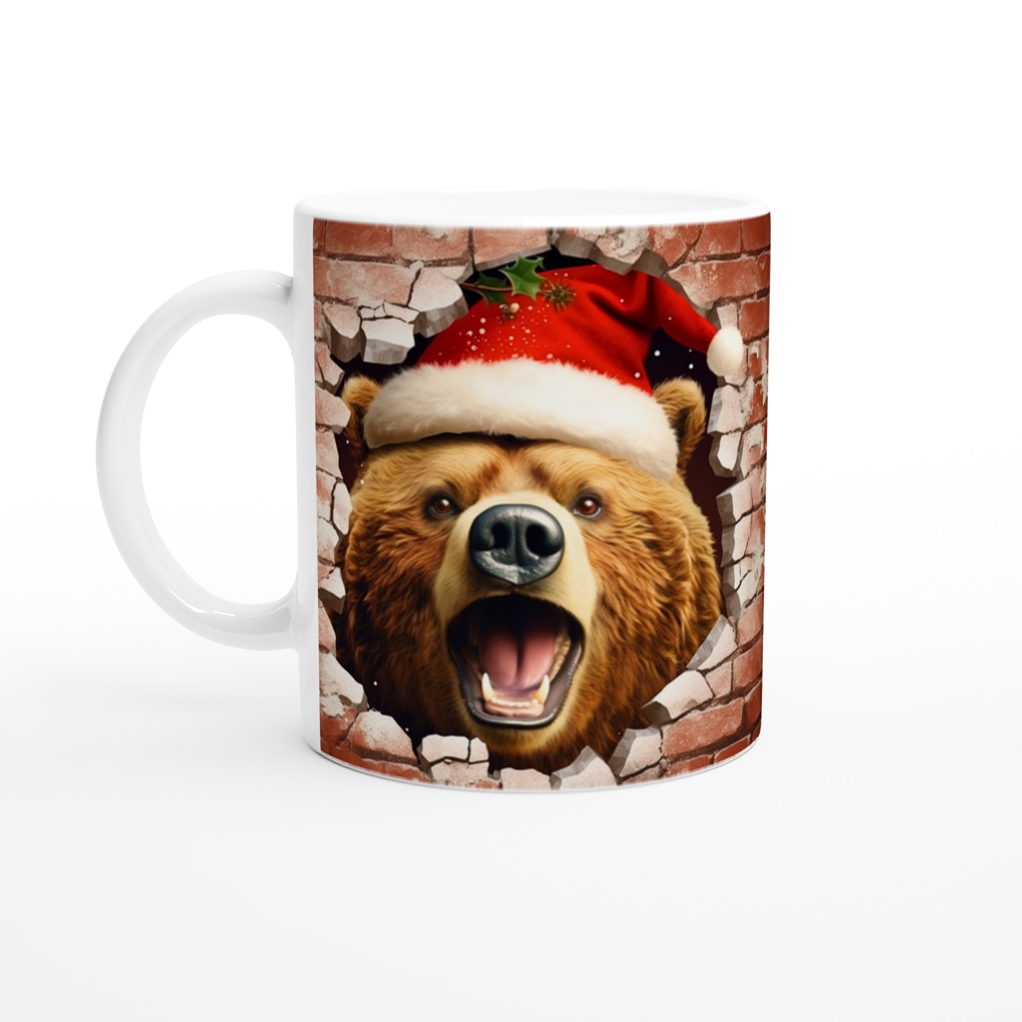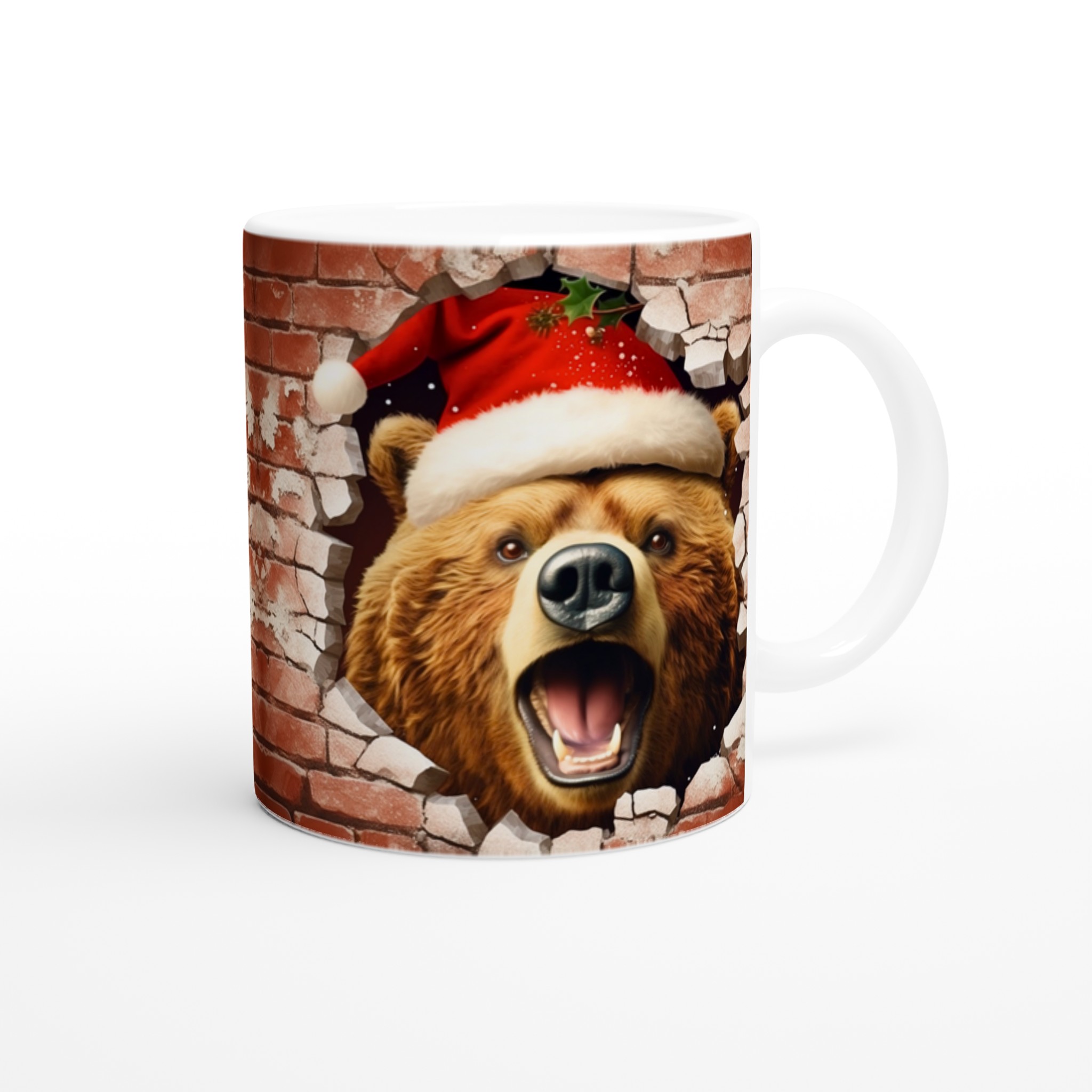 Överraska med en mugg som bryter igenom vardagen! Vår charmiga keramiska mugg med en julbjörn som kikar fram ur en tegelvägg, komplett med tomteluva och juliga detaljer, är den perfekta stämningshöjaren under julen. Oavsett om det är för morgonkaffet, kvällens varma choklad eller bara en mysig kopp te, kommer denna mugg att sprida glädje och festlig anda. Den blanka ytan framhäver trycket med klara, levande färger som behåller sin lyster, även efter otaliga turer i mikron och diskmaskinen.